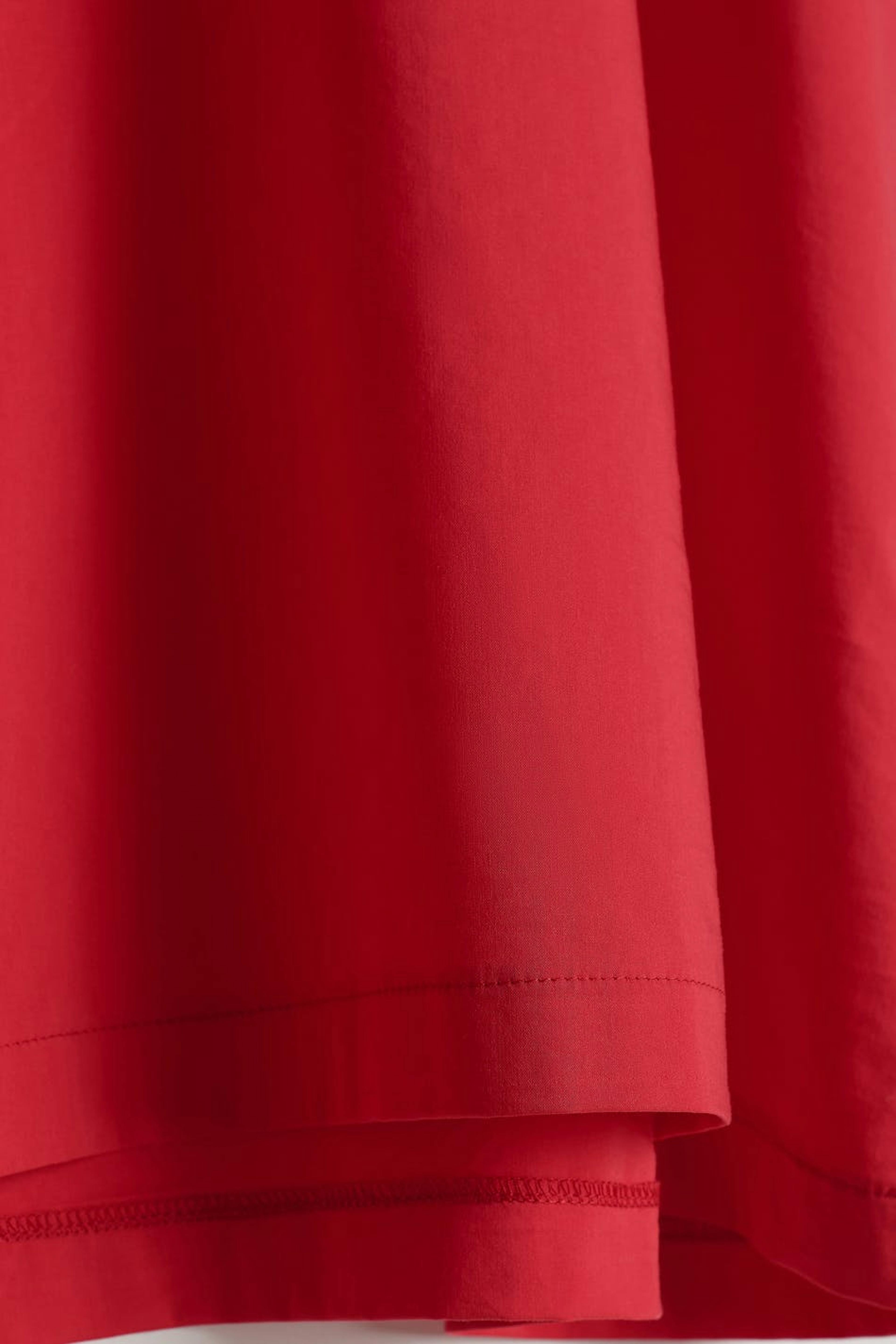 Lyhyt mekko olkatoppauksilla. Mekko on punainen ja siinä on t-paitahihat. Siinä on paidan kaulus koristenapeilla.