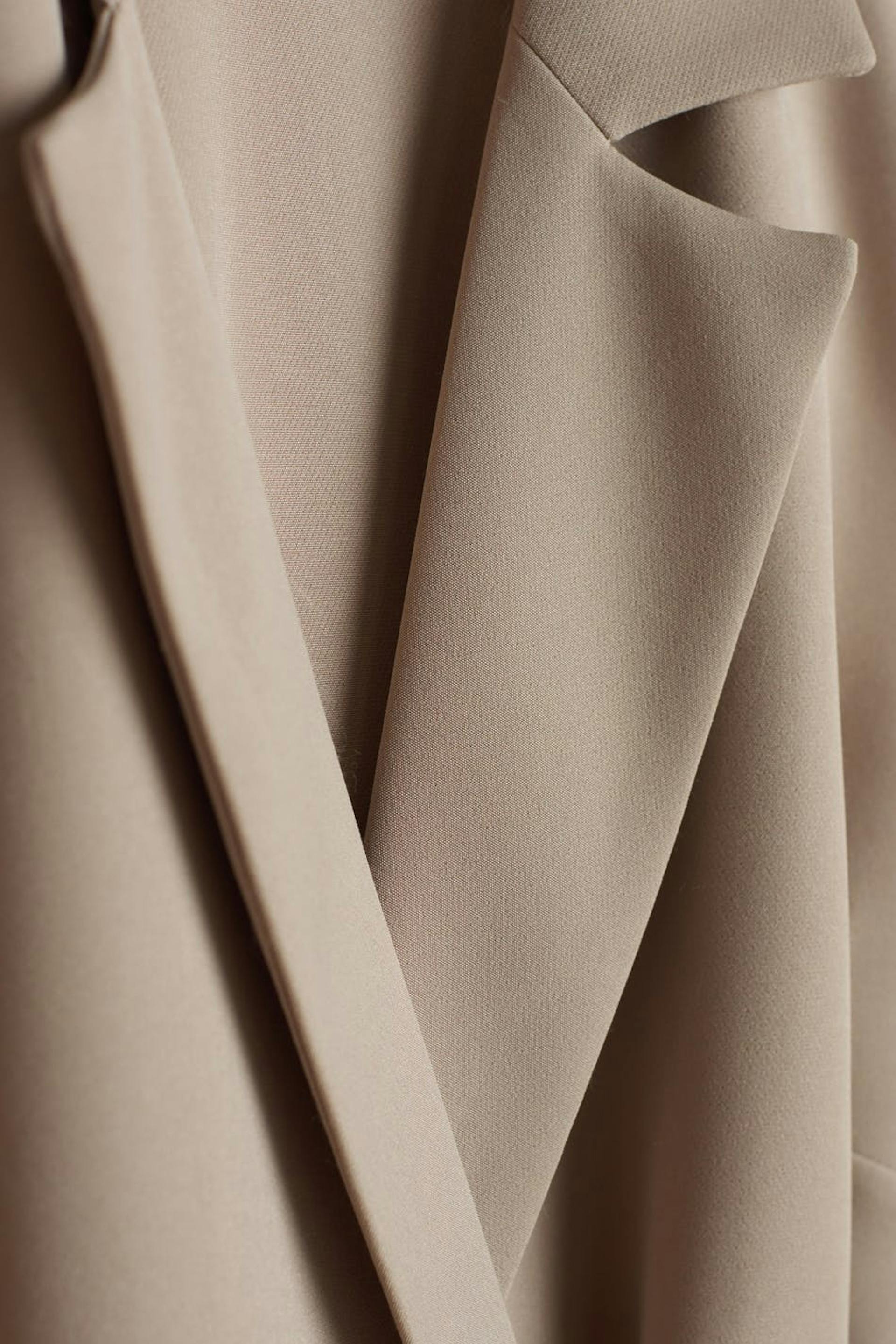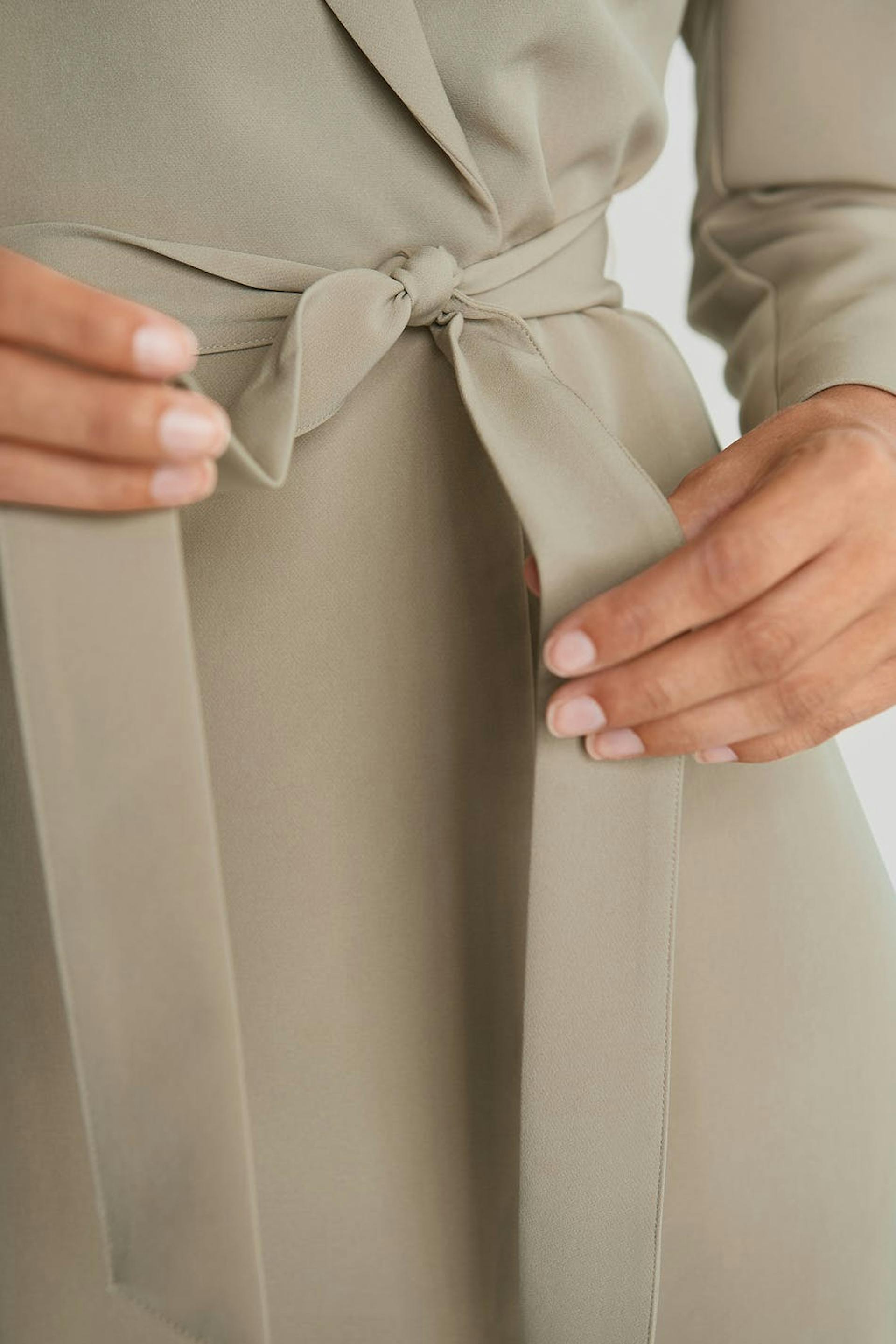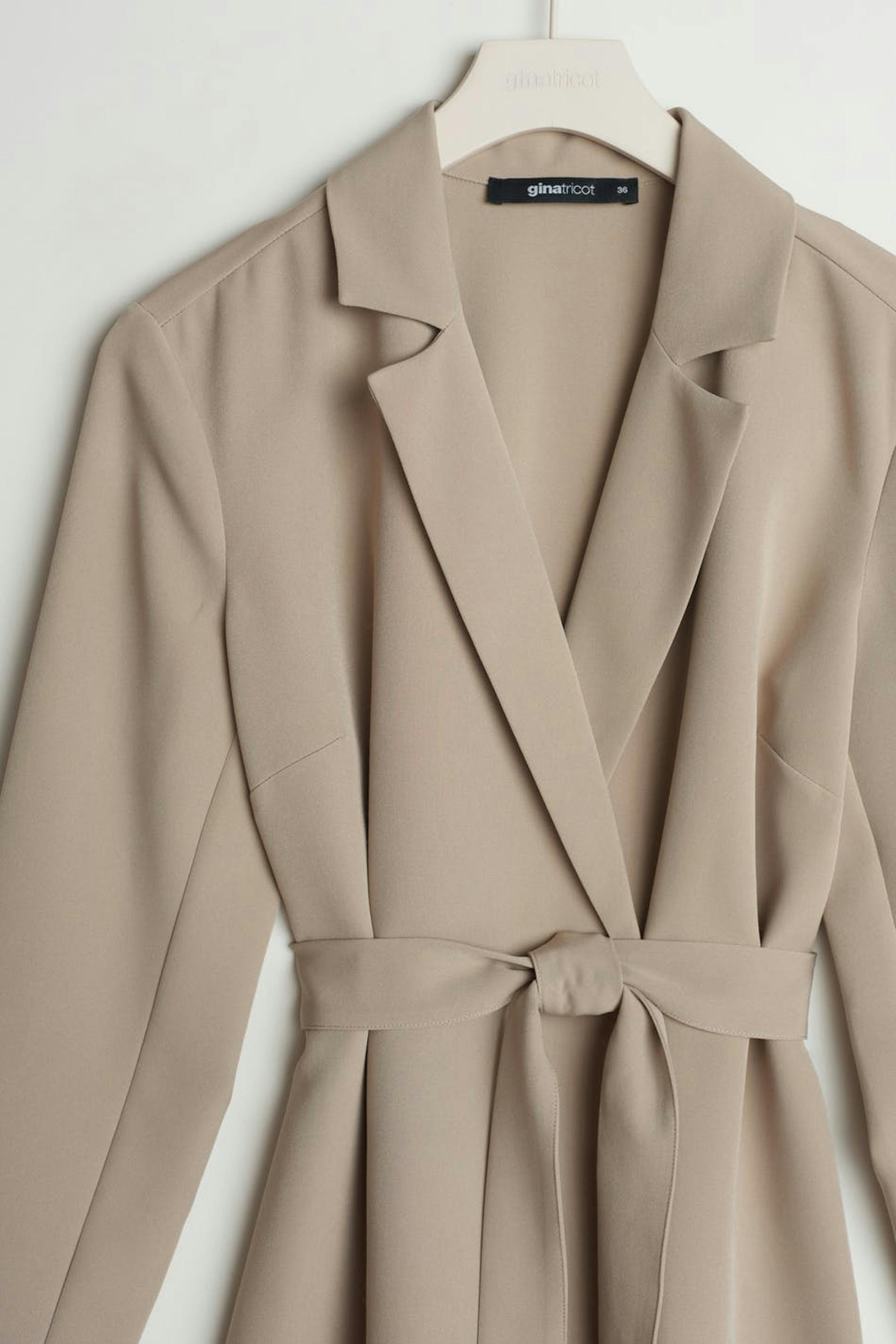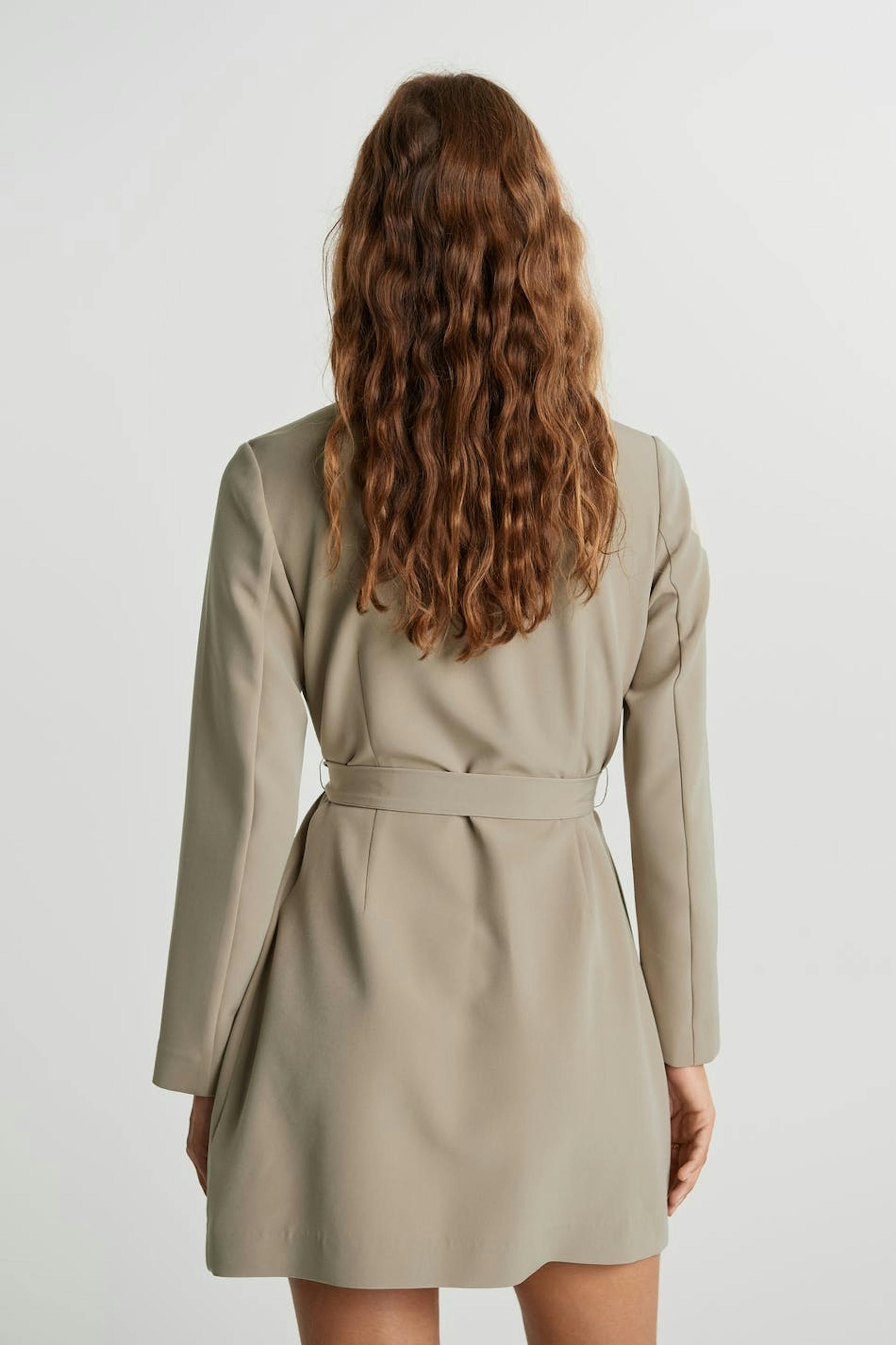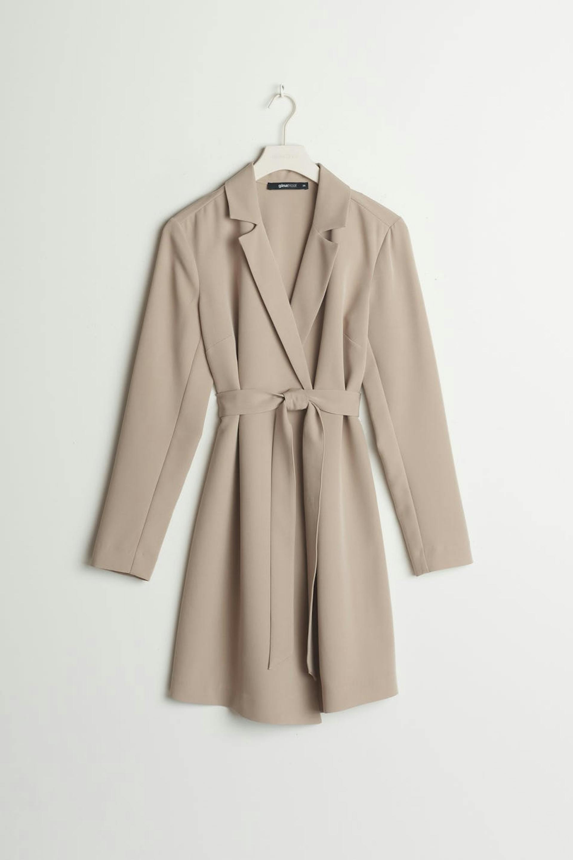 Lyhyt bleiserimekko normaalilla leikkauksella. Mekko on puolueelle täydellisesti sopiva ja beige ja siinä on punosvyö vyötäröllä. Siinä on kietaisumalli nepparilla.