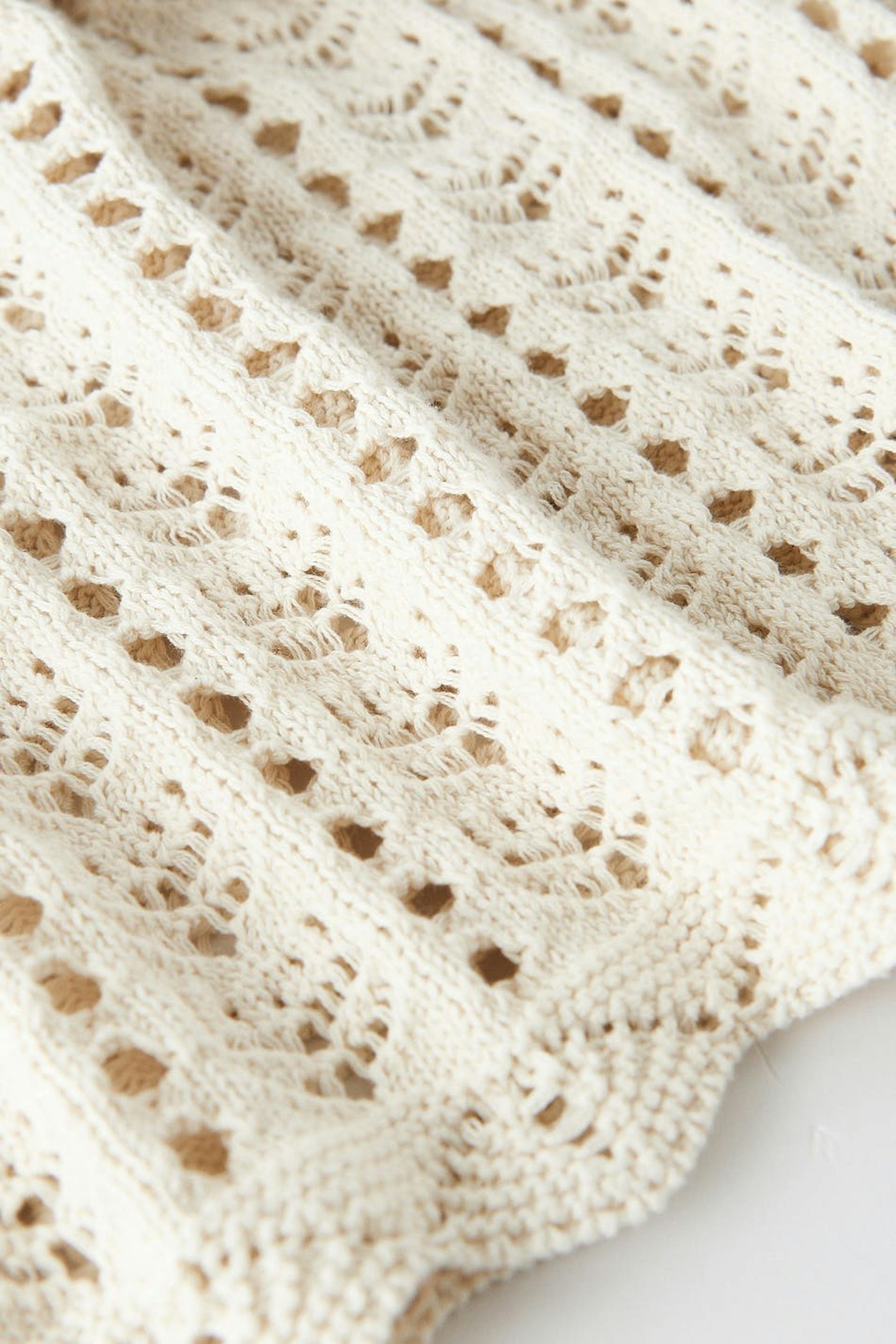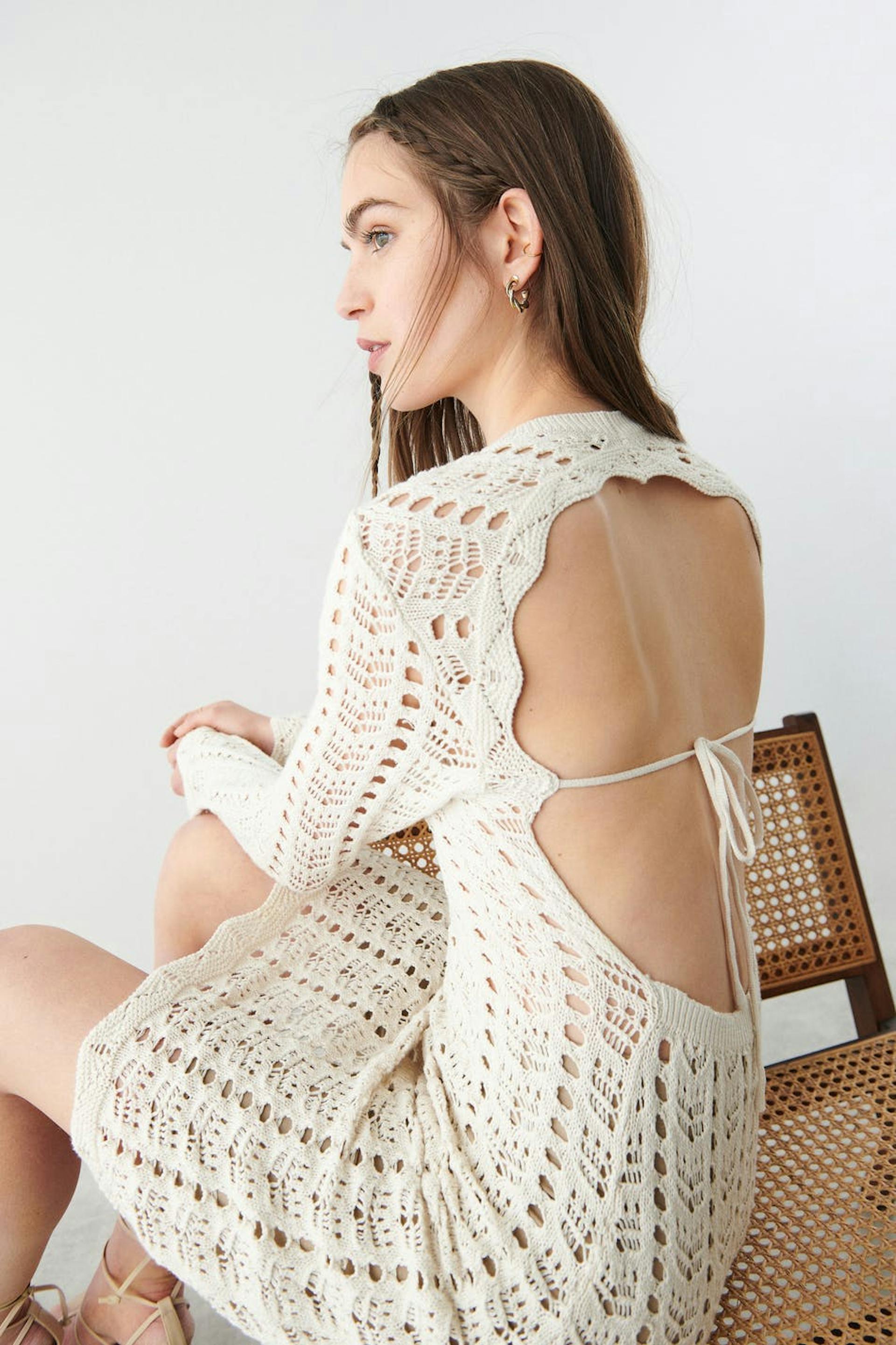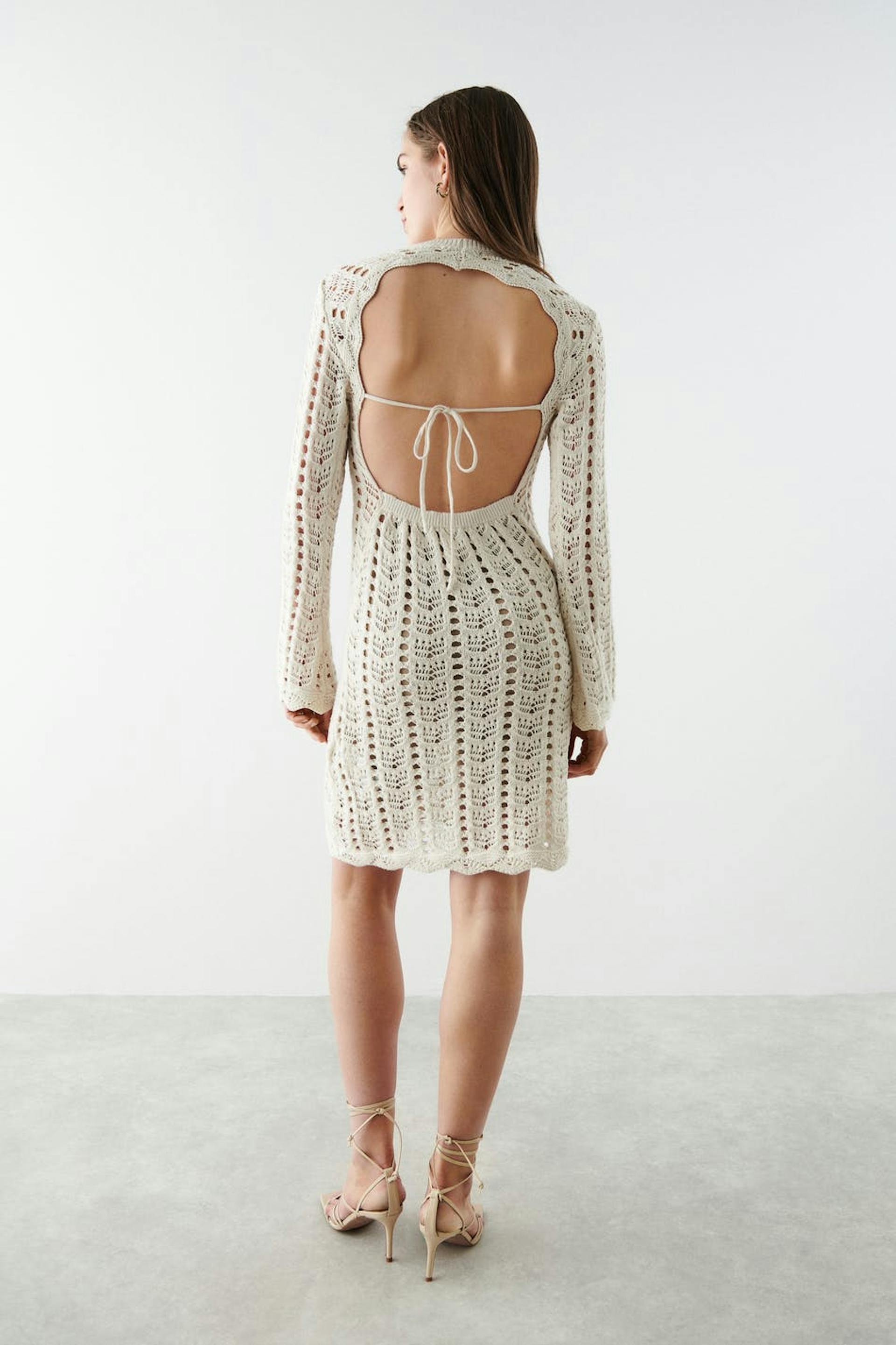 Neulottu mekko avonaisella selällä. Mekko on pitkähihainen, lyhyt ja valkoinen. Siinä on solmuyksityiskohta selässä ja pyöreä, ribattu kaula-aukko.