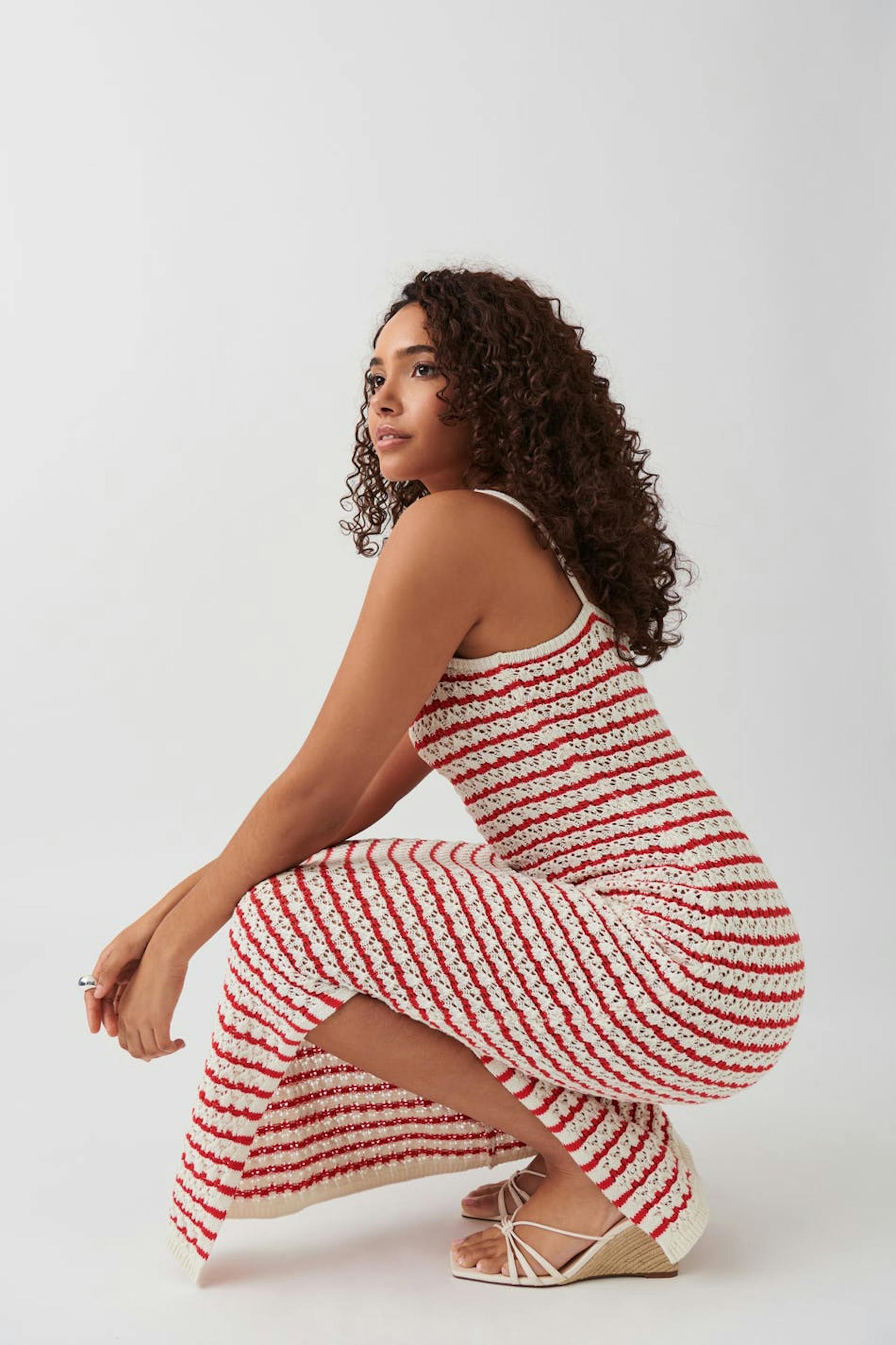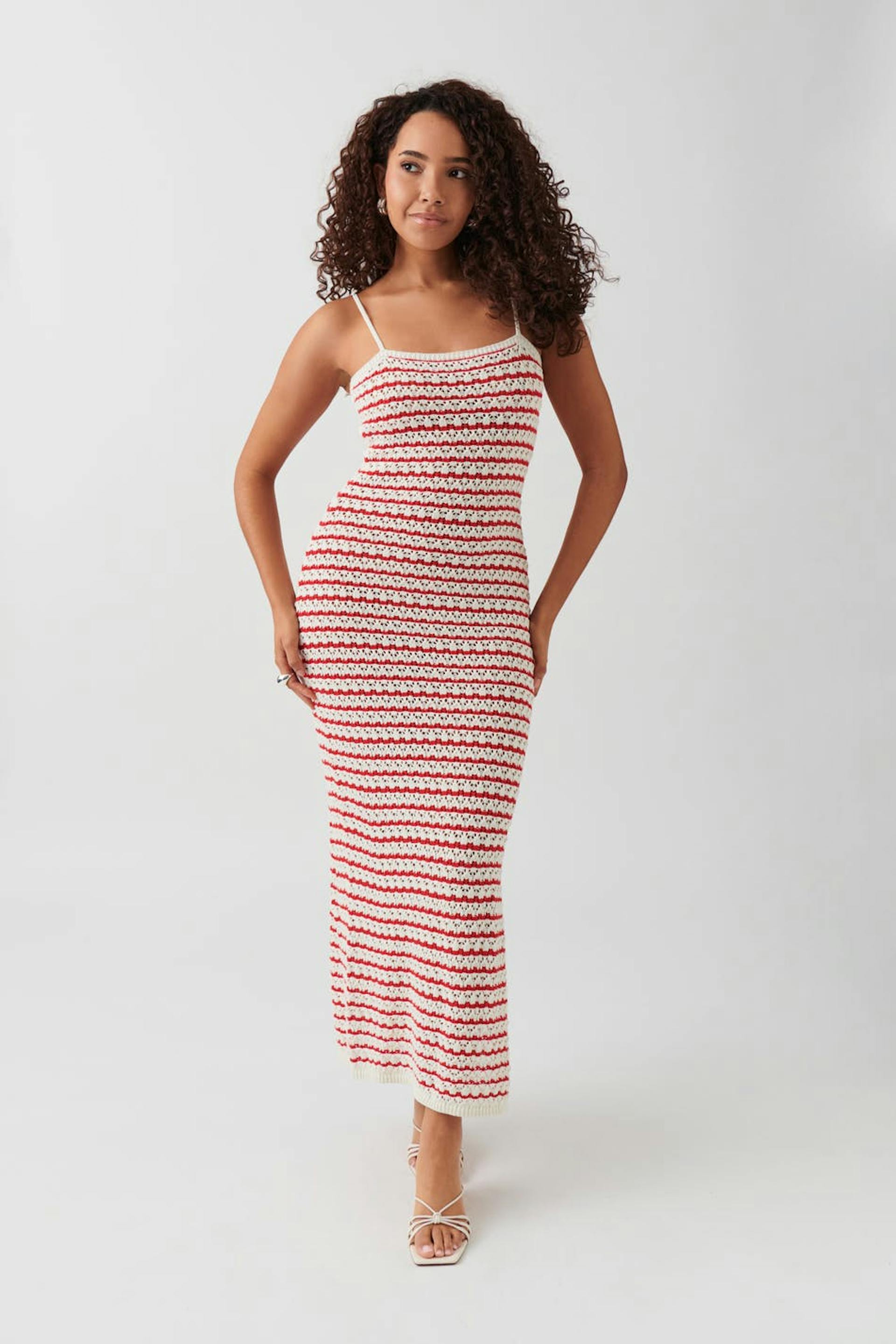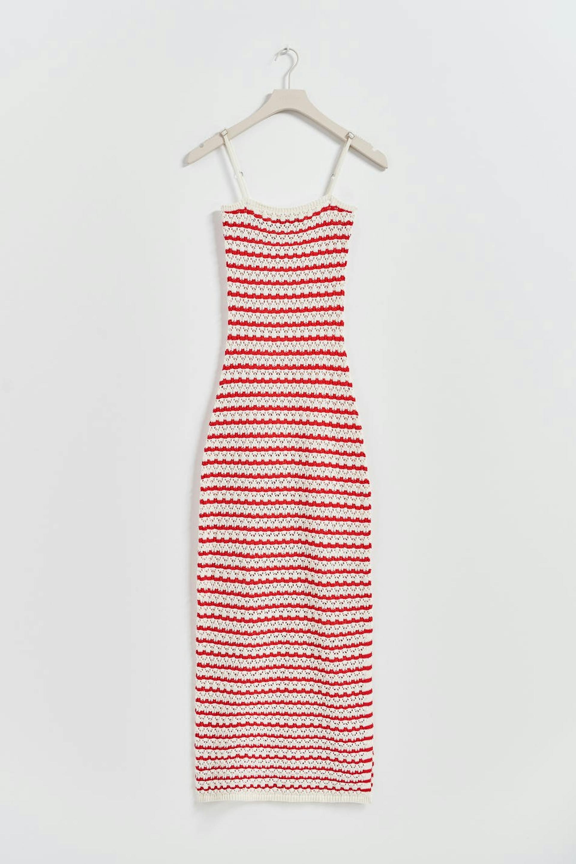 Raidallinen mekko halkiolla sivulla. Mekko on punainen, virkattu ja hihaton. Siinä on levenevä hame ja kapeat, säädettävät olkaimet.