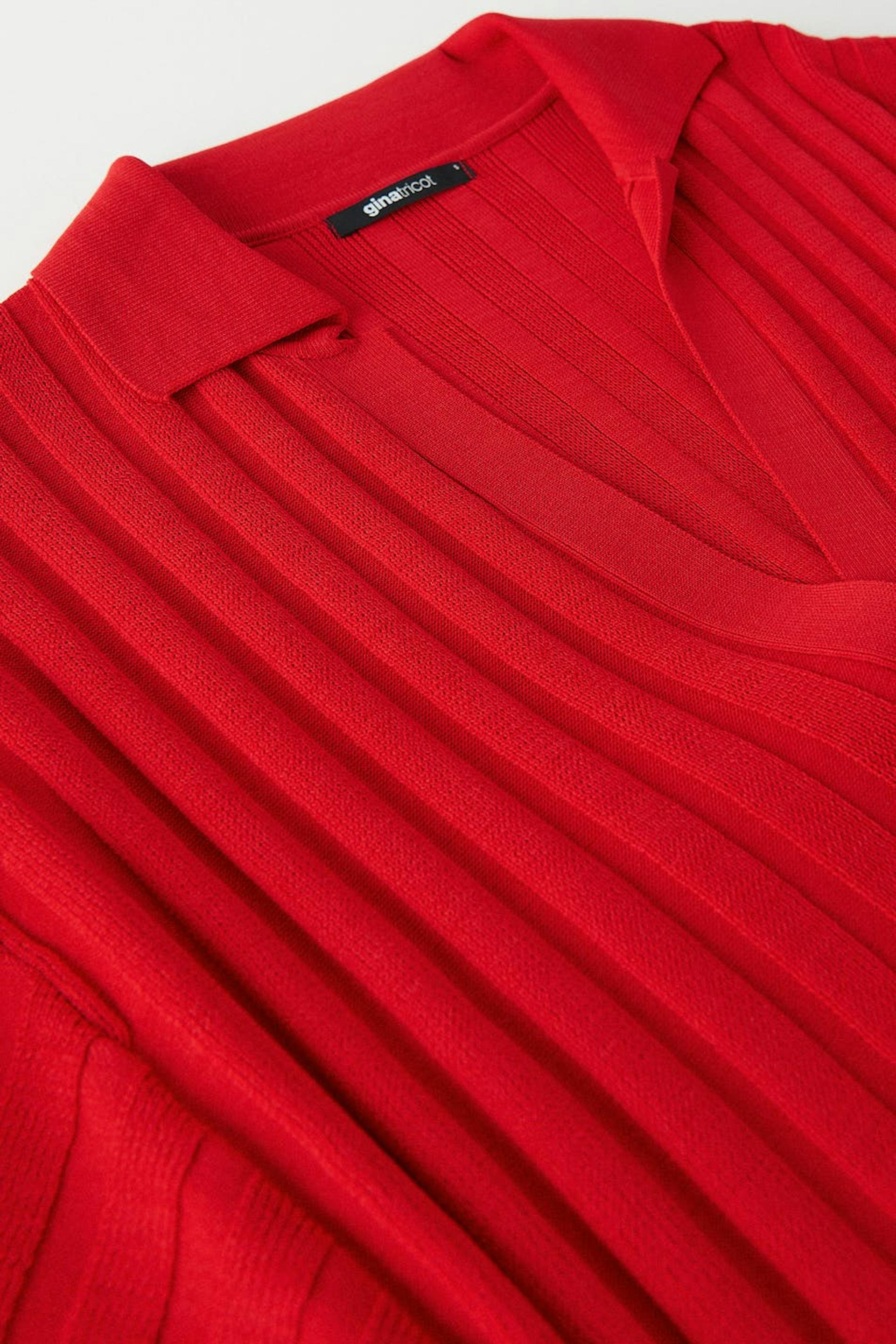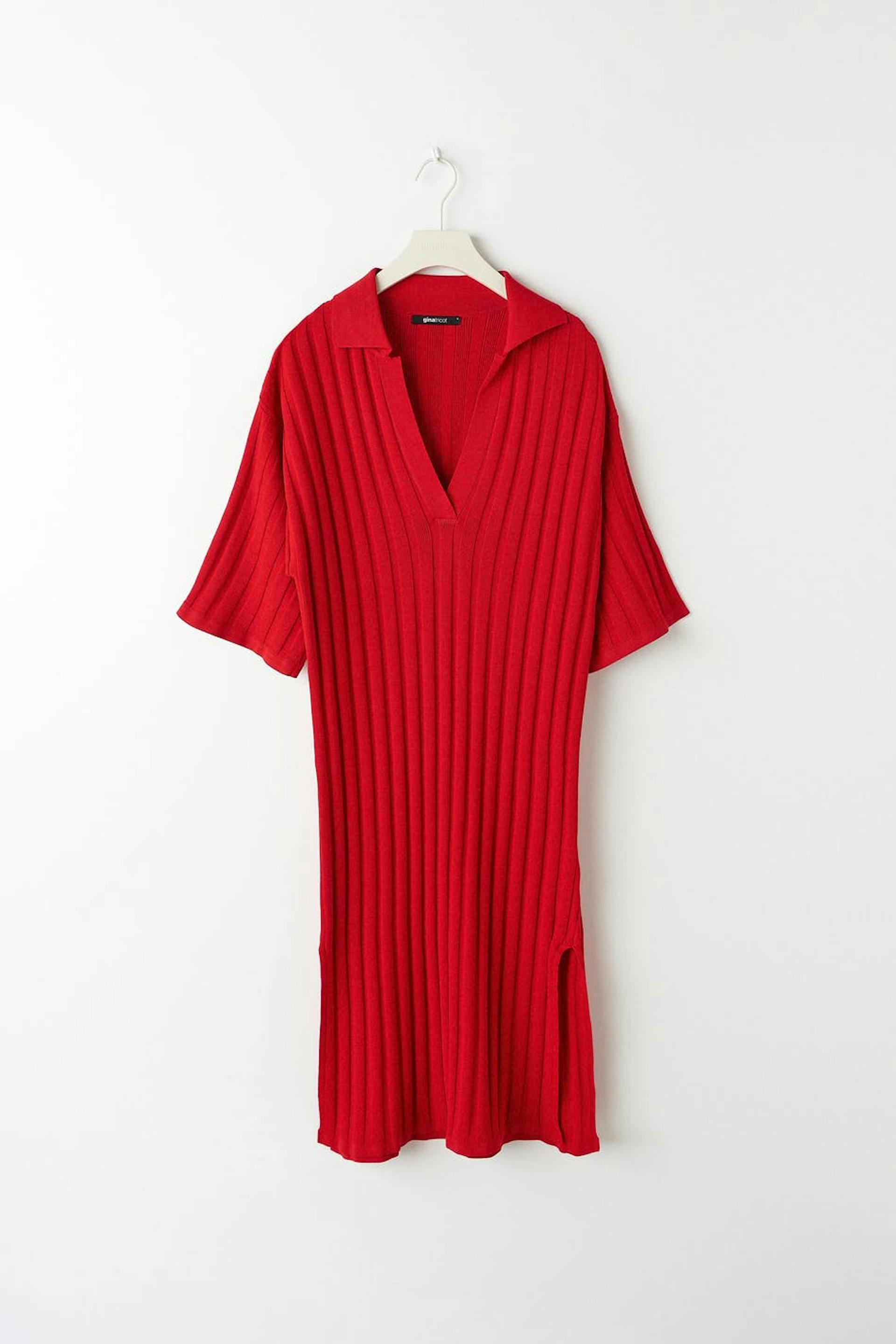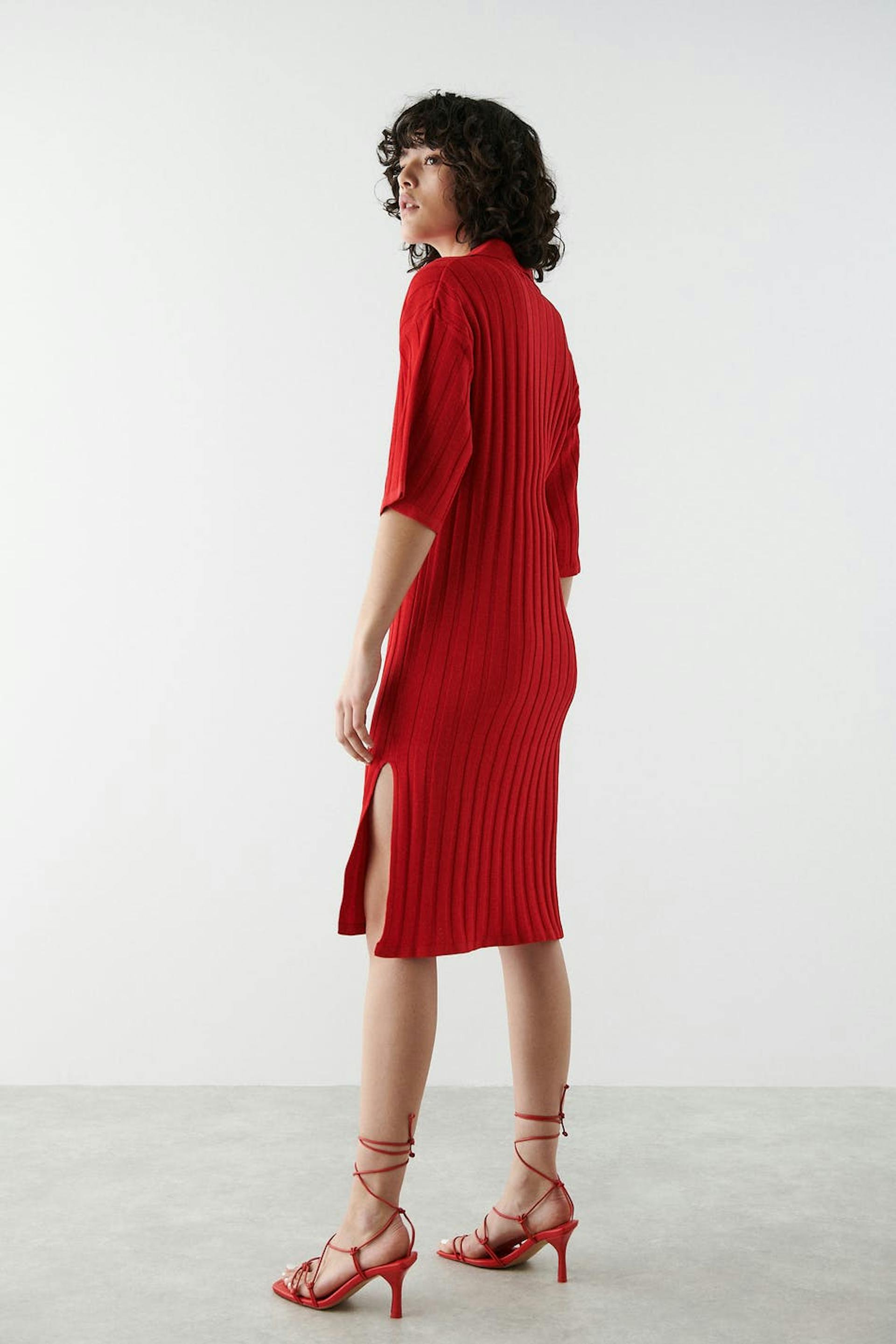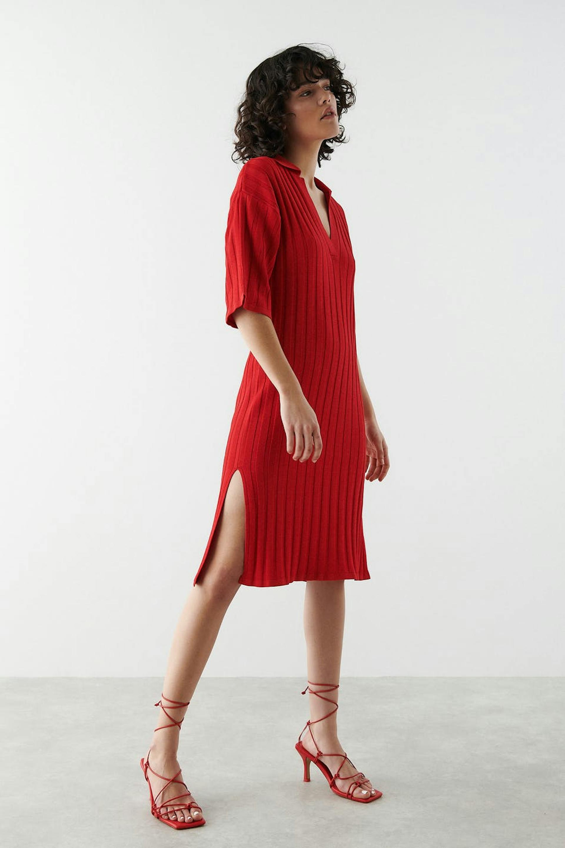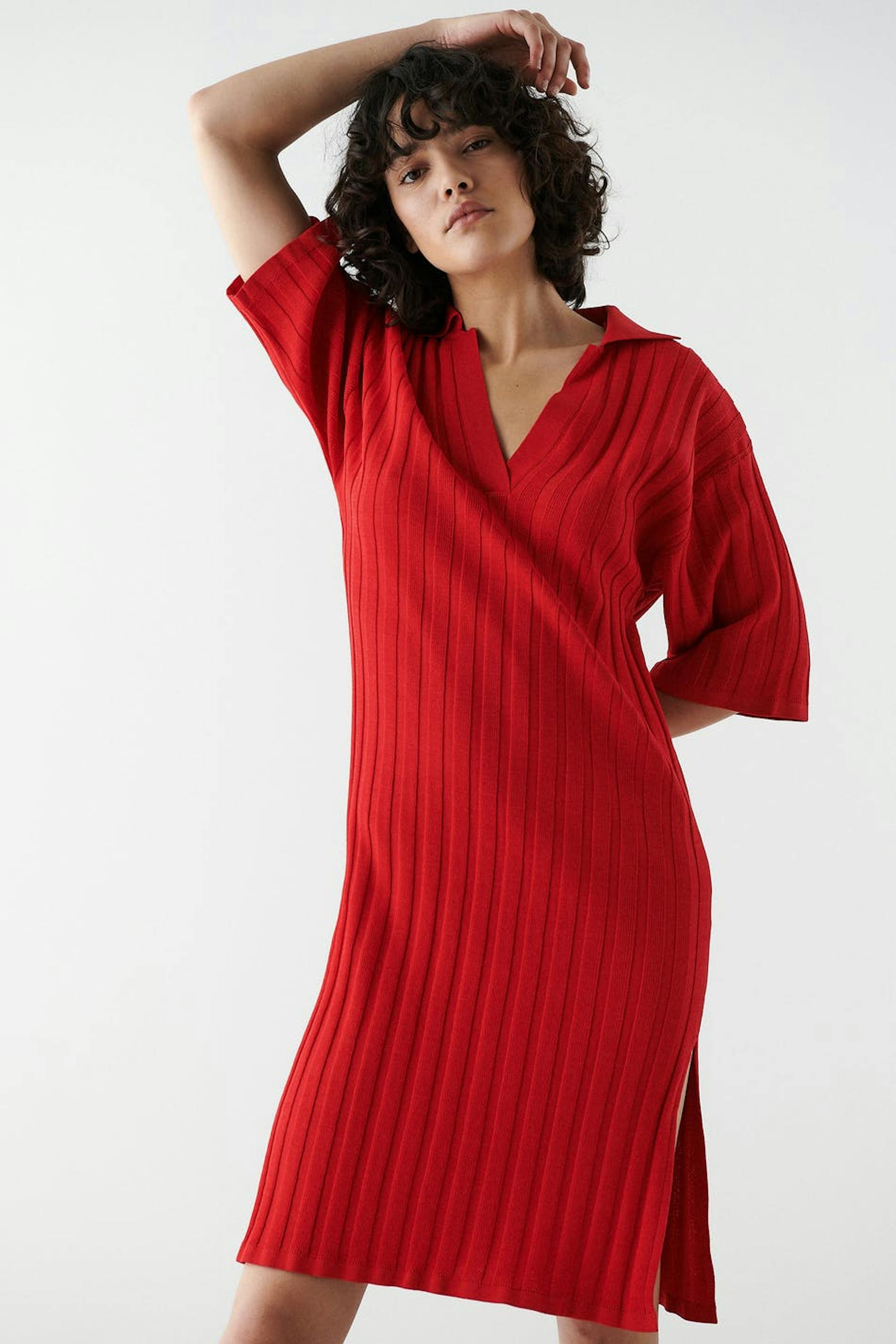 Resorimainen mekko lyhyillä hihoilla. Mekko on punainen ja siinä on v-pääntie paidan kauluksella. Siinä on midi-pituus ja halkio sivuissa.