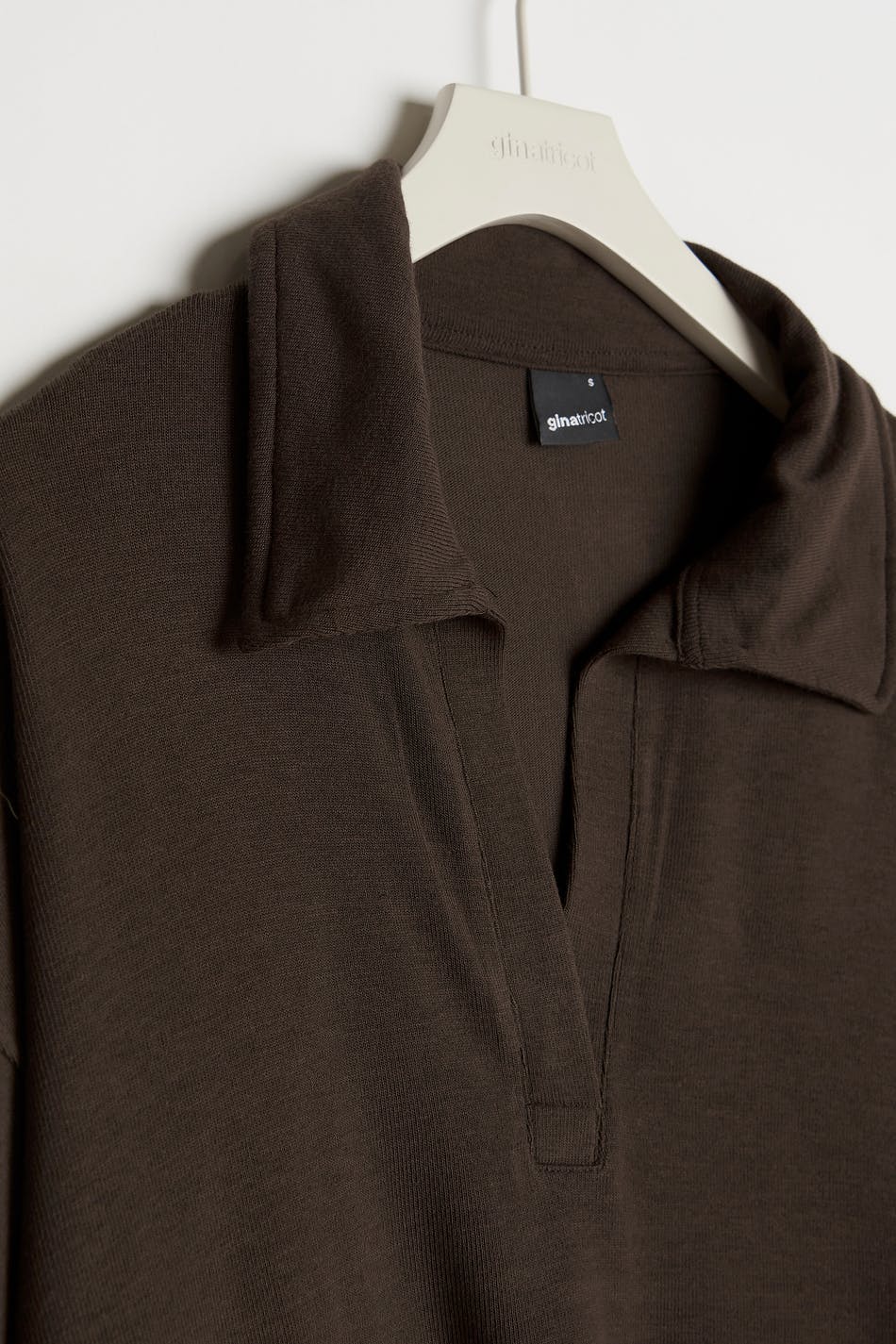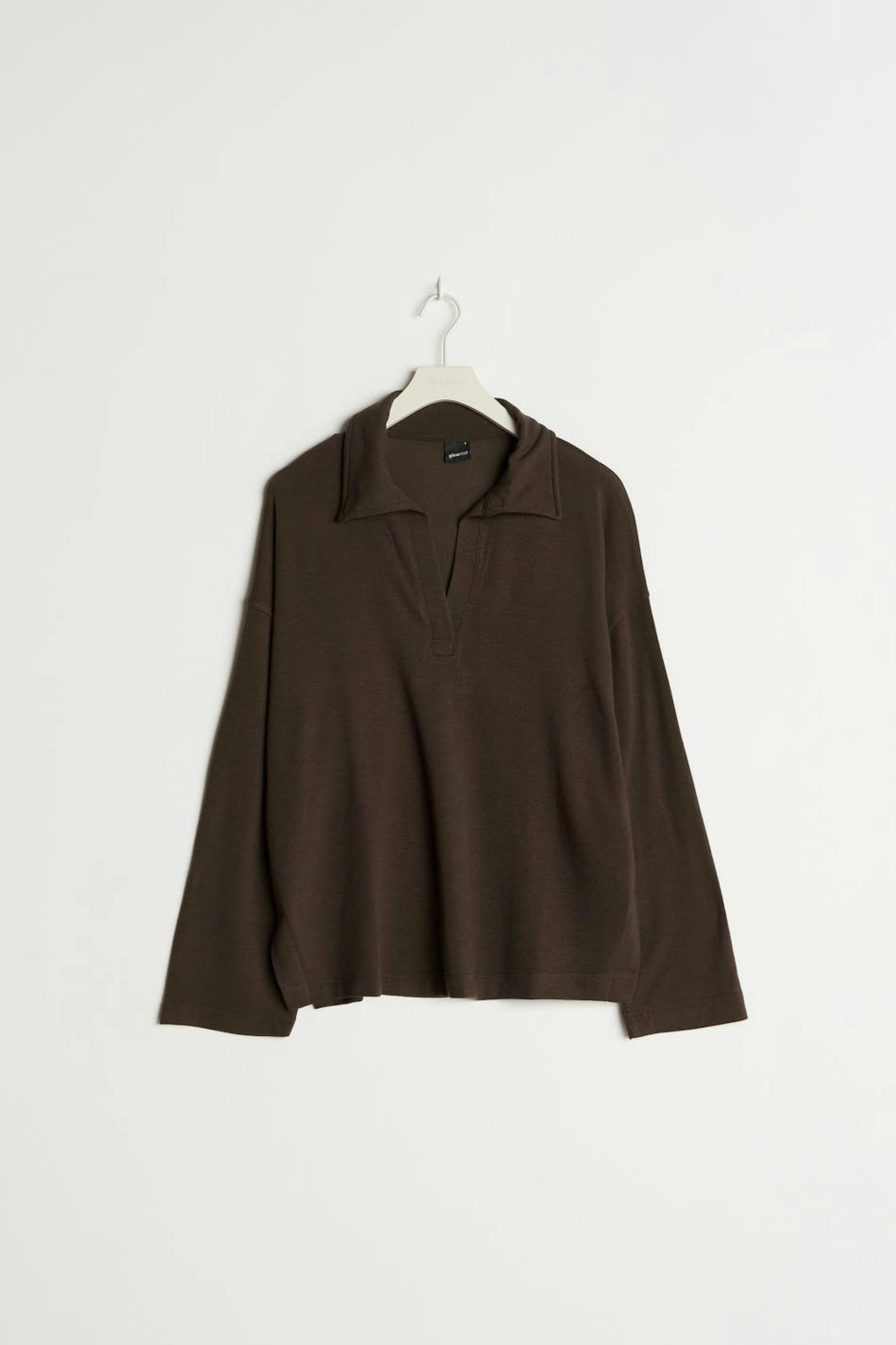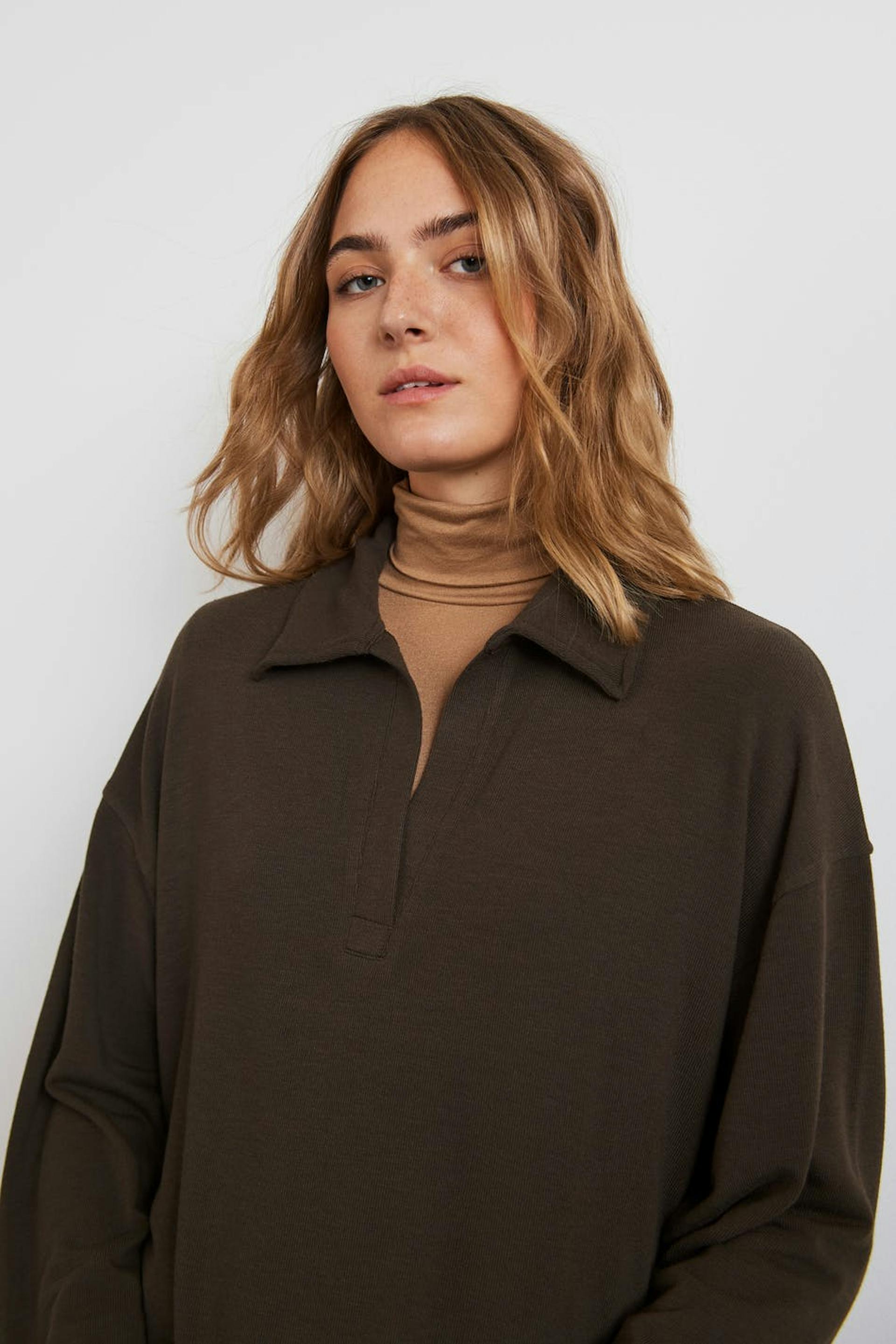 Neule oversized-mallilla. Neule on ruskea ja siinä on pehmeä laatu trikoosta. Siinä on V-aukko, kaulus, pudotetut olkapäät, halkio sivuissa ja leveät, pitkät hihat.