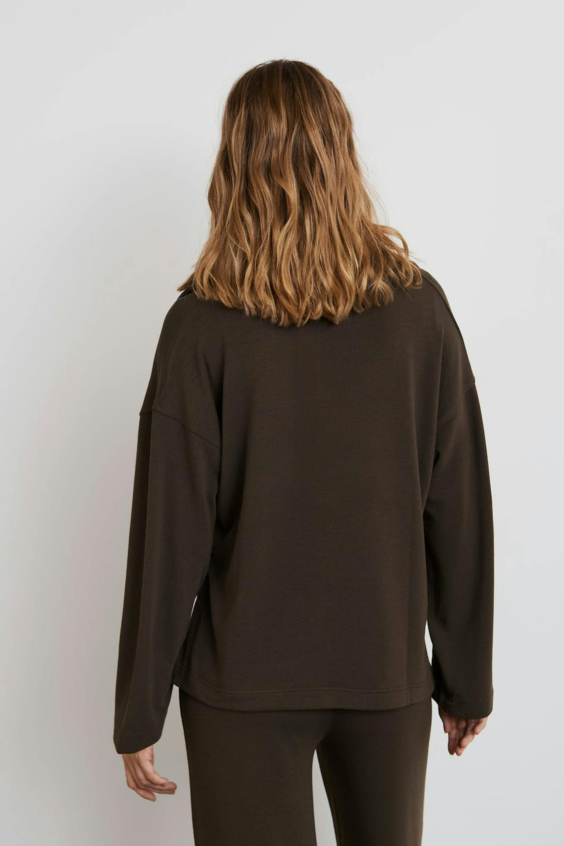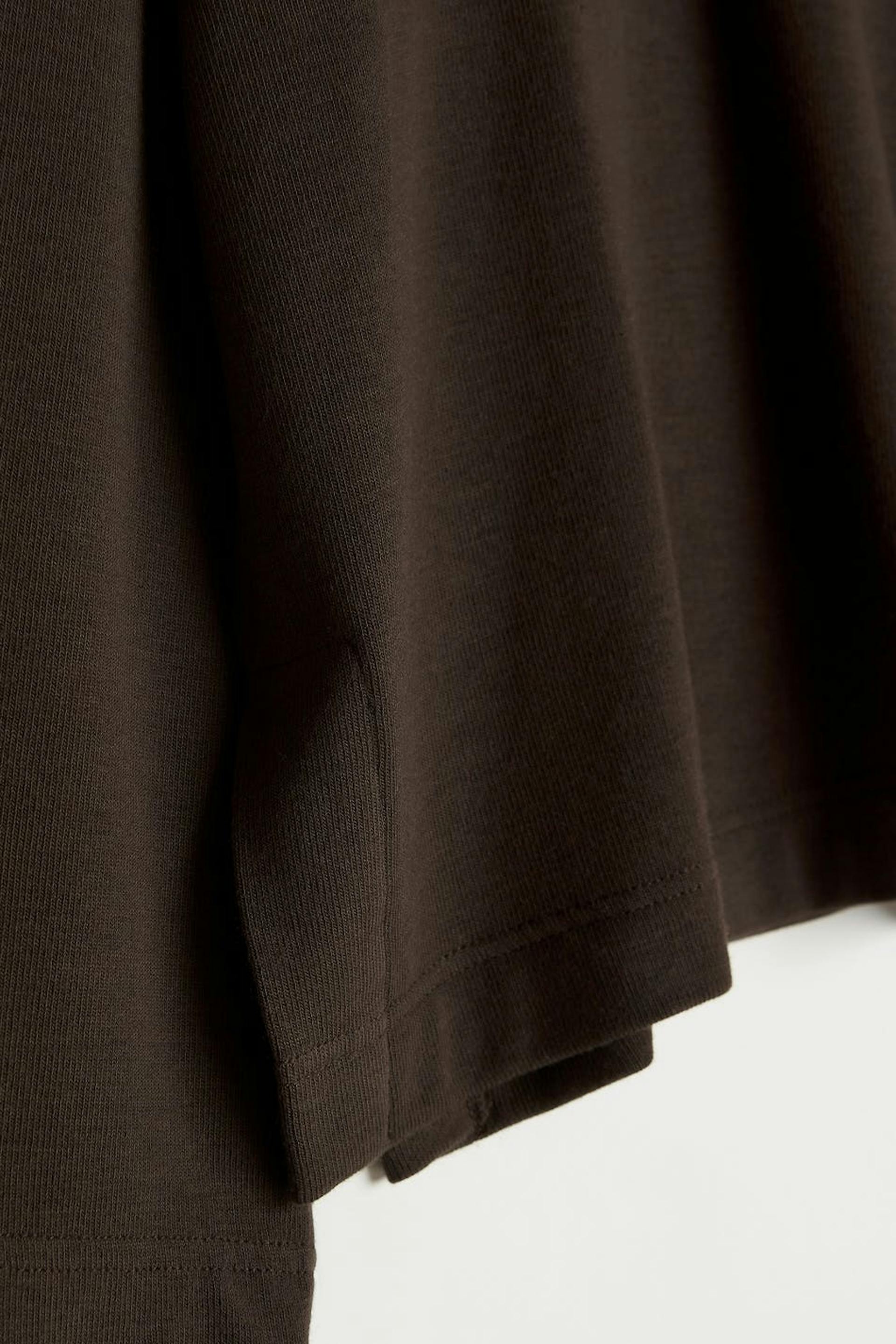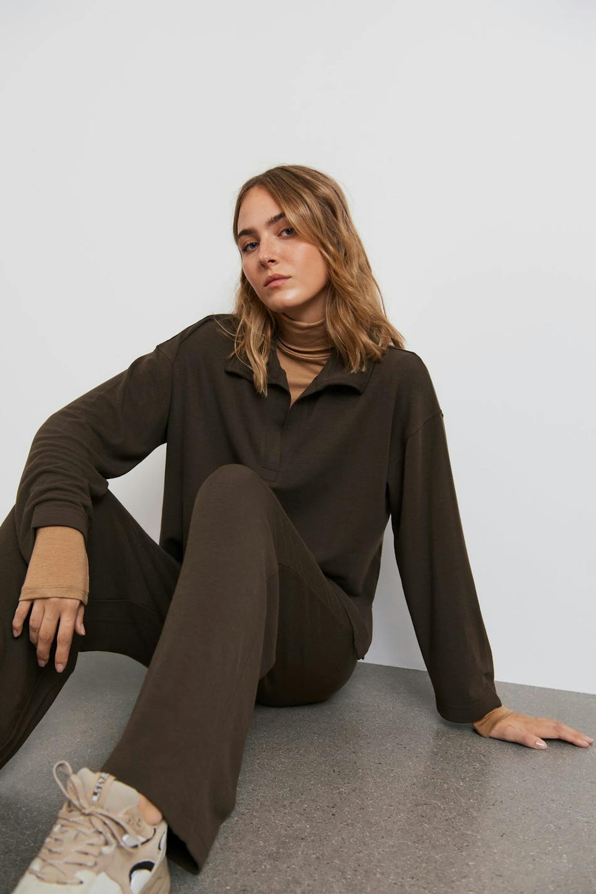 Neule oversized-mallilla. Neule on ruskea ja siinä on pehmeä laatu trikoosta. Siinä on V-aukko, kaulus, pudotetut olkapäät, halkio sivuissa ja leveät, pitkät hihat.