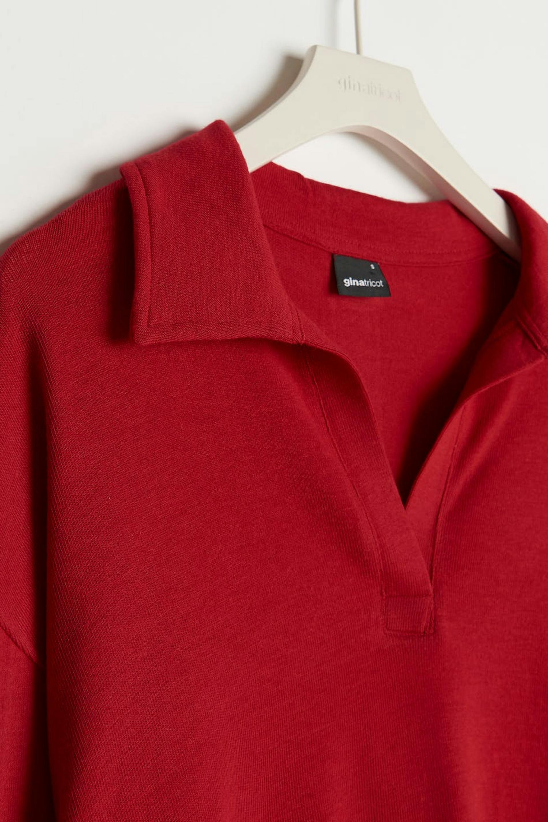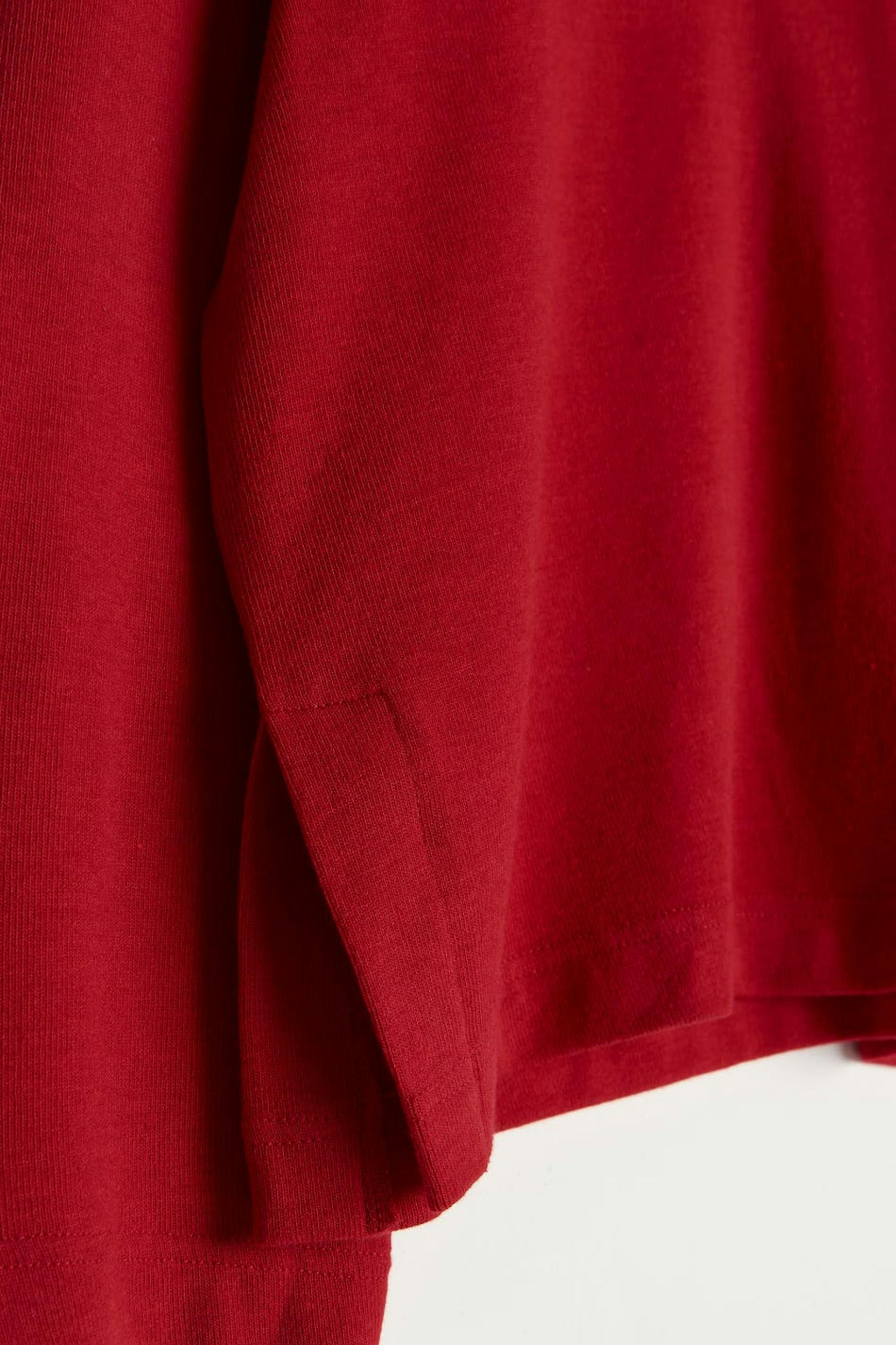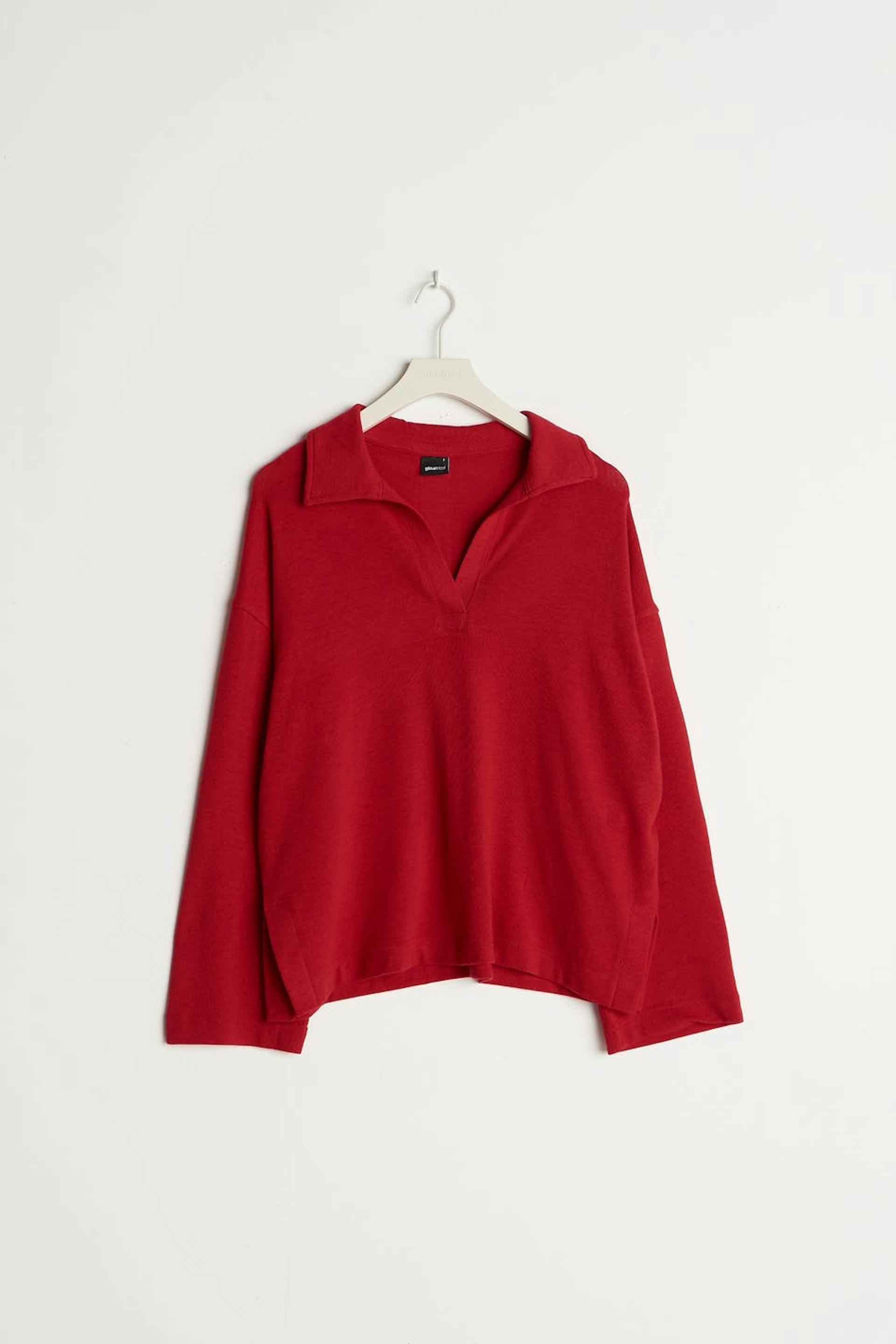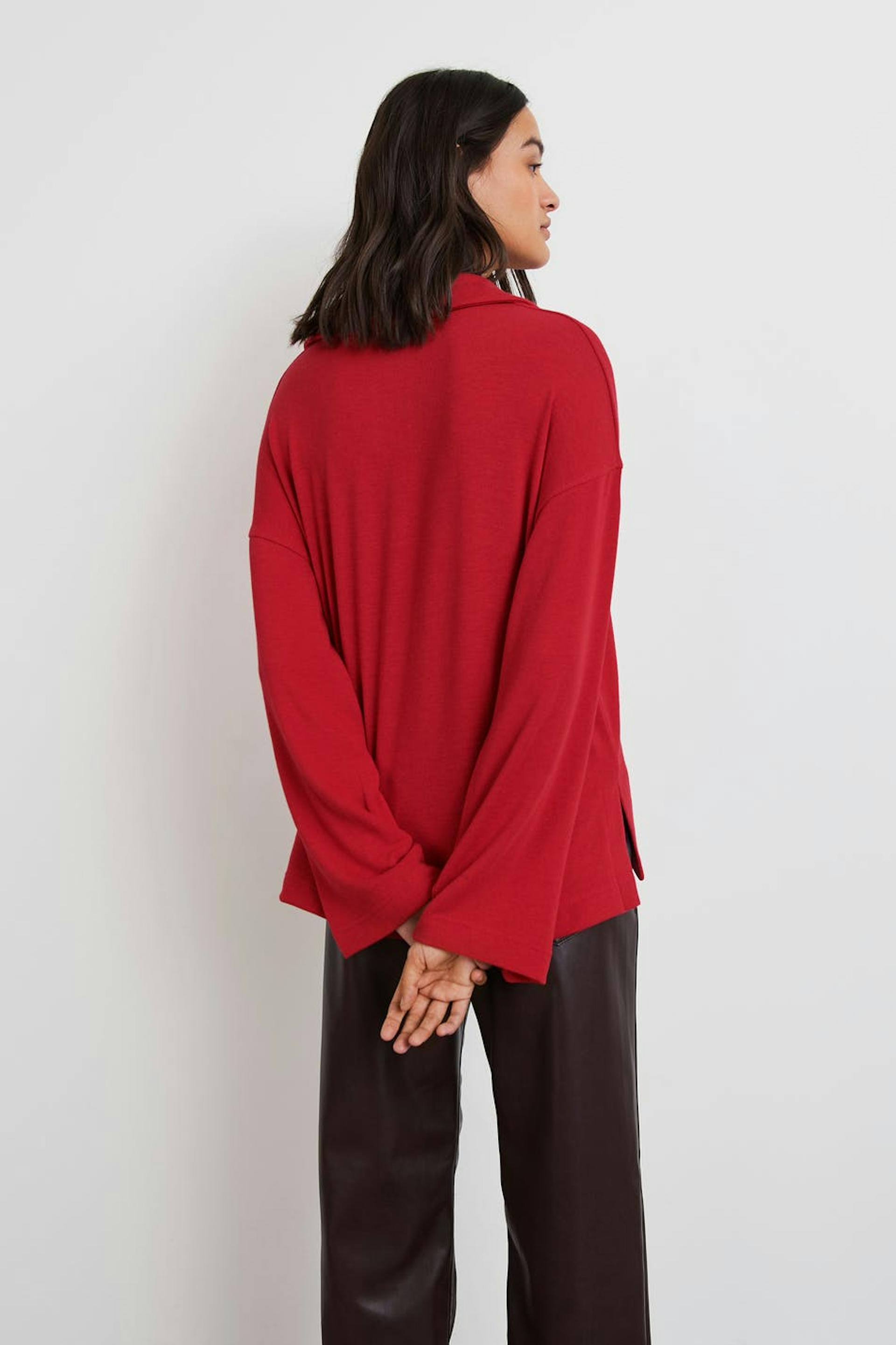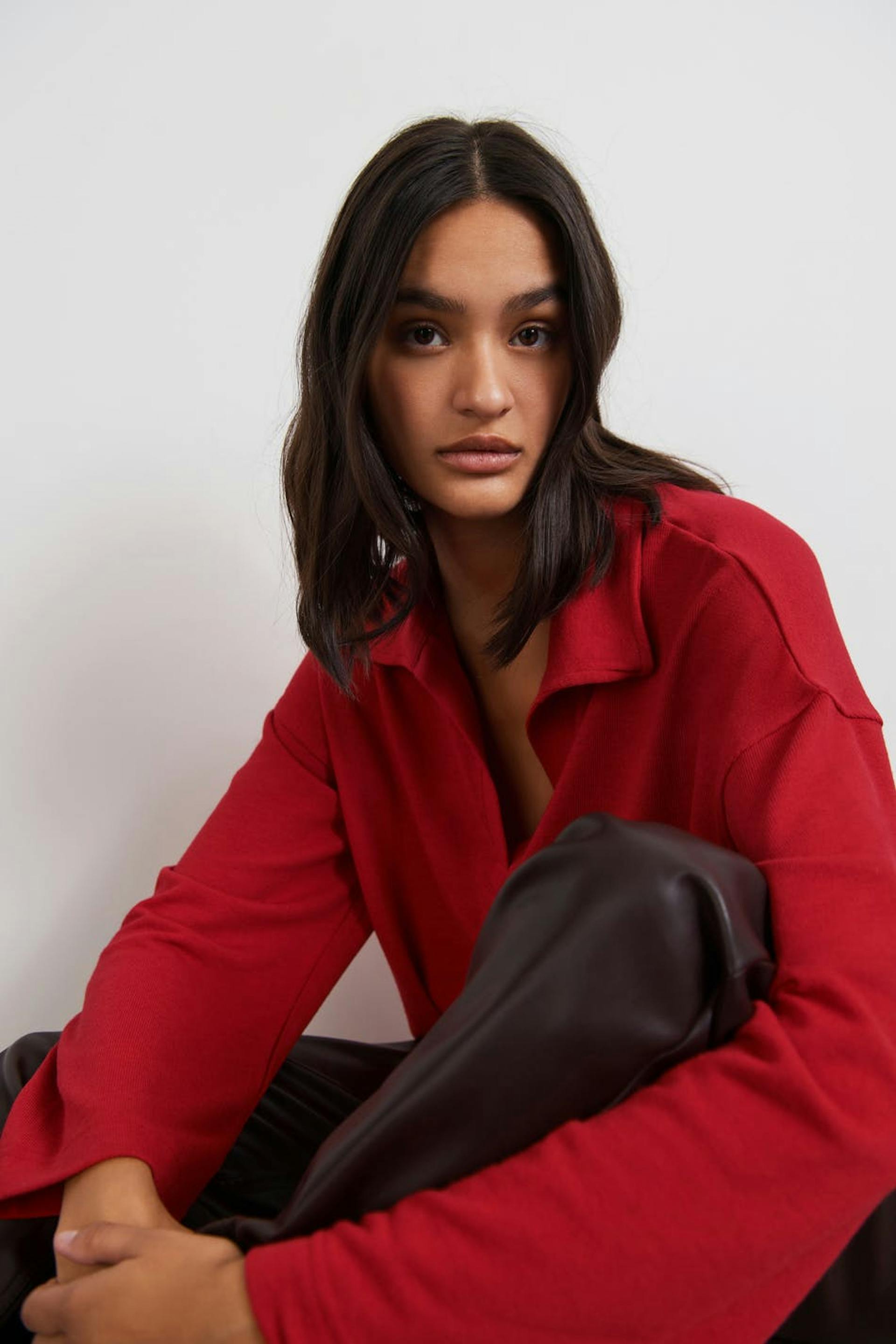 Neule oversized-mallilla. Neule on punainen ja siinä on pehmeä laatu trikoosta. Siinä on V-aukko, kaulus, pudotetut olkapäät, halkio sivuissa ja leveät, pitkät hihat.