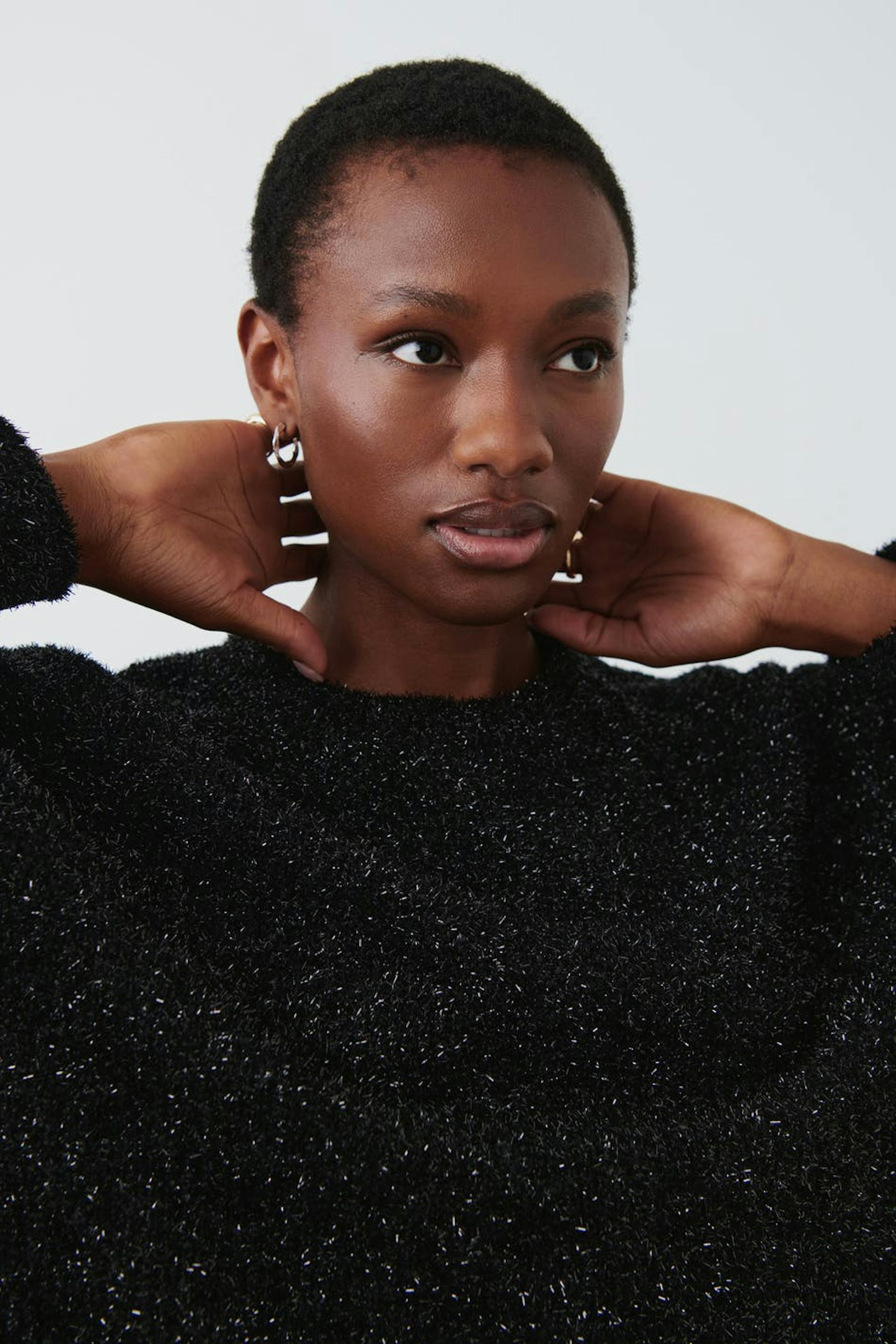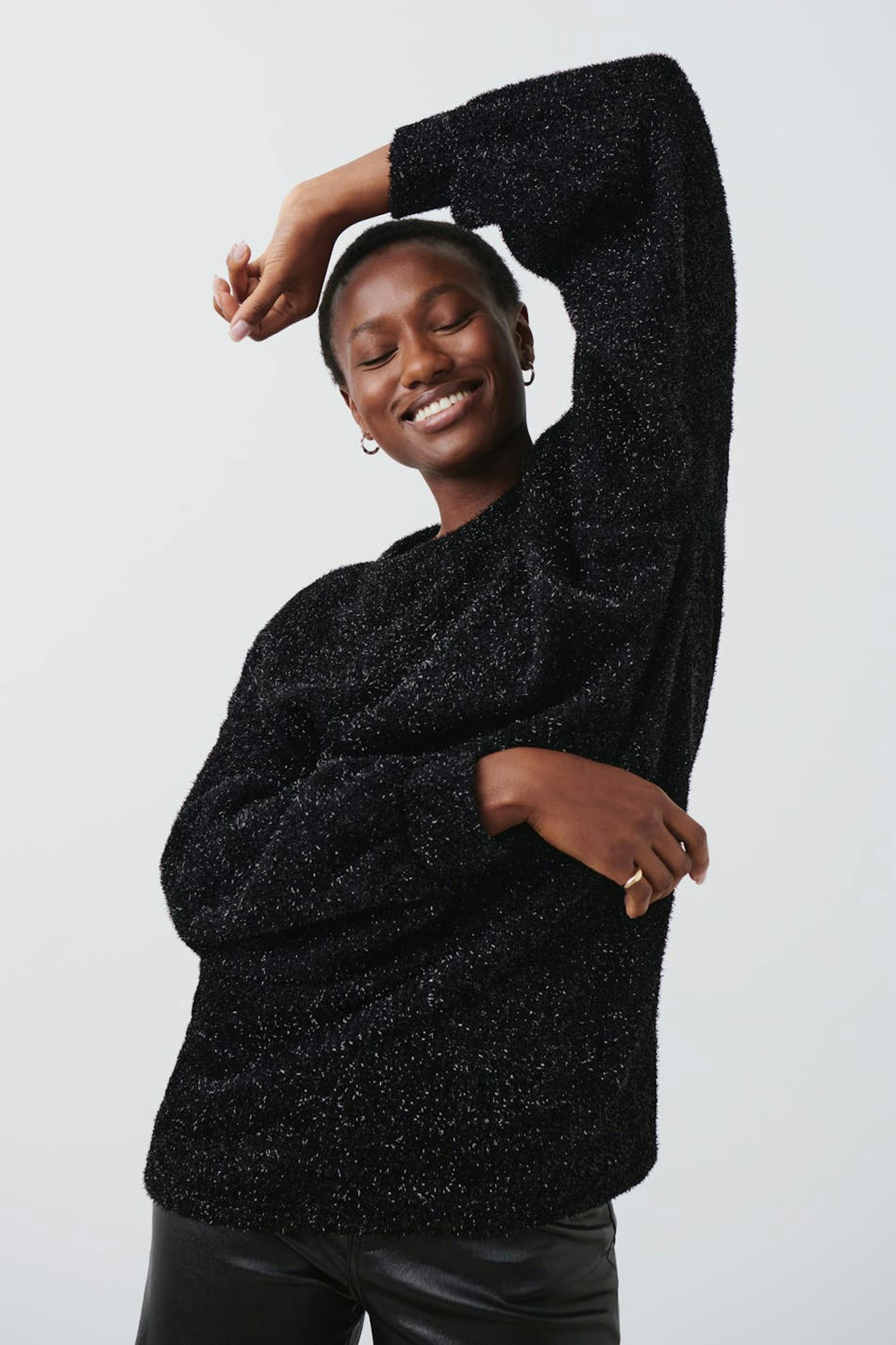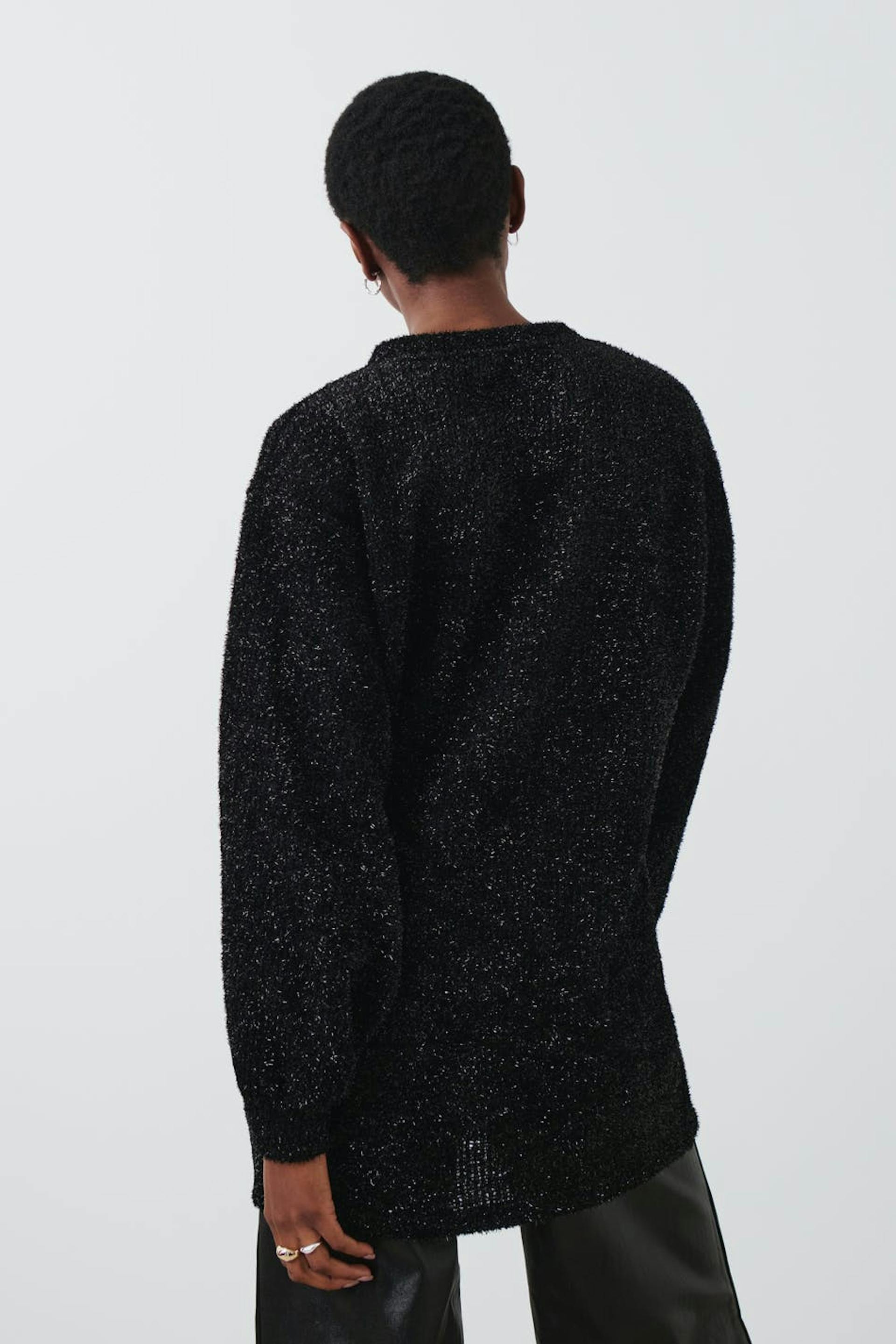 Kimalteleva neulepusero pyöreällä pääntiellä. Pusero on musta ja siinä on oversized-malli.