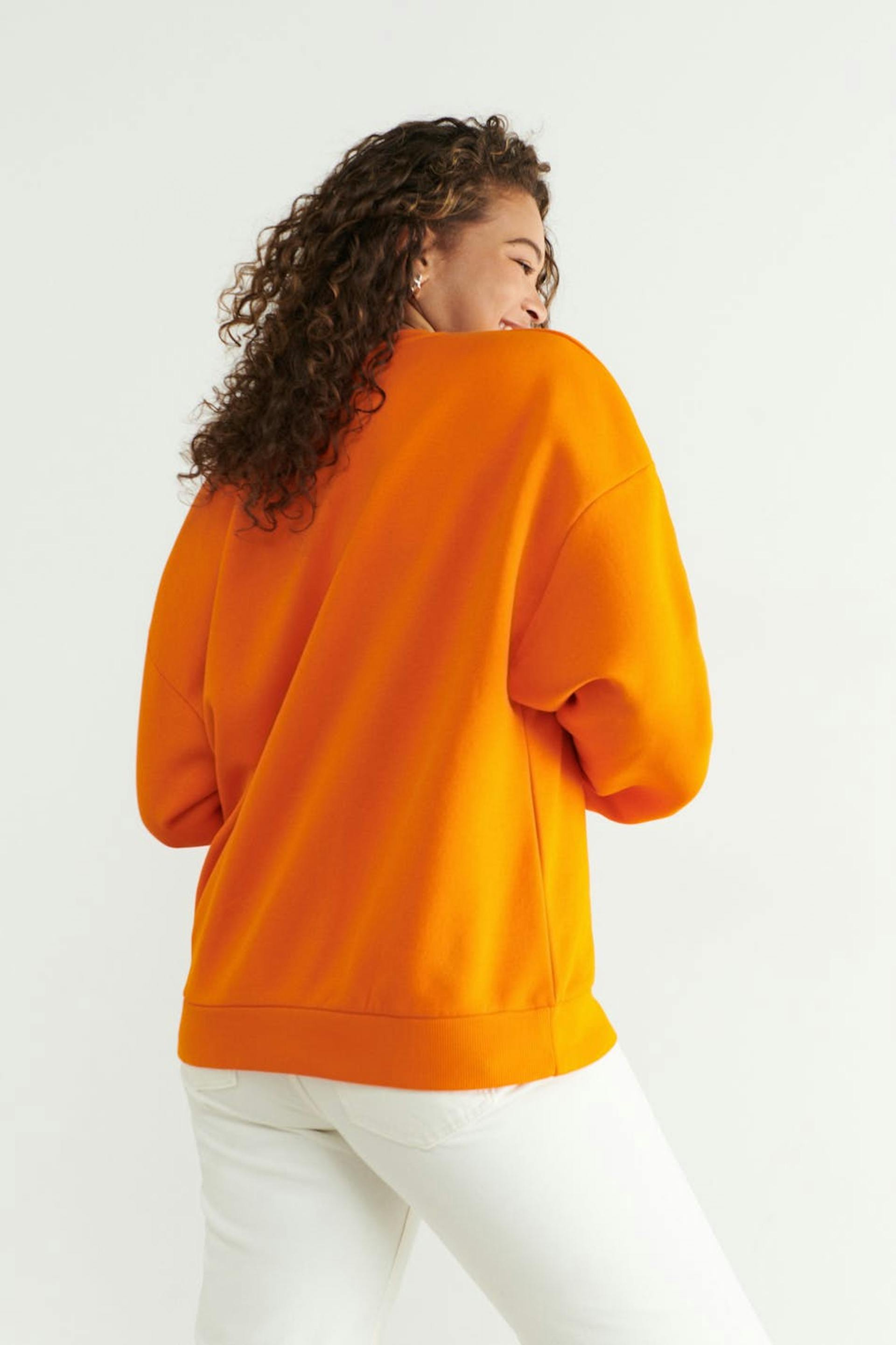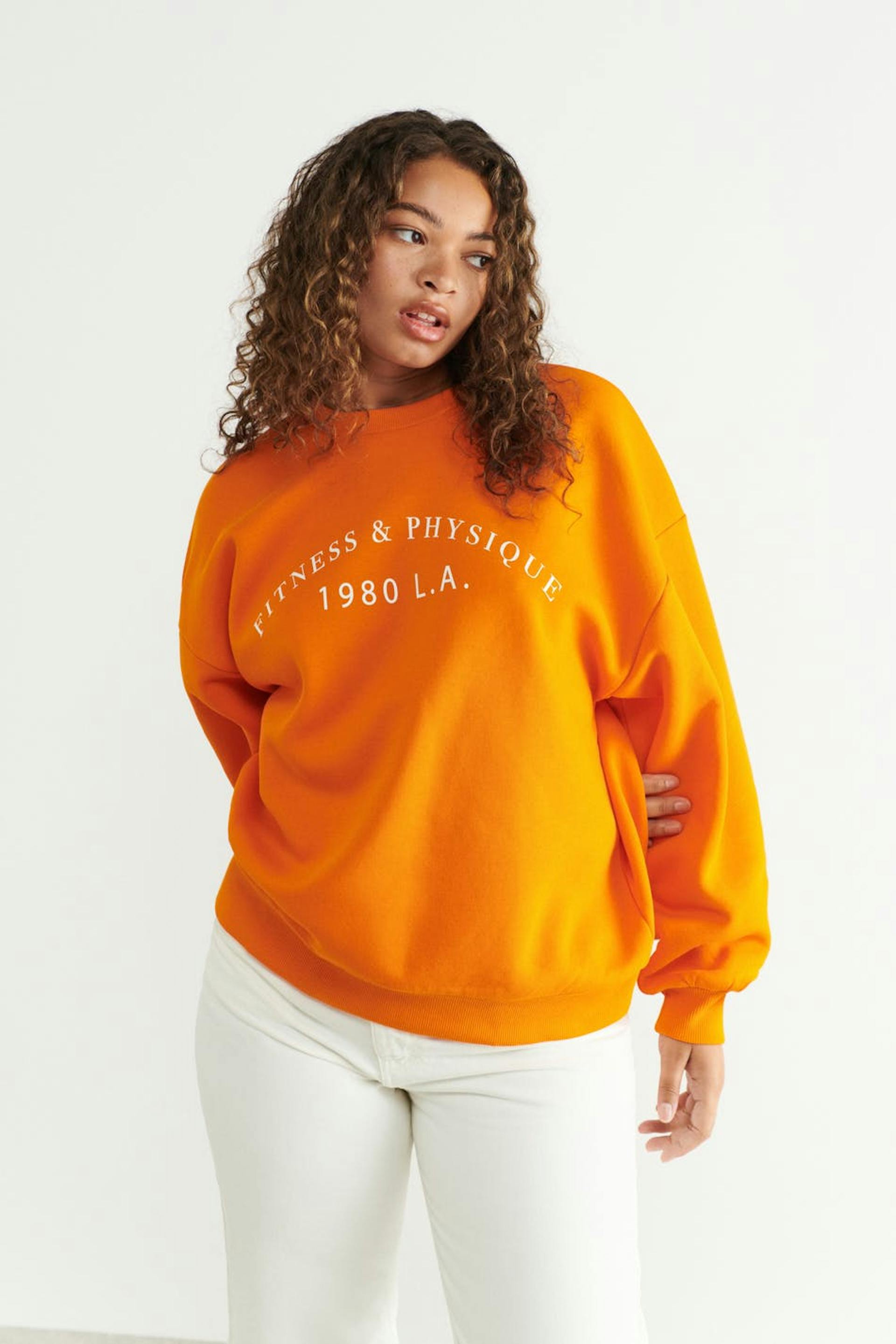 Collegepusero printillä. Collegepuserossa on oversized-malli. Siinä on pyöristetty kaula-aukko ja ribbiresori hihansuissa ja helmassa.
