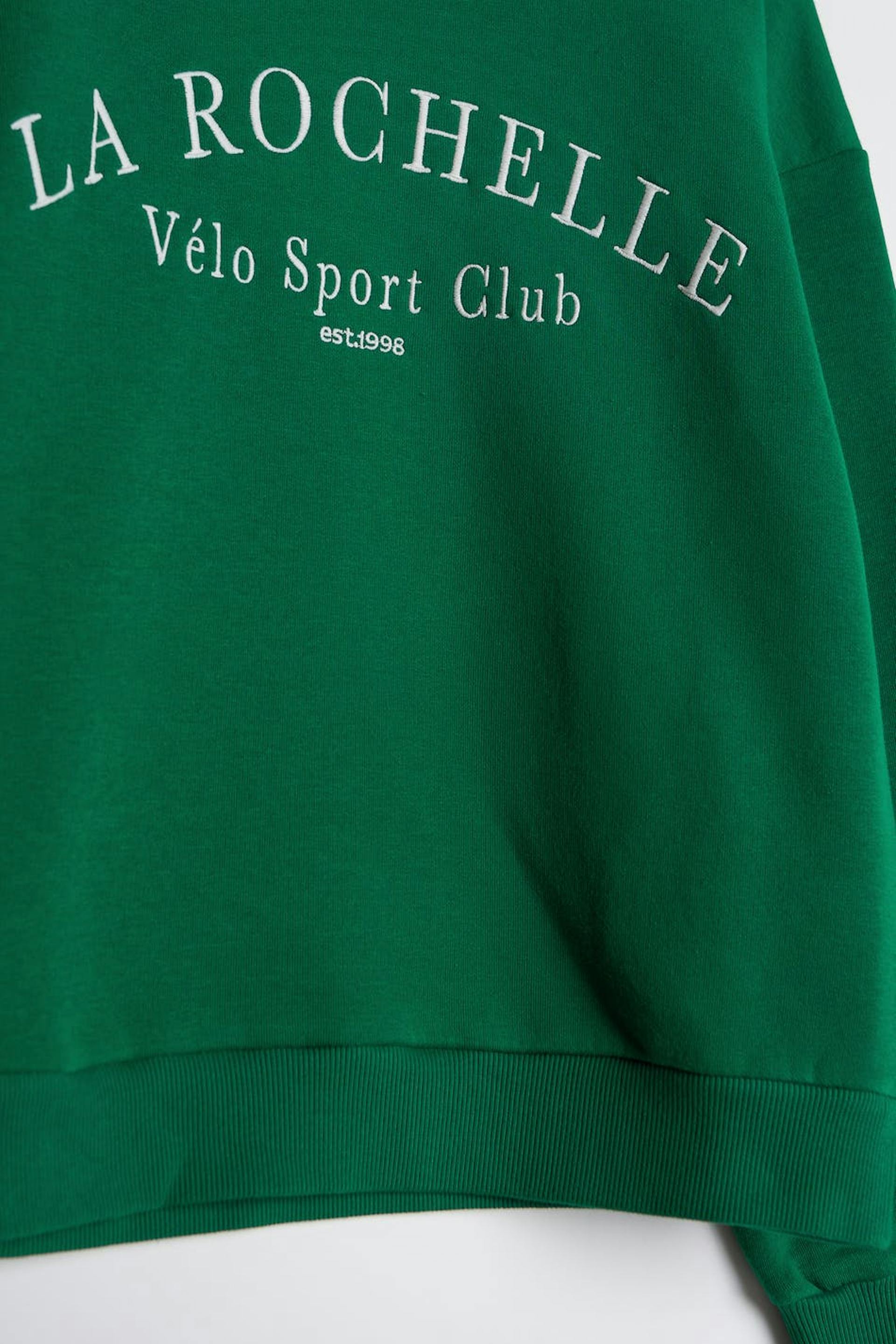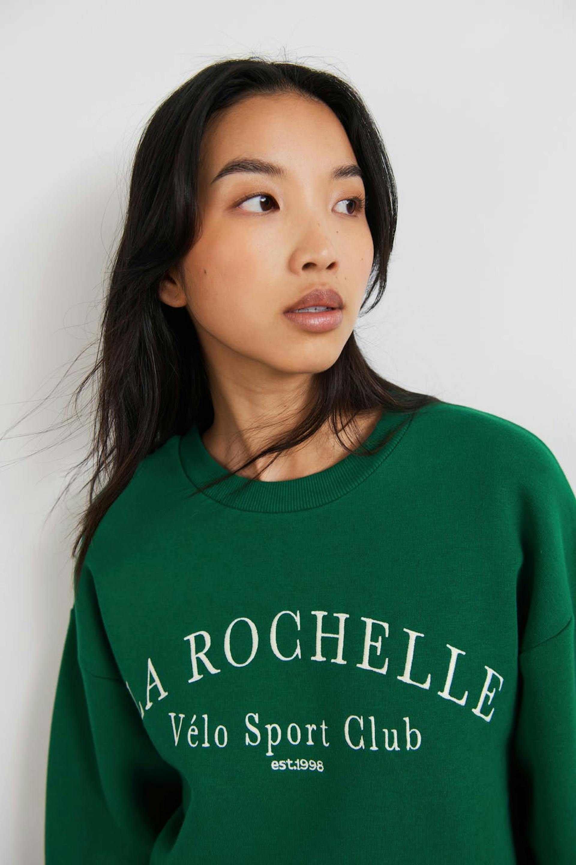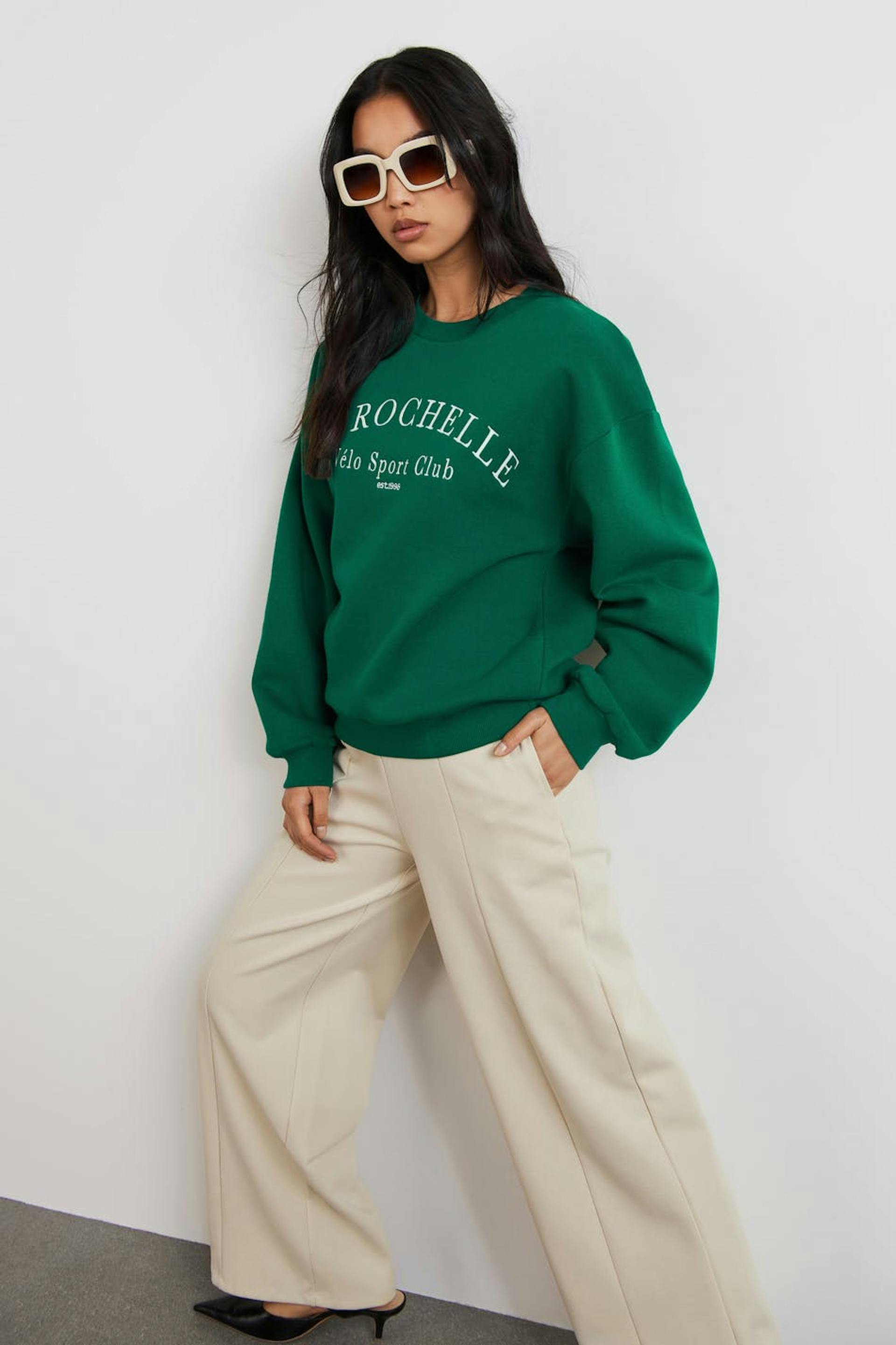 Collegepusero oversized-mallilla. Collegepusero on vihreä ja siinä on printti edessä. Siinä on pyöristetty kaula-aukko ja ribbiresori hihansuissa ja helmassa.