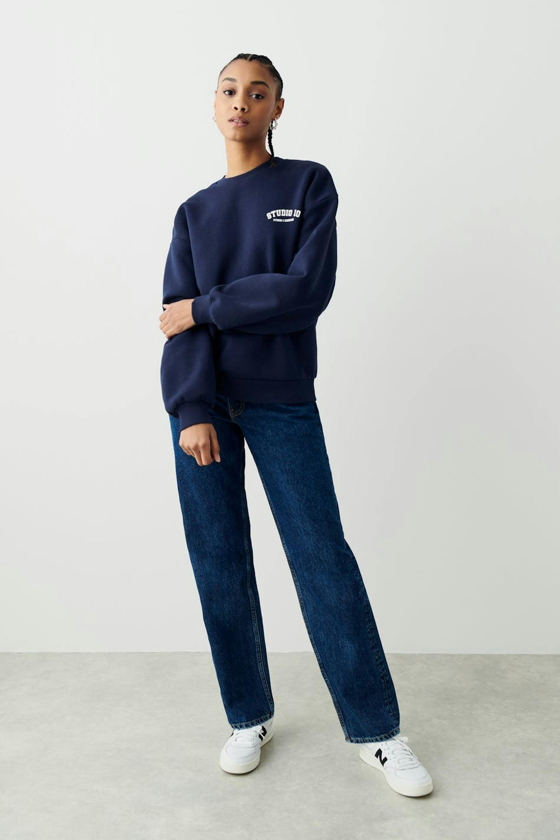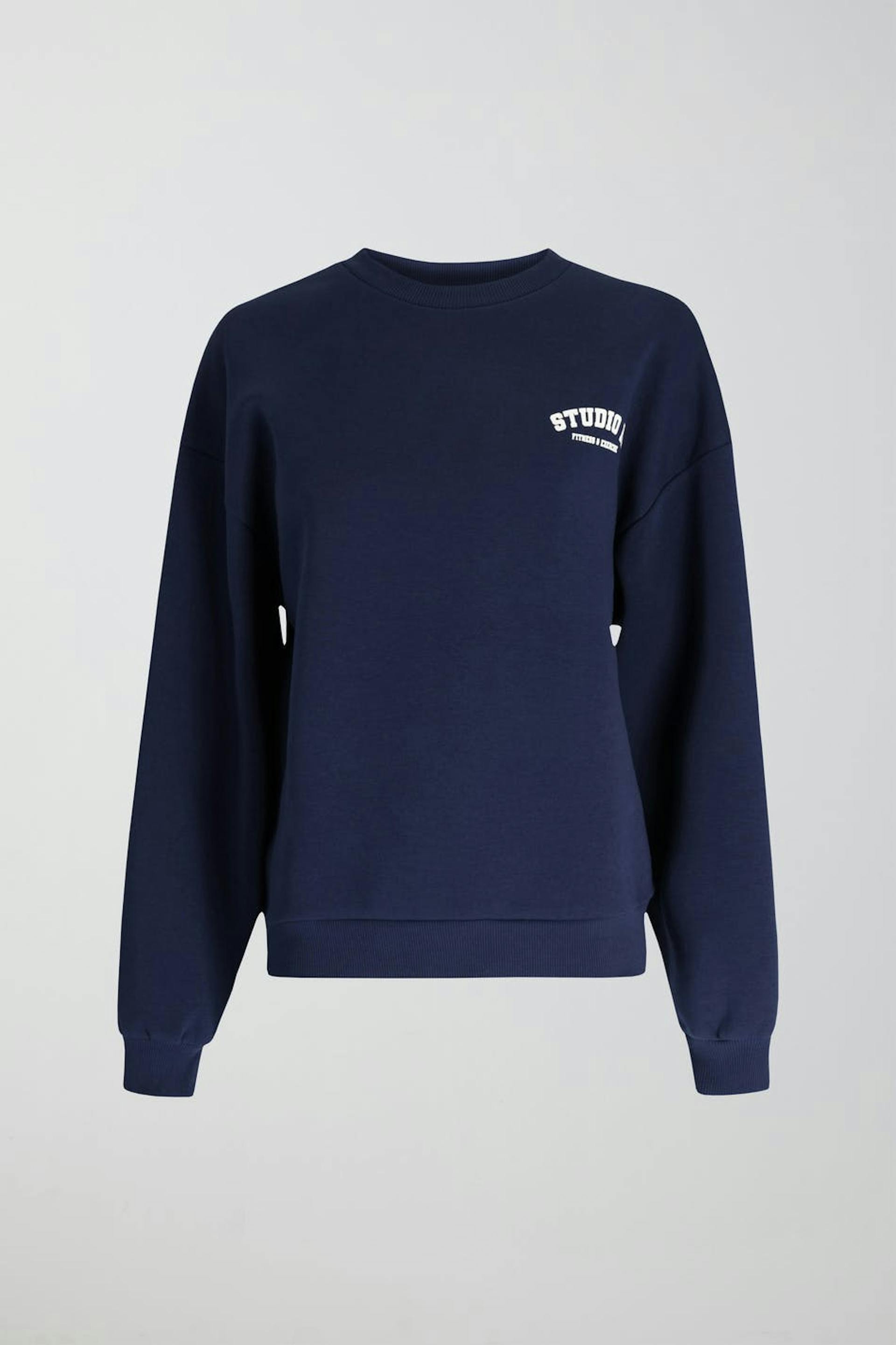 Collegepusero oversized-mallilla. Collegepusero on sininen ja siinä on oversized-malli. Siinä on pyöristetty kaula-aukko ja joustinneule hihansuissa ja helmassa.