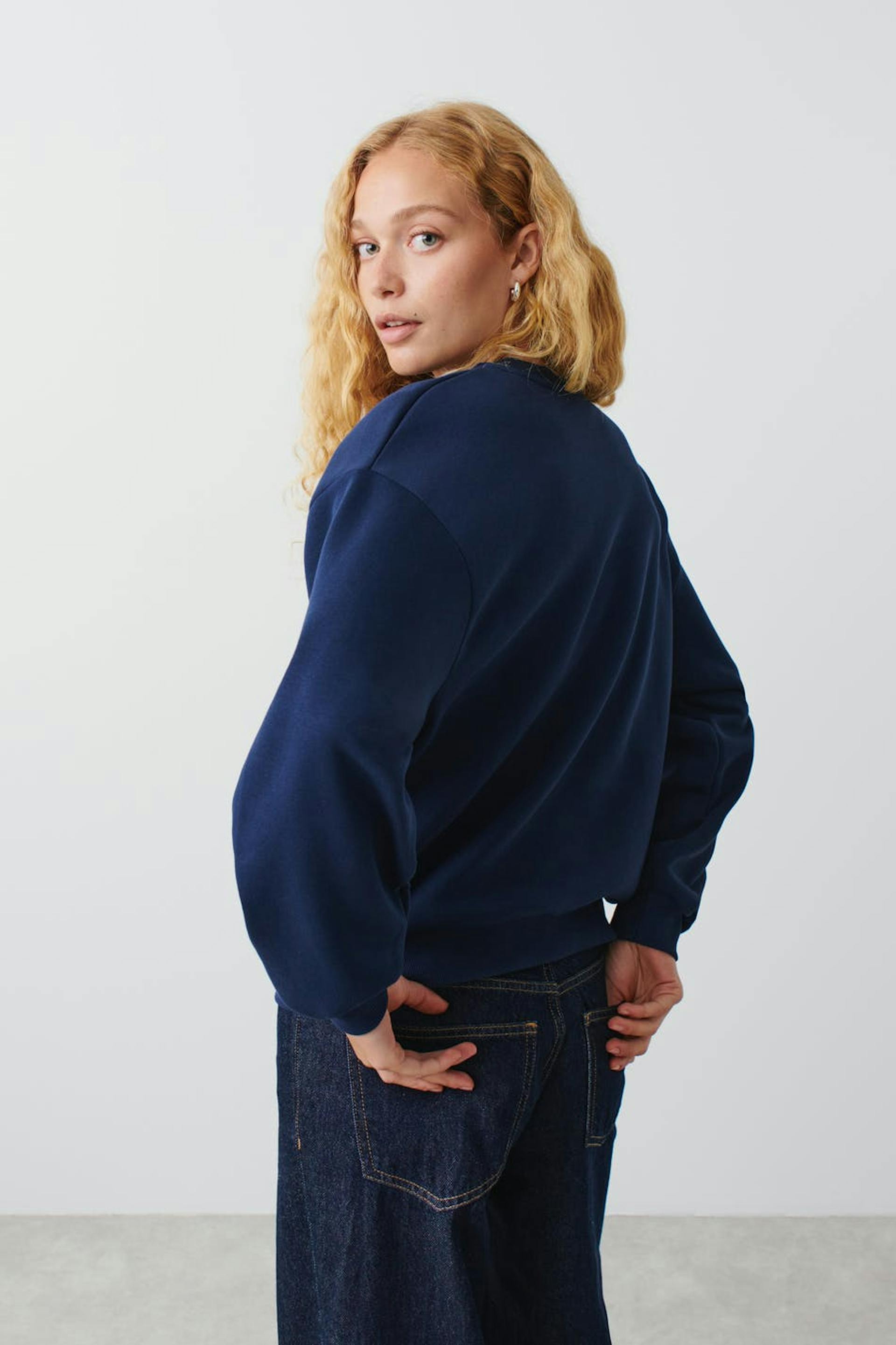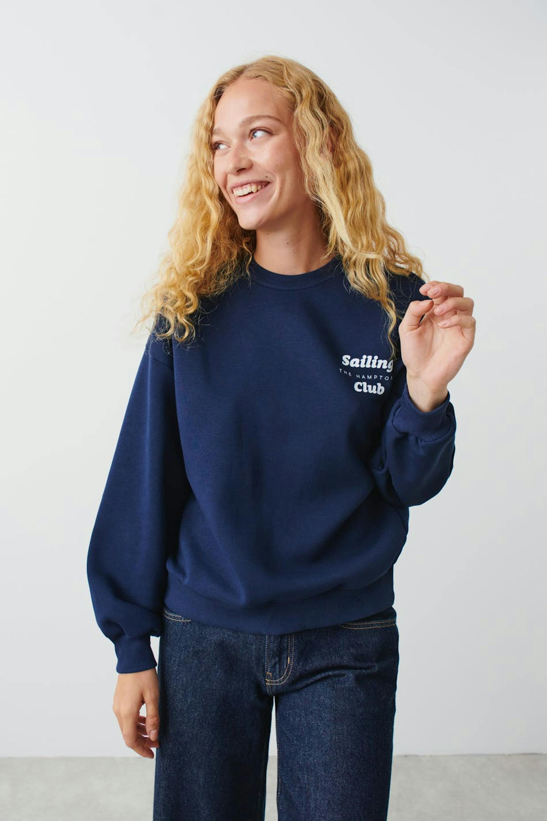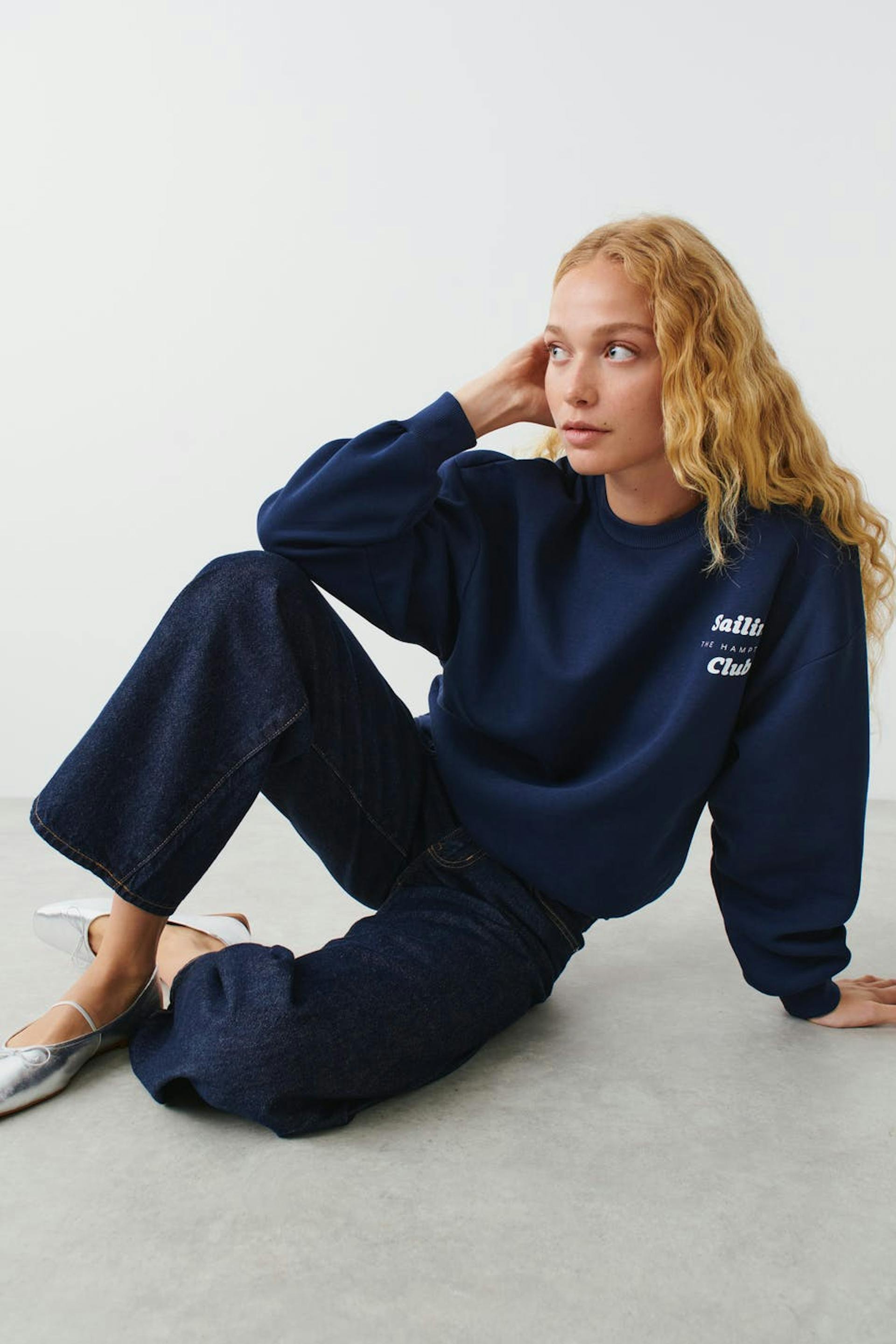 Collegepaita oversized-mallilla. Collegepaita on sininen ja siinä on printti rinnassa. Siinä on pyöristetty kaula-aukko ja joustinneule hihansuissa ja helmassa.