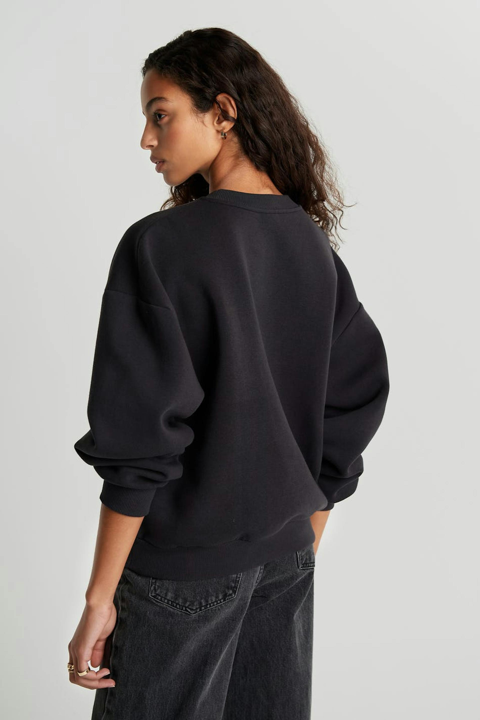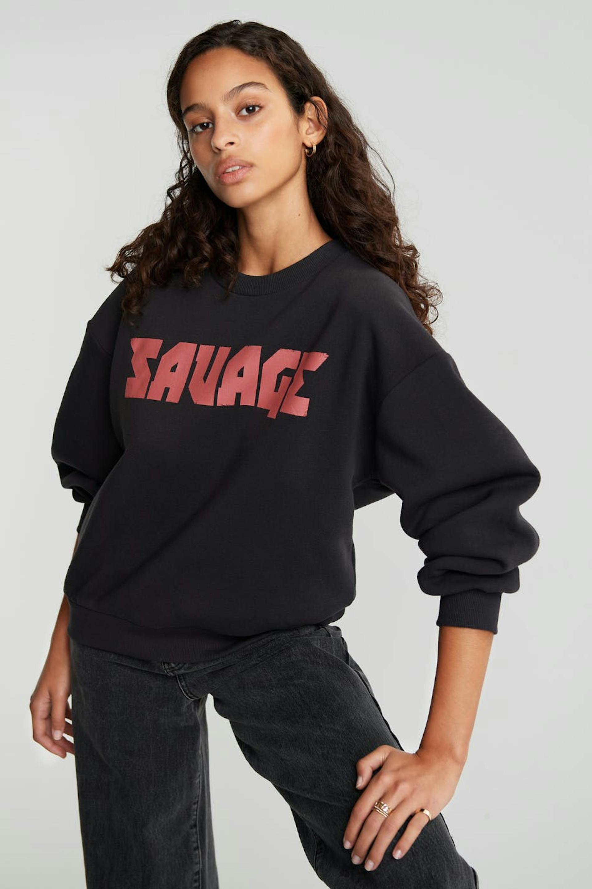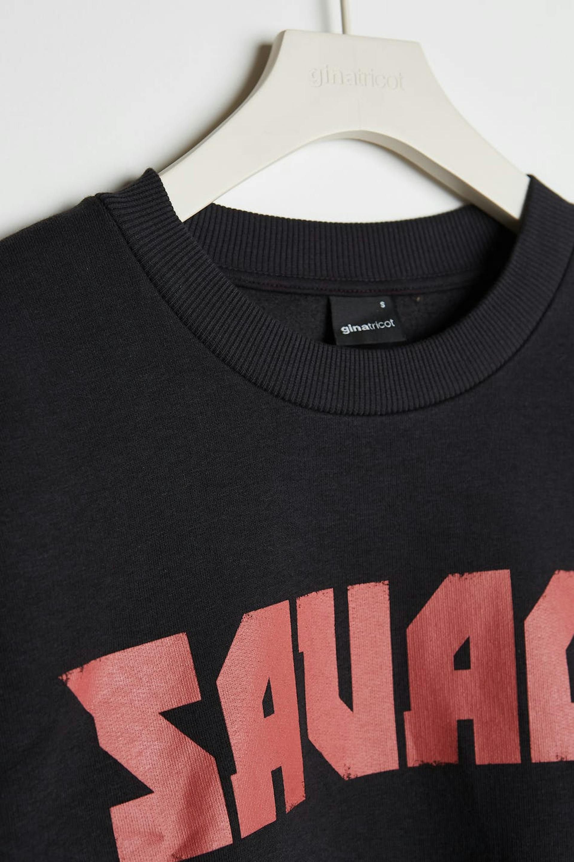 Huppari printillä punaisella tekstillä. Huppari on musta ja siinä on ylisuuri istuvuus.