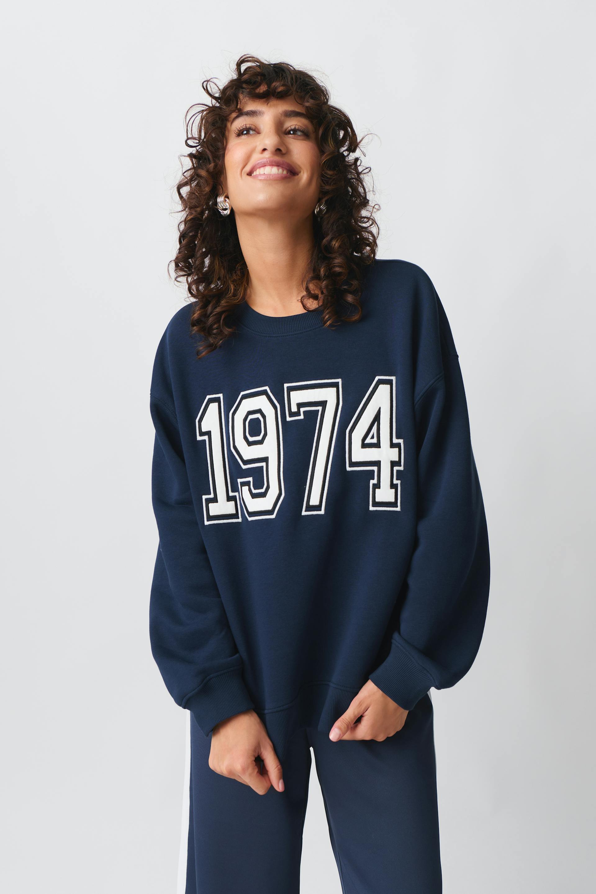 Collegepaita kirjaillulla tekstillä edessä. Collegepaita on laivastonsininen ja siinä on oversized-malli. Siinä on veneen muotoinen kaula-aukko, pehmeäksi harjattu sisäpuoli ja joustinneule hihansuissa ja pohjassa.