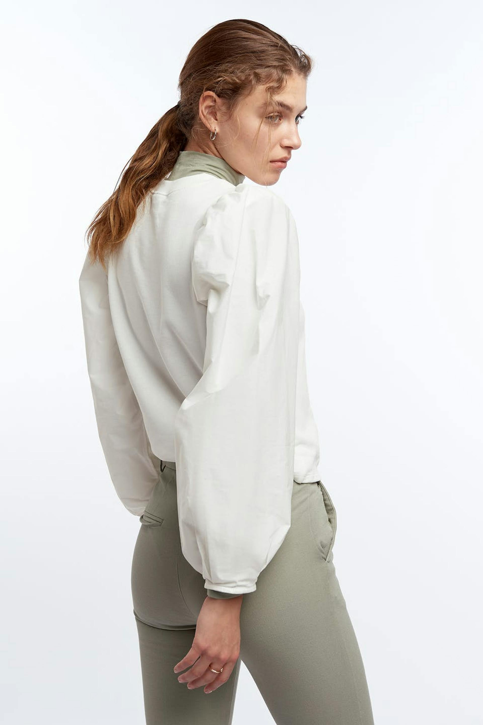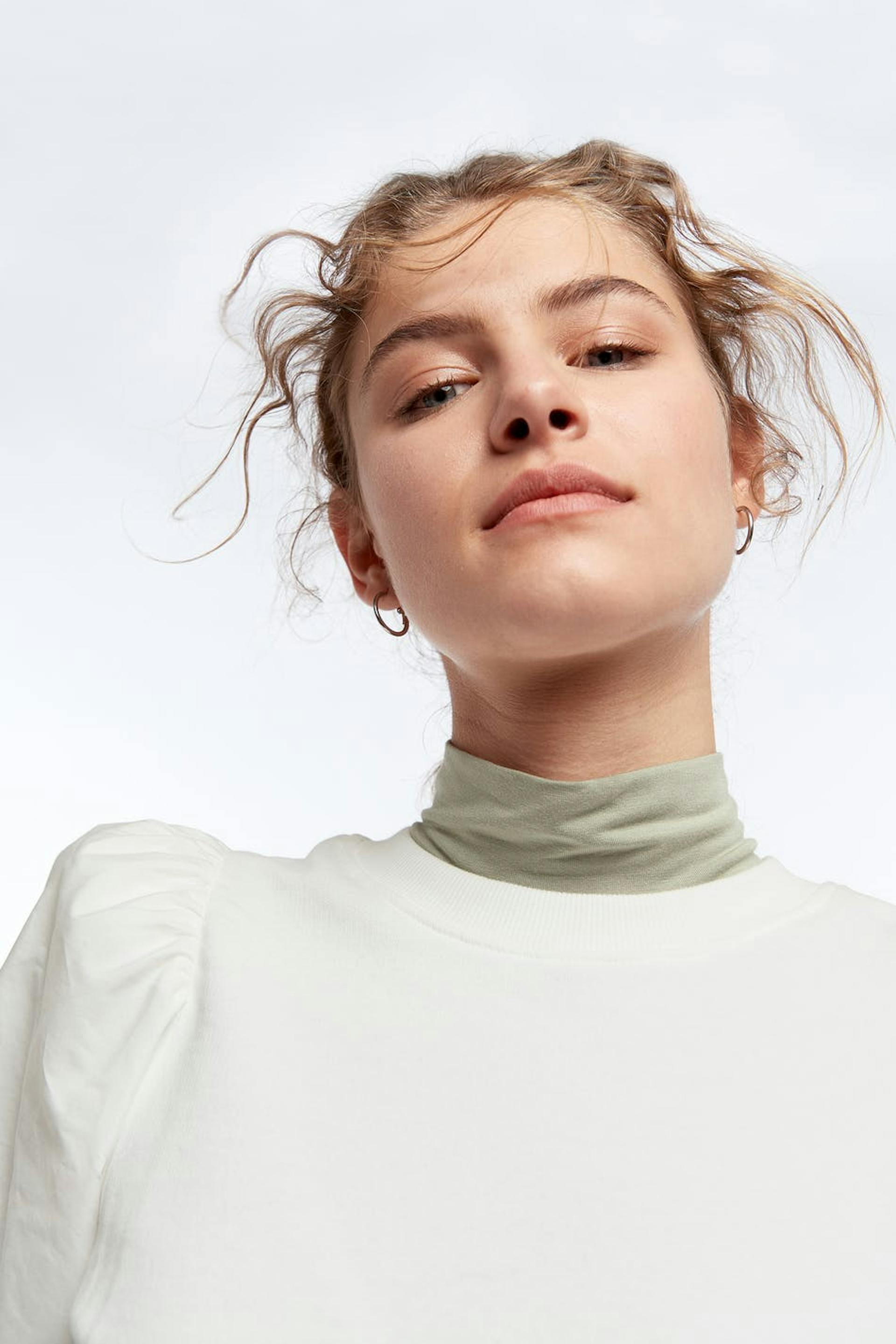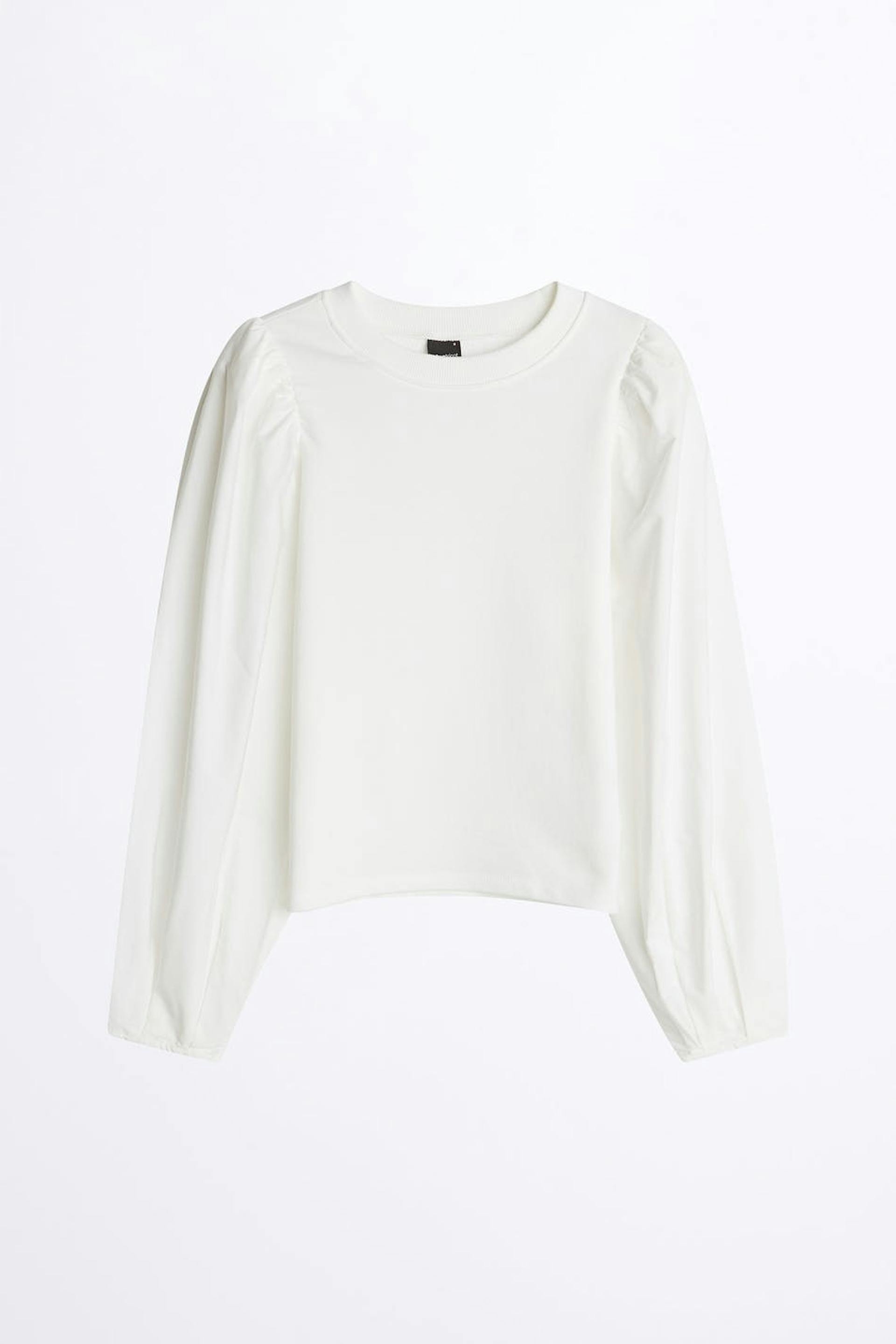 Pehmeä villapaita puff sleeve-paidalla. Villapaita on valkoinen ja siinä on laatikkomallinen istuvuus. Siinä on ribbed mansetti kaula-aukossa.