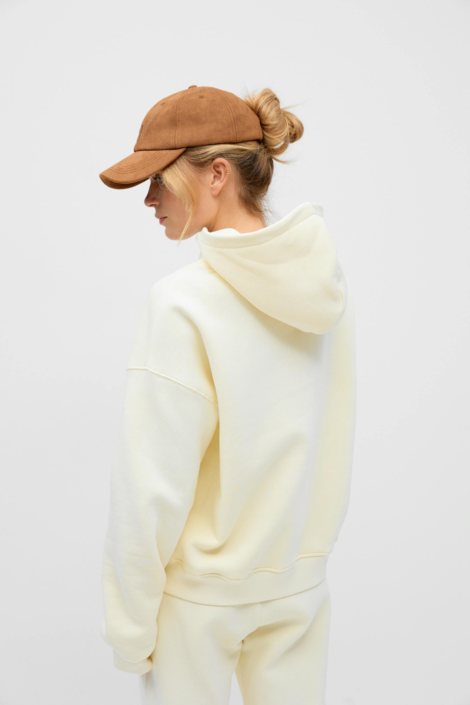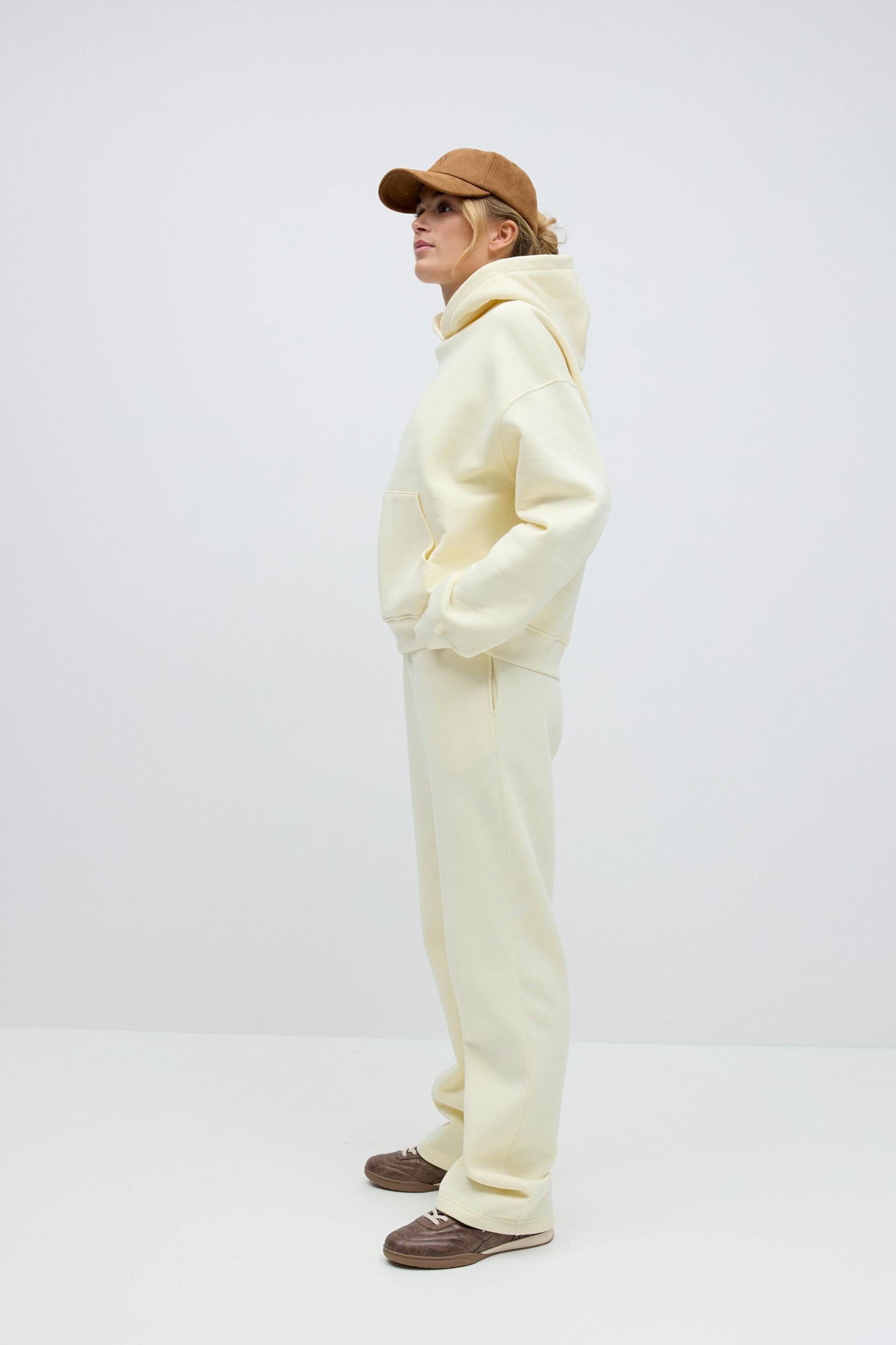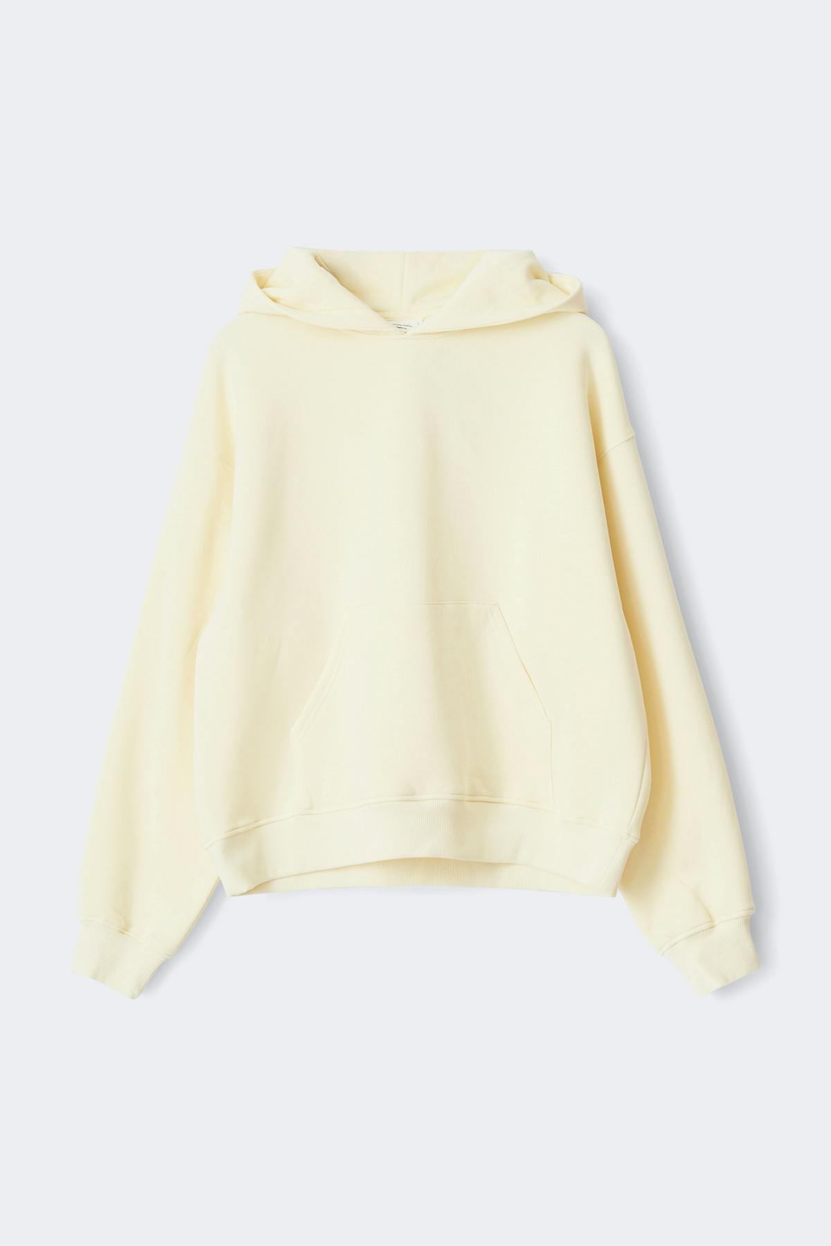 Oversize huppari kengurutaskulla edessä. Huppari on keltainen ja siinä on vuorattu huppu kiristysnyörillä. Siinä on pudotetut olkapäät ja joustinneule hihansuissa ja pohjassa.