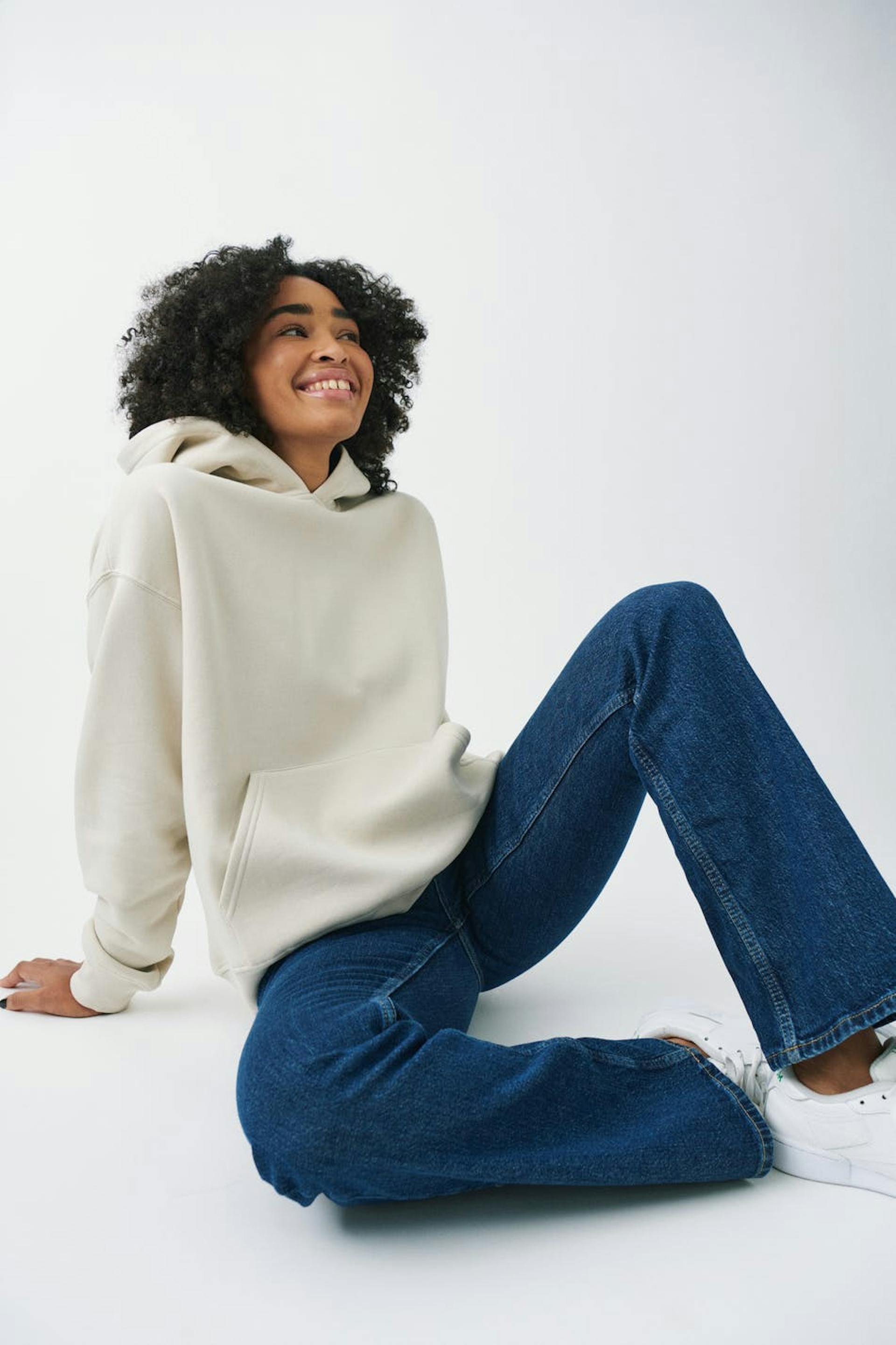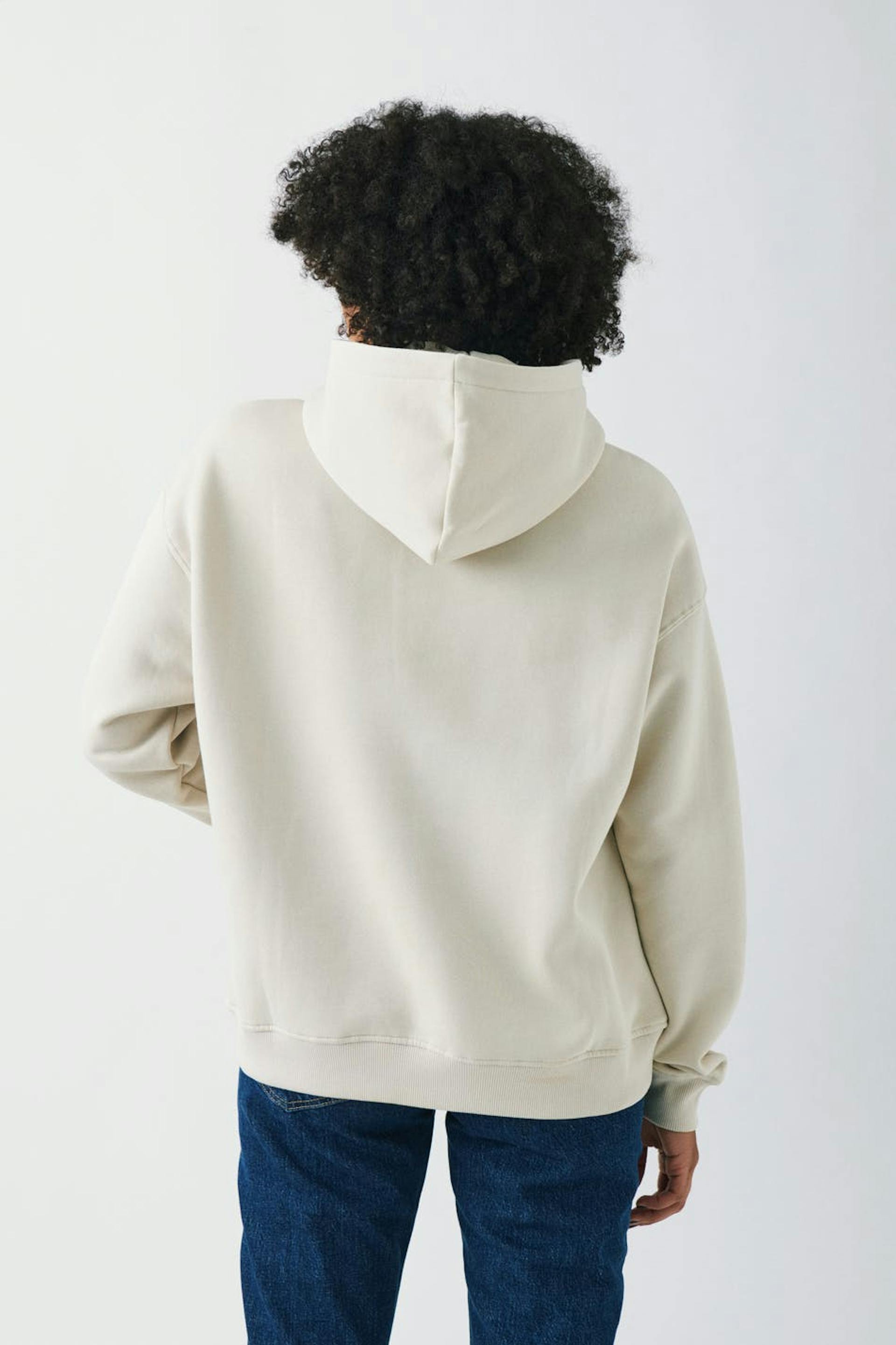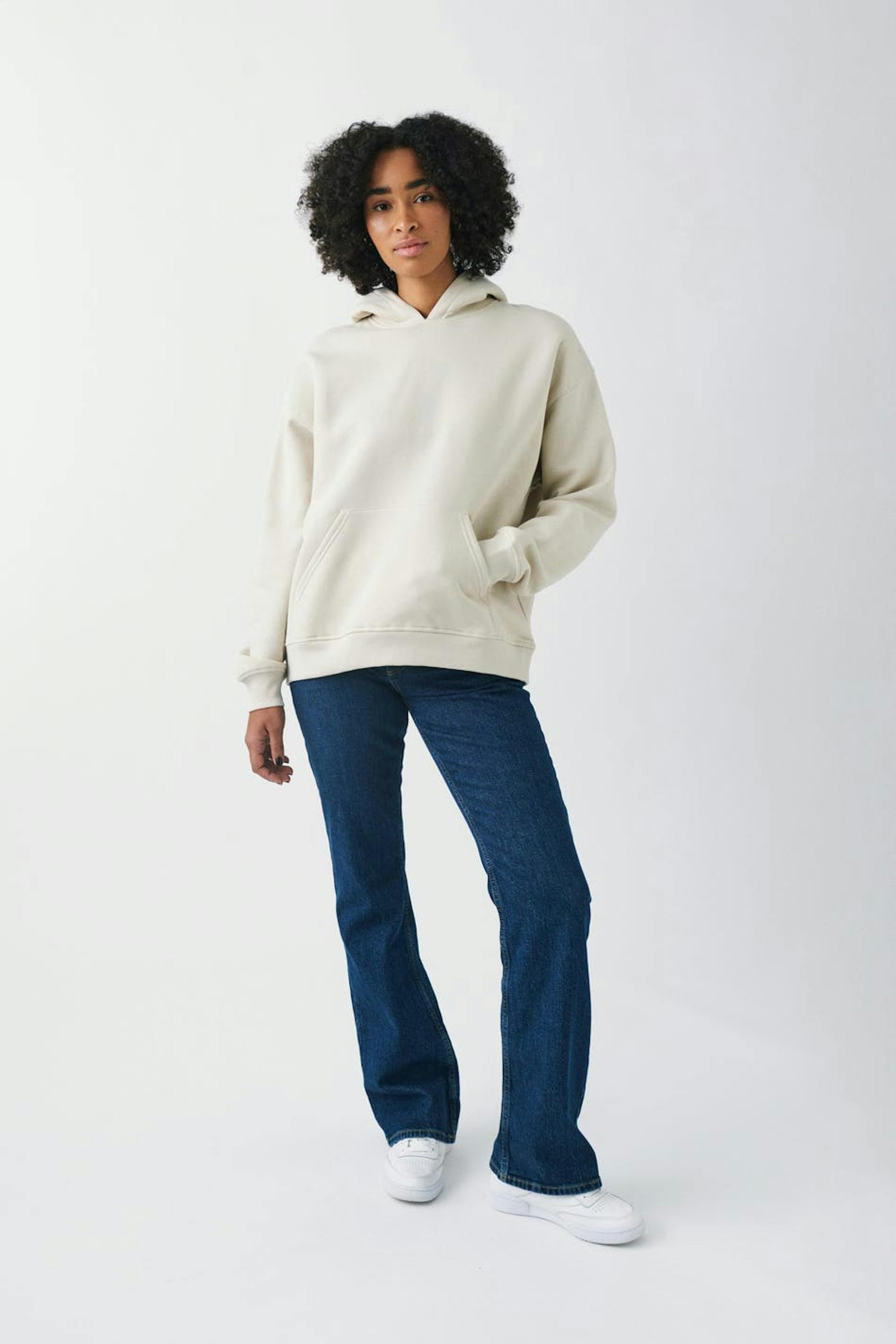 Rento huppari, jossa on pehmeä harjattu sisäpinta. Lasketut olkapäät, vuorattu huppu kiristysnyörillä ja etutasku. Värissä beige. Easy to wear everyday.