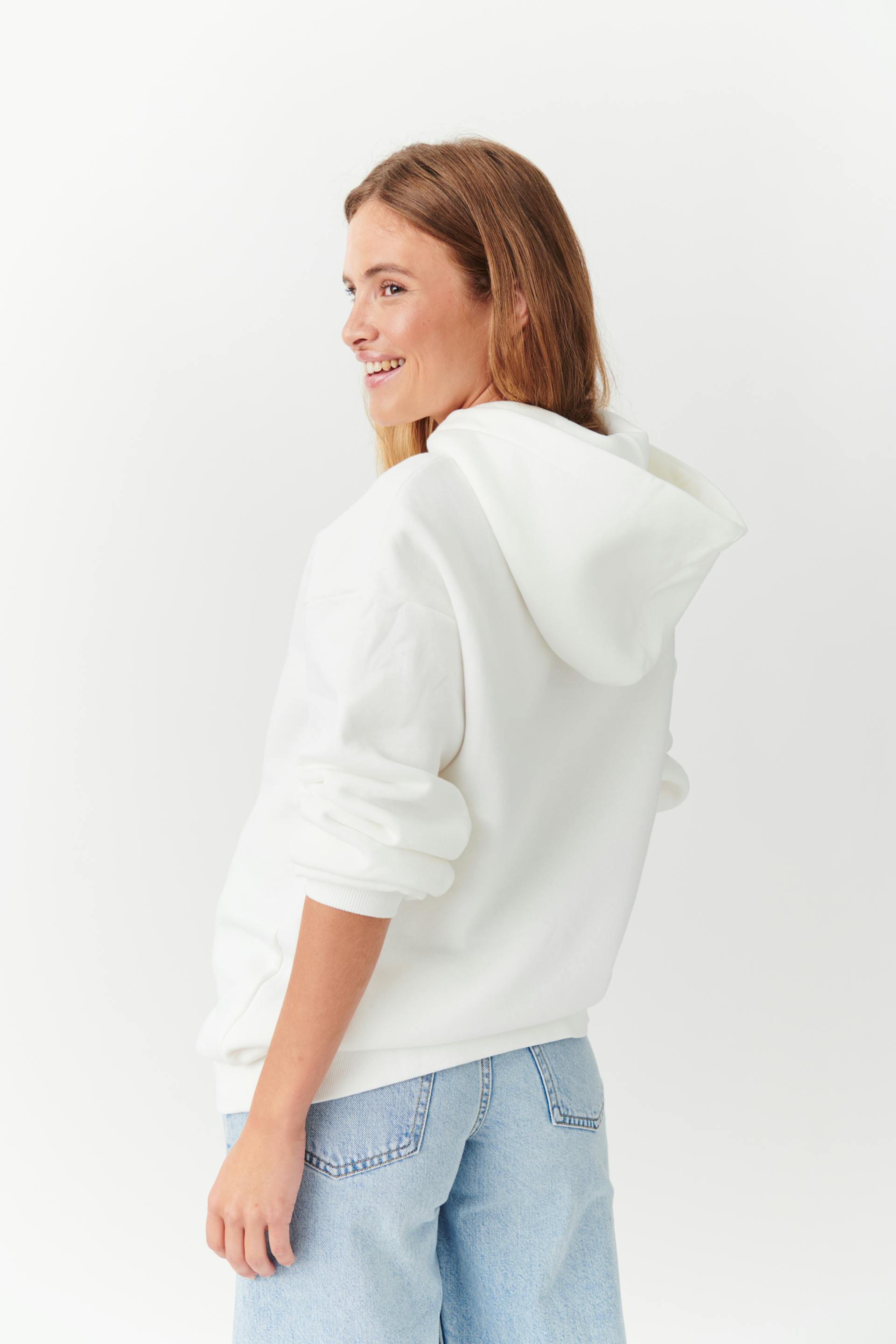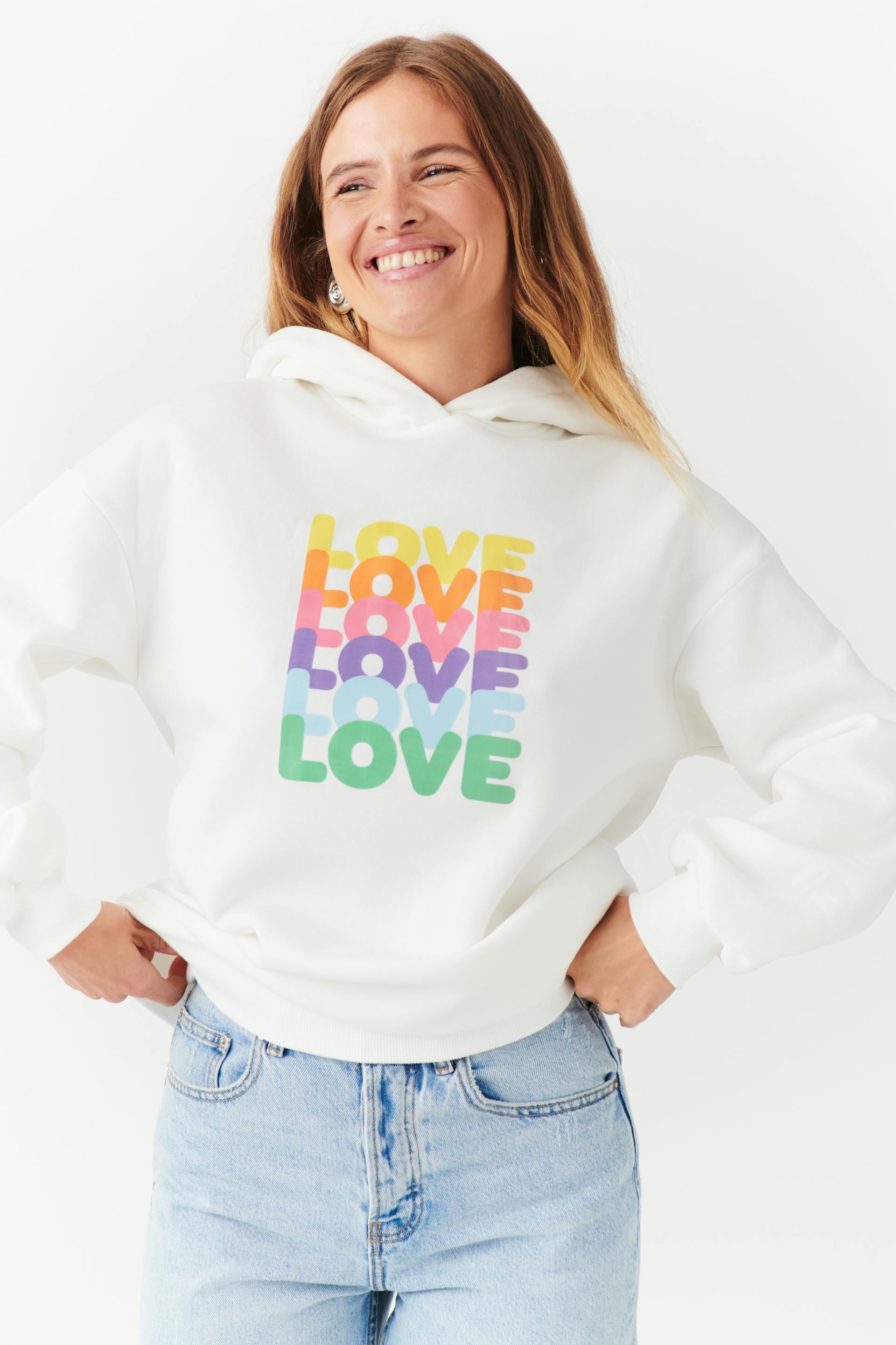 Oversize huppari printillä edessä. Huppari on valkoinen ja siinä on pudotetut olkapäät. Siinä on huppu takana ja joustinneule hihansuissa ja pohjassa. Ostamalla tämän tuotteen olet mukana ja autat Regnbågsfonden-säätiön työtä, jotta sateenkaarihenkilöt kaikkialla maailmassa saisivat kattavat ihmisoikeudet ja demokraattiset oikeudet. Myyntituotoista 20 % menee lyhentämättömänä Regnbågsfonden-säätiölle