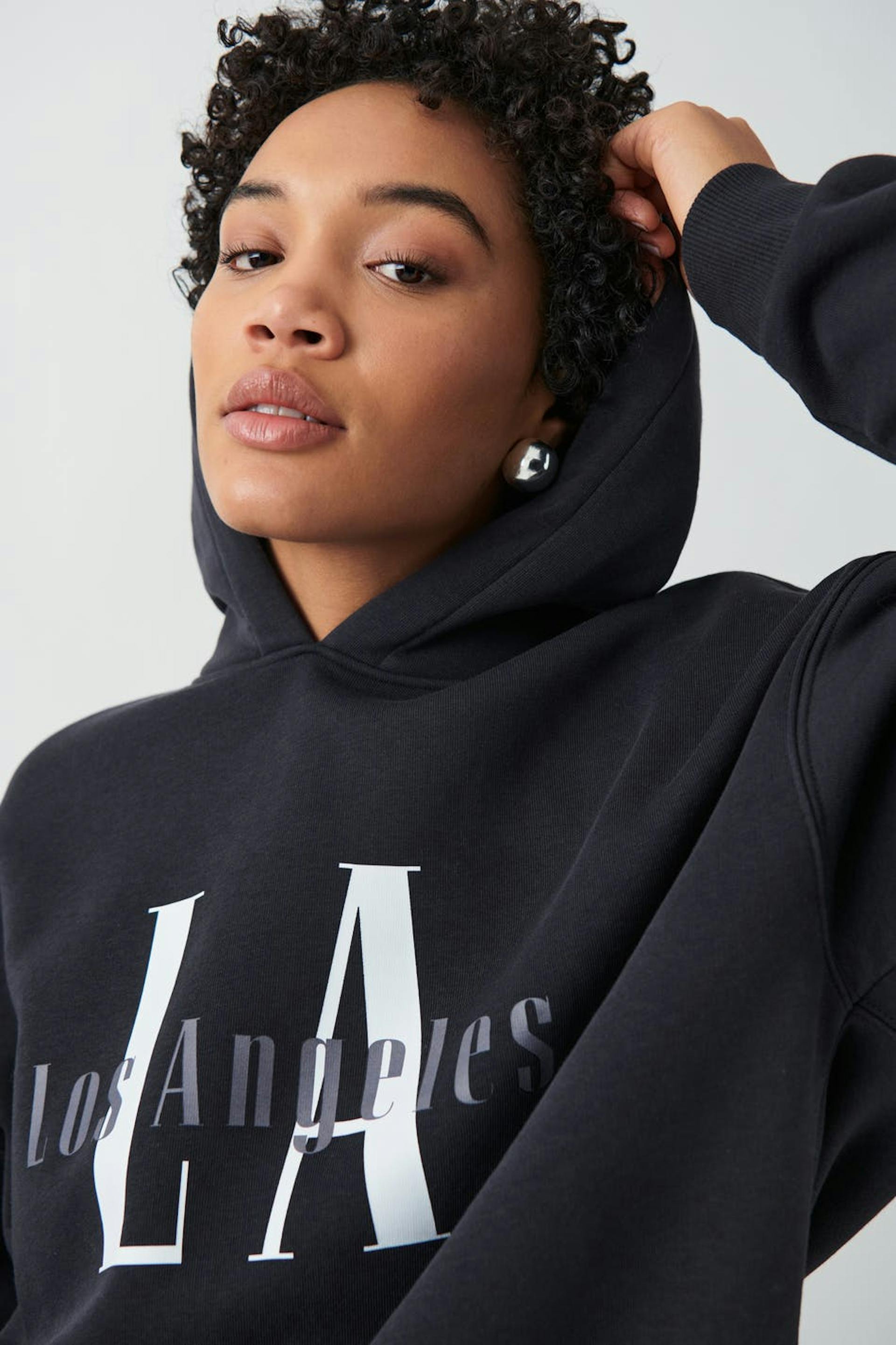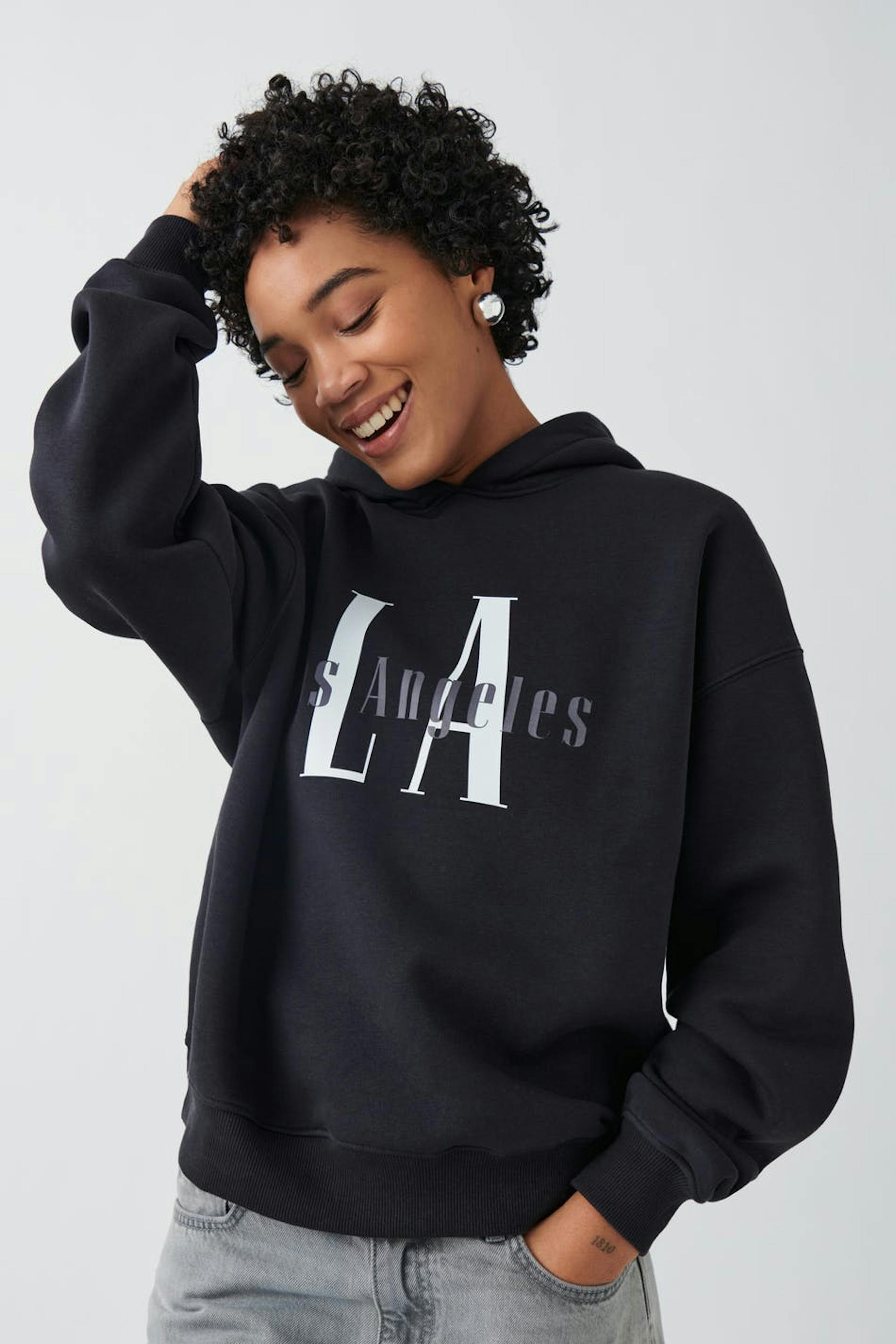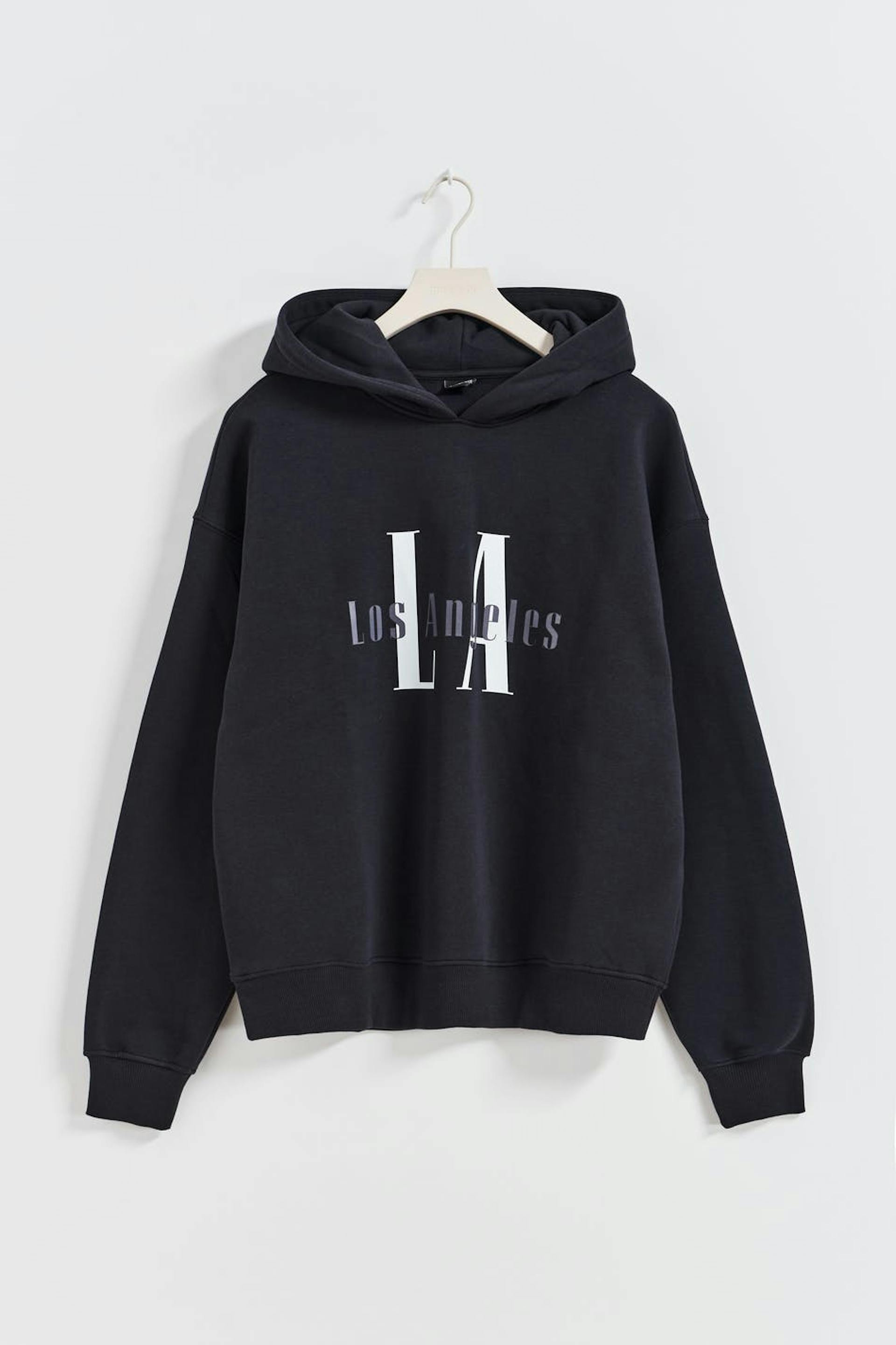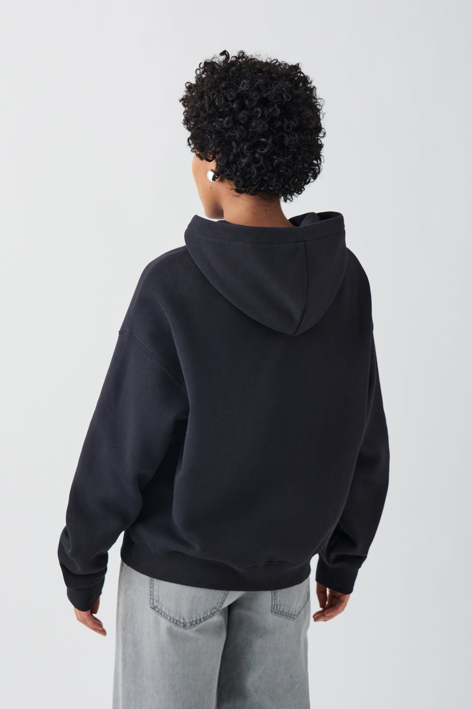 Oversize huppari tekstiprintillä edessä. Huppari on musta ja siinä on vuorattu huppu. Siinä on pudotettu olkapää ja ribbiresori hihansuissa ja pohjassa.