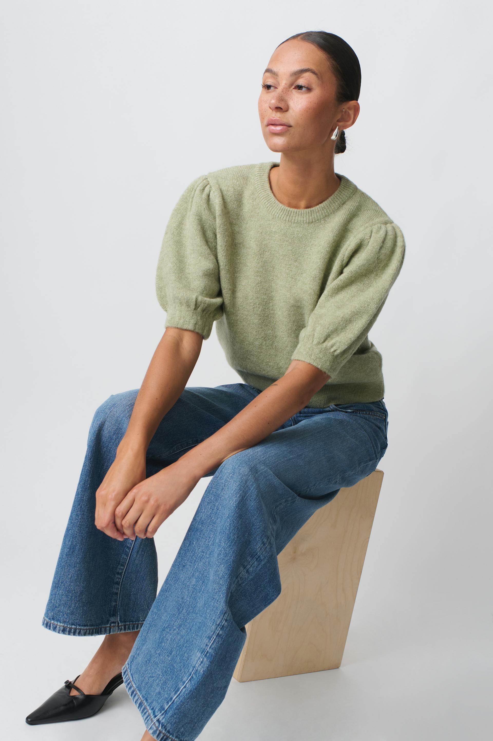 Neulottu toppi lyhyillä puhvihihoilla. Toppi on vihreä ja siinä on pyöreä pääntie. Siinä on poimut olkapäiden ympärillä ja ribbineulos hihansuissa ja pohjassa.