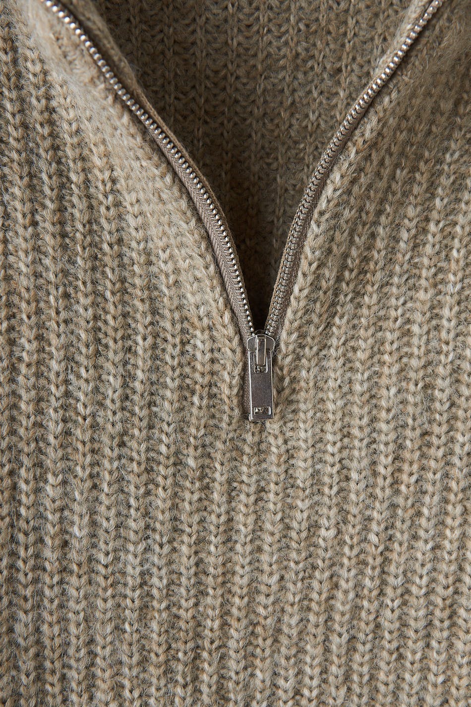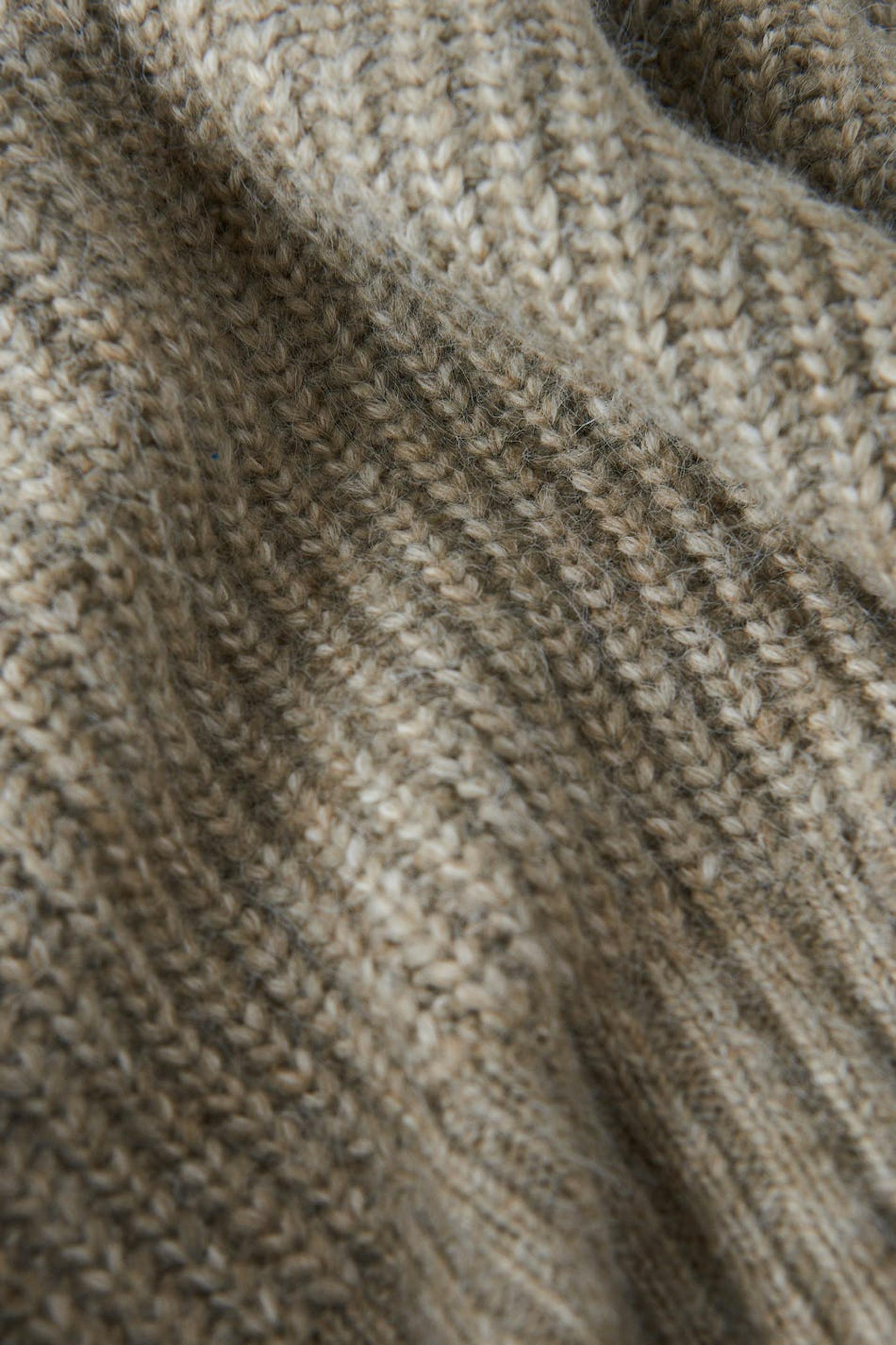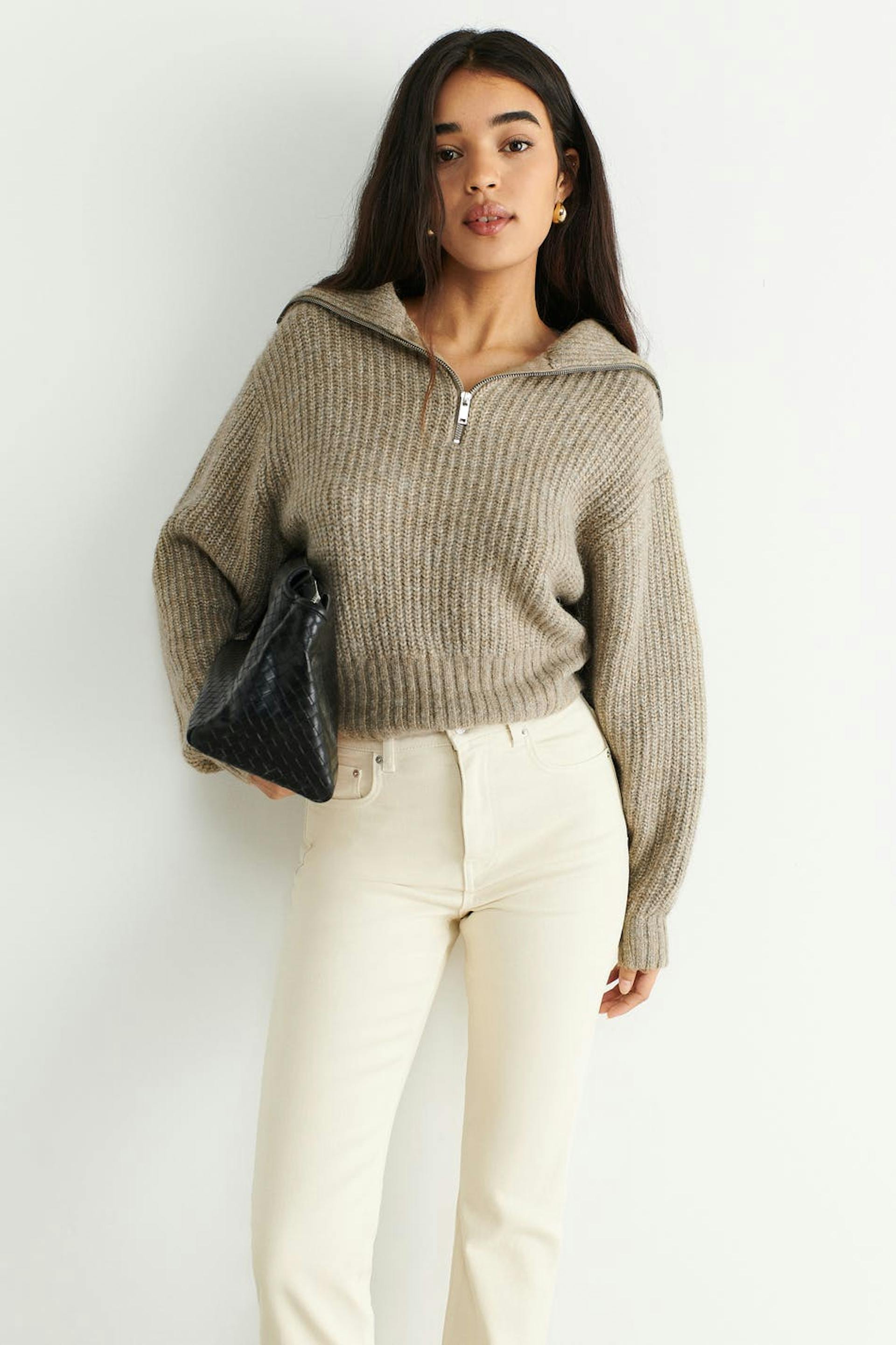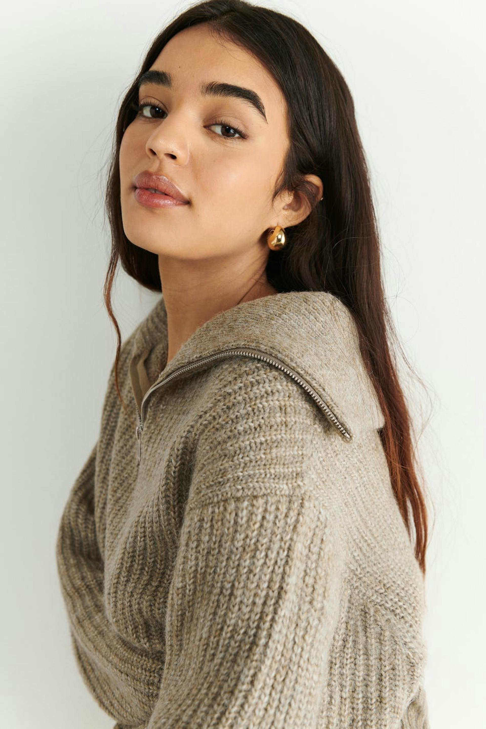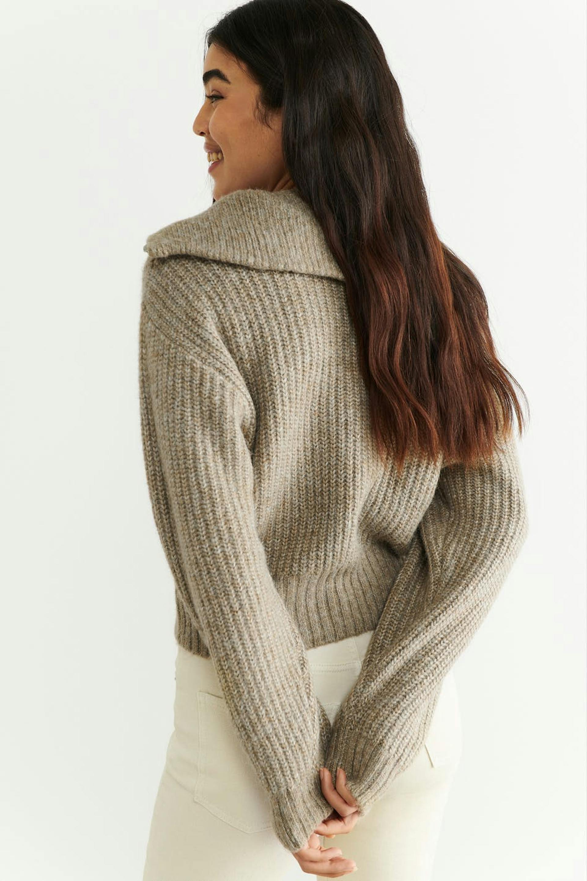 Neulottu neuletakki laatikkomaisella mallilla. Neuletakki on beige ja siinä on napituslista edessä. Siinä on v-pääntie, cropattu pituus ja resorihelma.
