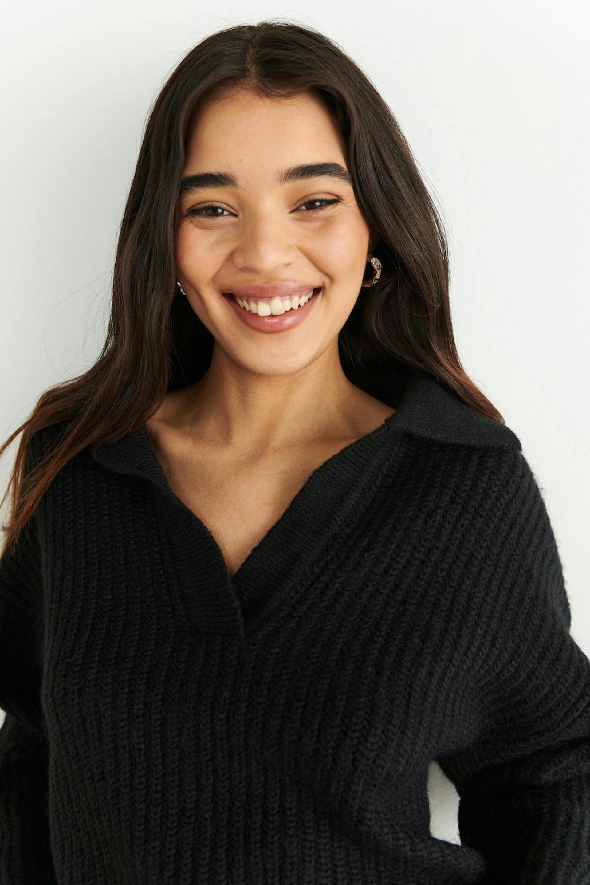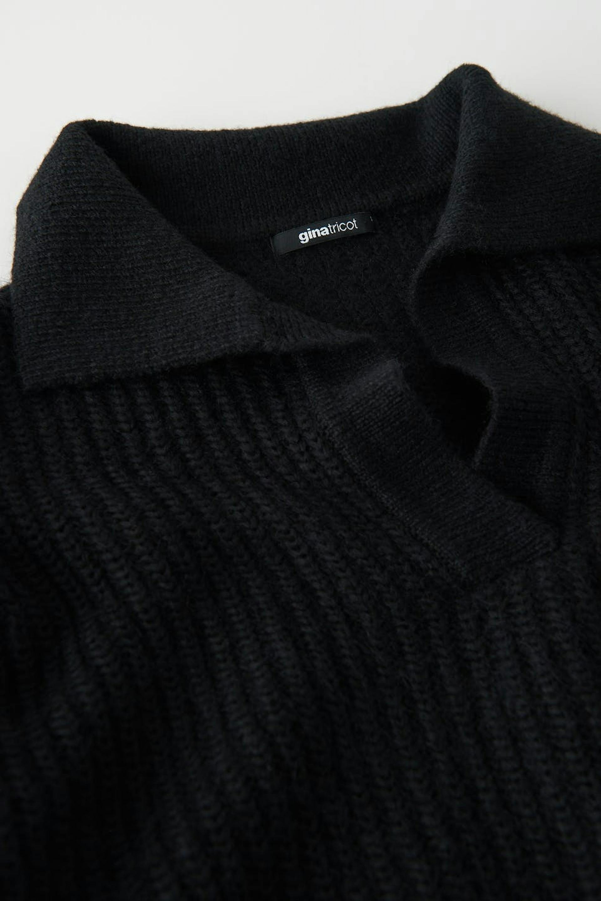 Neulepusero laatikkomaisella mallilla. Pusero on musta ja siinä on kaulus.