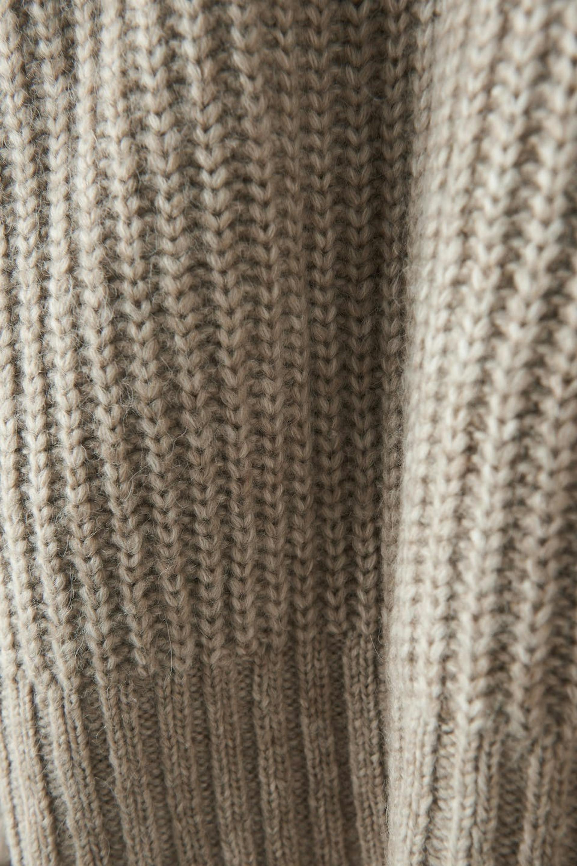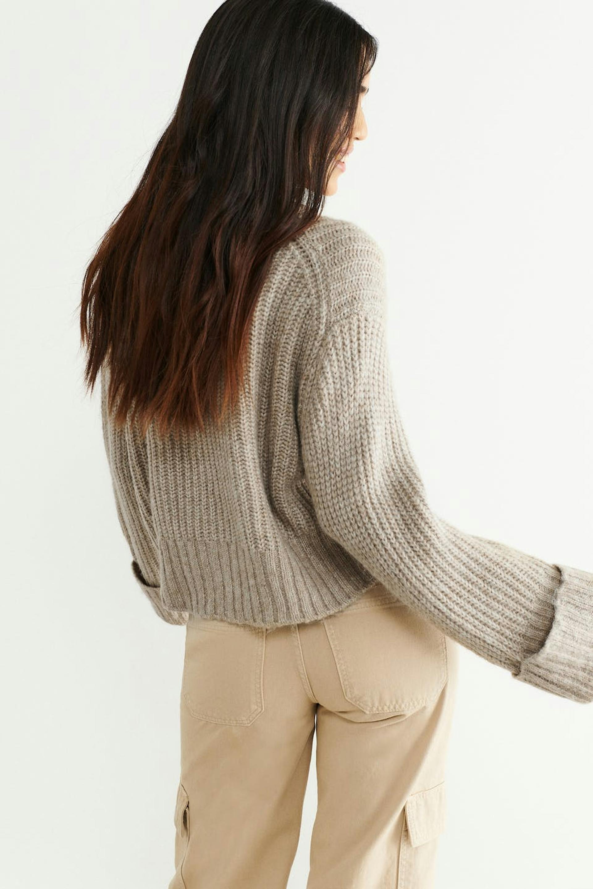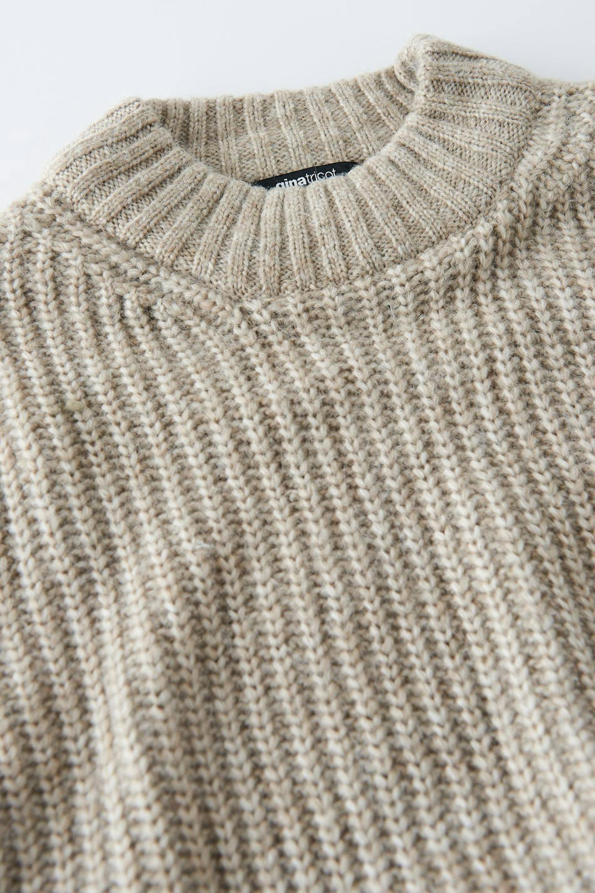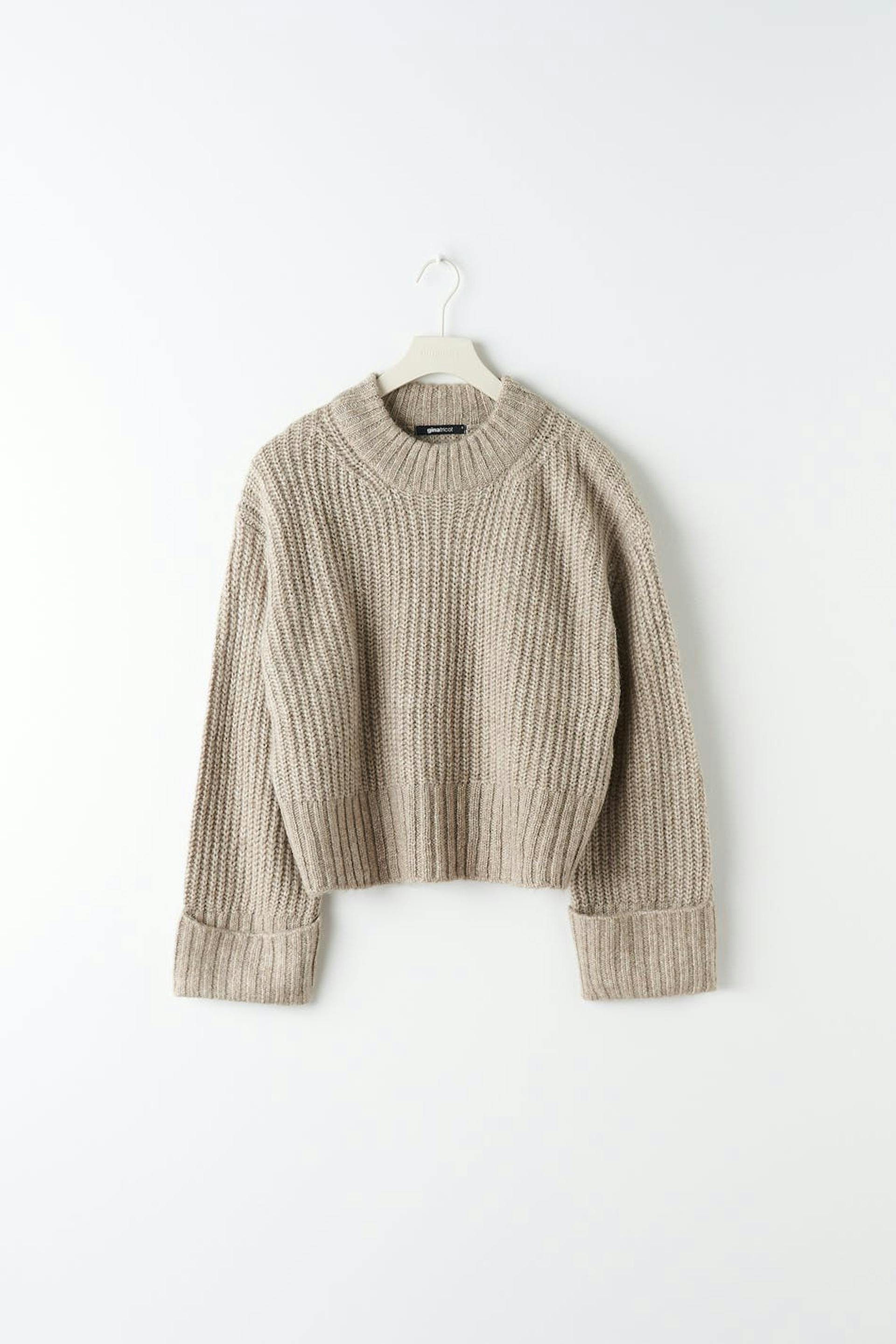 Neulottu paita laatikkomallisella istuvuudella. Paita on liila, pitkähihainen ja cropattu. Siinä on pyöristetty kaula-aukko ja taitetut hihansuut ribatuilla hihansuilla.