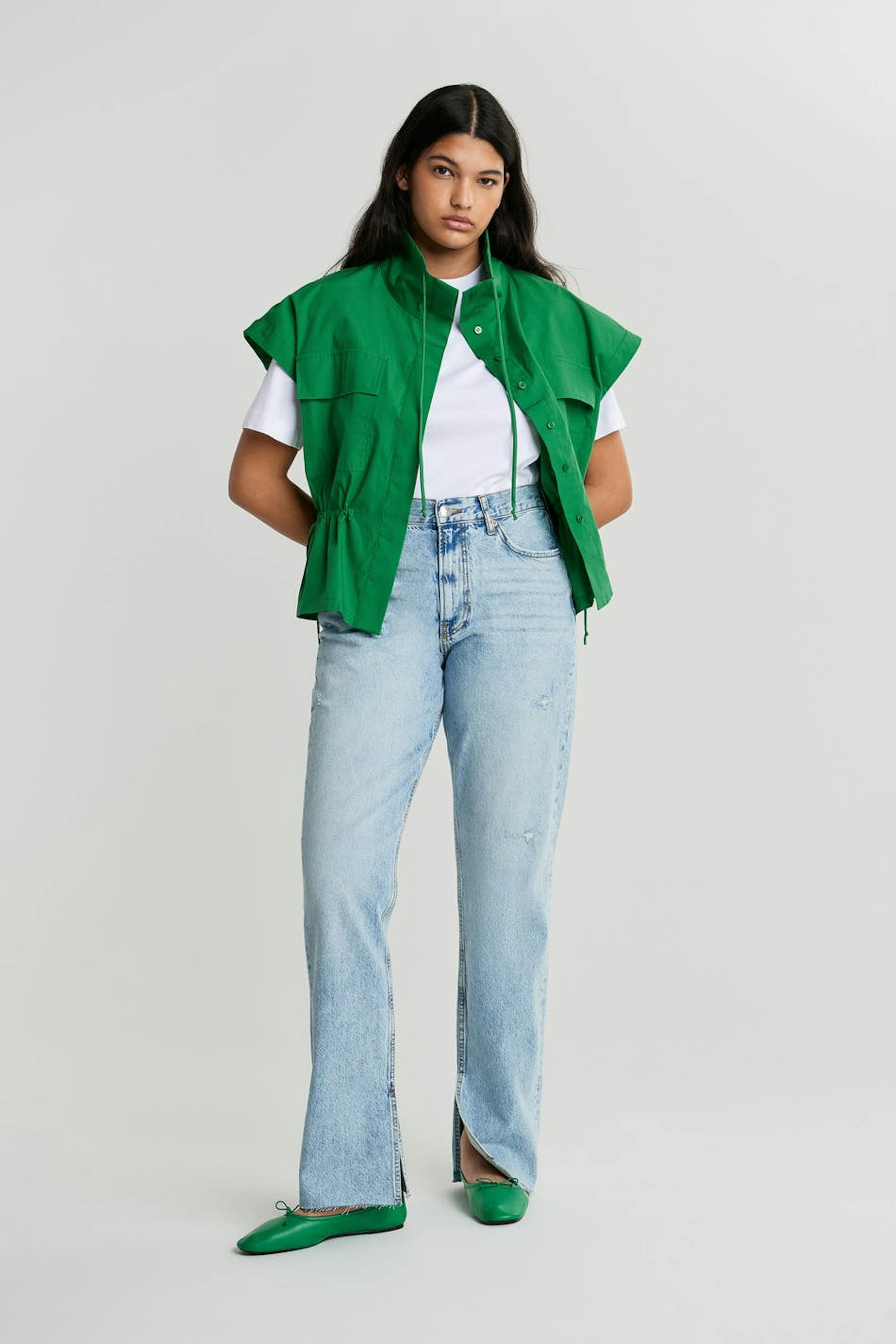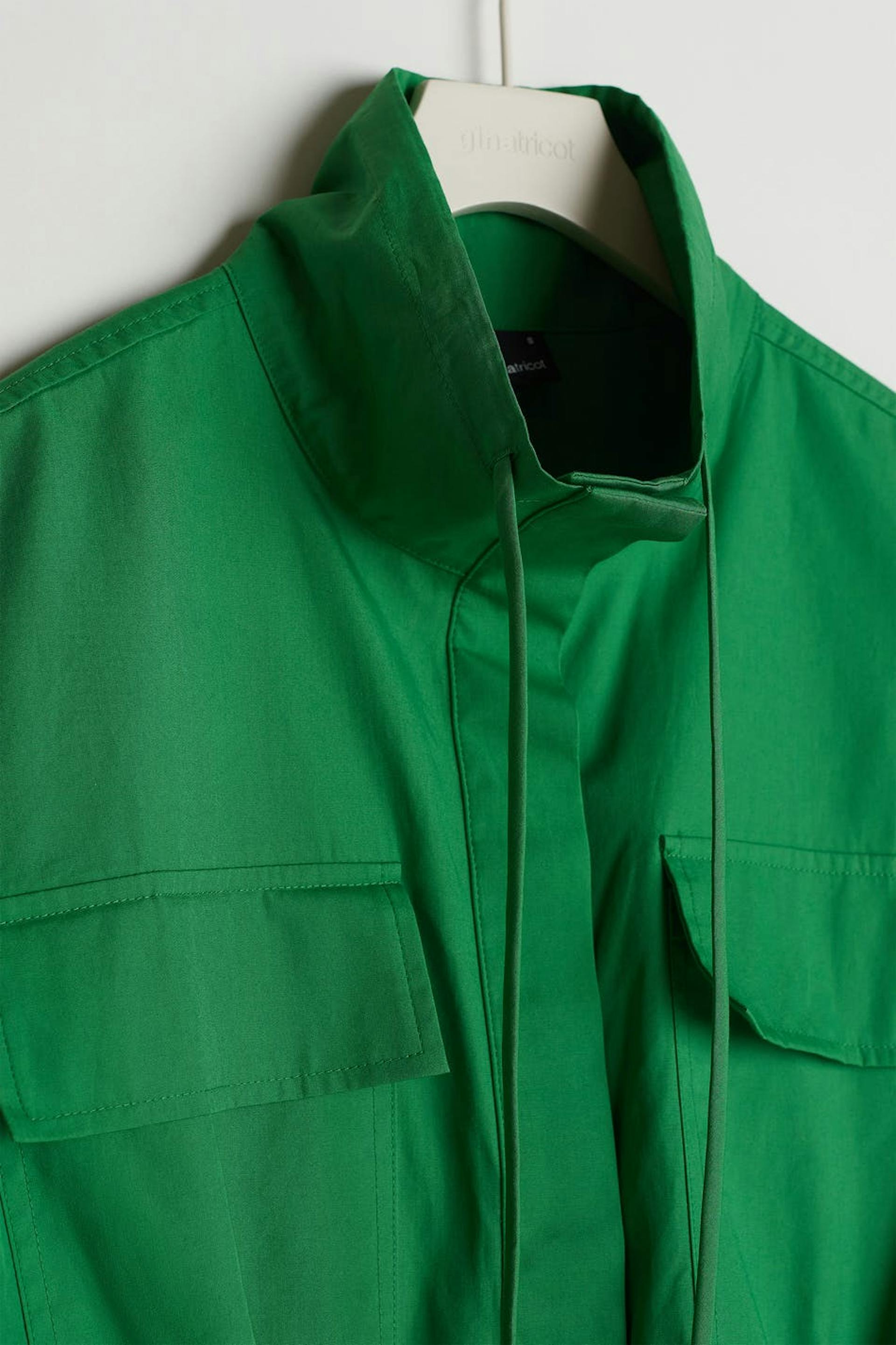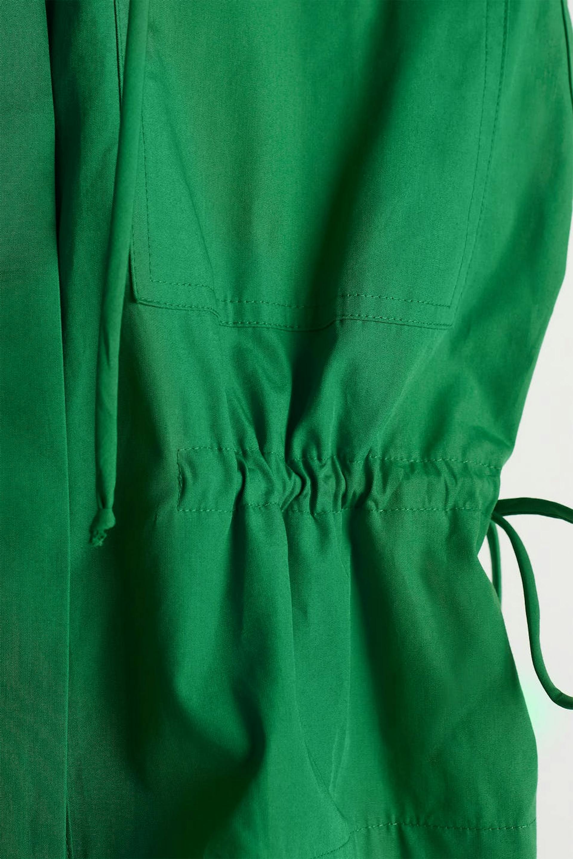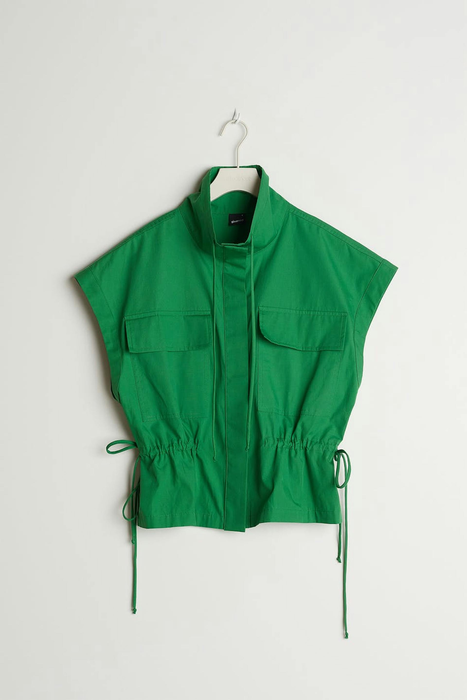 Hihaton liivi kiristysnyörillä solmittavalla vyöllä vyötäröllä. Liivi on vihreä ja siinä on korkea kaula. Siinä on nappikiinnitys etusivun alaosassa, rintataskut, korostetut olkapäät ja rapea laatu popliinista.