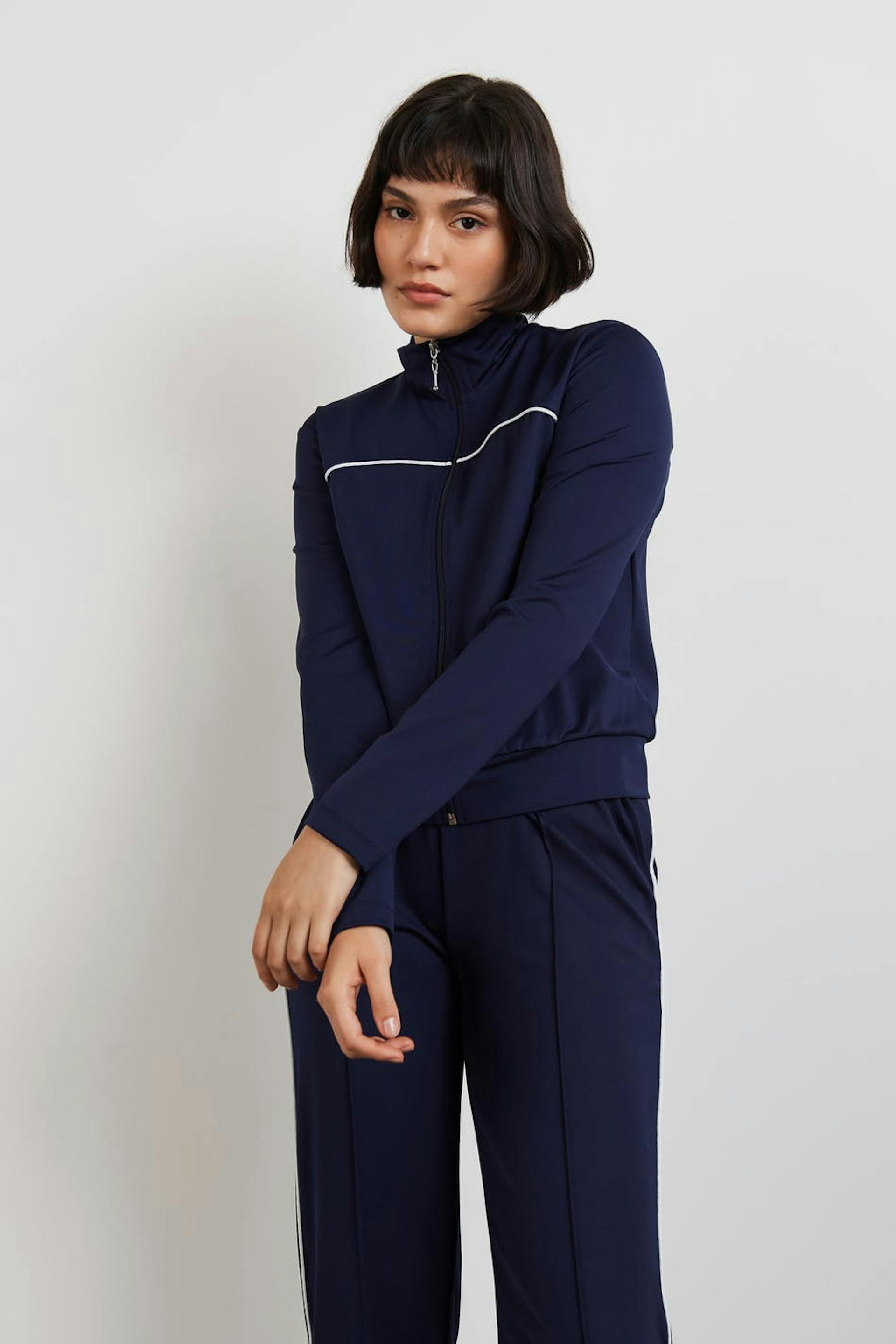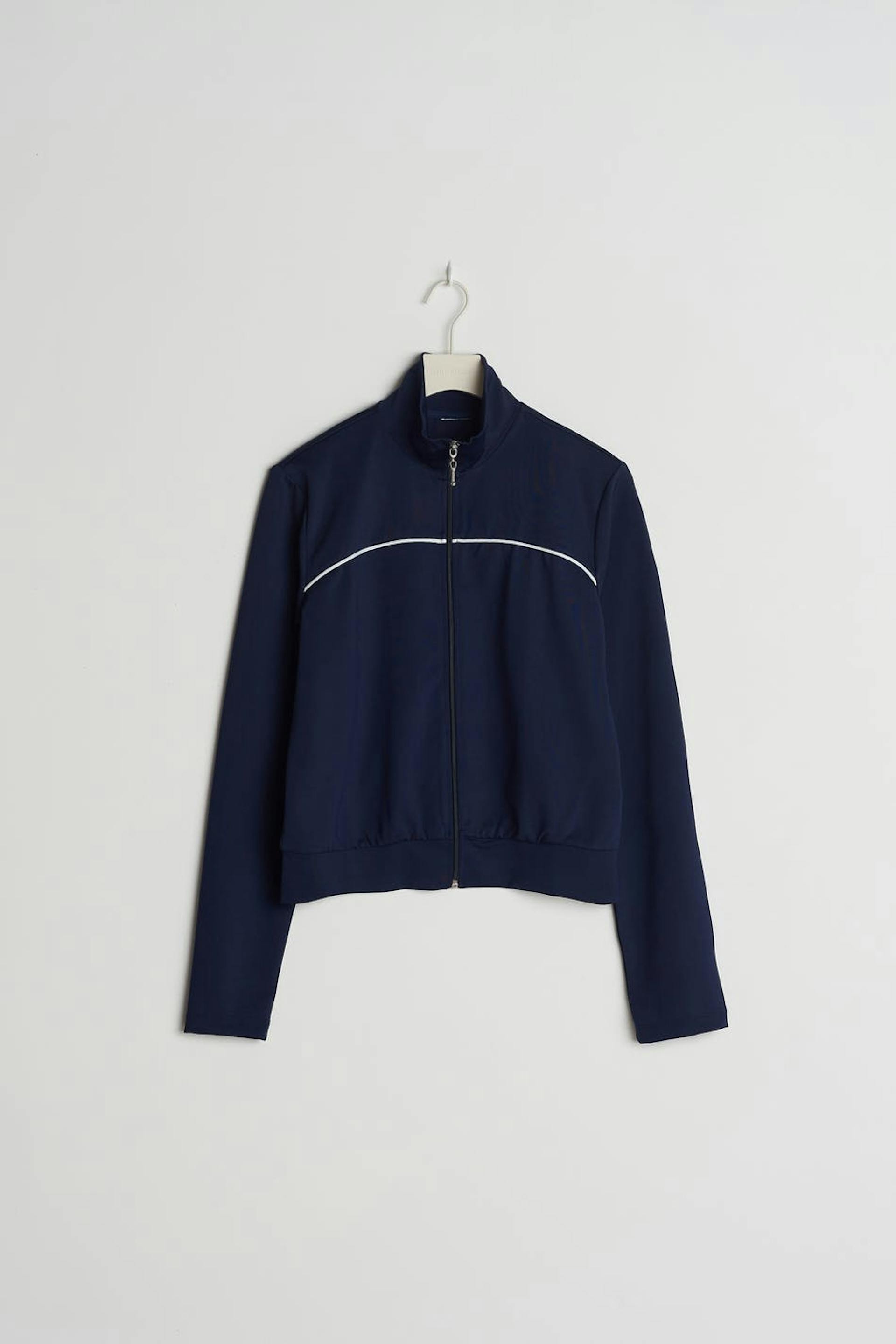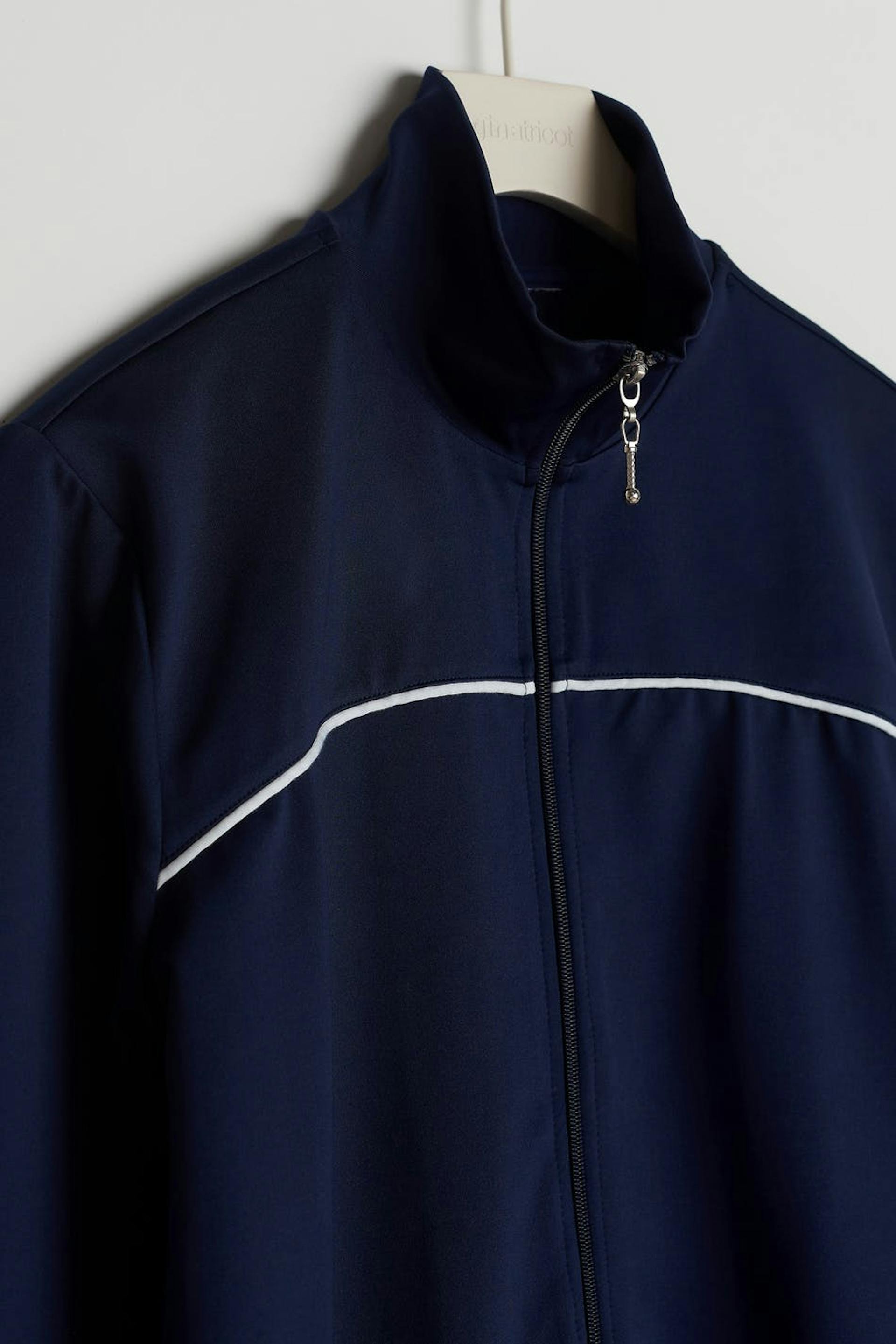 RS X Gina Tricot. Verryttelytakki normaalilla istuvuudella. Takki on sininen ja siinä on valkoinen raita ylhäällä. Siinä on korkea kaula ja vetoketju edessä.