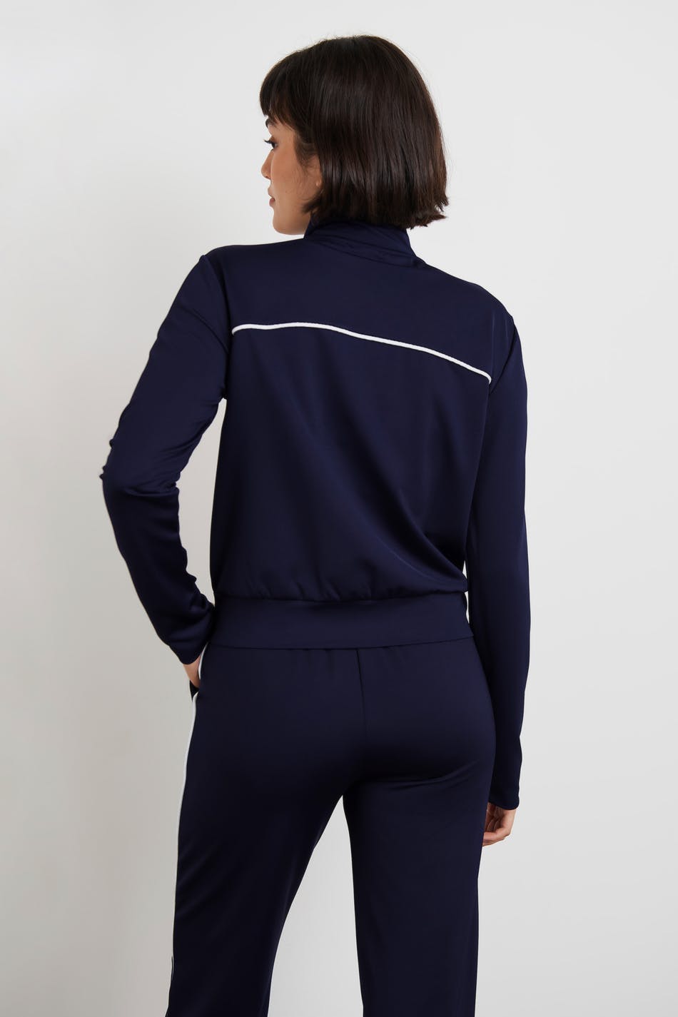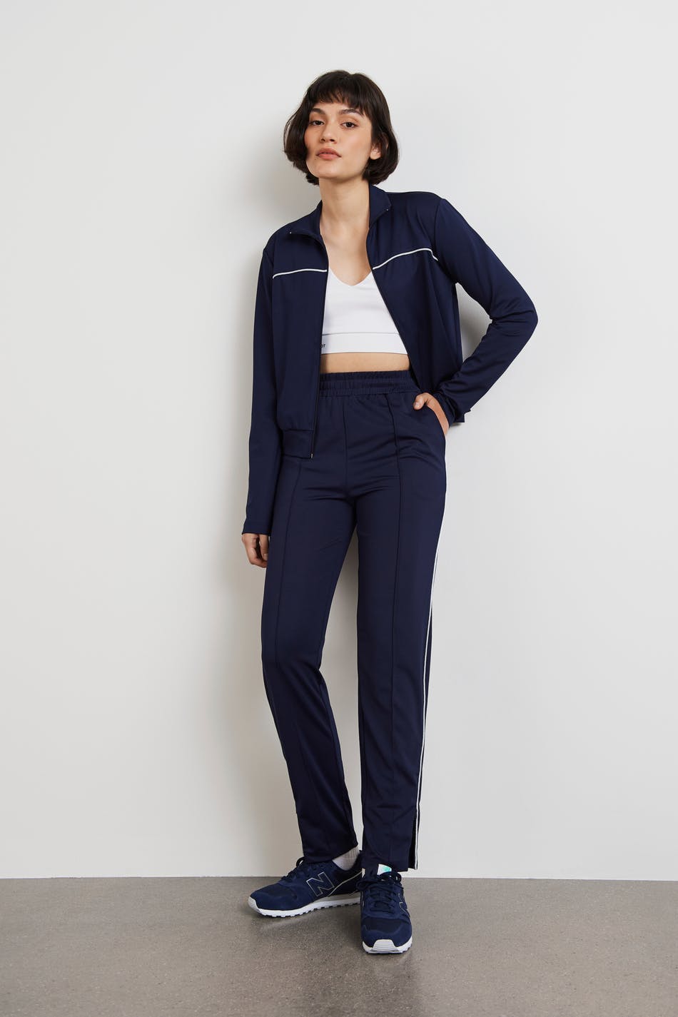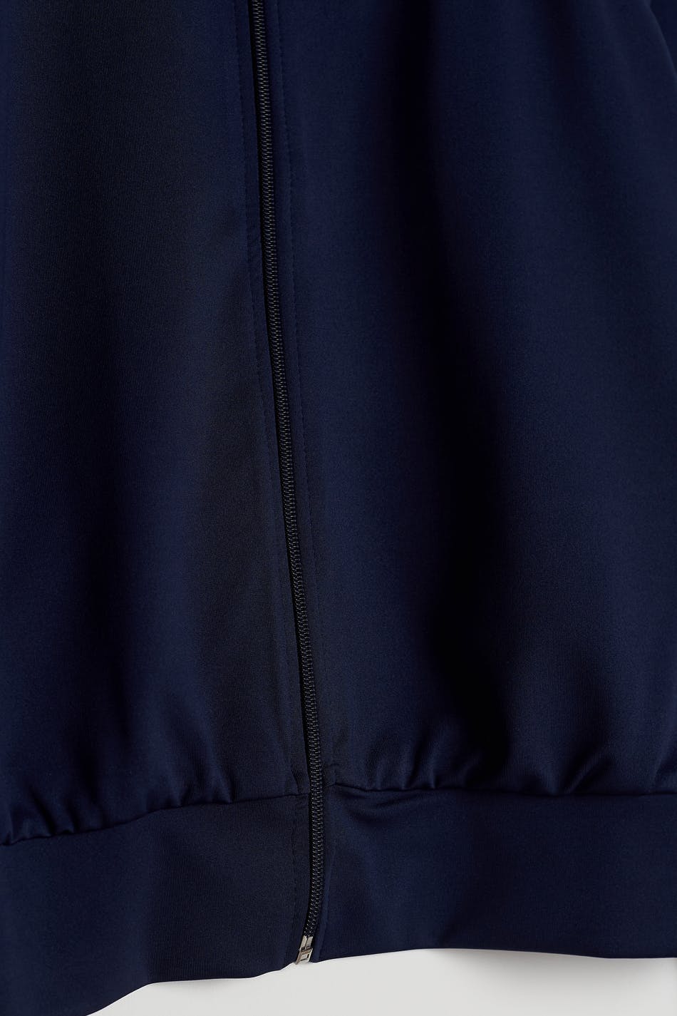 RS X Gina Tricot. Verryttelytakki normaalilla istuvuudella. Takki on sininen ja siinä on valkoinen raita ylhäällä. Siinä on korkea kaula ja vetoketju edessä.