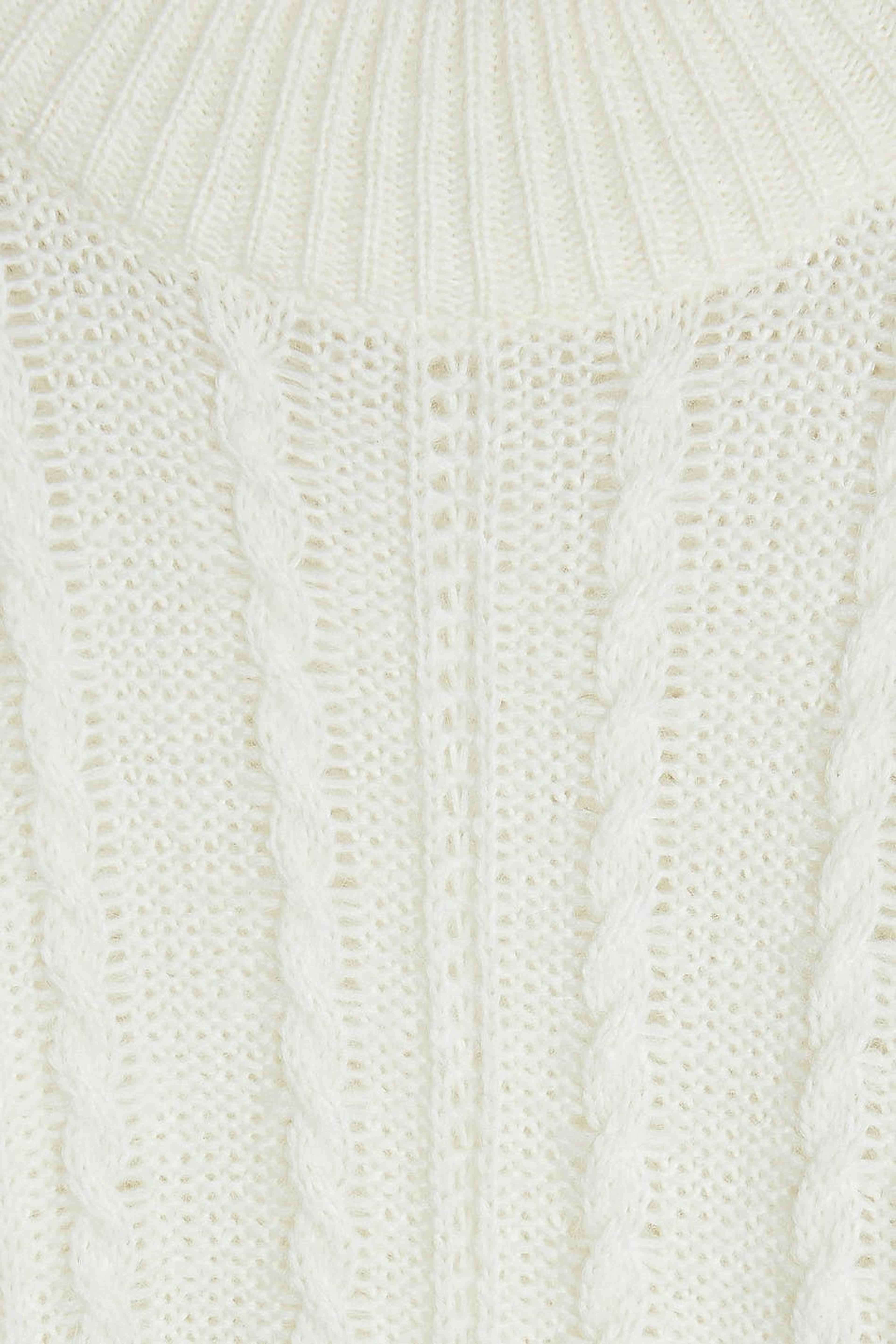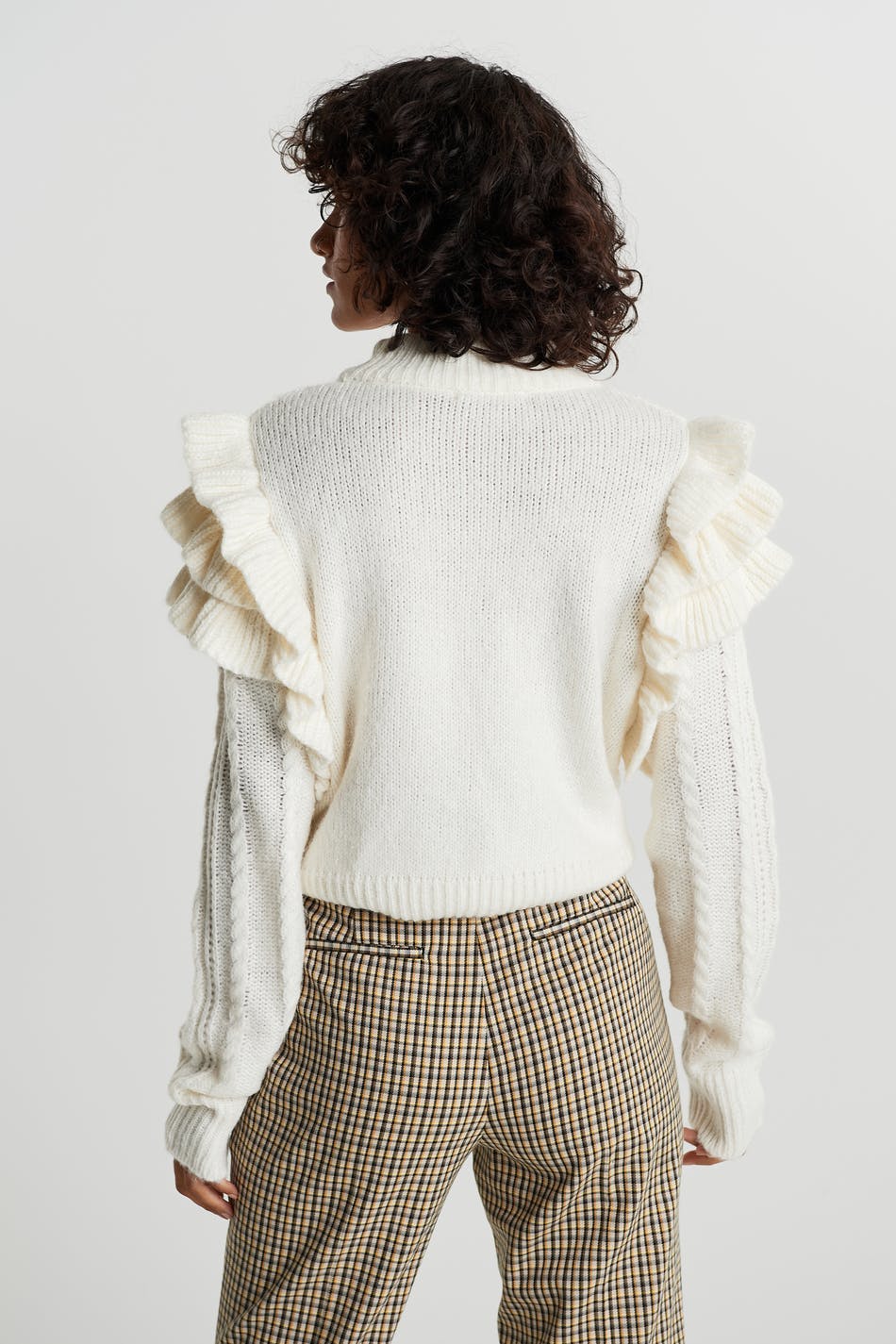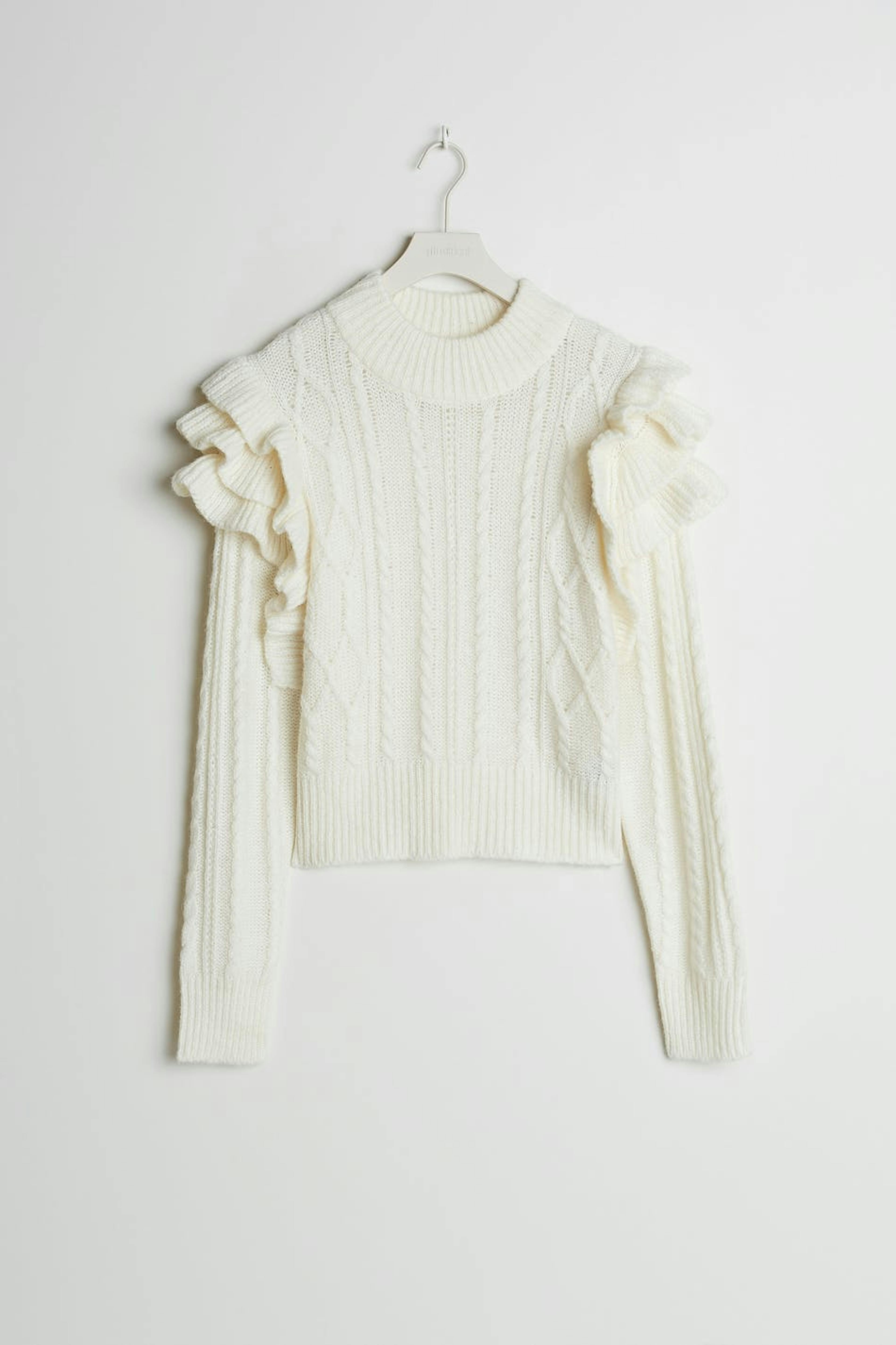 Neulottu villapaita röyhelöillä olkapäissä. Villapaita on valkoinen ja neulottu ja siinä on palmikkoneulotut yksityiskohdat.