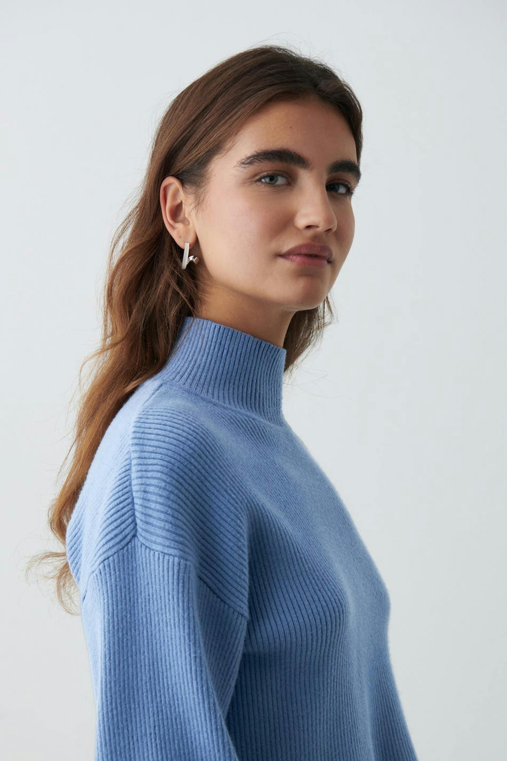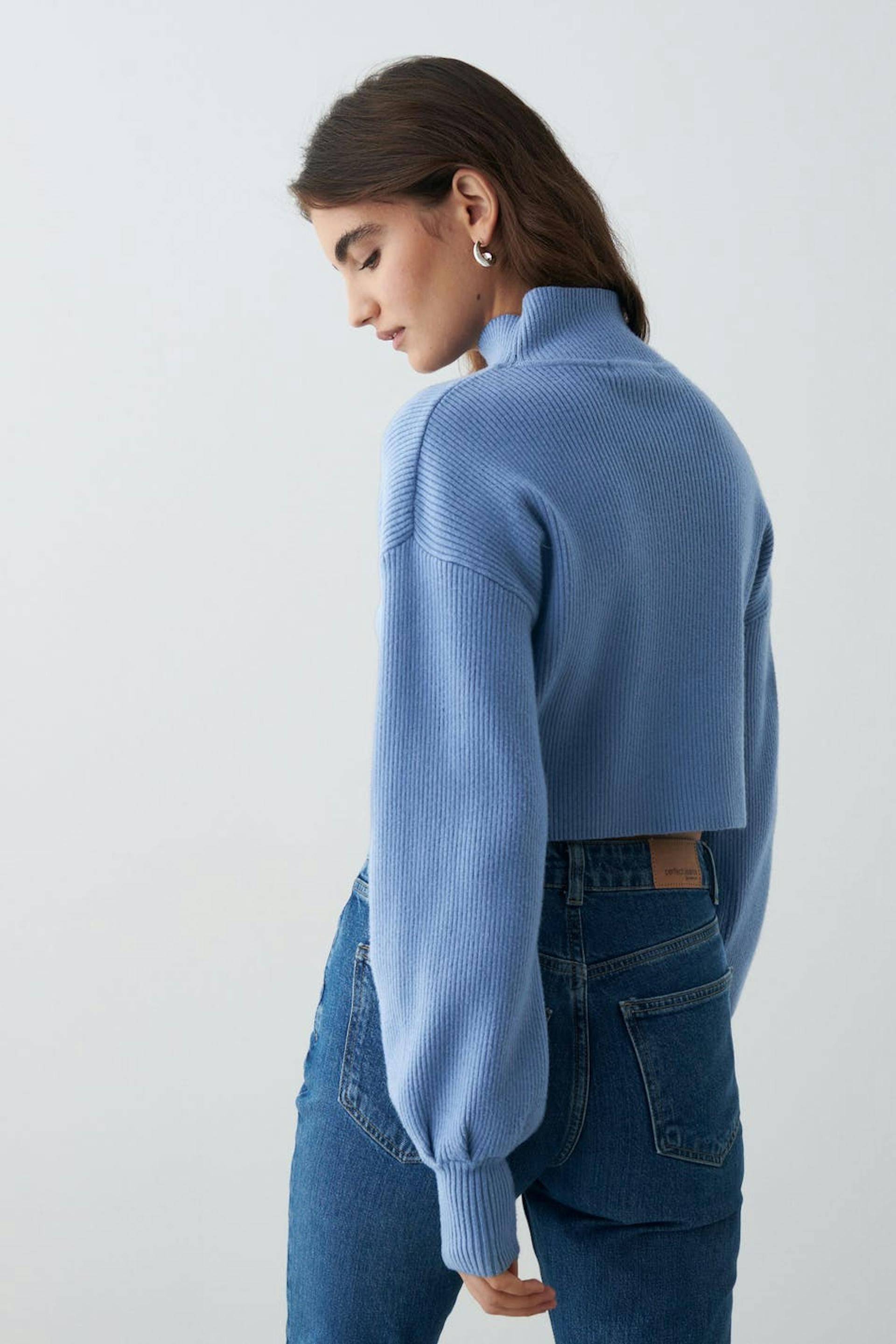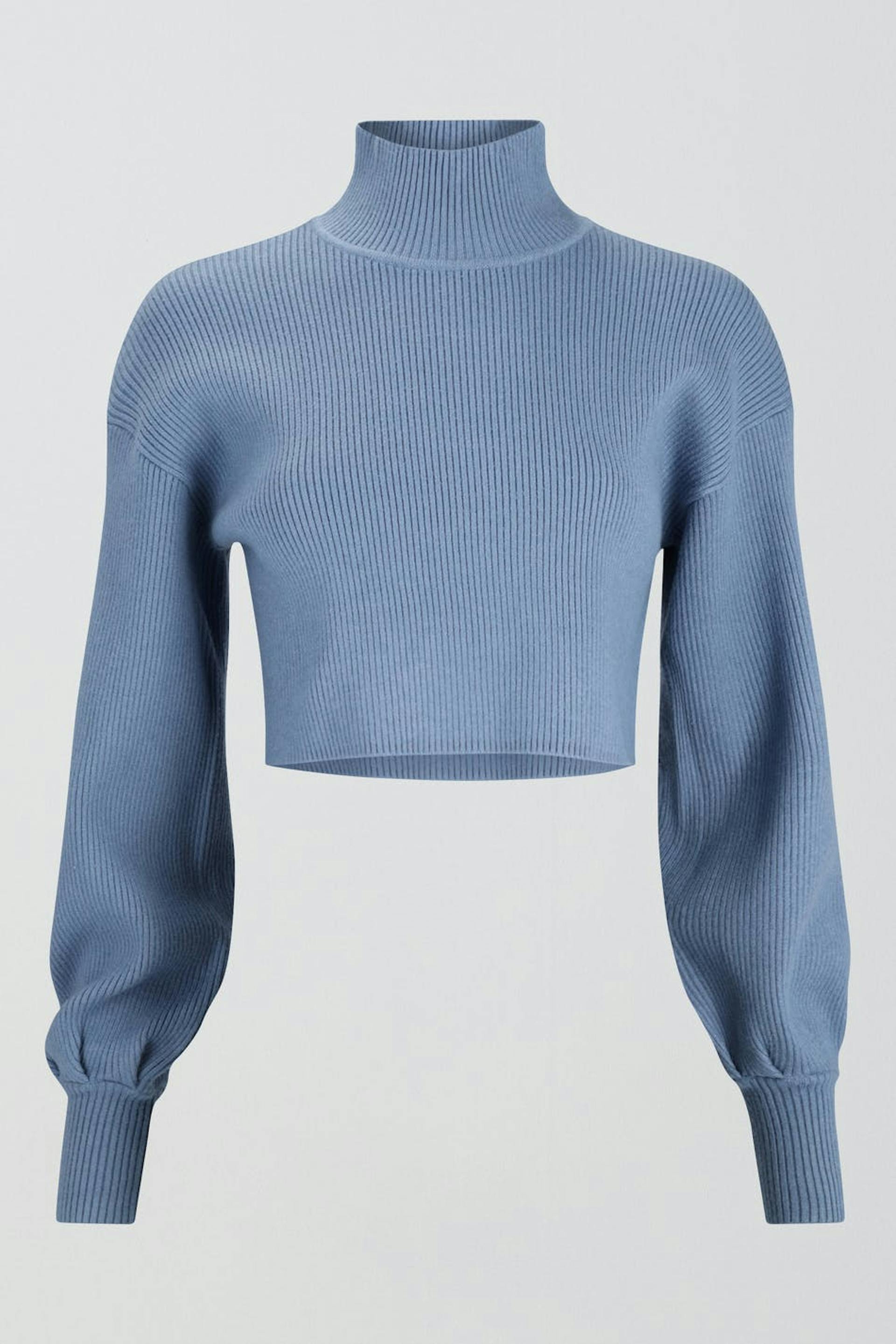 Cropattu neulepusero poolokauluksella. Pusero on sininen, ribattu ja pitkähihainen. Siinä on kookkaat hihat ja joustinneule hihansuissa.