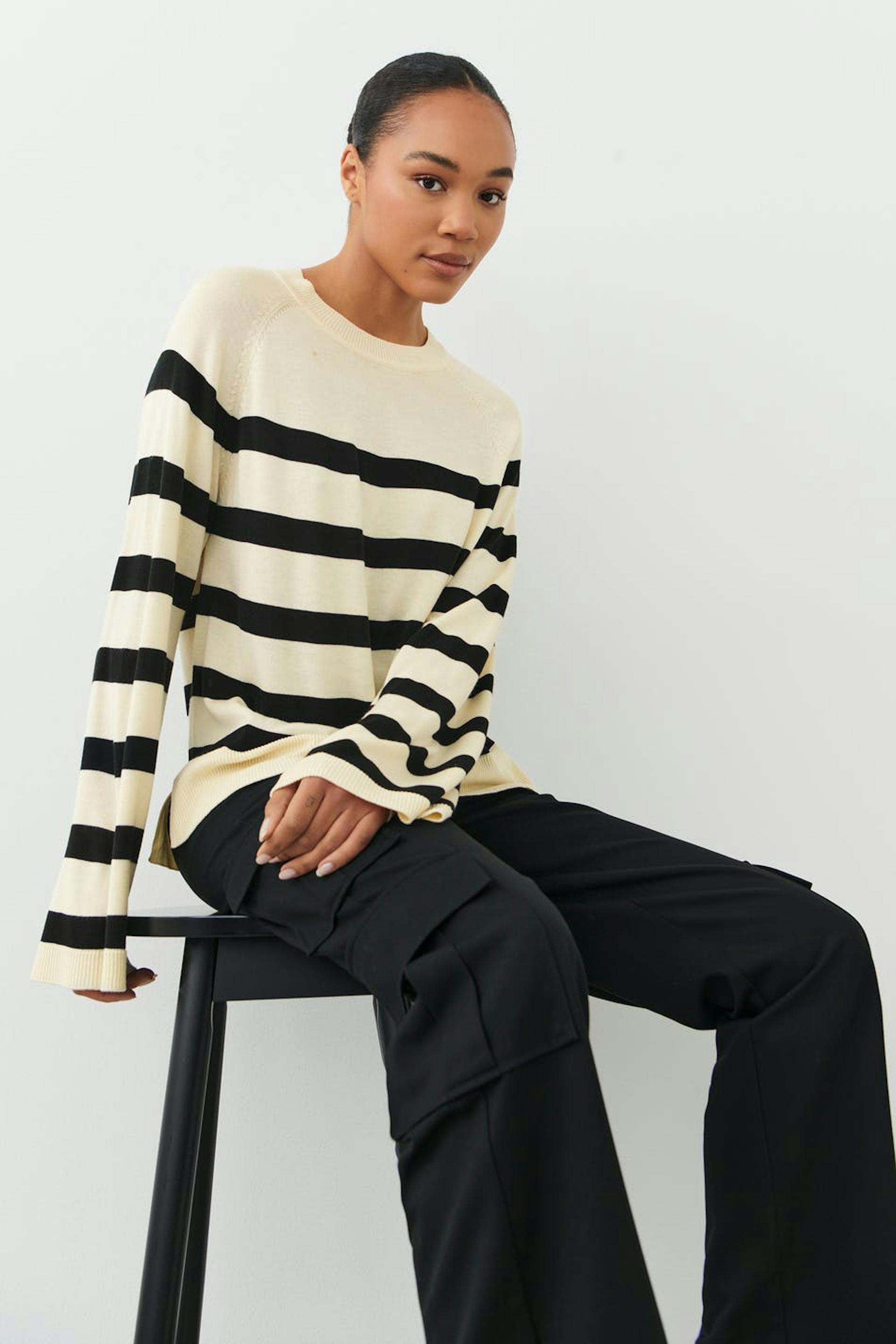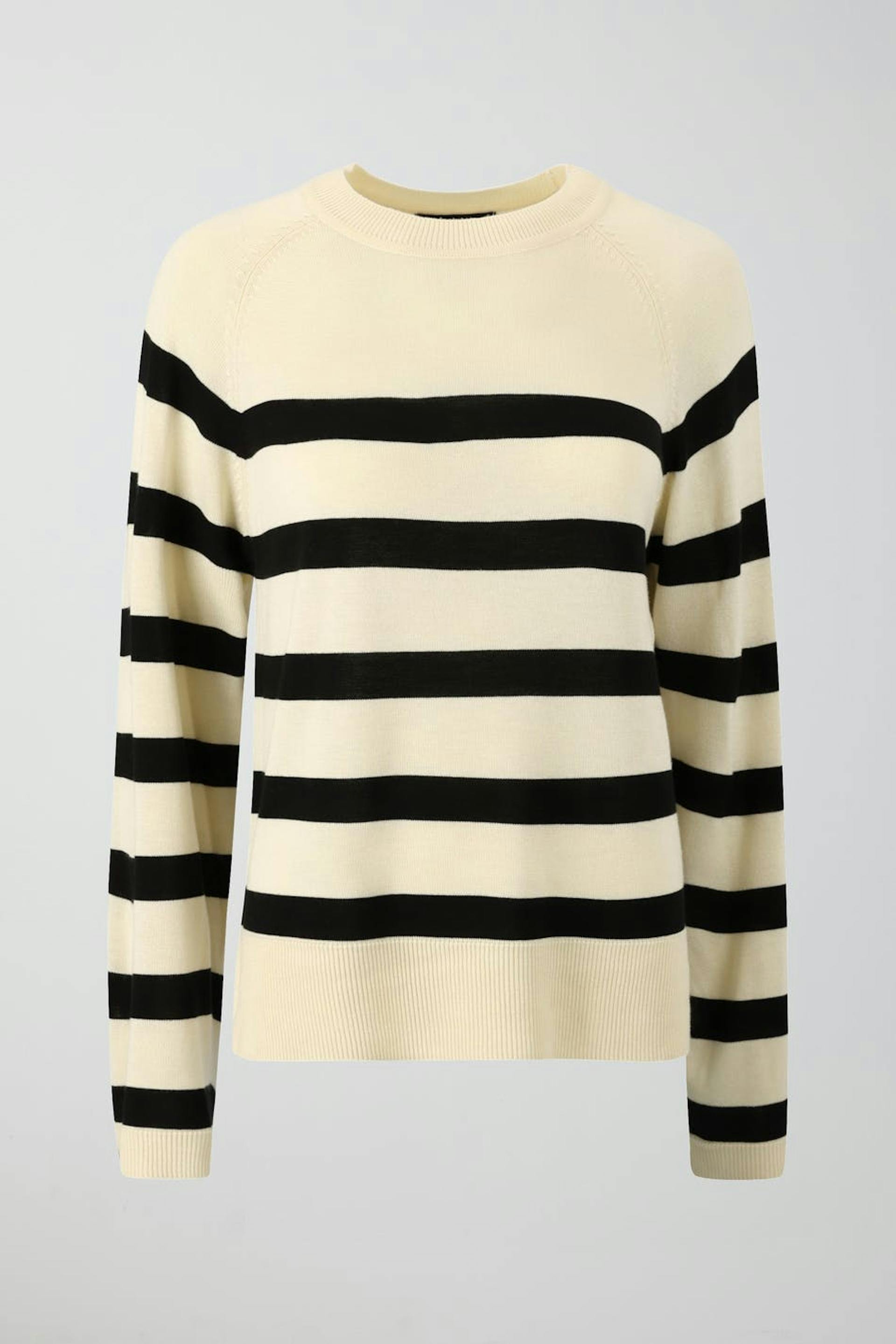 Raidallinen tiheäsilmukkainen villaneulepusero normaalilla istuvuudella. Neulepusero on beige ja siinä on pyöreä pääntie.