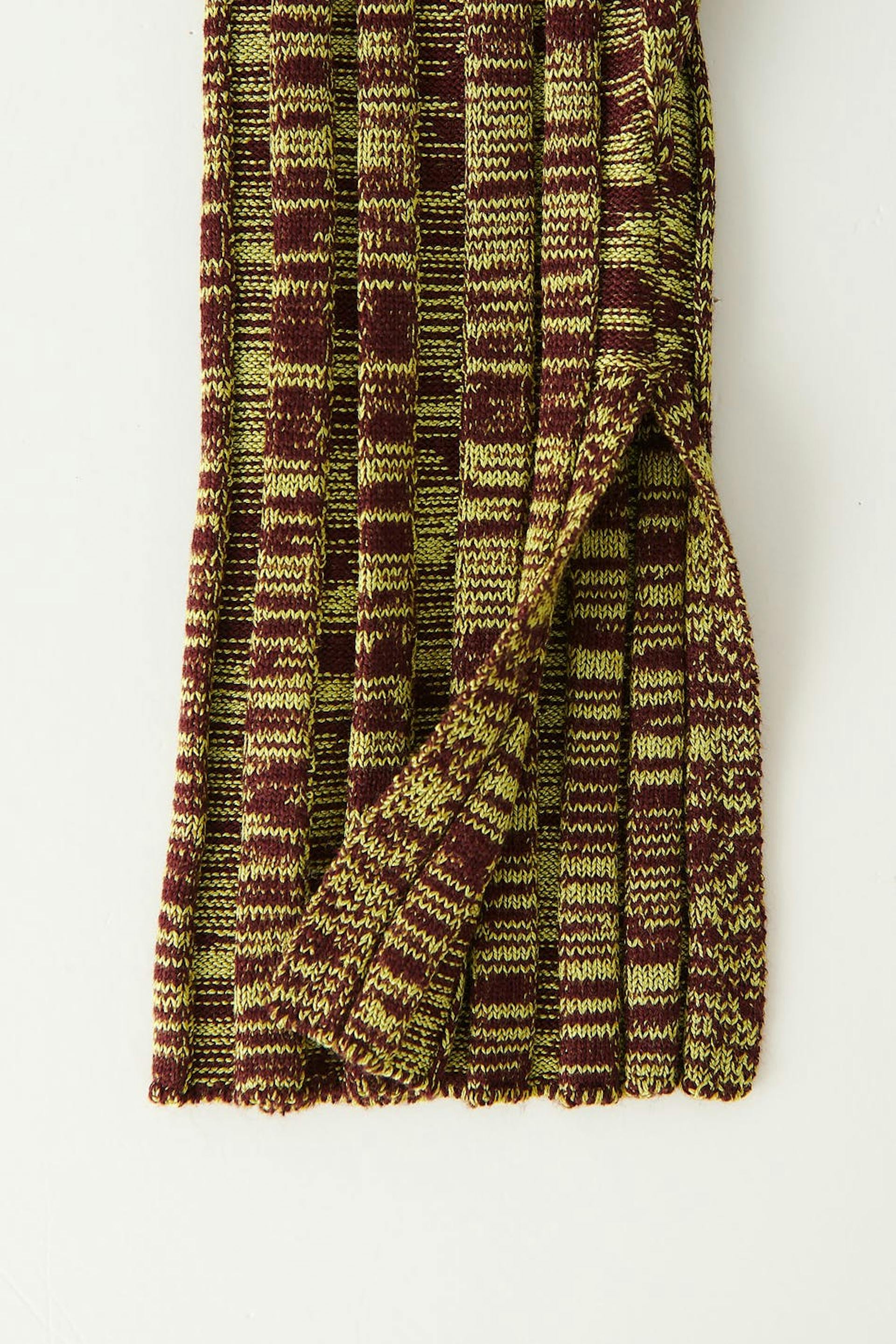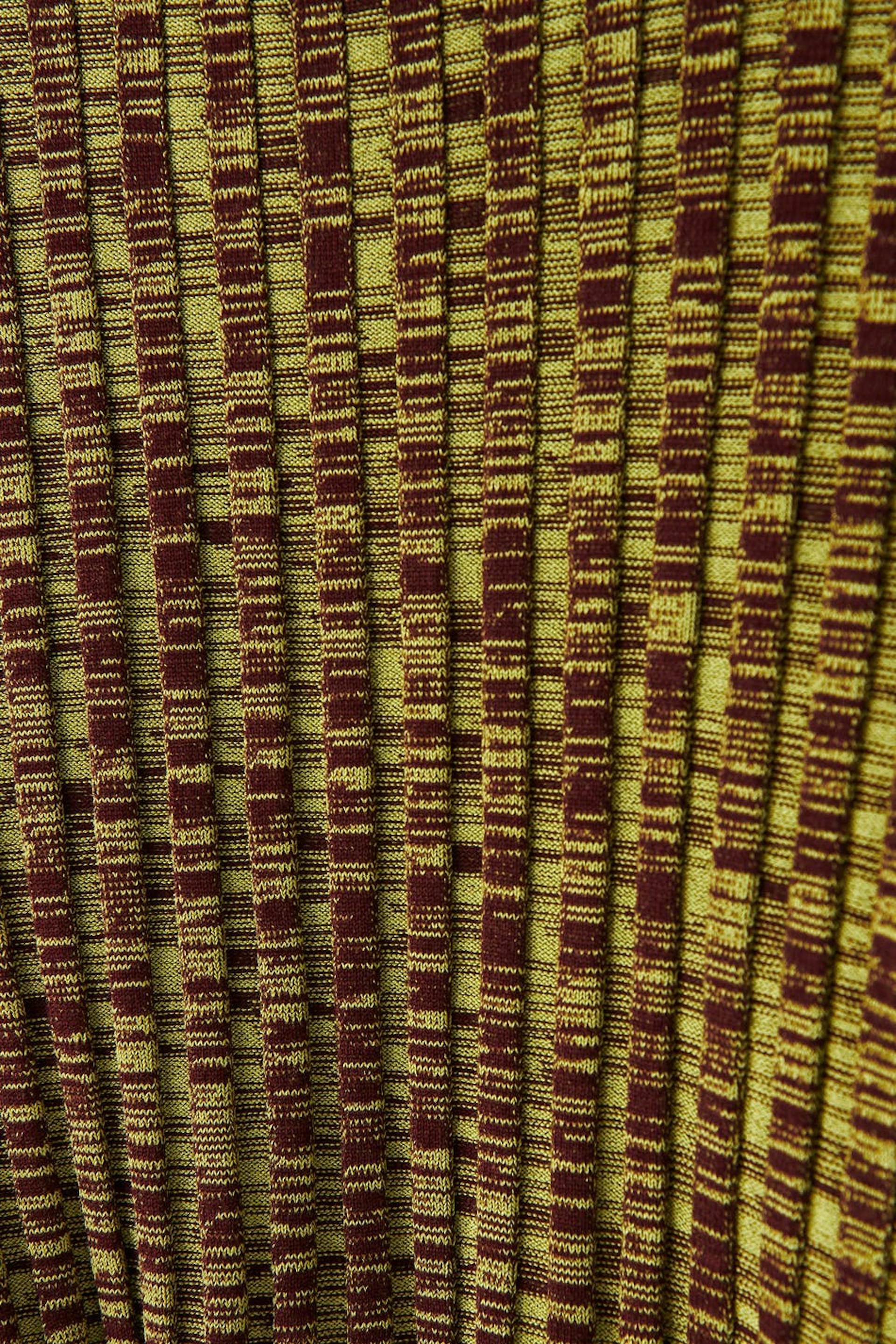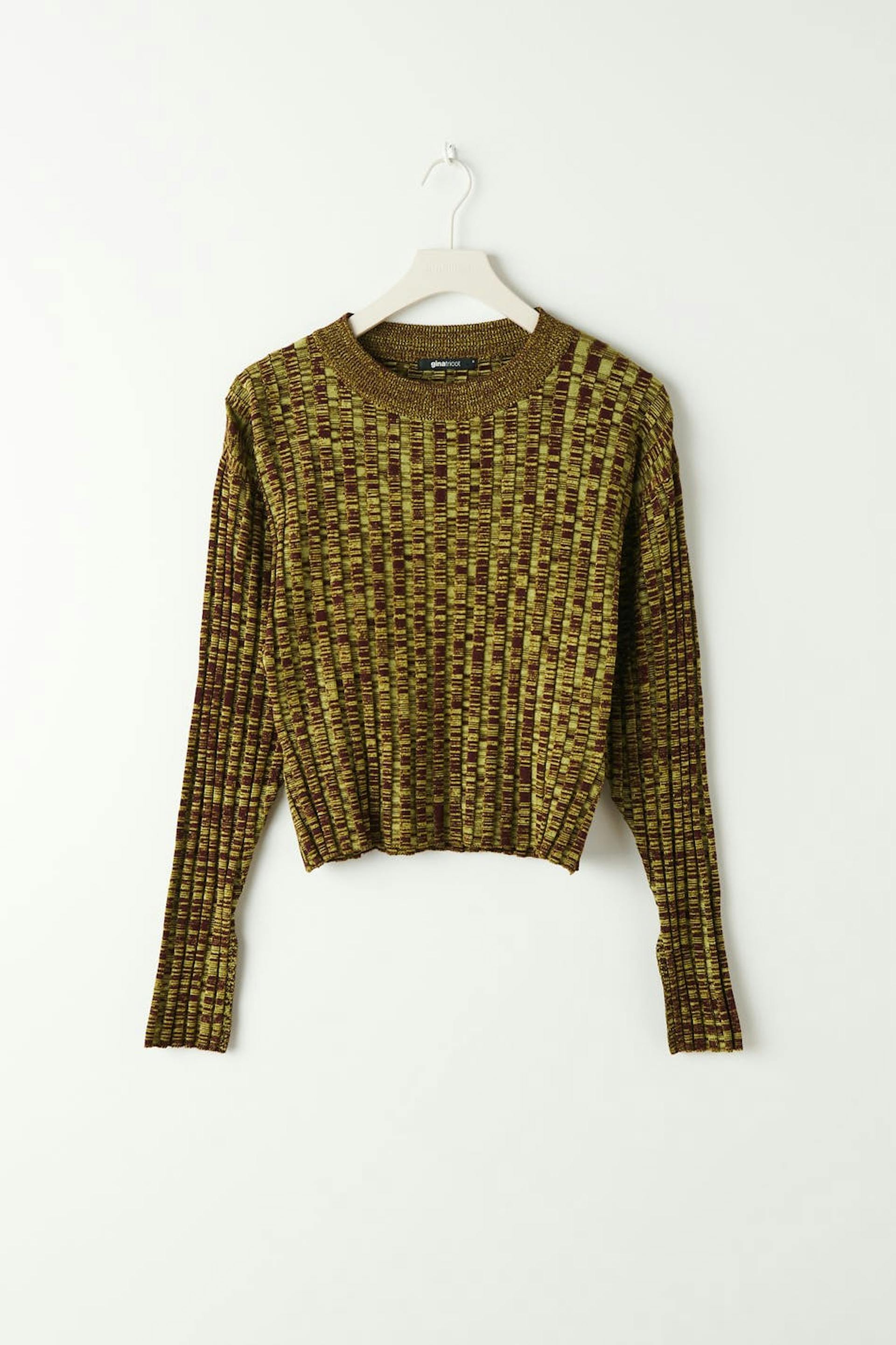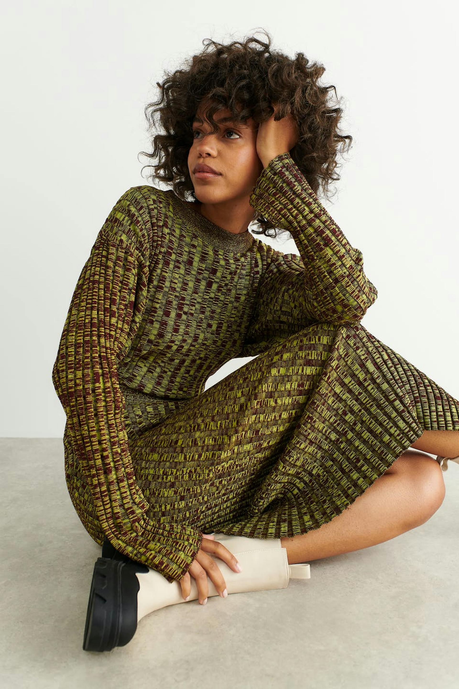 Neulottu toppi poolokauluksella. Toppi on keltainen, pitkähihainen ja ribattu. Siinä on pudotetut olkapäät, väljä malli ylhäällä ja vartalonmyötäinen vyötärö.