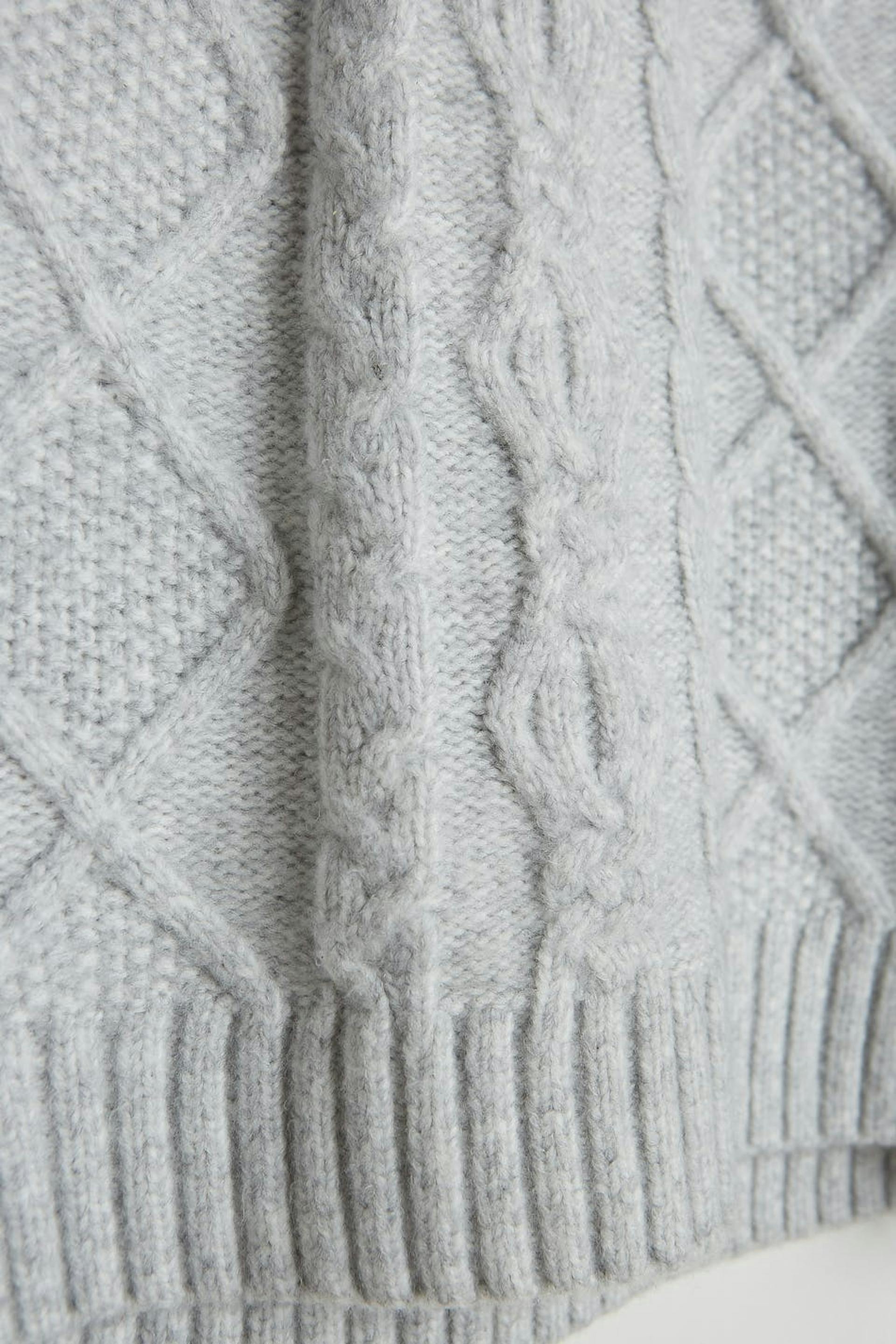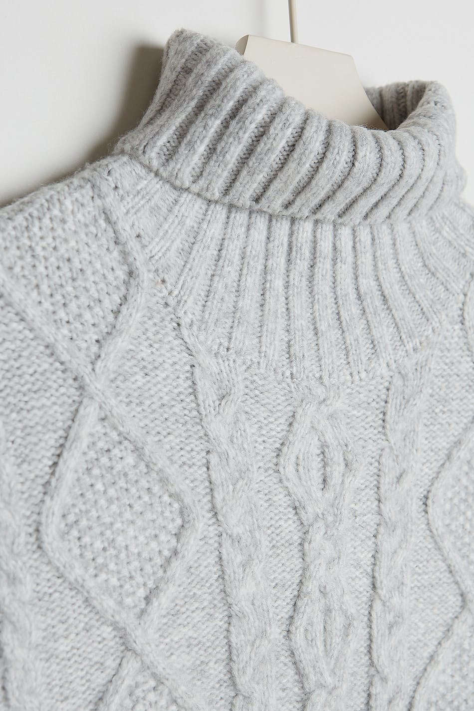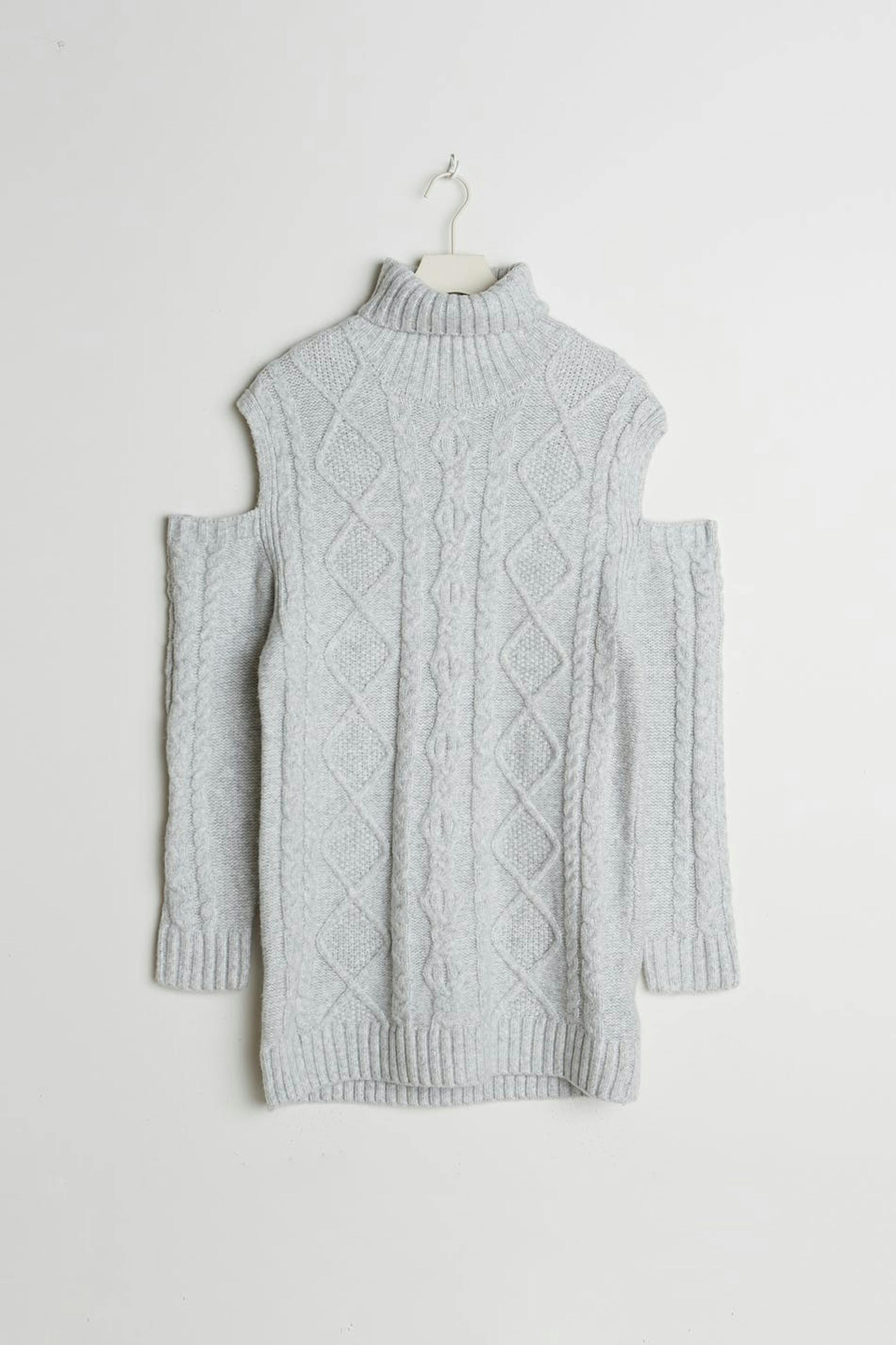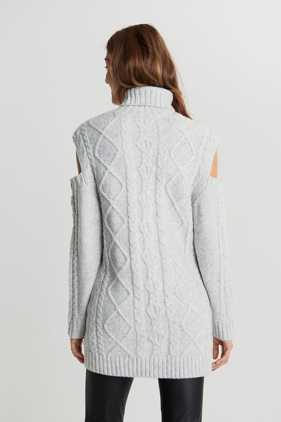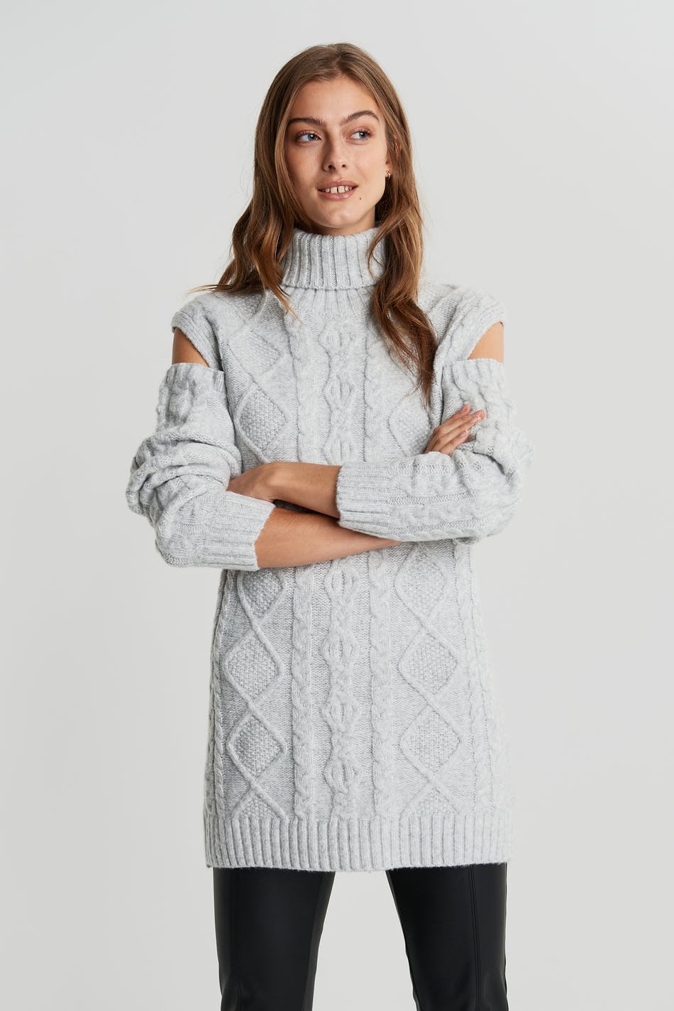 Neulottu tunika leikatuilla yksityiskohdilla olkapäissä. Tunika on harmaa ja neulottu ja siinä on poolokaulus. Siinä on pitkät hihat.