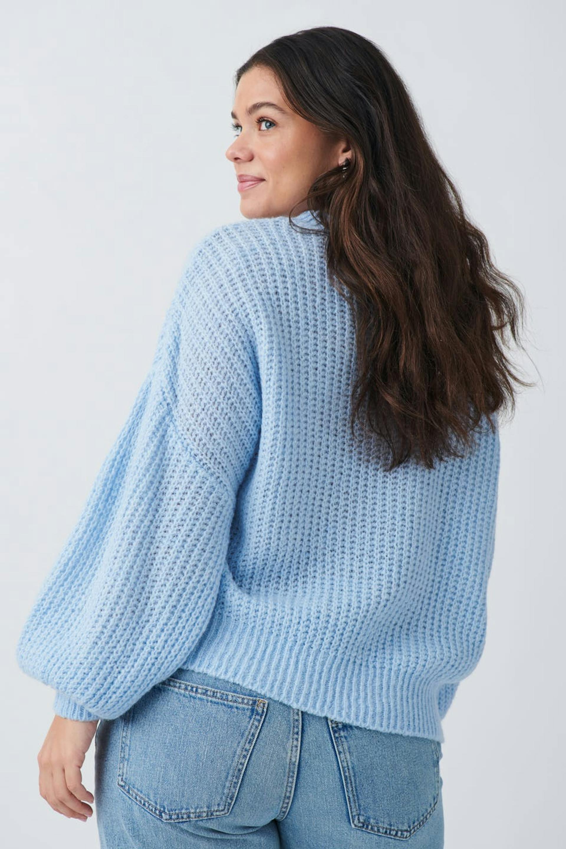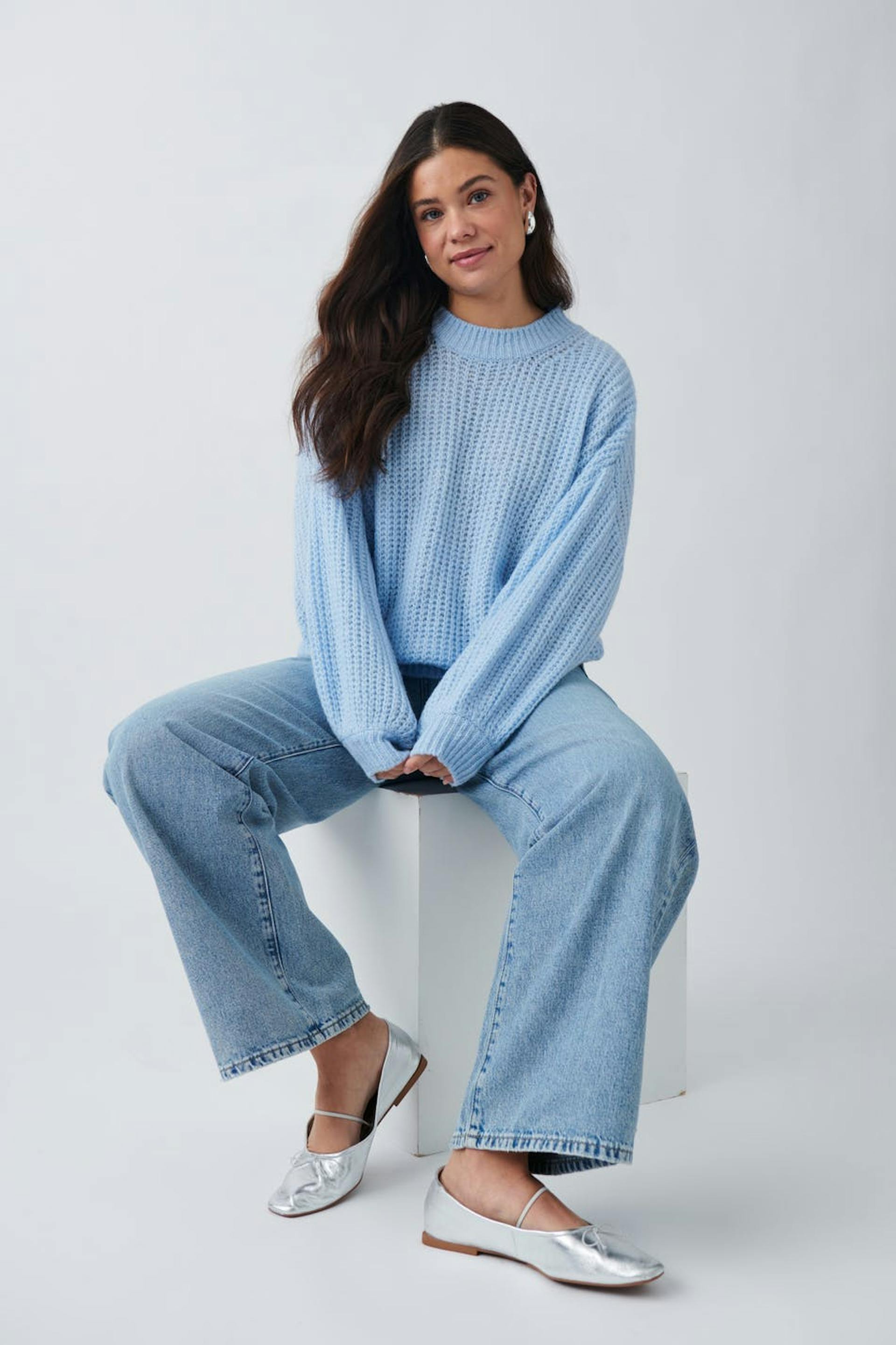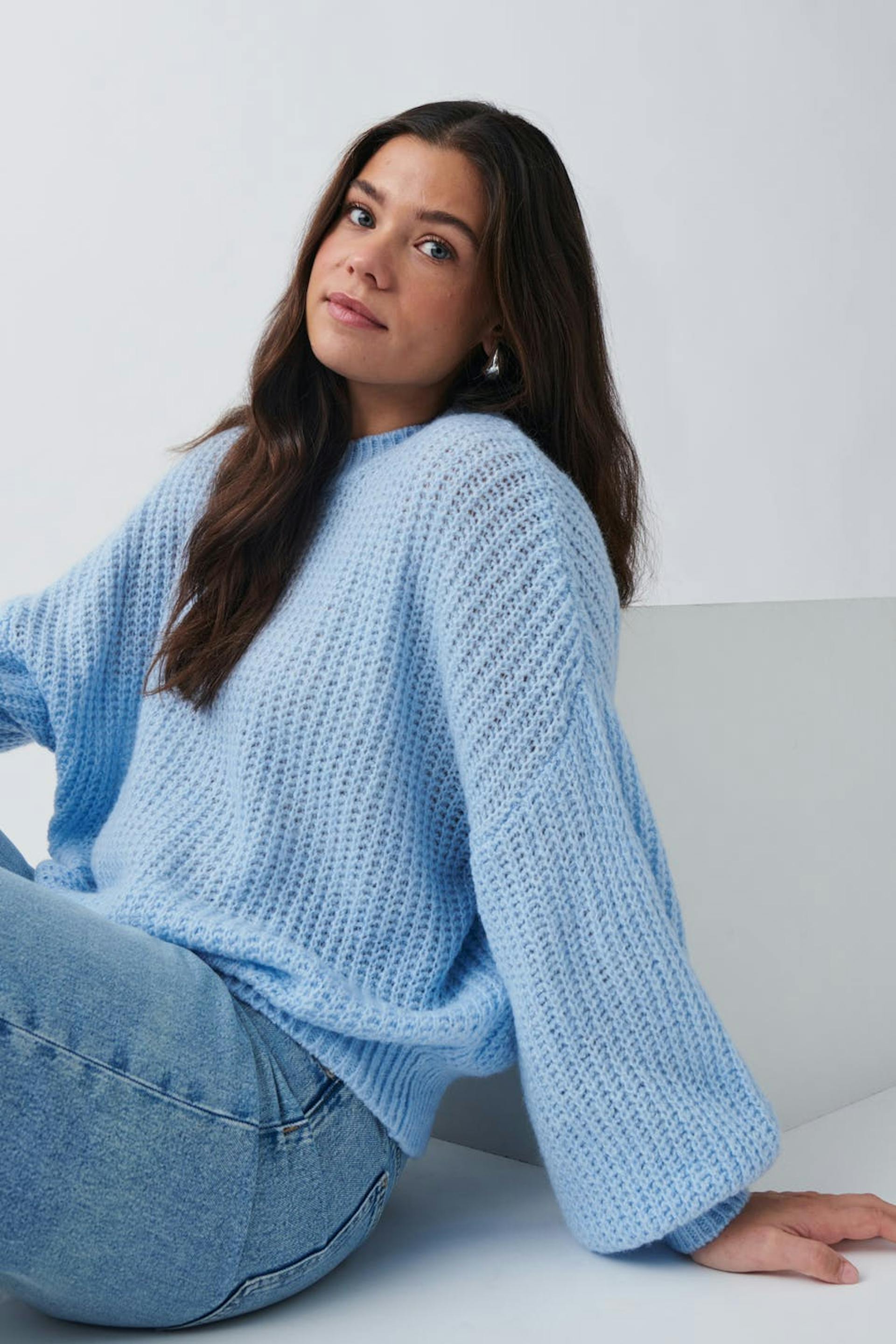 Paksuneulottu paita pudotetulla olkapäälla. Paita on sininen ja siinä on pyöreä pääntie.