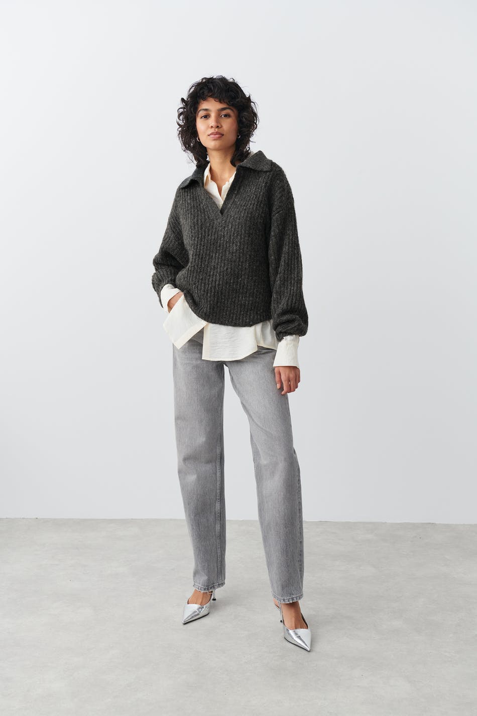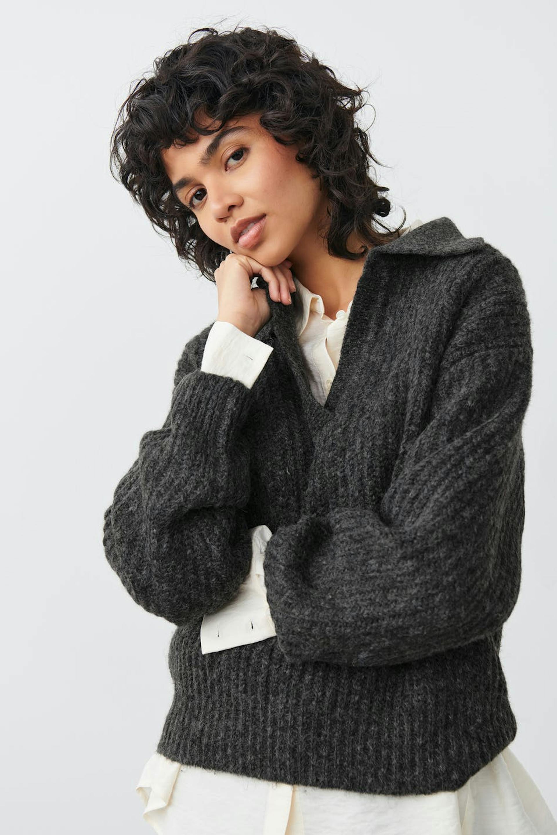 Neulepusero laatikkomaisella mallilla. Pusero on harmaa ja siinä on kaulus kietaisumallisella v-pääntiellä.