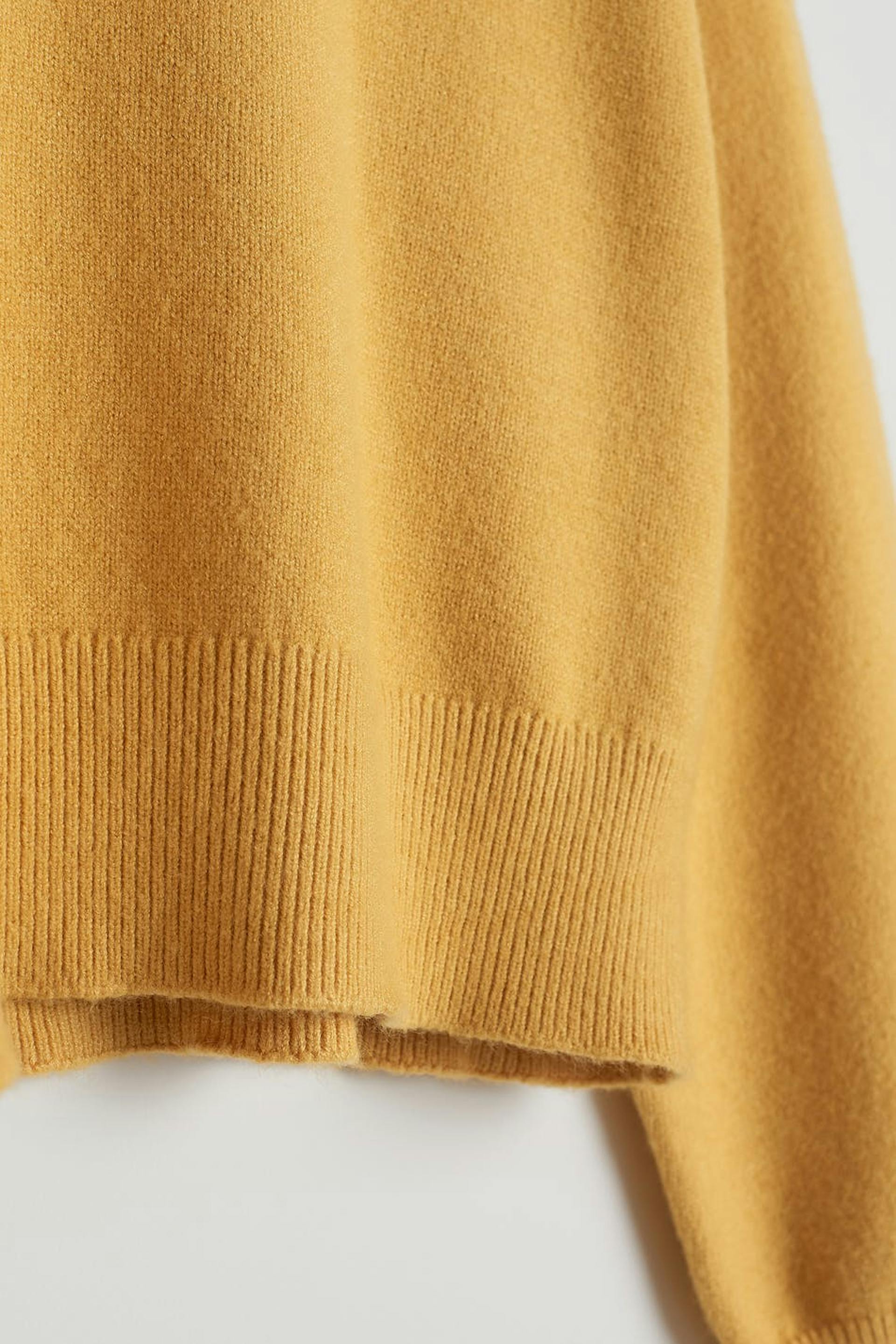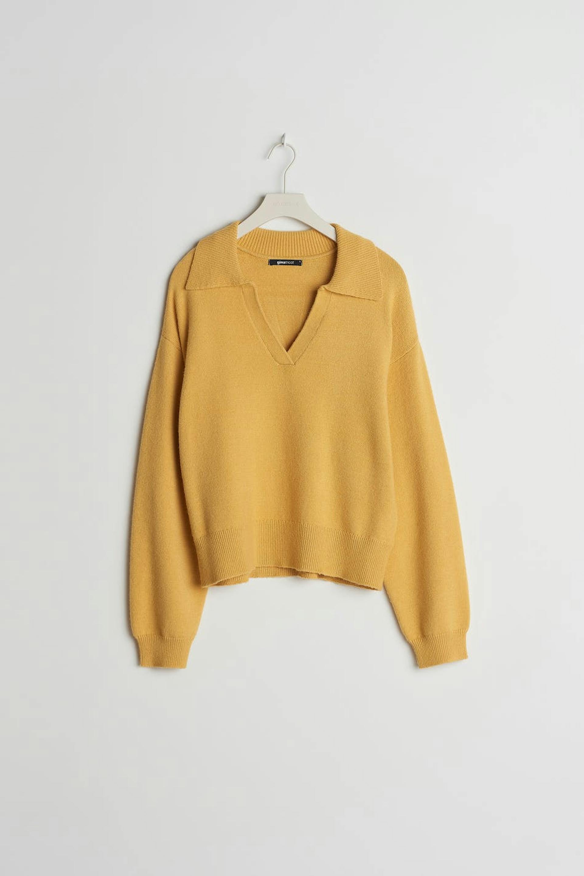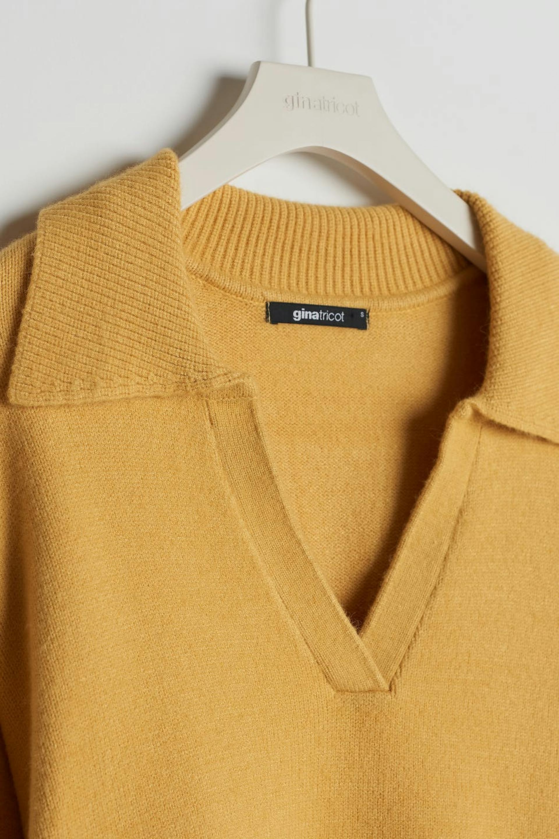 Neulottu villapaita V-aukolla. Villapaita on keltainen, neulottu ja pitkähihainen. Siinä on pudotetut olkapäät ja kaulus.