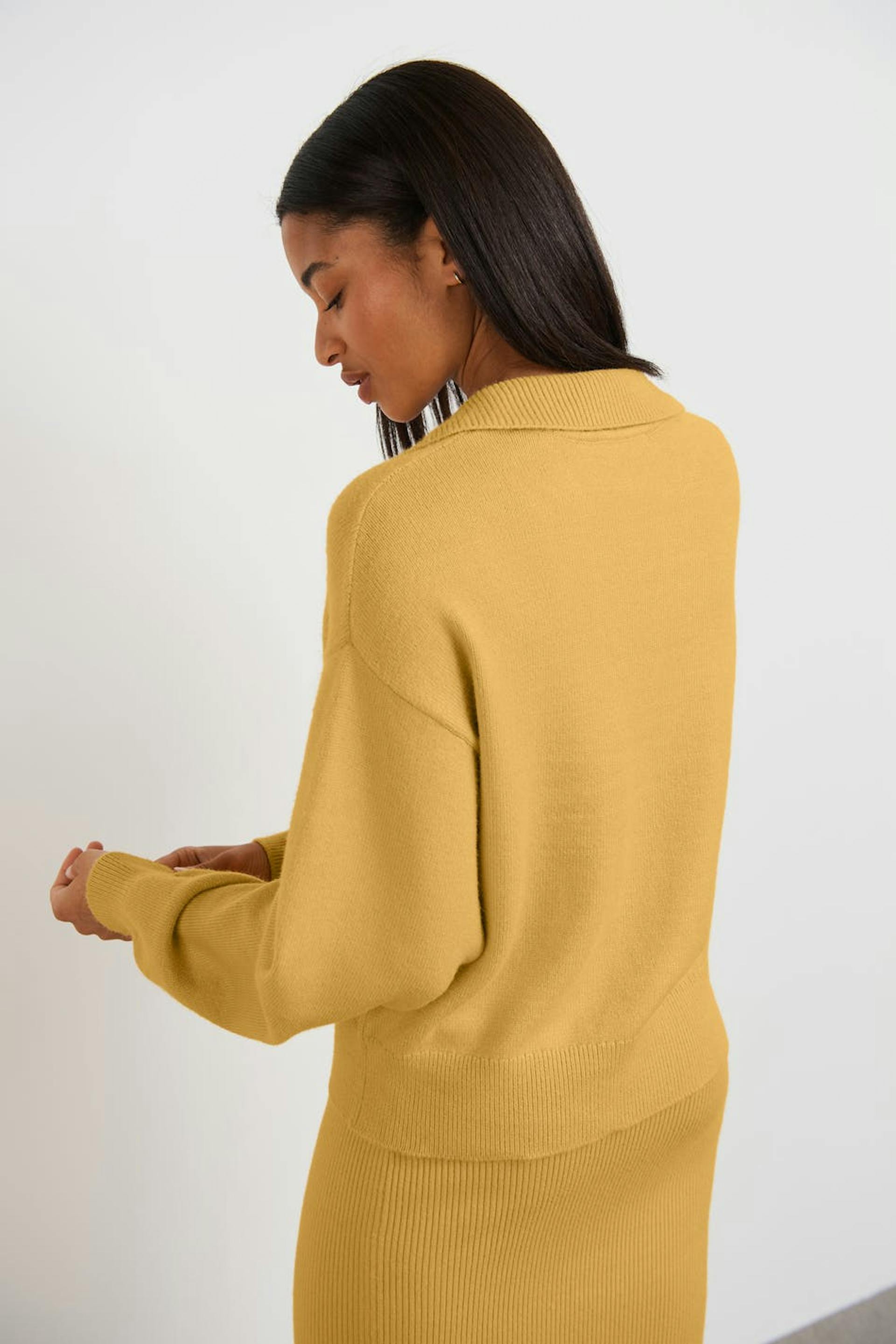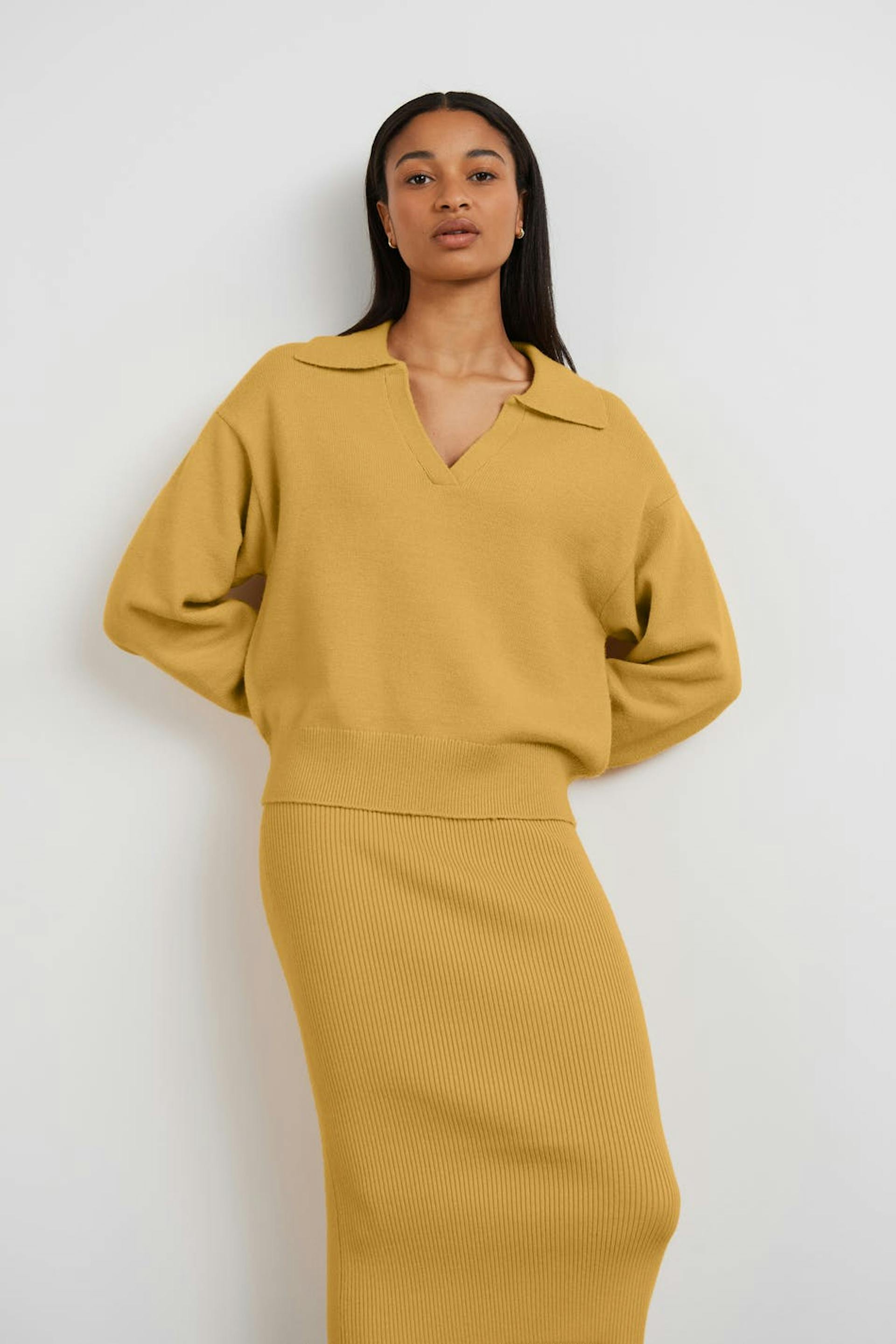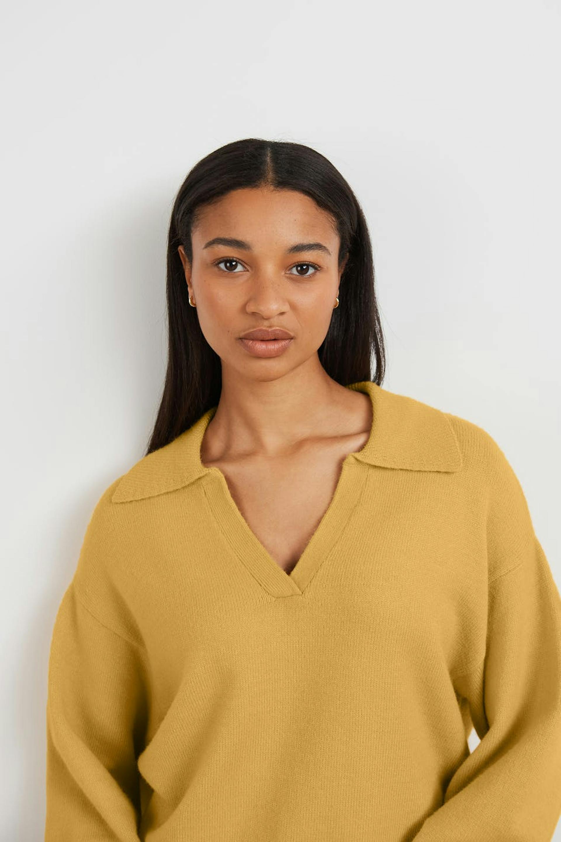 Neulottu villapaita V-aukolla. Villapaita on keltainen, neulottu ja pitkähihainen. Siinä on pudotetut olkapäät ja kaulus.