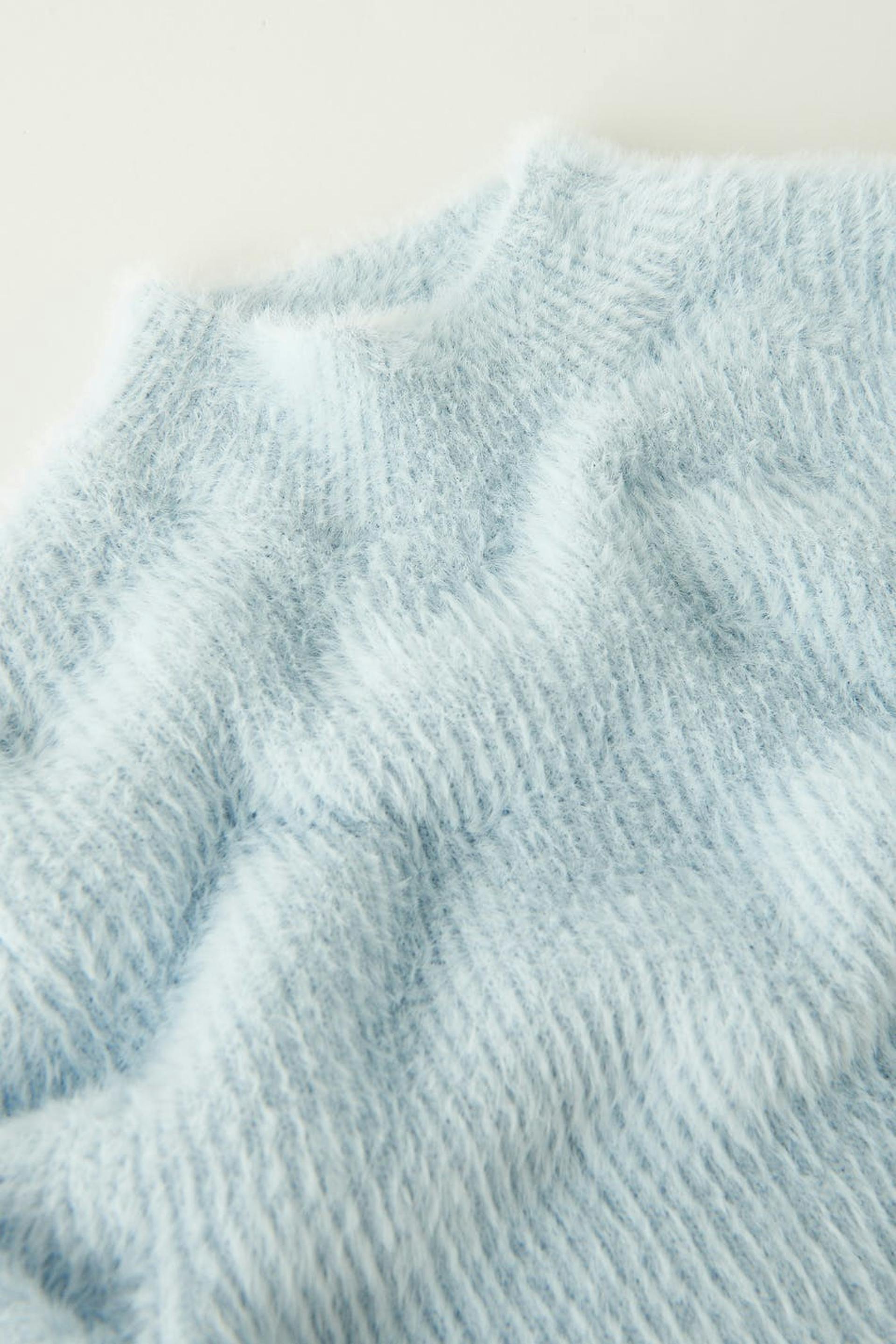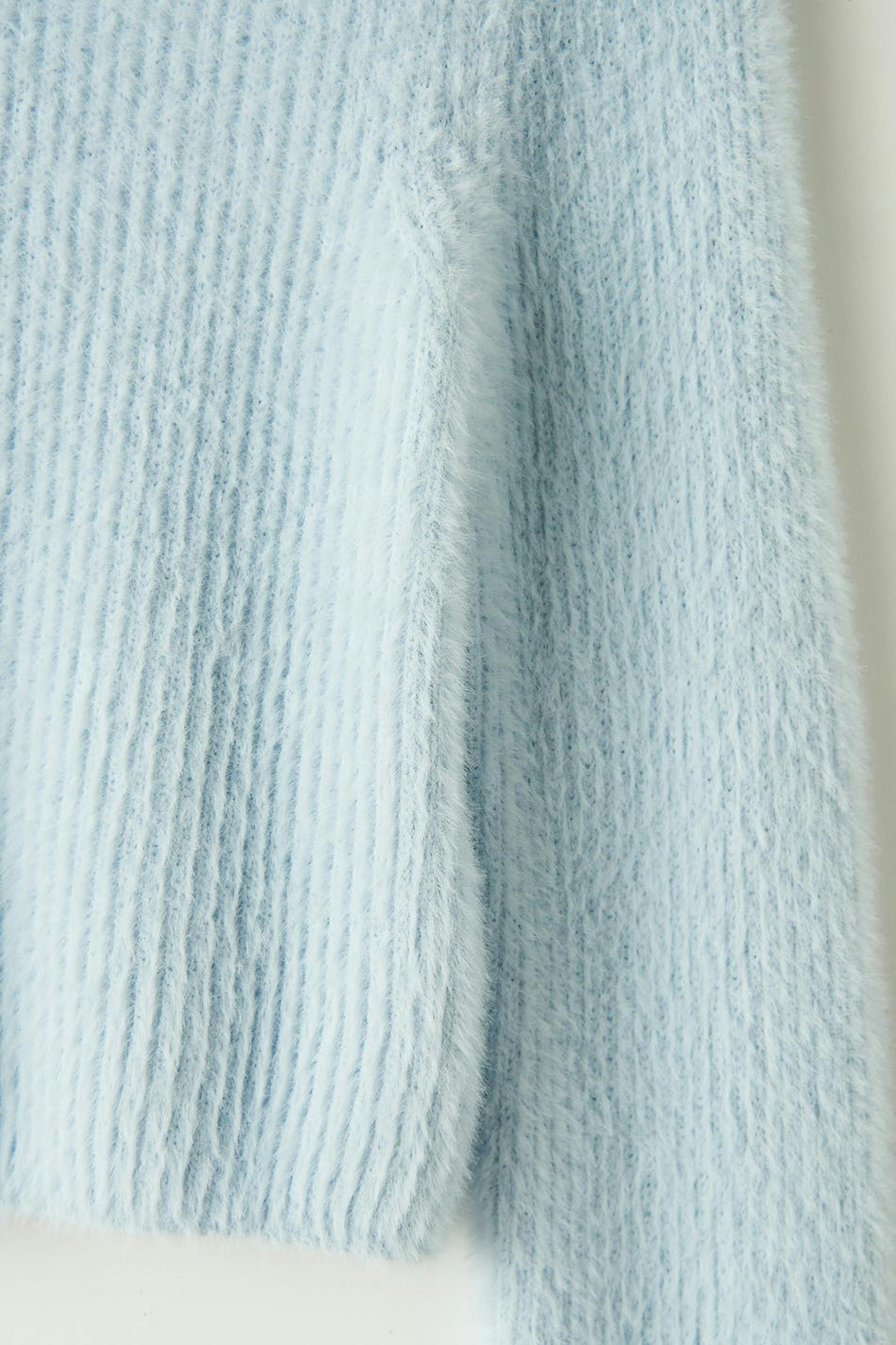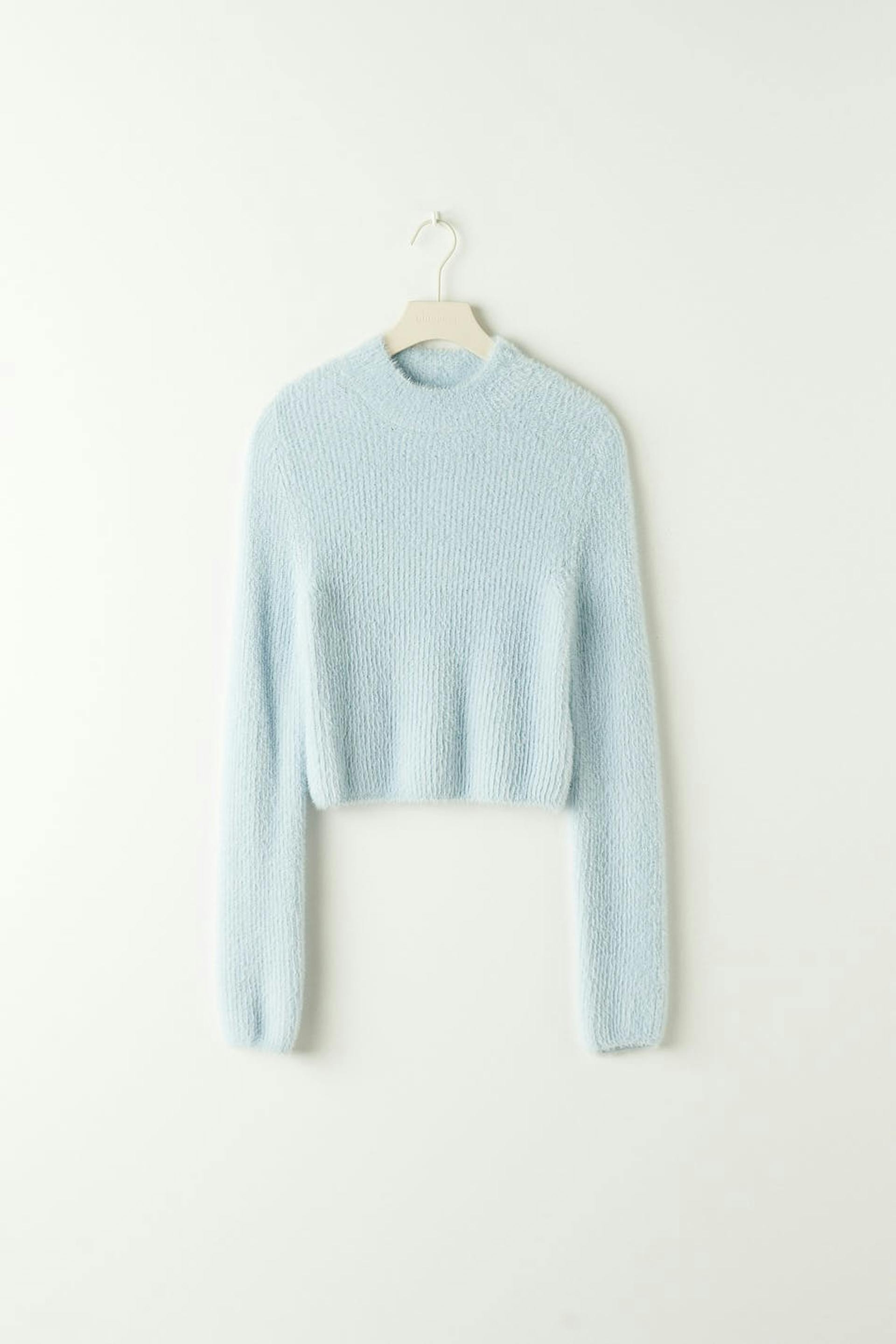 Pörröinen paita pehmeällä laadulla. Paita on sininen, neulottu ja cropattu. Siinä on normaali leikkaus, pyöristetty kaula-aukko ja resorihelma.