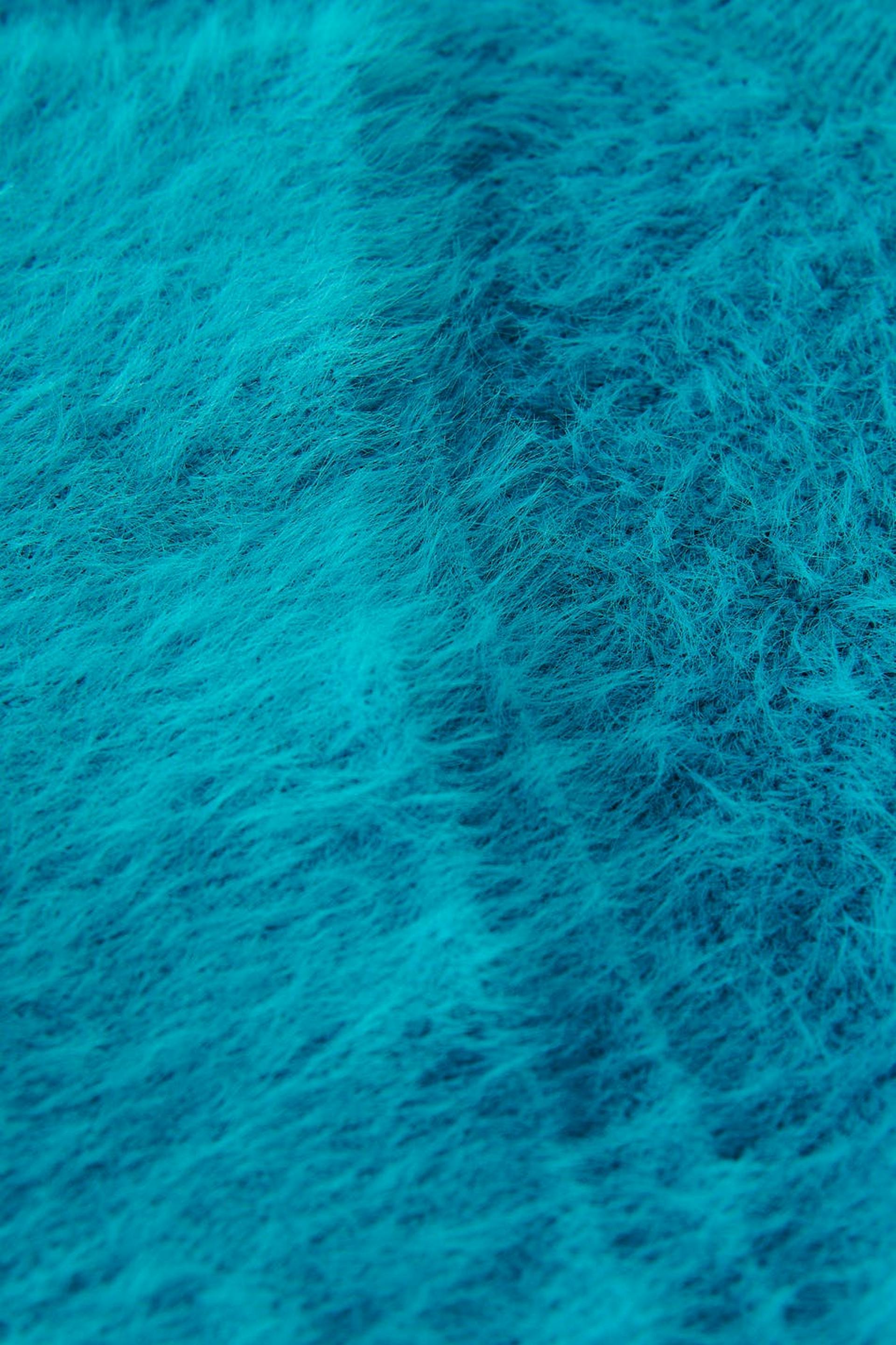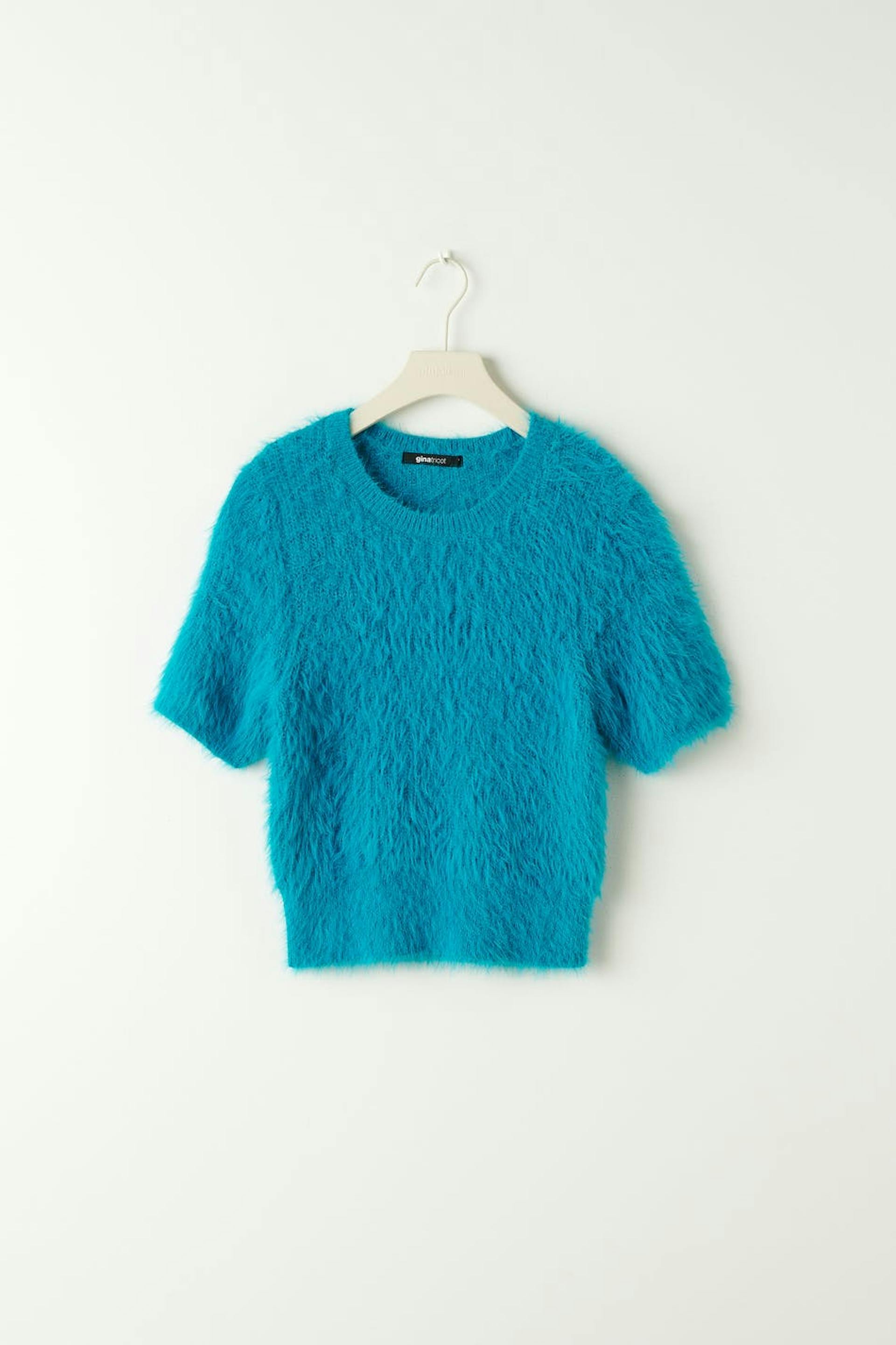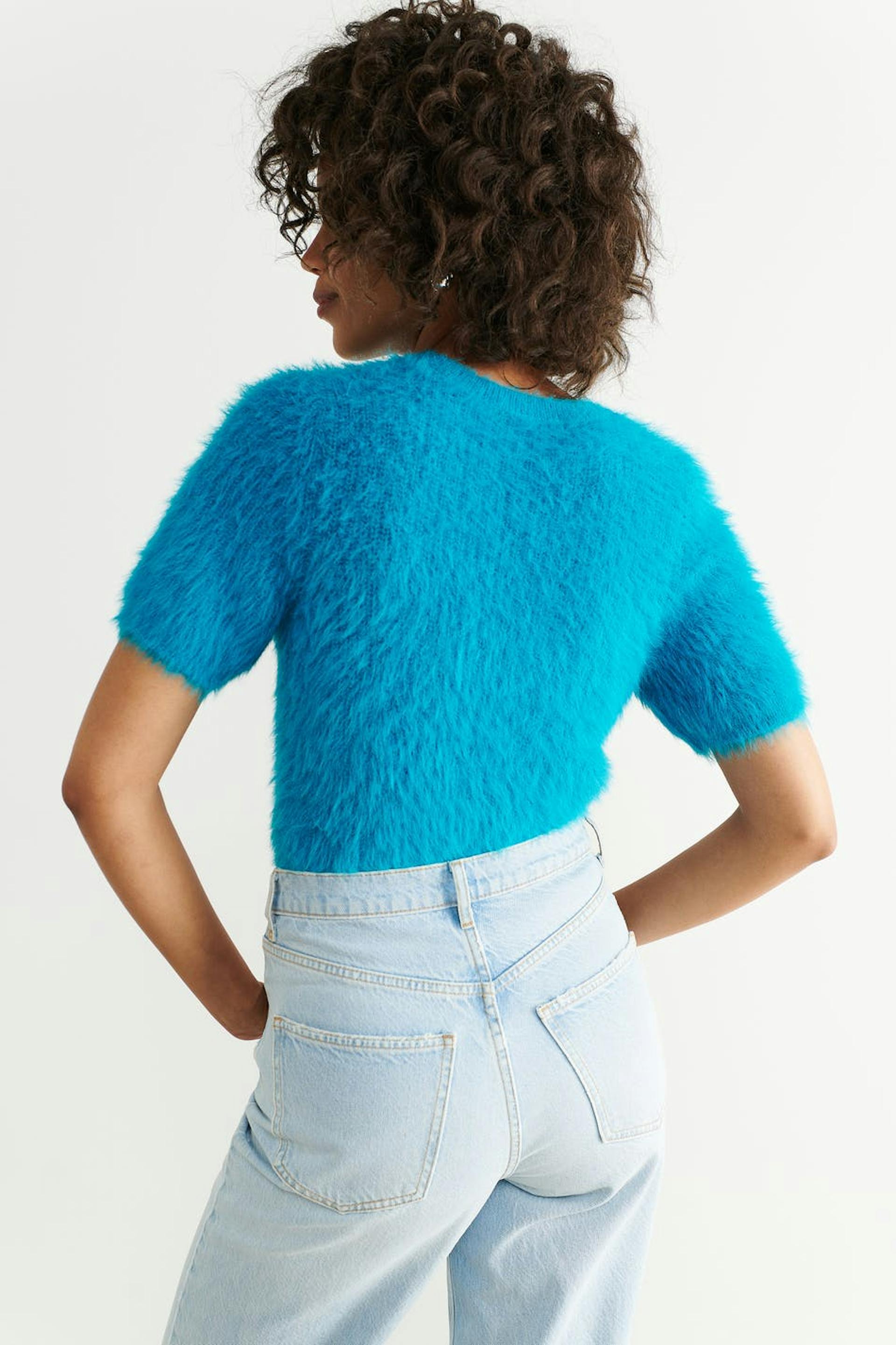 Pörröinen toppi pyöreällä pääntiellä. Toppi on sininen, neulottu ja lyhythihainen.