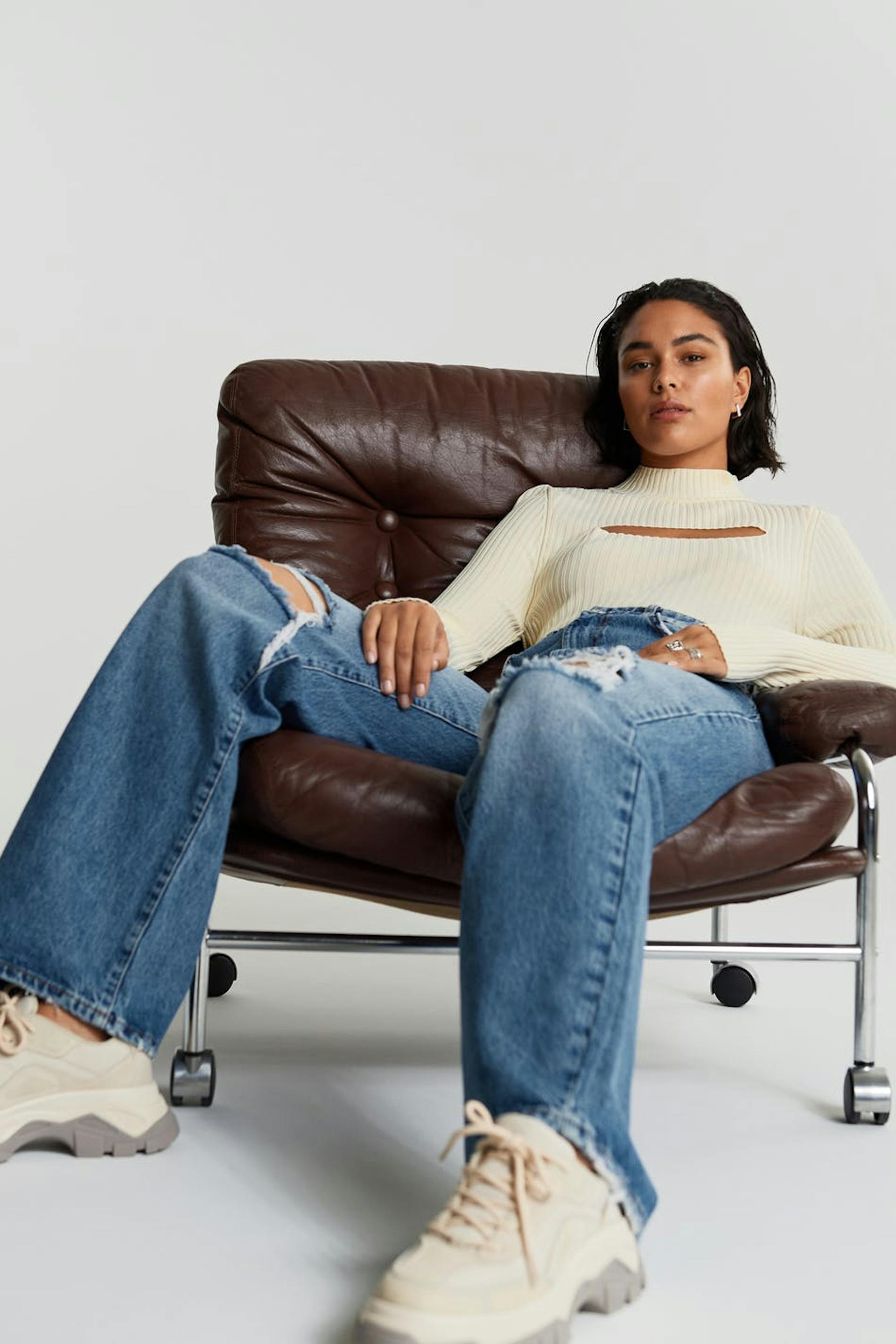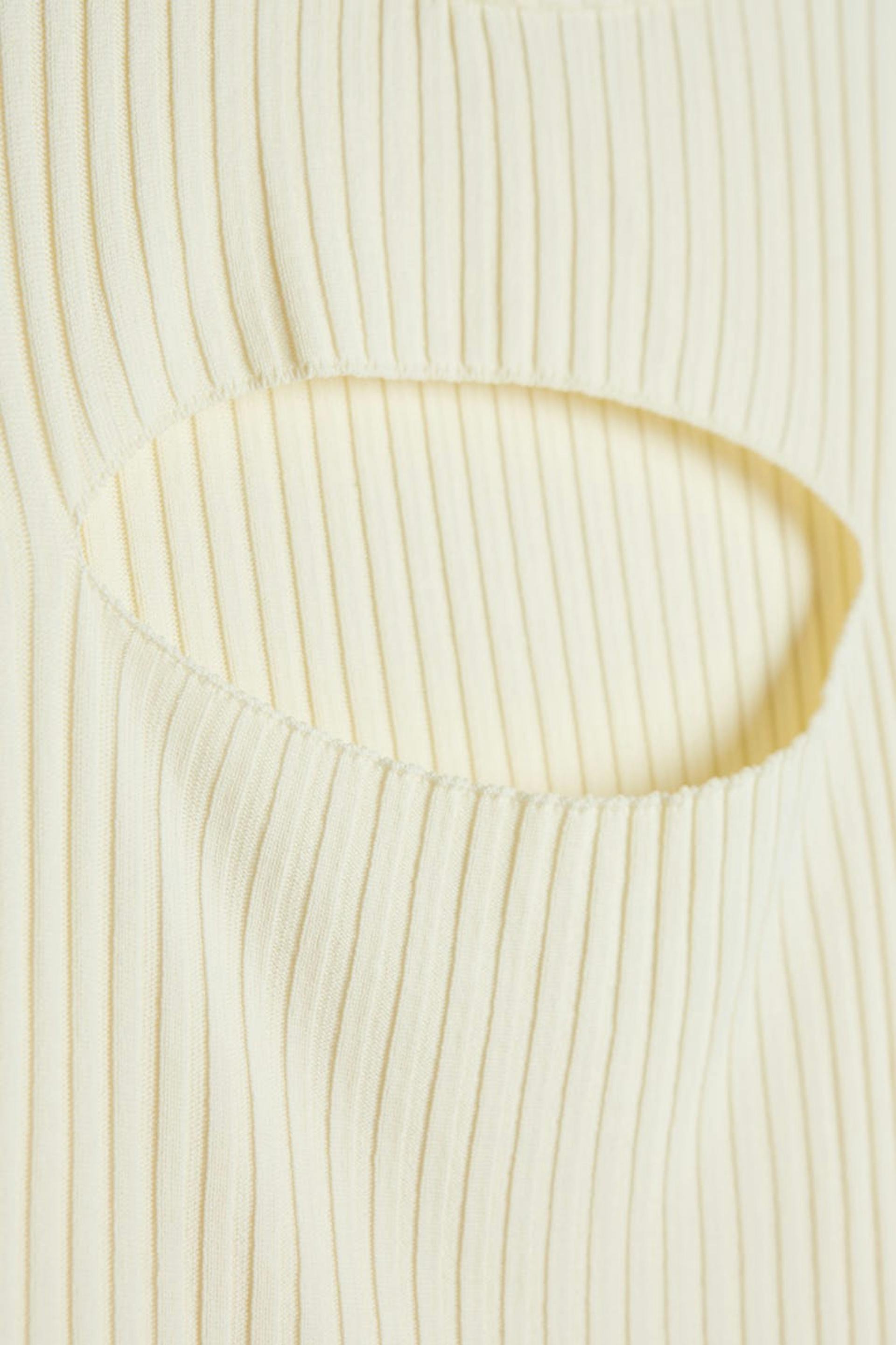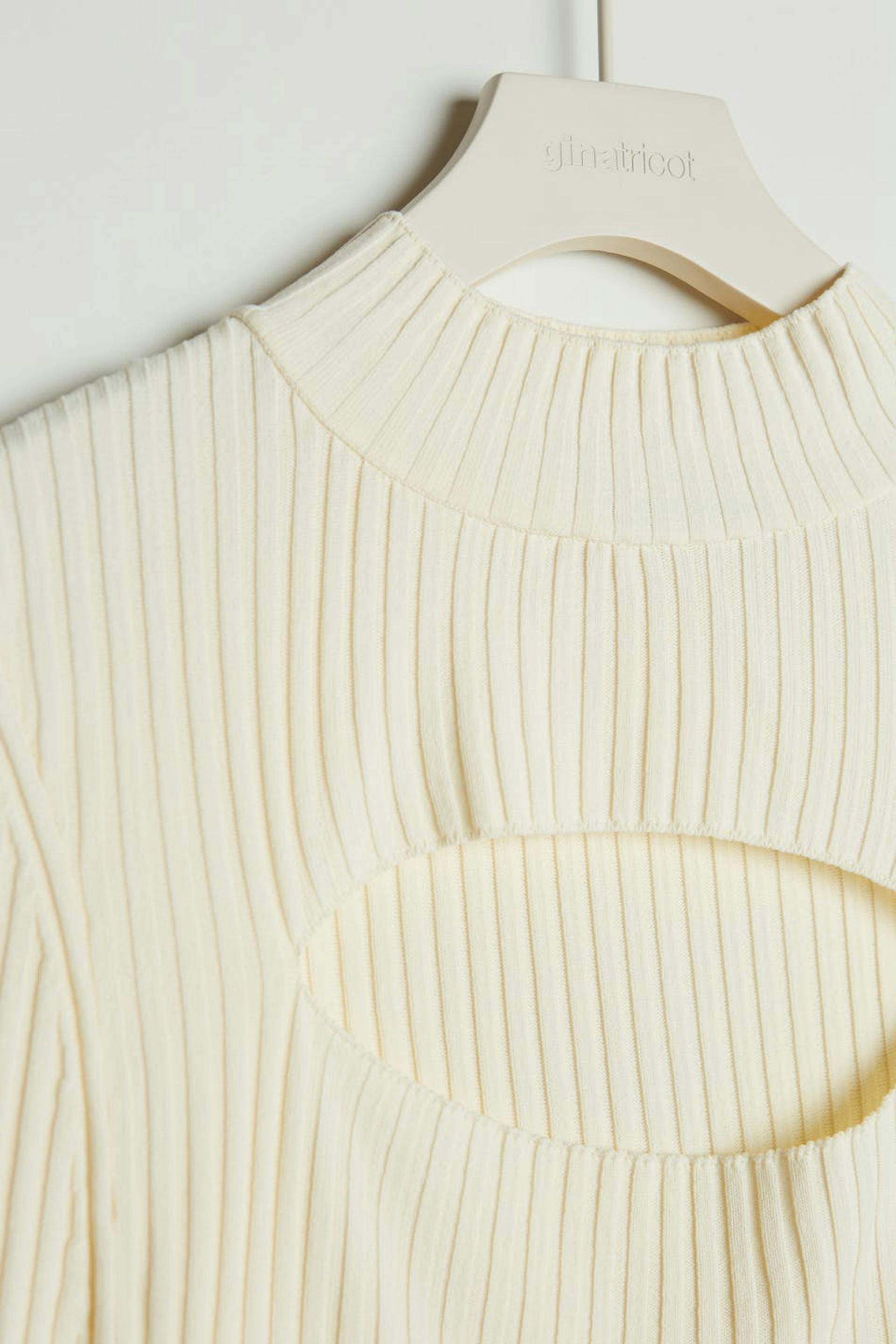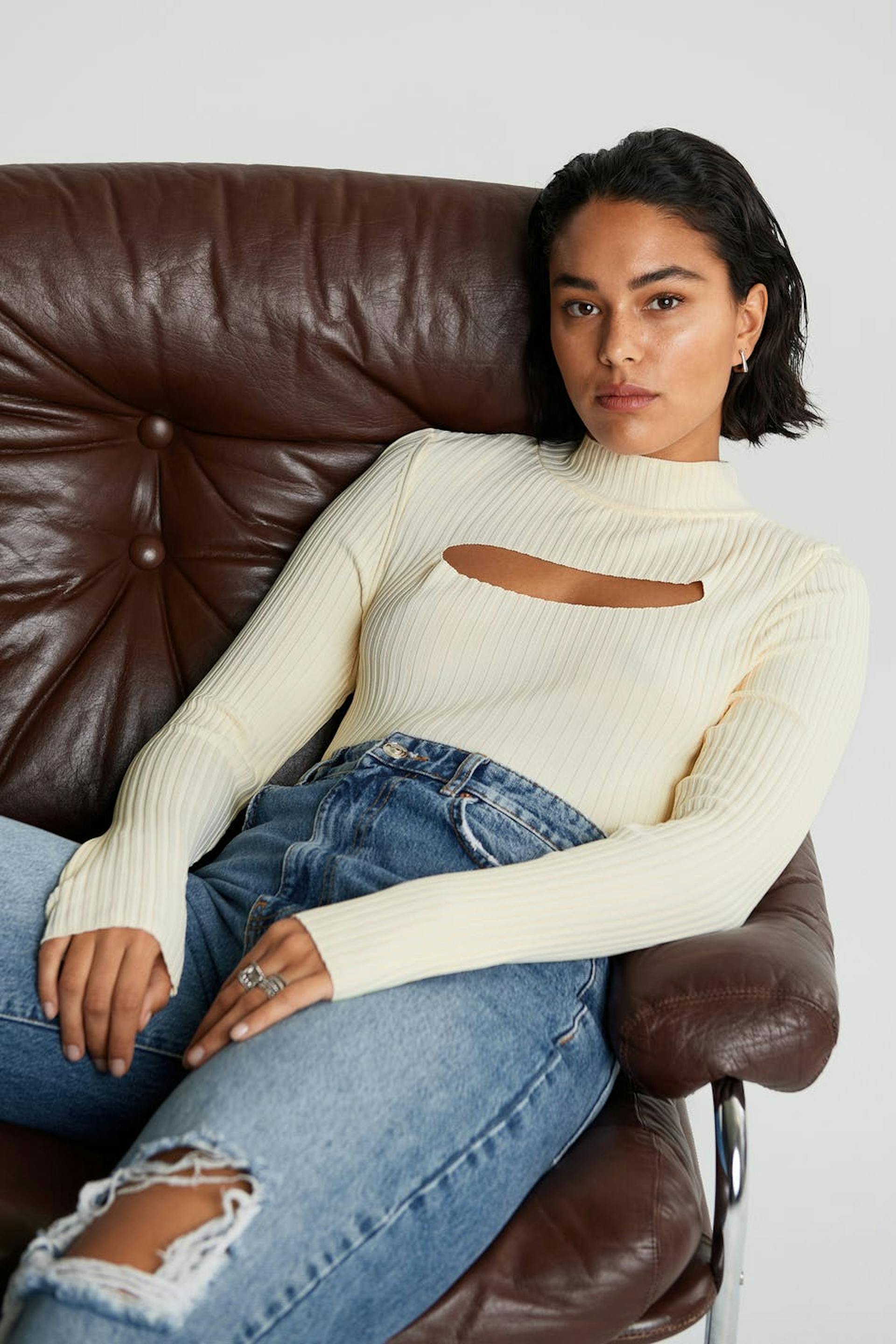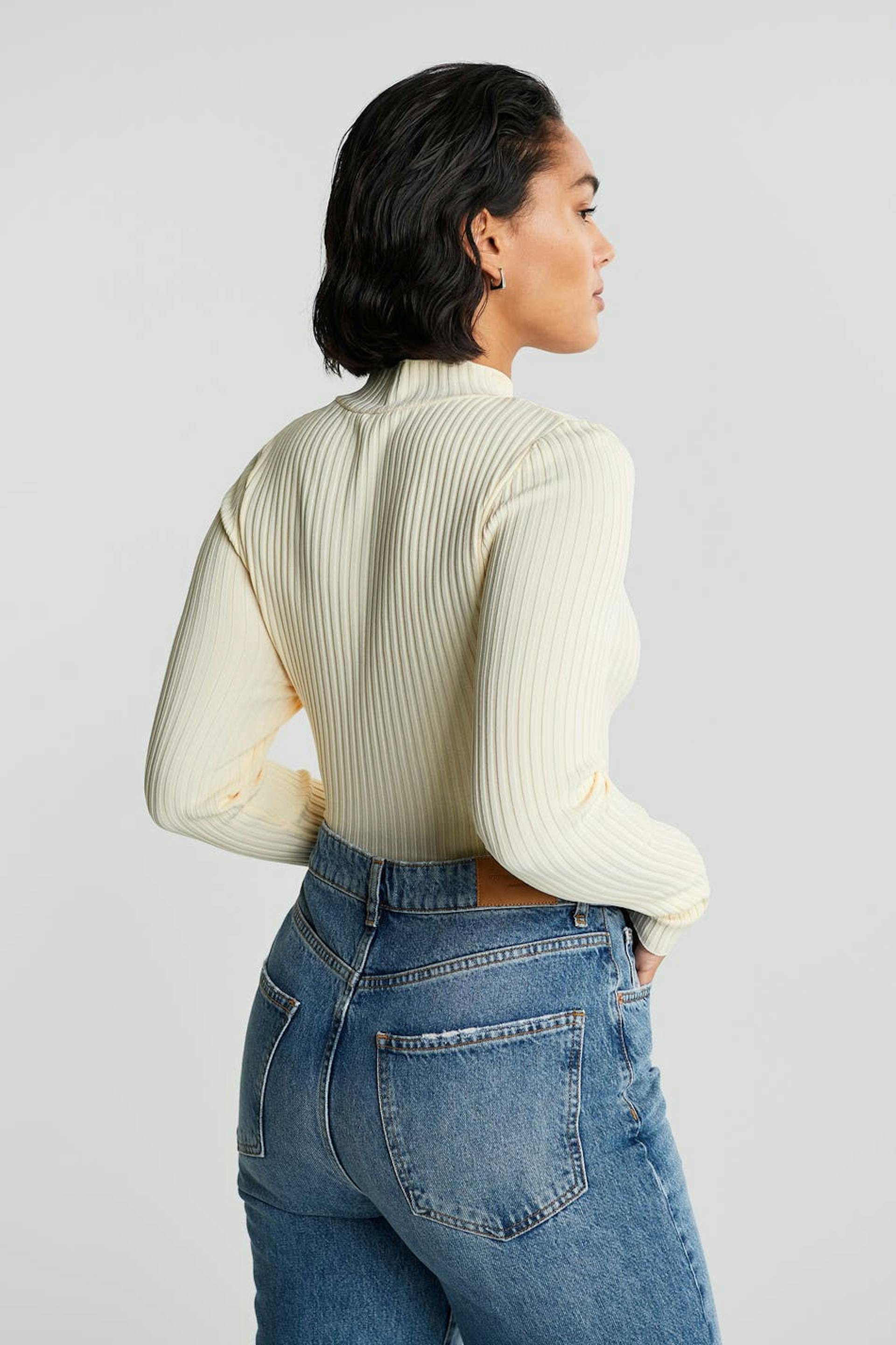 Resorimainen toppi vartalonmyötäisellä istuvuudella. Toppi on beige ja pitkähihainen ja siinä on leikattu yksityiskohta rinnassa.