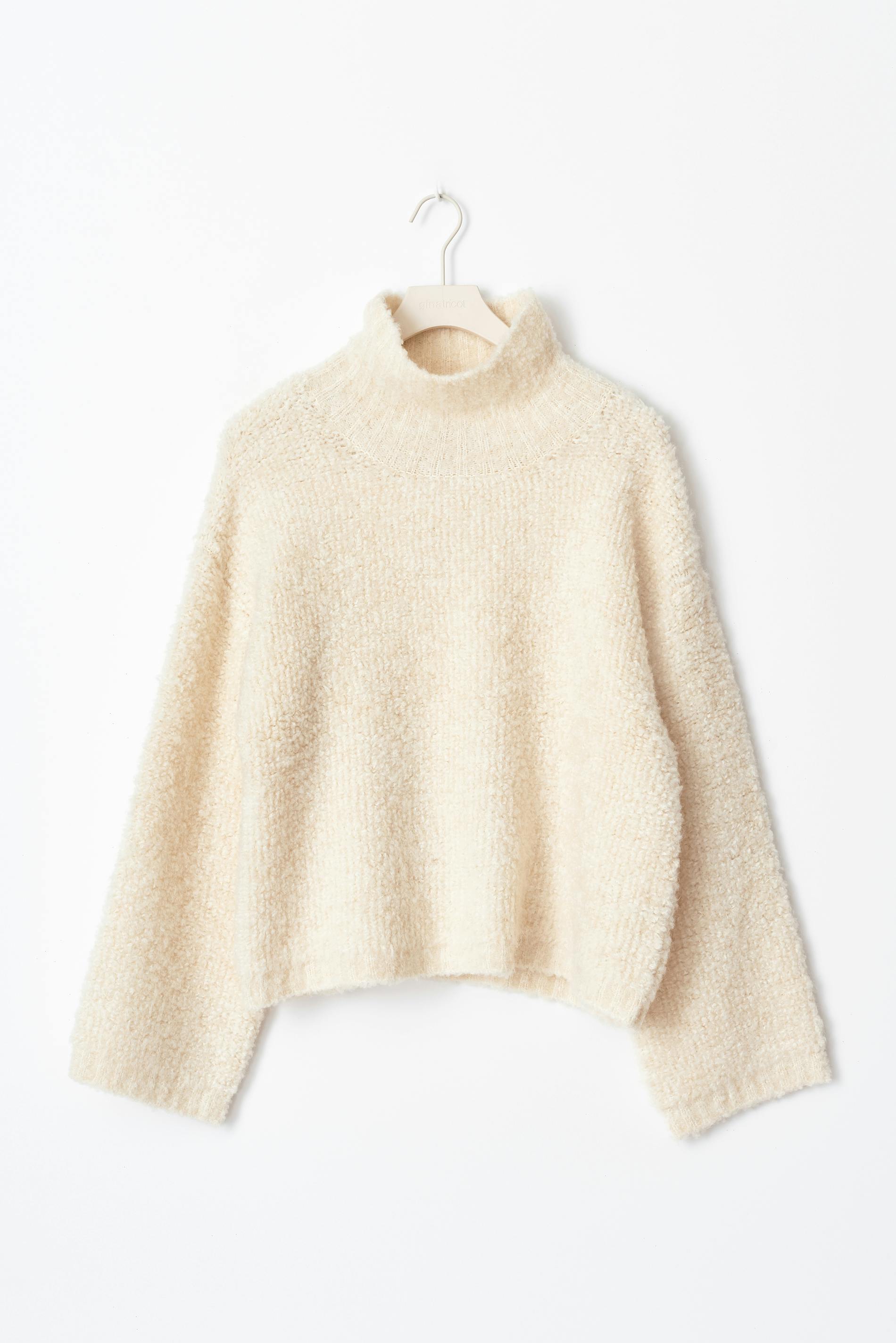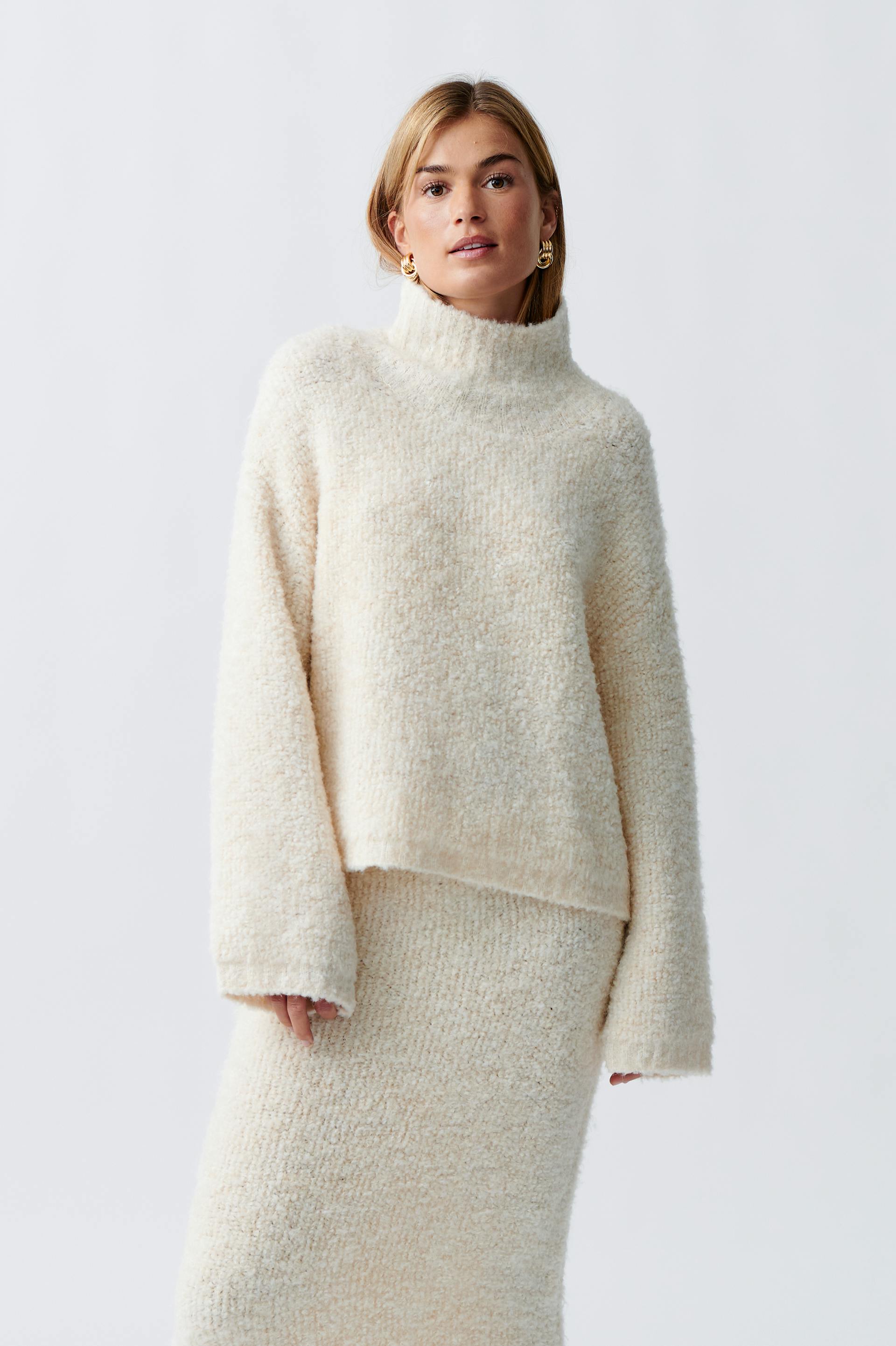 Neulepusero silmukkanukkakankaasta poolokauluksella. Pusero on valkoinen ja siinä on oversized-malli. Siinä on pitkä hiha ja pehmeä, pintakäsitelty laatu.