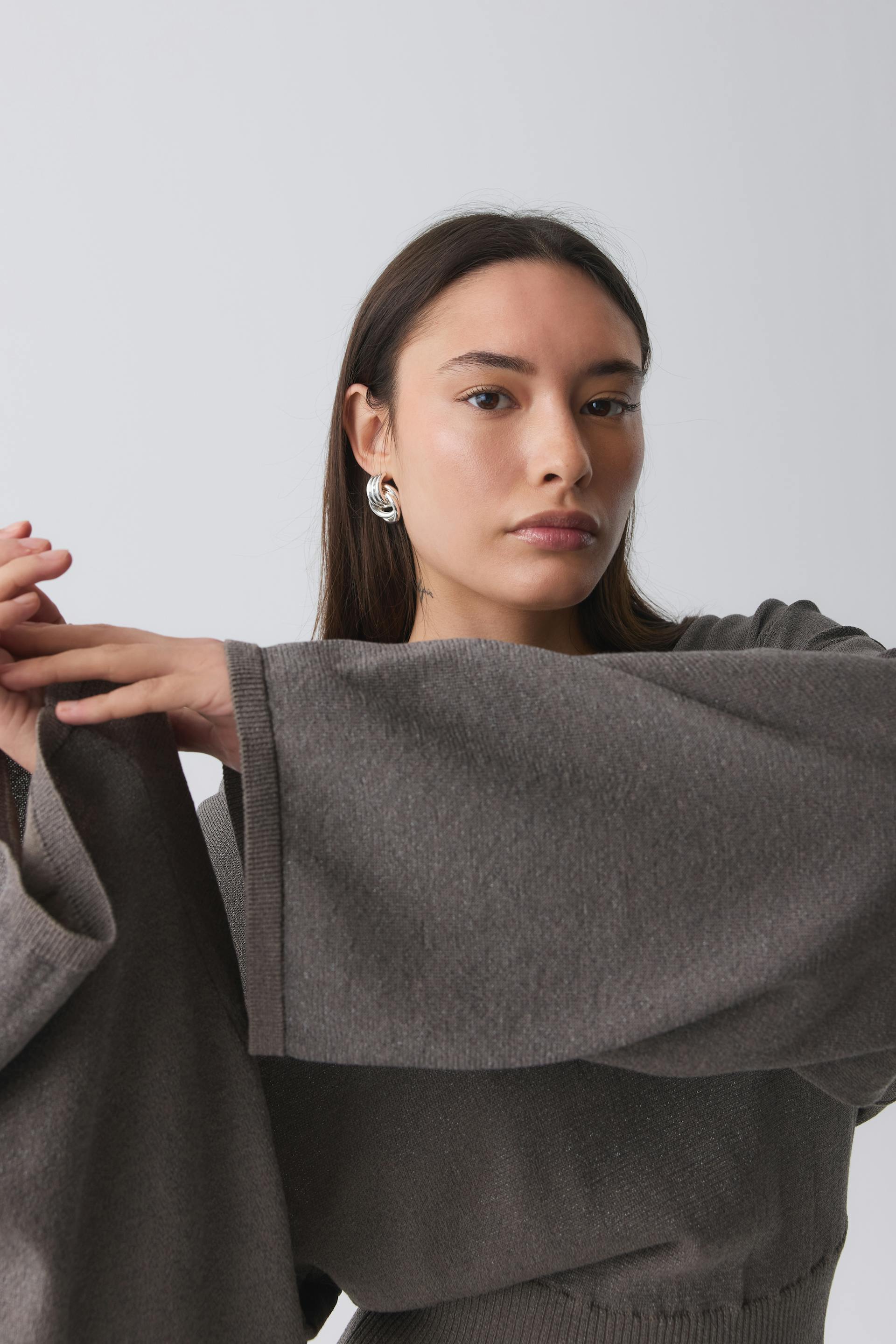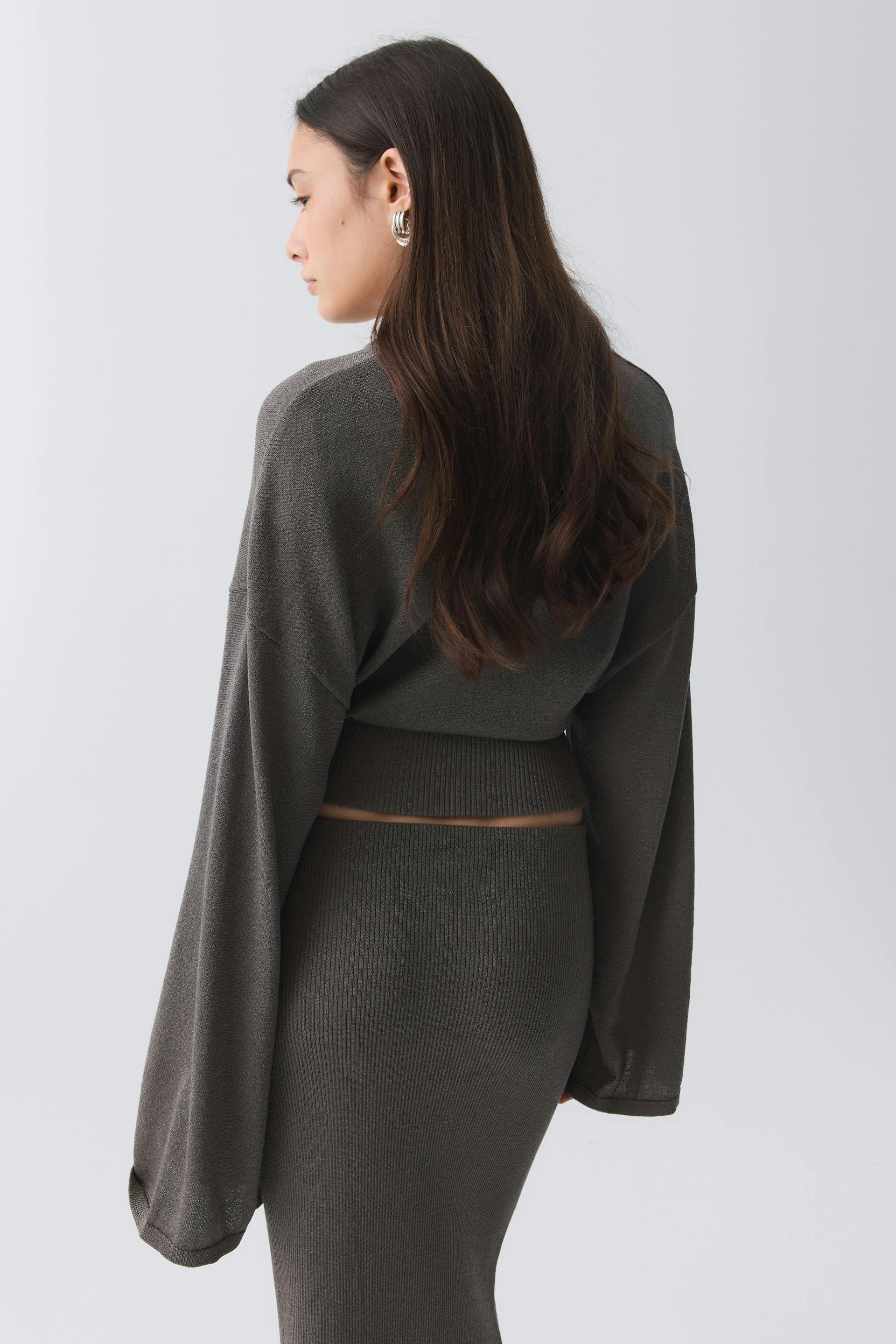 Neulepusero metallisesta kankaasta pyöreällä pääntiellä. Pusero on beige ja siinä on leveä, ribattu hihansuu pohjassa. Siinä on pitkä hiha, normaali istuvuus, pudotettu olkapää ja vartaloa myötäilevä vyötärö.