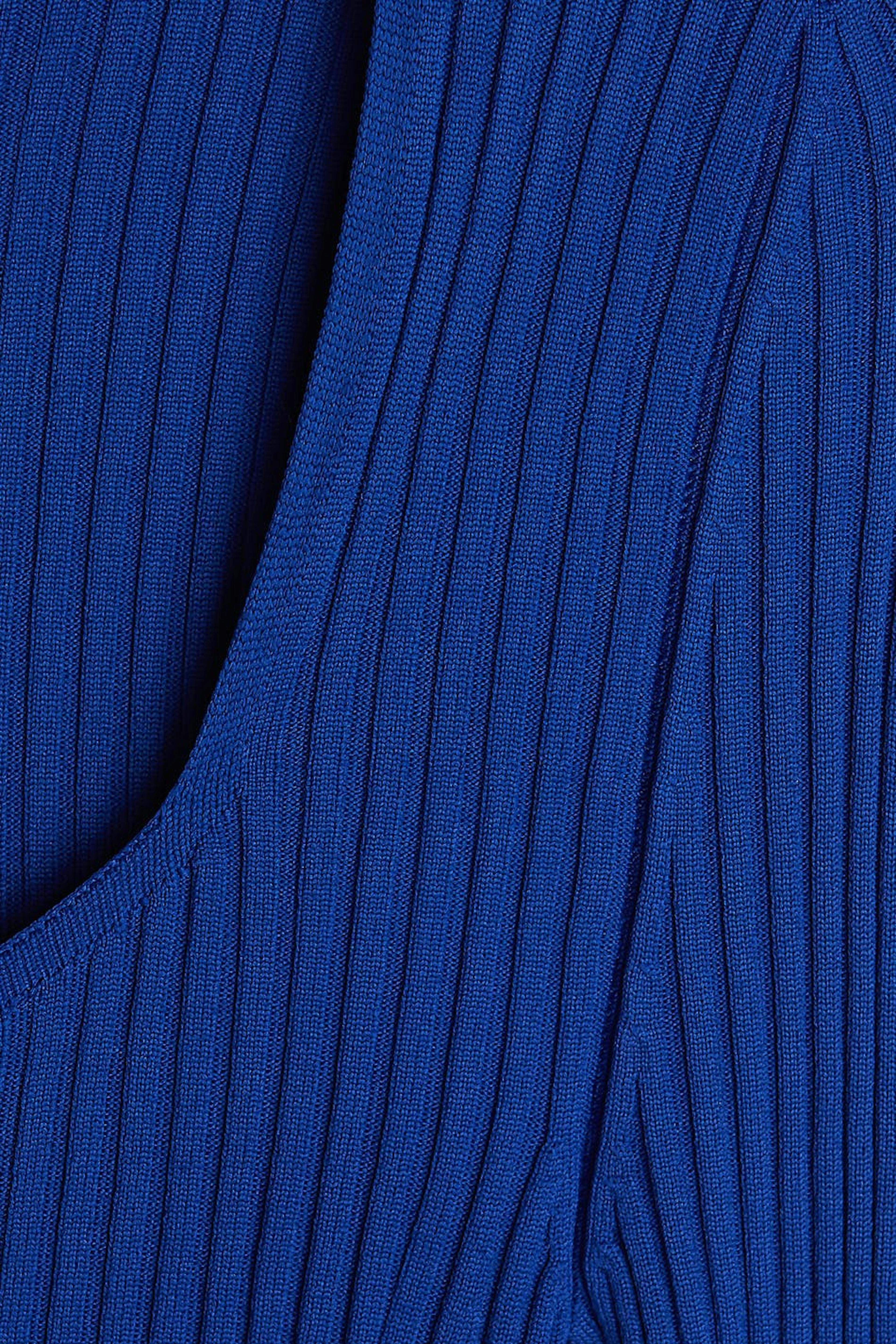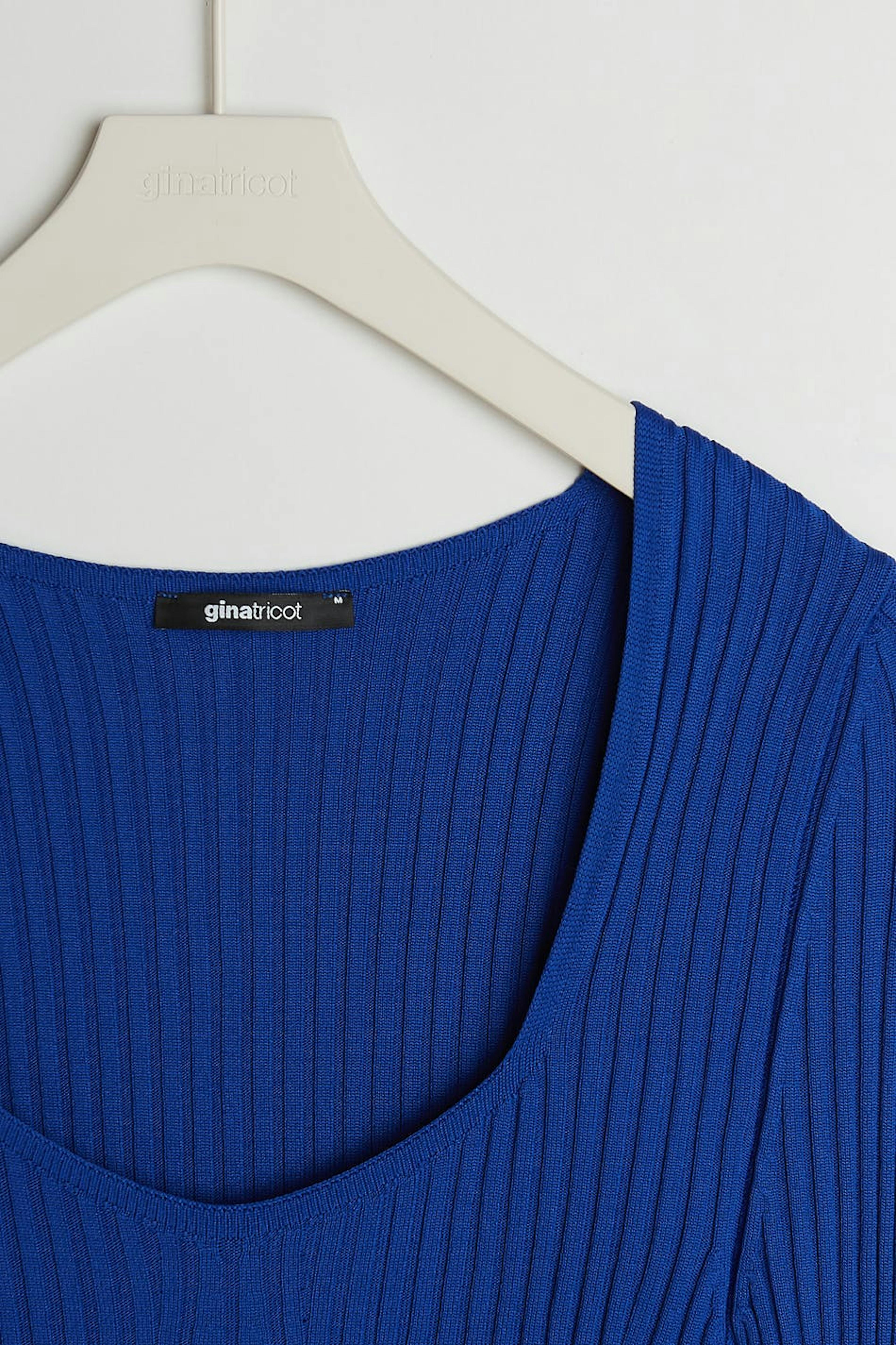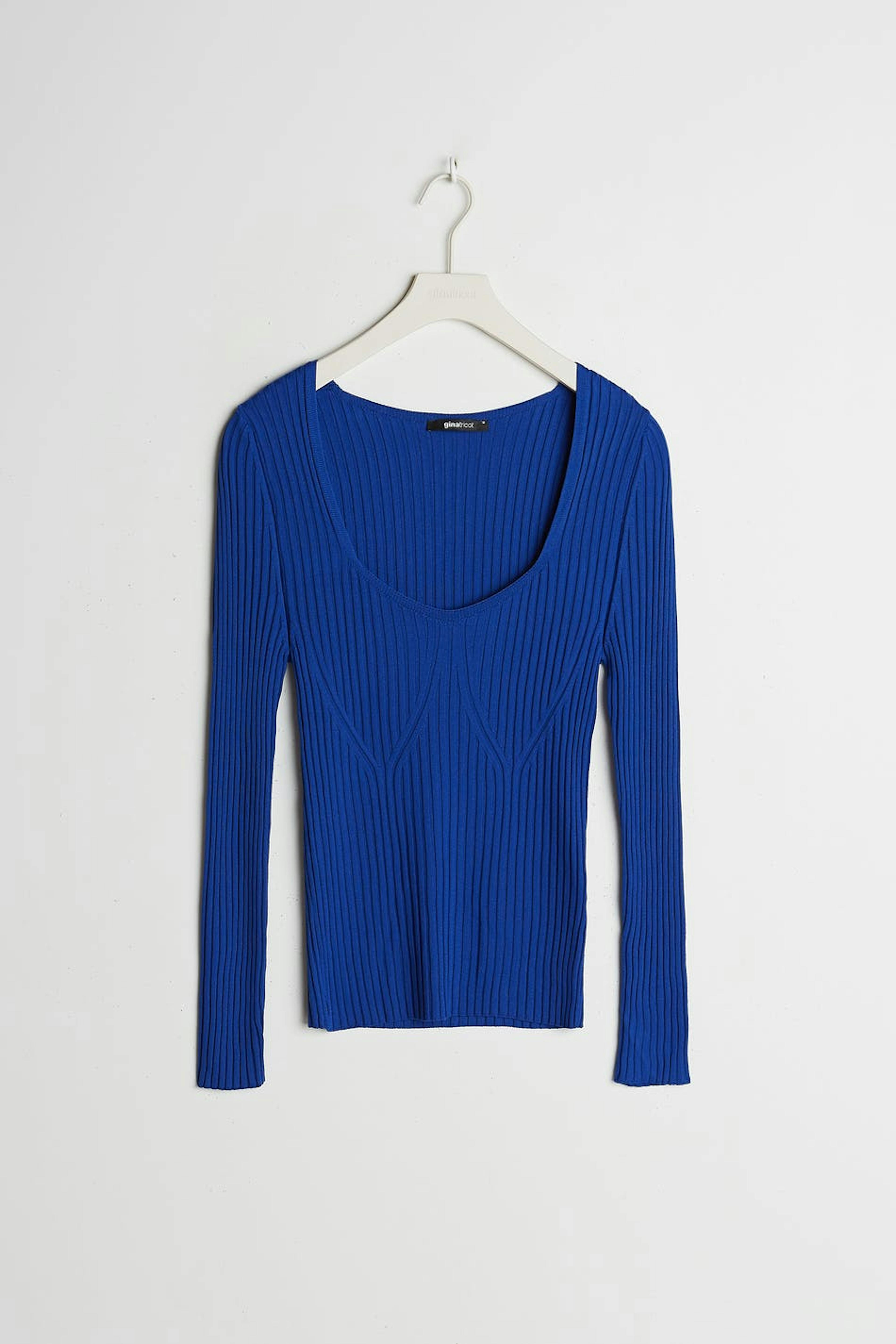 Resorimainen toppi sydämen muotoisella kaula-aukolla. Toppi on sininen ja pitkähihainen ja siinä on vartalonmyötäinen istuvuus. Siinä on resorimaiset yksityiskohdat edessä.