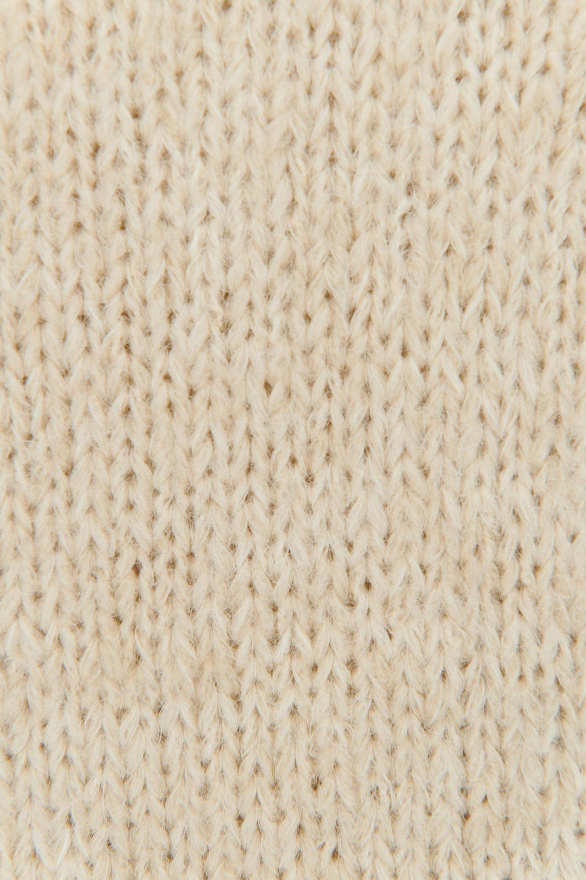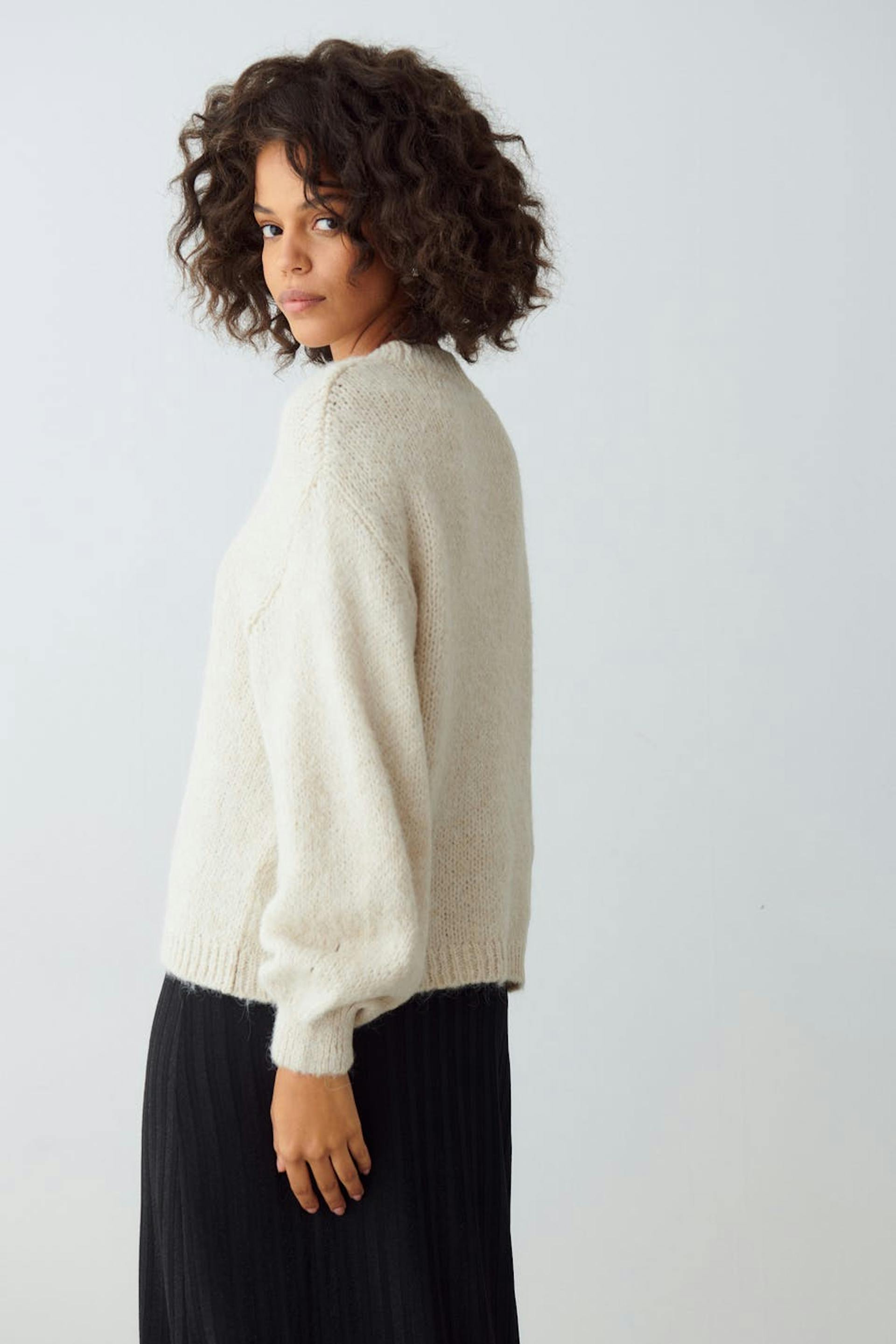 Neulepusero väljällä mallilla. Pusero on beige ja siinä on pyöreä pääntie.