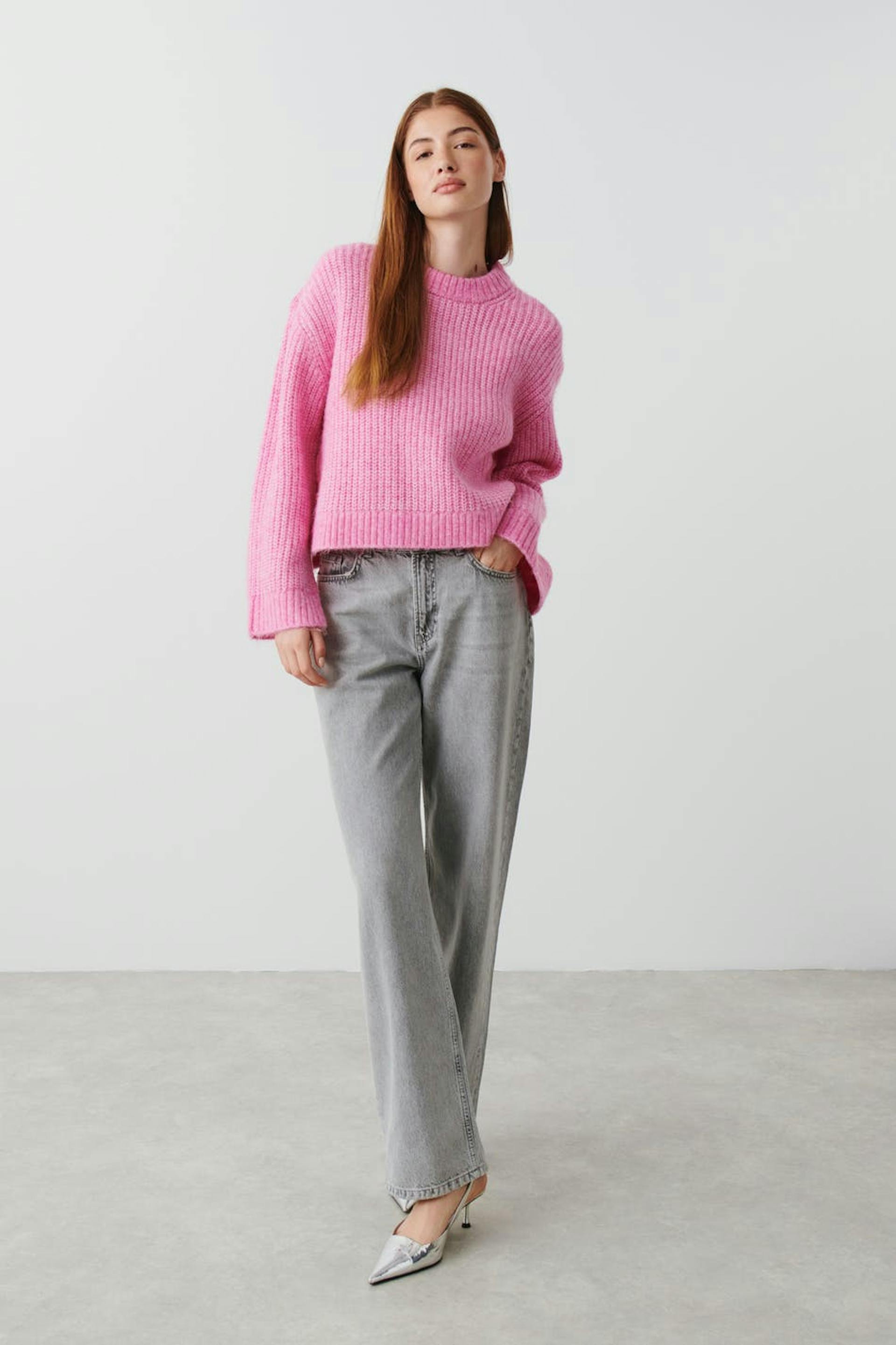 Neulepusero pyöreällä pääntiellä. Pusero on pinkki ja siinä on laatikkomainen malli. Siinä on suora hiha, halkio sivuilla ja ribbineulos hihansuissa ja pohjassa.