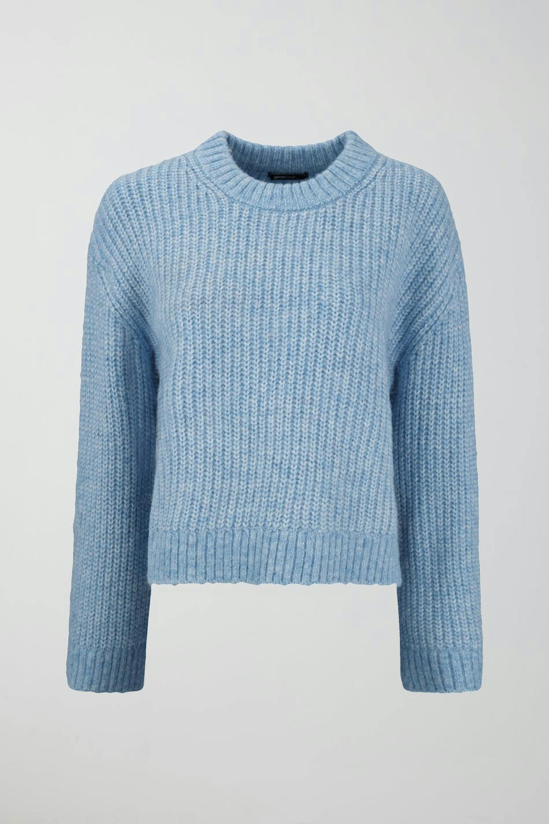 Neulepusero pyöreällä pääntiellä. Pusero on sininen ja siinä on laatikkomainen malli. Siinä on suora hiha ja ribbineulos hihansuissa ja pohjassa.