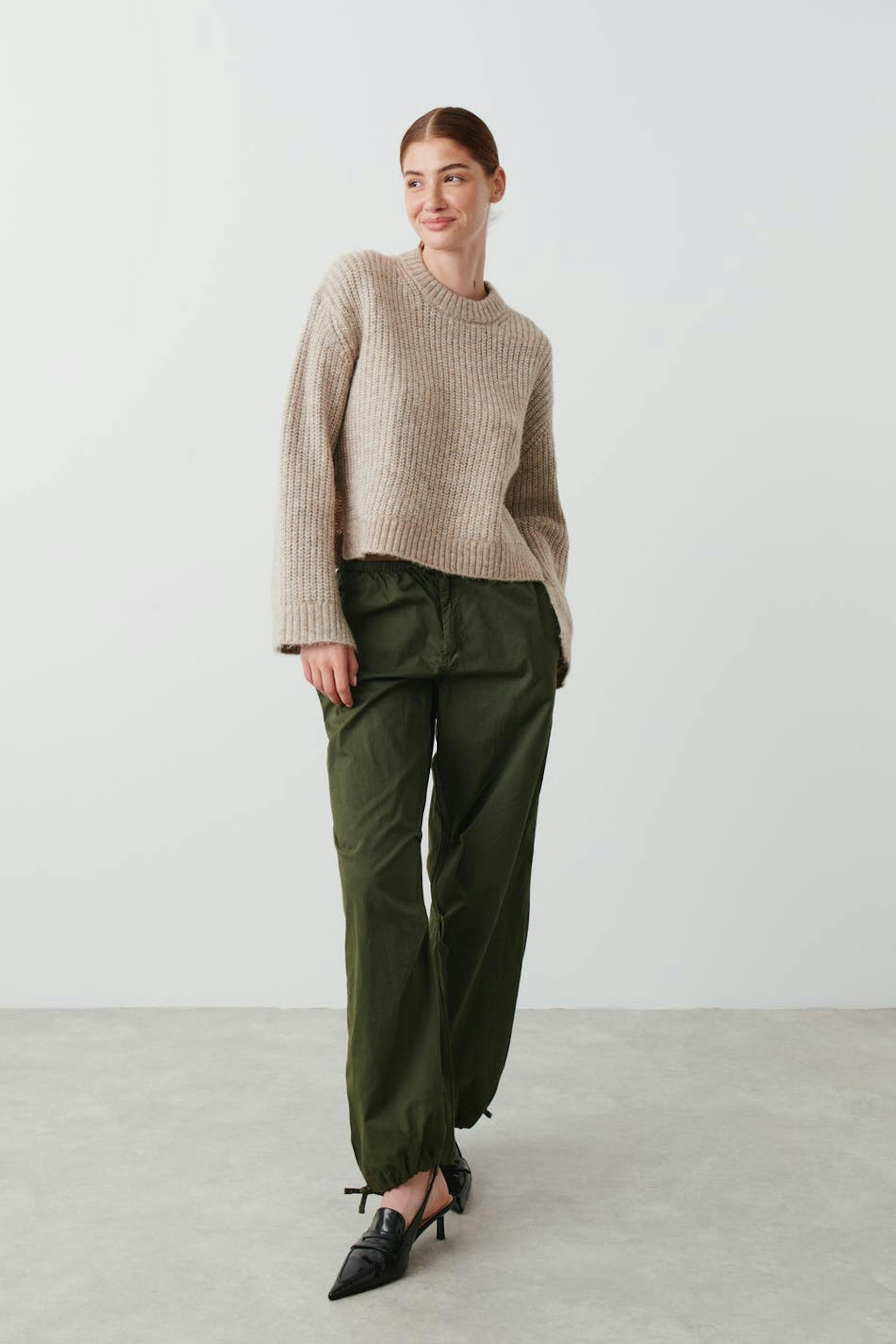 Neulepusero pyöreällä pääntiellä. Pusero on beige ja siinä on laatikkomainen malli. Siinä on suora hiha, halkio sivuilla ja ribbineulos hihansuissa ja pohjassa.