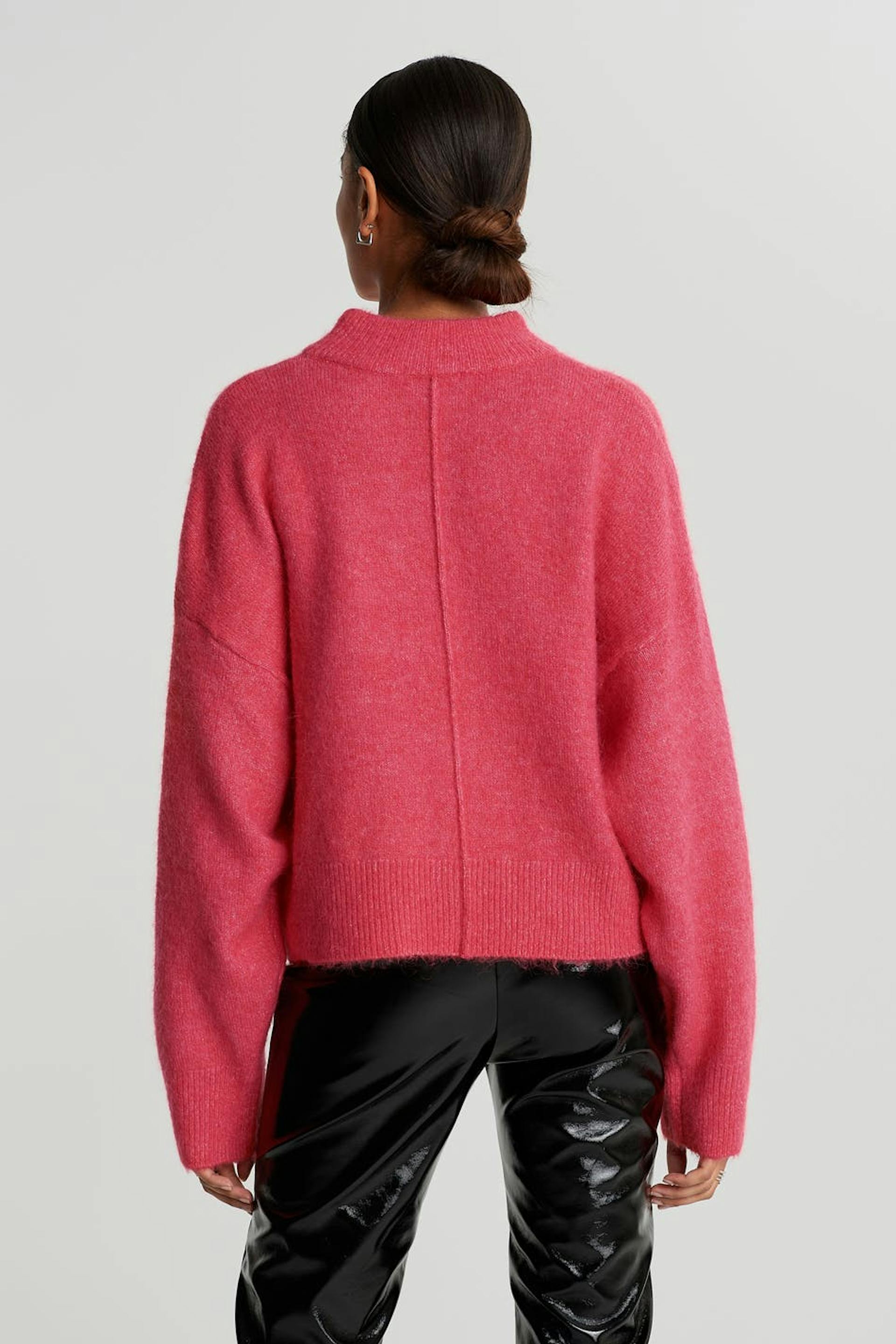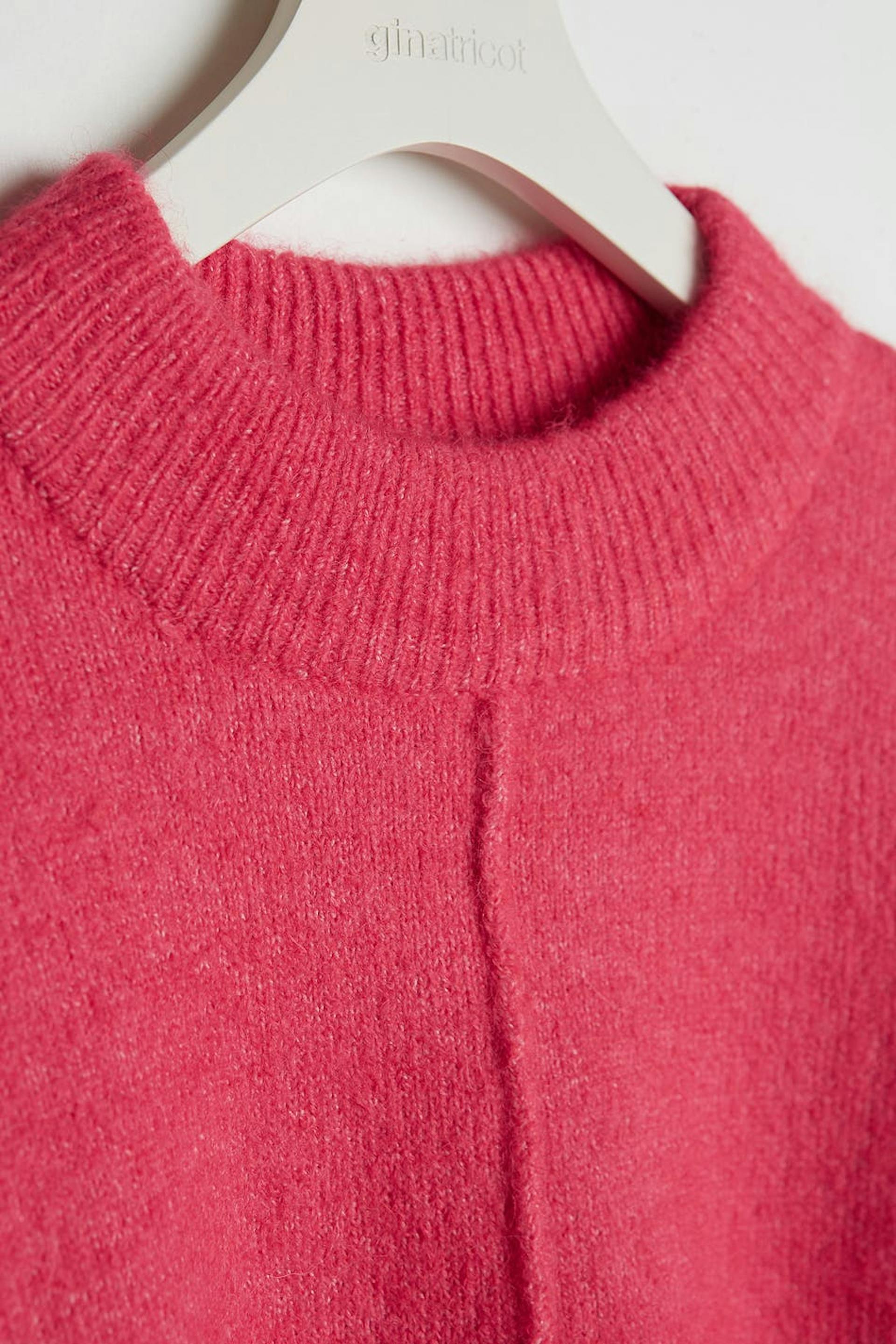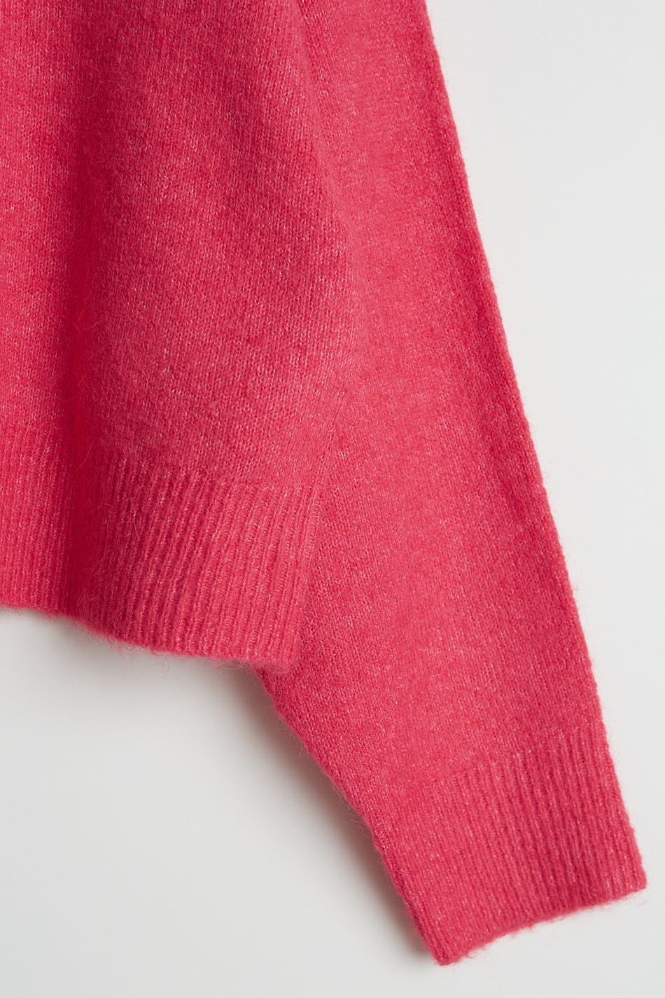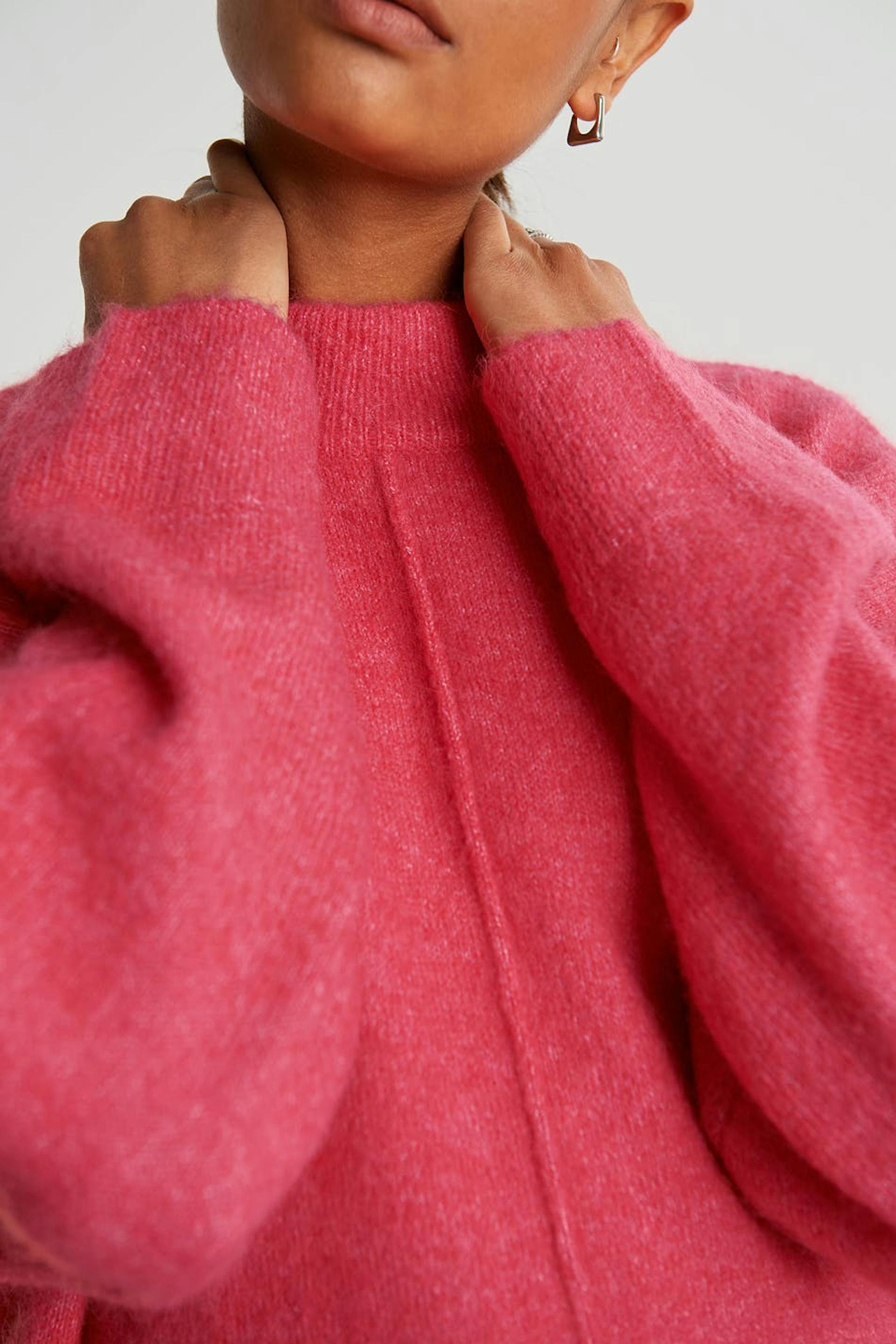 Neulottu villapaita ribbed mansetilla kaula-aukossa, hihansuissa ja helmassa. Villapaita on pinkki ja siinä on saumayksityiskohta edessä ja selässä.