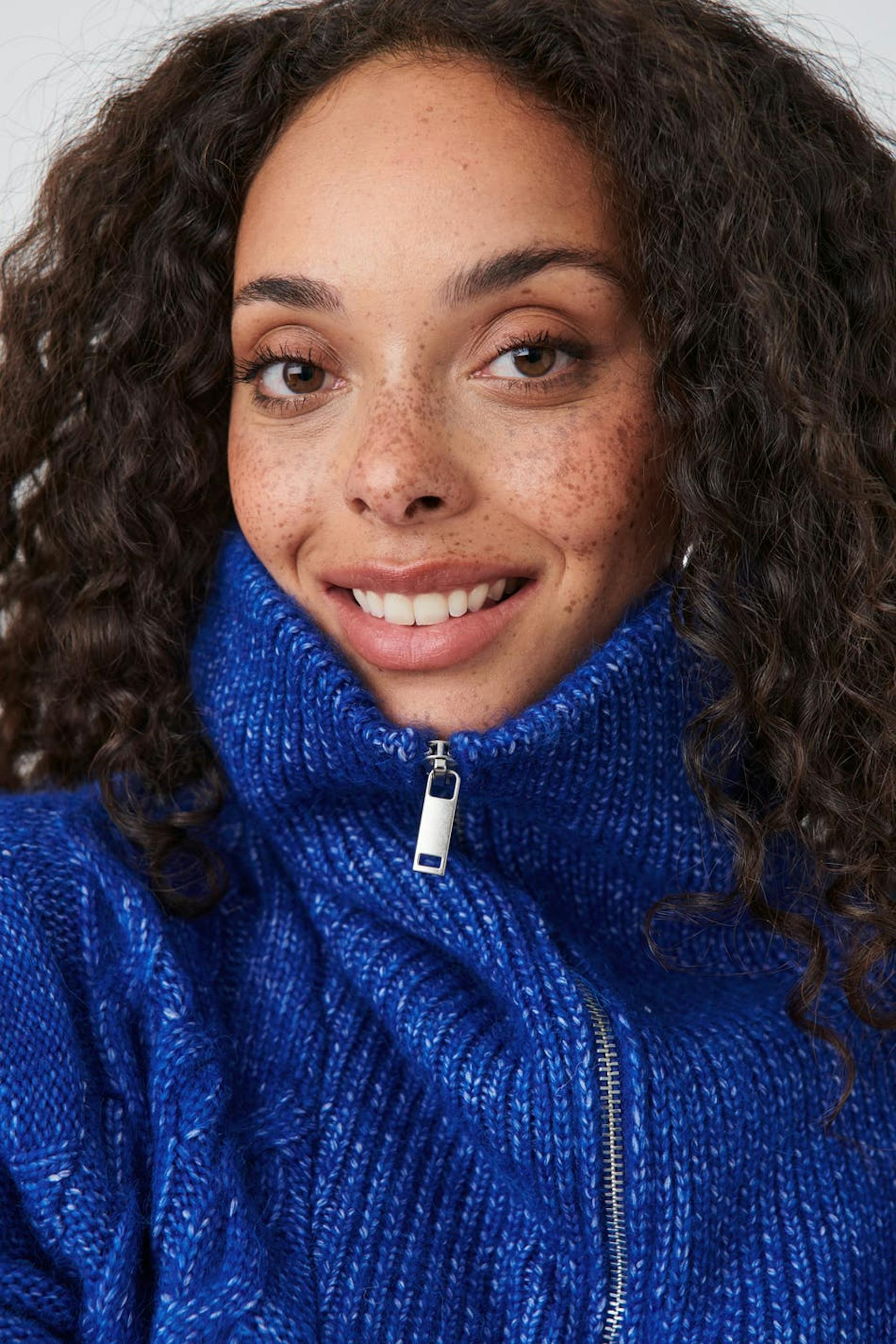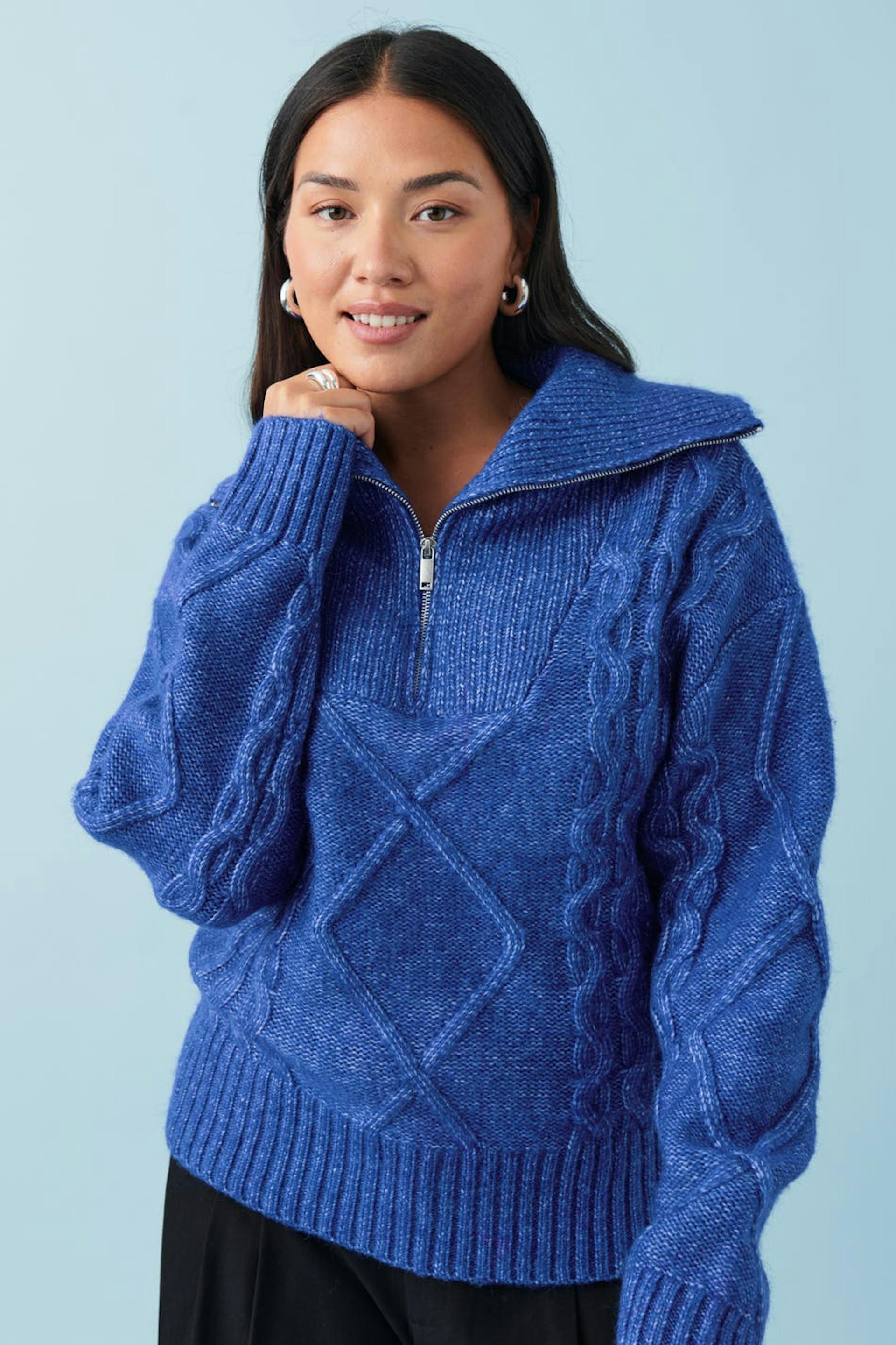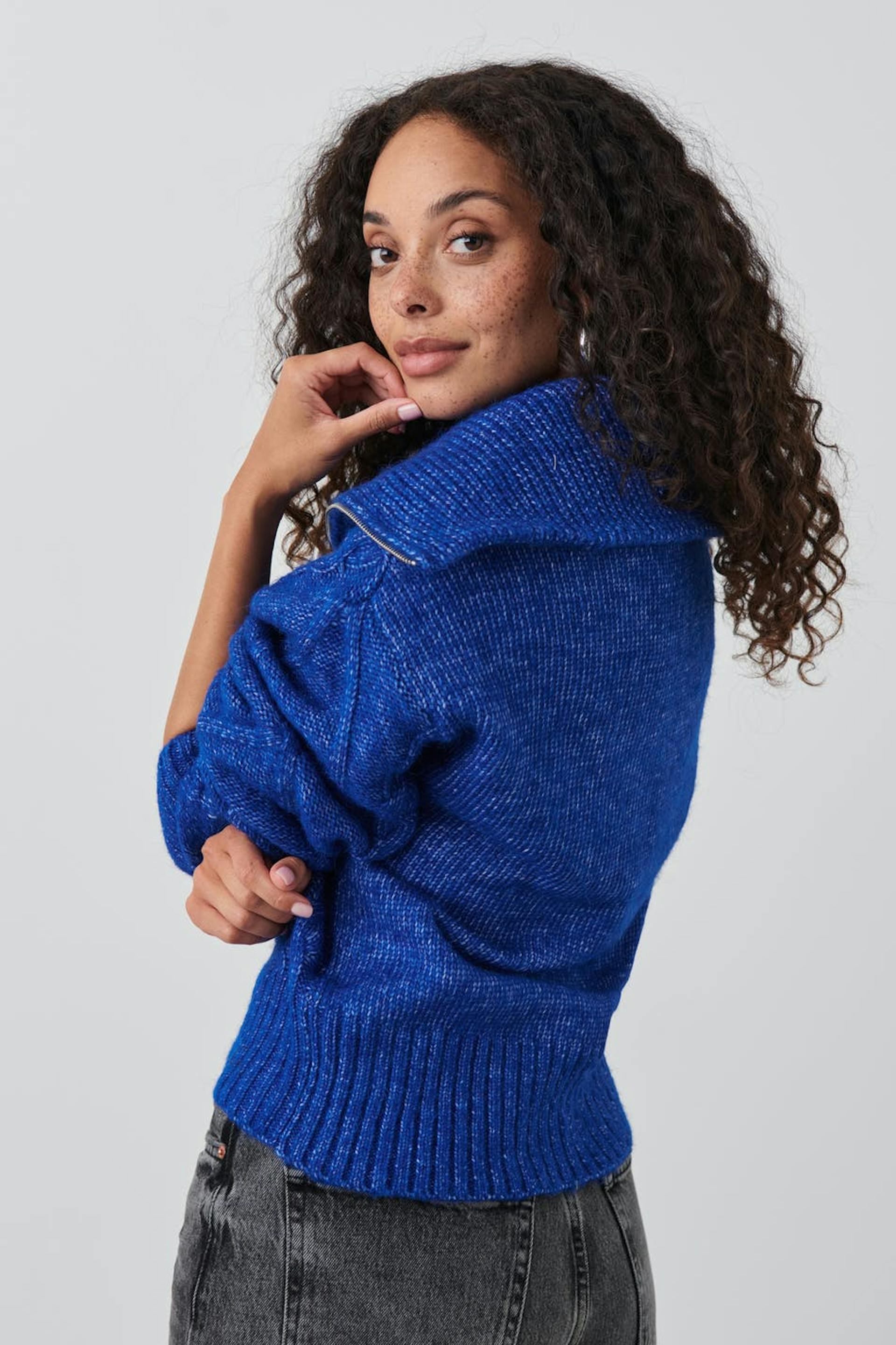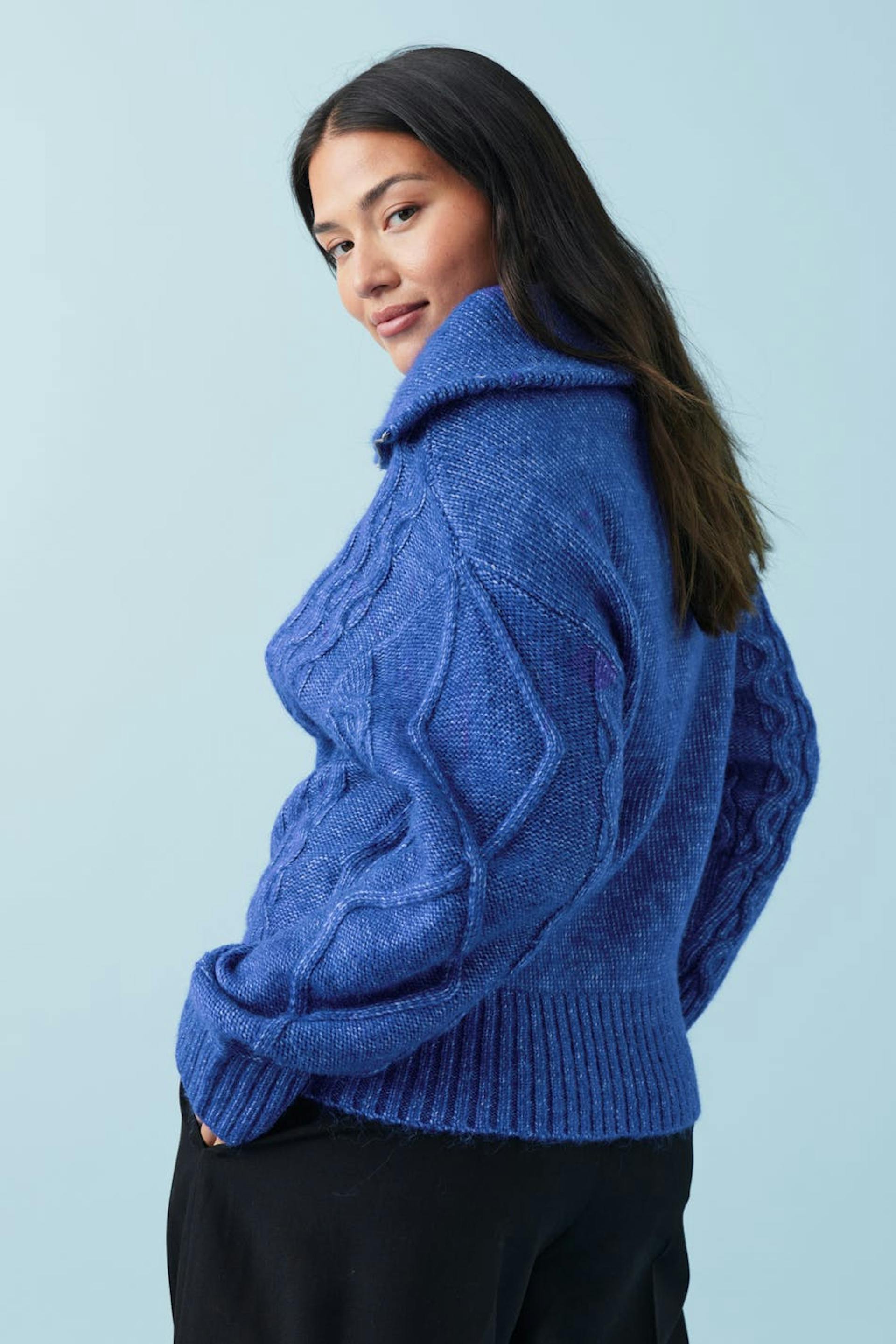 Palmikkoneulepusero vetoketjulla ylhäällä. Paita on sininen ja siinä on korkea kaula. Siinä on pitkä hiha ja leveä ribbineulos hihansuissa ja pohjassa.