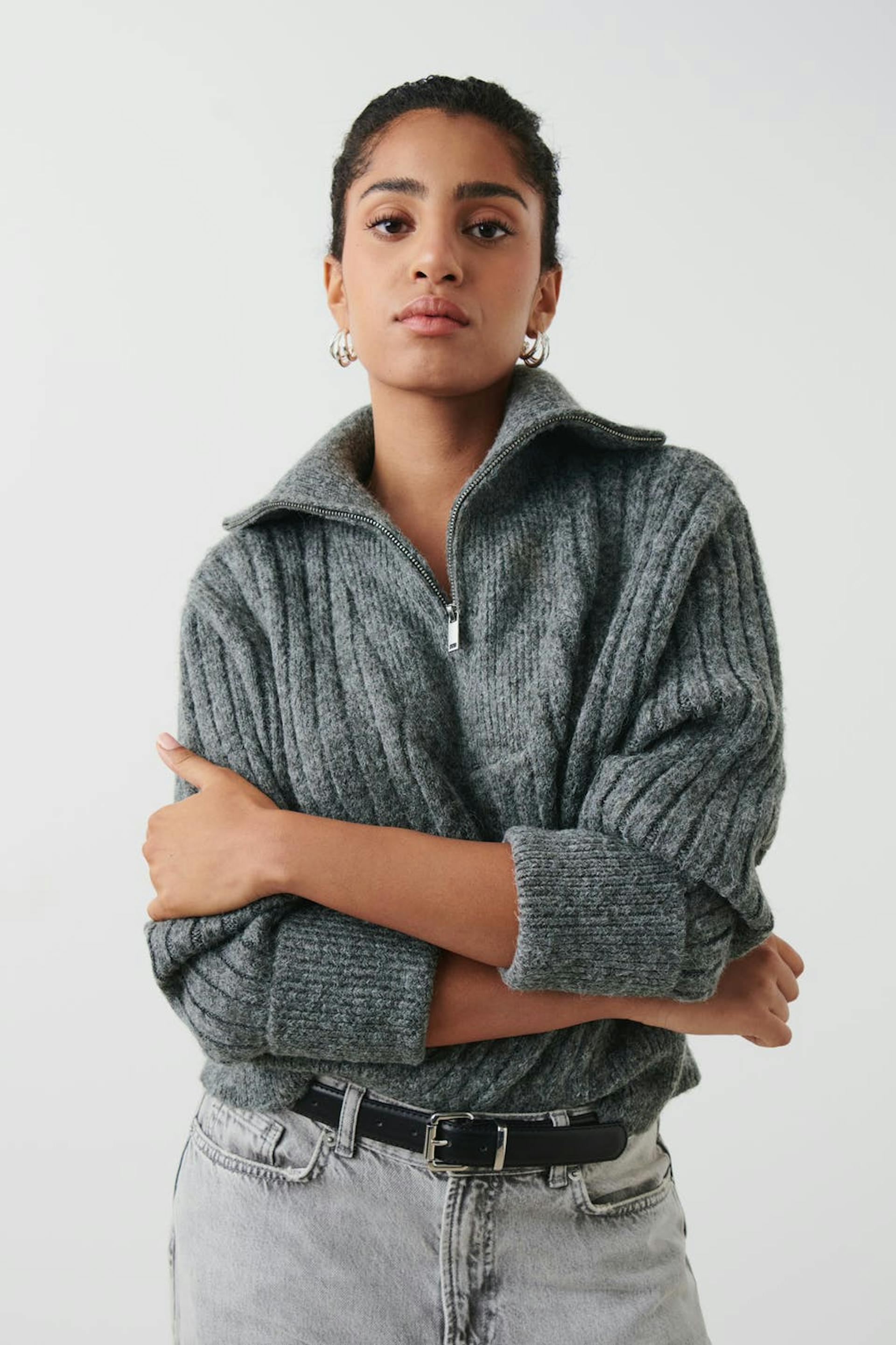 Neulottu paita vetoketjulla ylhäällä. Paita on harmaa ja siinä on korkea kaula. Siinä on täysin neulotut osiot edessä, cropattu pituus ja pitkä, taitettu hiha.