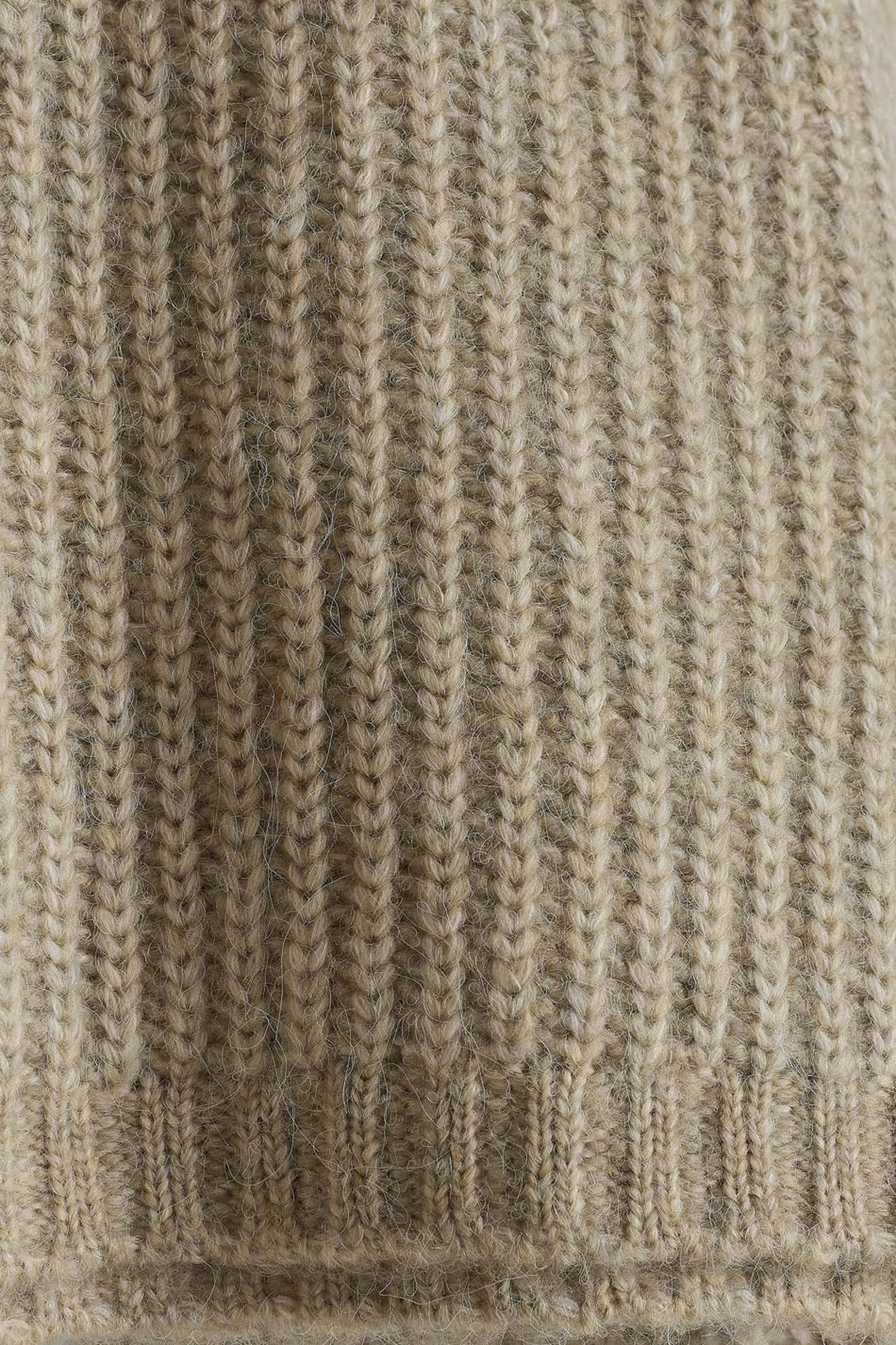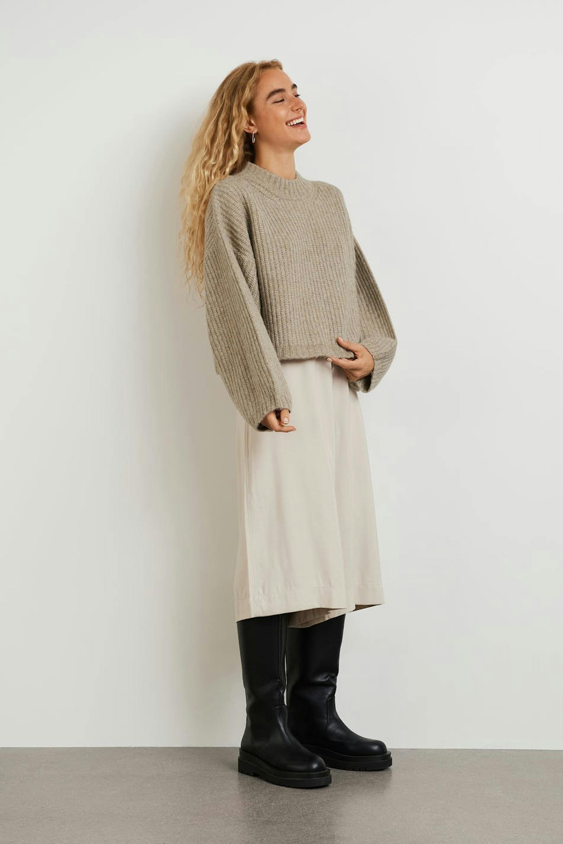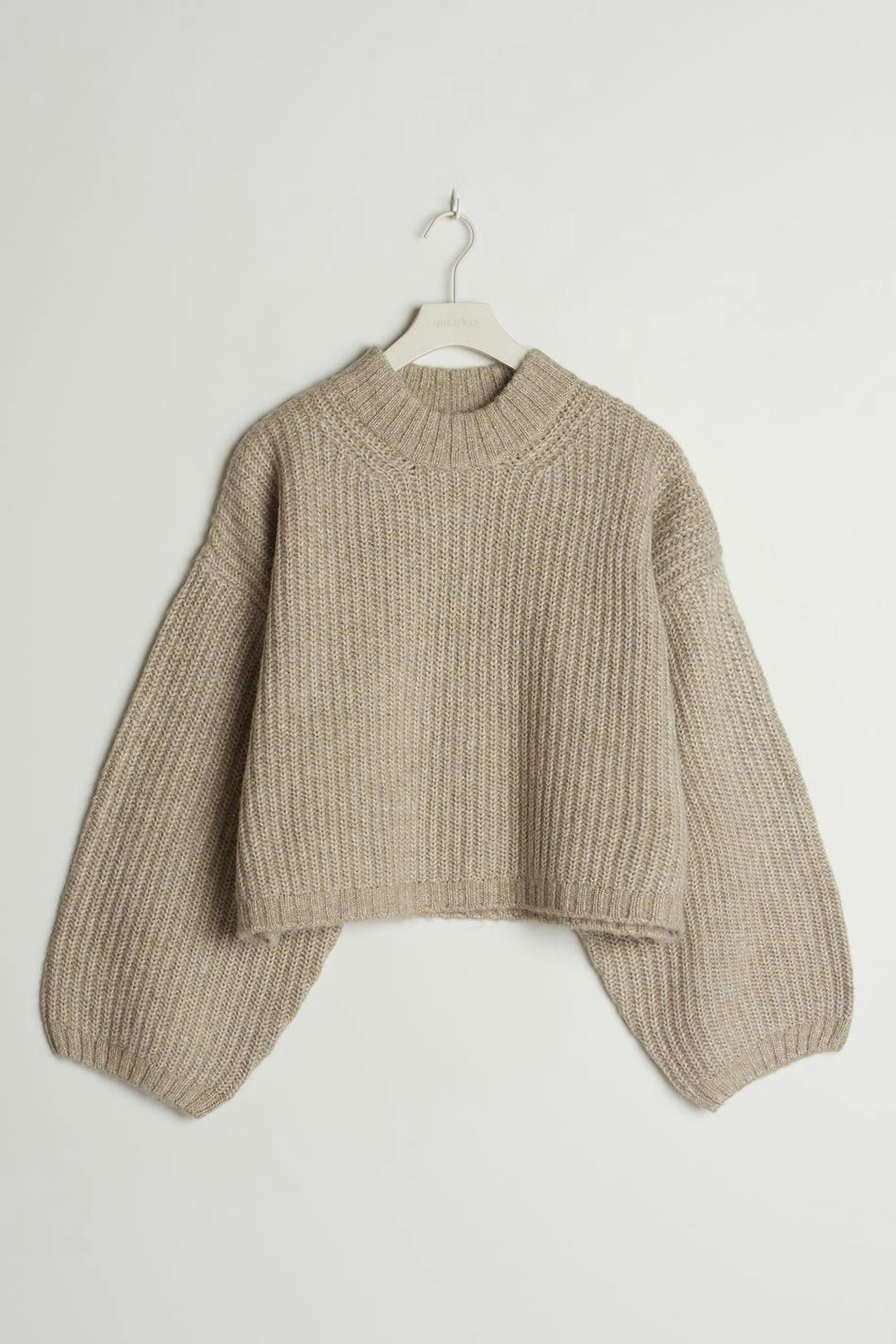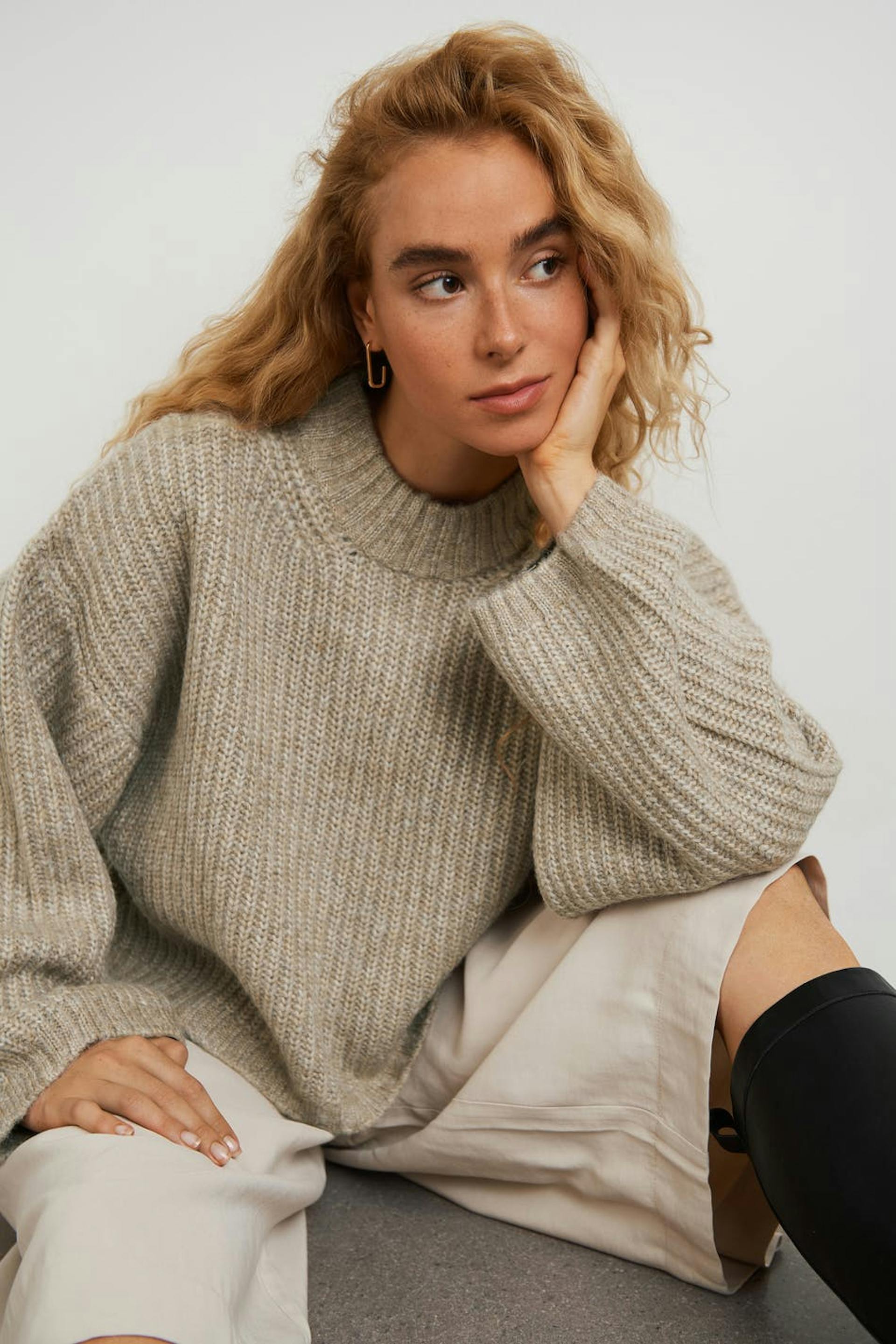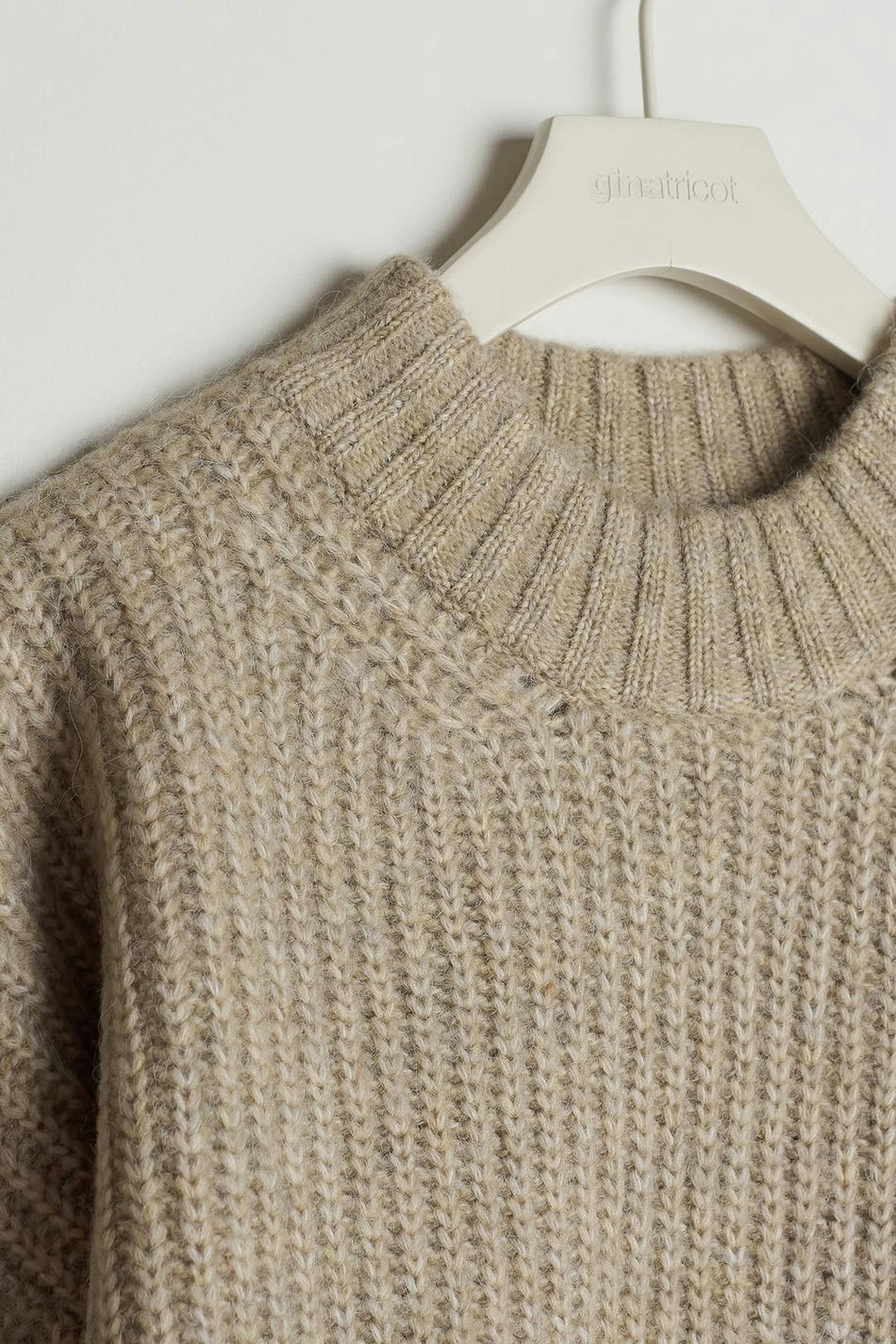 Neulottu villapaita ylisuuri istuvuudella. Villapaita on beige ja siinä on lyhyt pituus. Siinä on pallohihat ja korkea kaula-aukko.